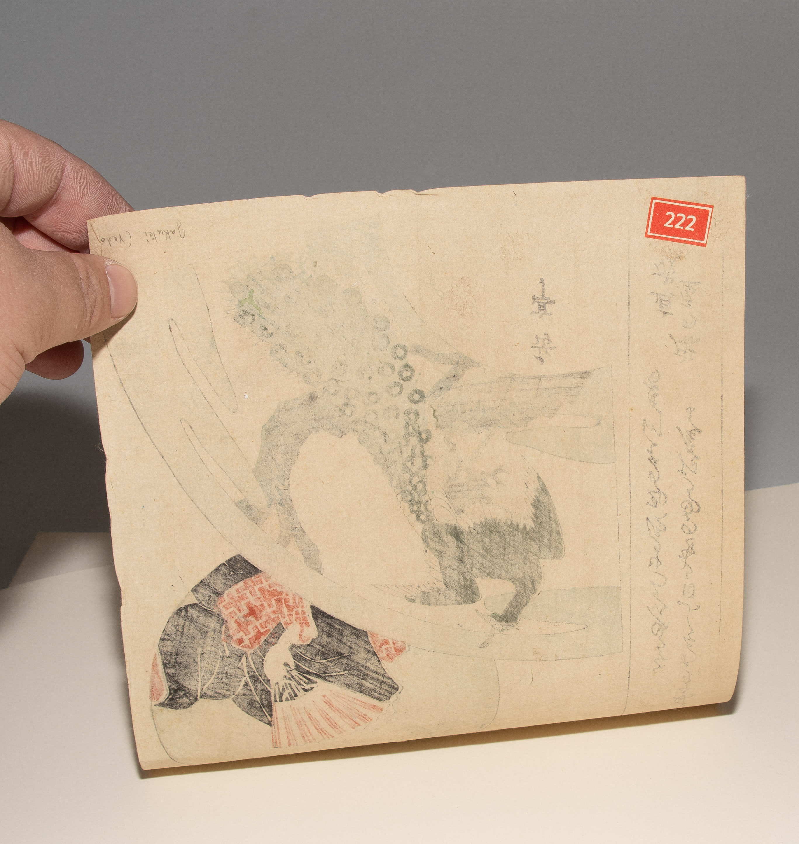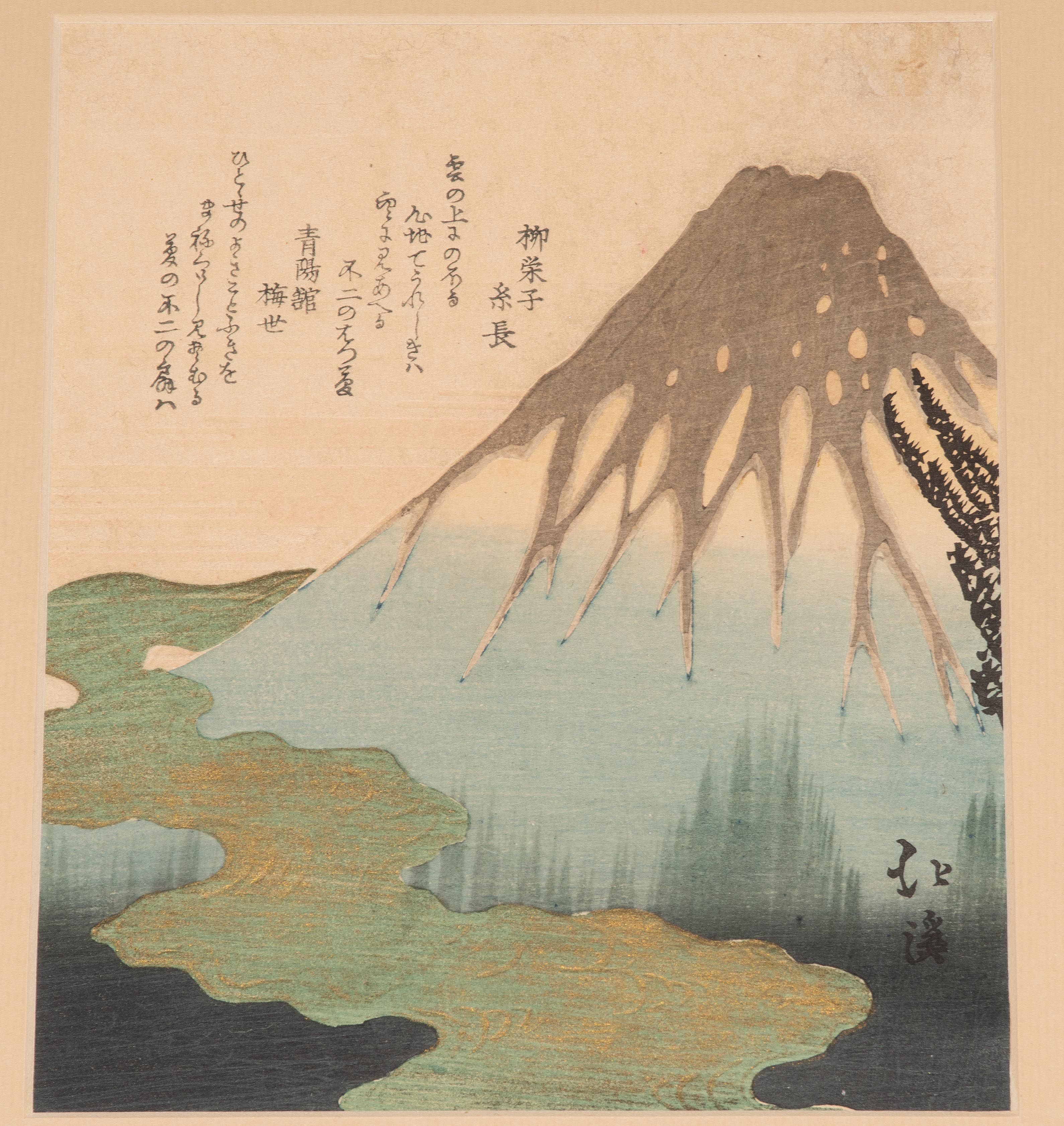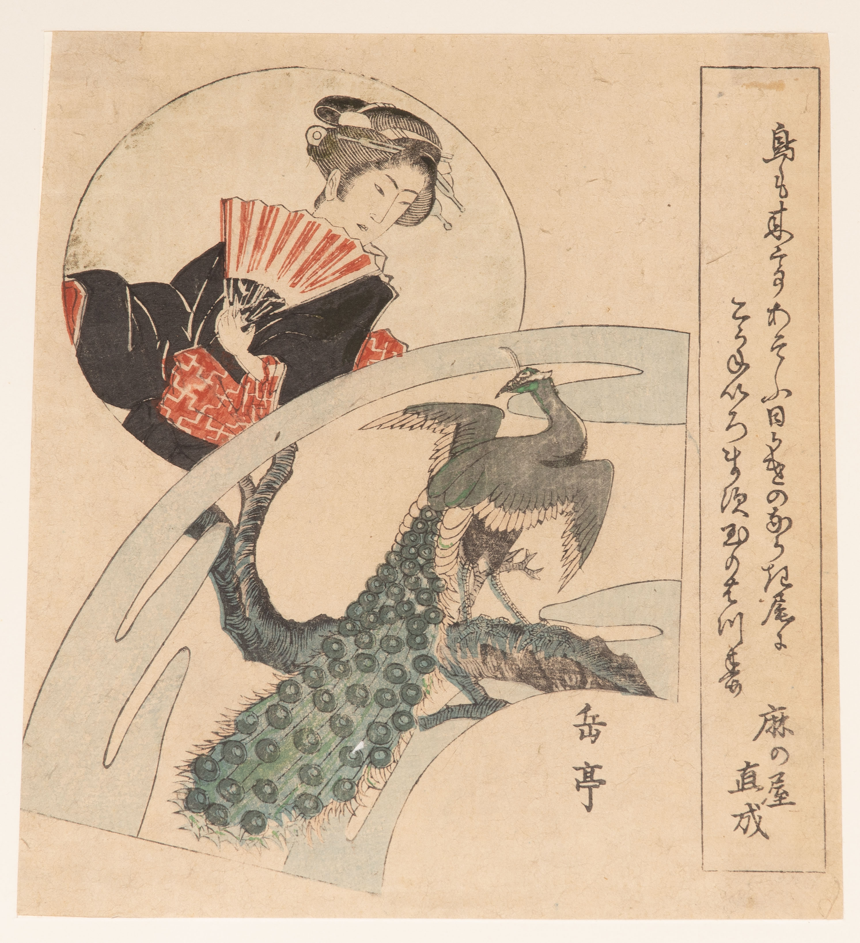 Totoya Hokkei (1780–1850), Nach. Ende 19.Jh. Neujahrs-surimono. Fuji-Berg über den Wolken. 21,6x17,9 cm. - Oben montiert. / Yashima Gakutei (1786–1868). Kurtisane und Pfau, aus der Serie Honchôren jûban tsuzuki mit dem Gedicht von Asanoya Naonari. Späte Ausgaben, wahrscheinlich Ende 19.Jh. - Montiert. 21x18 cm.