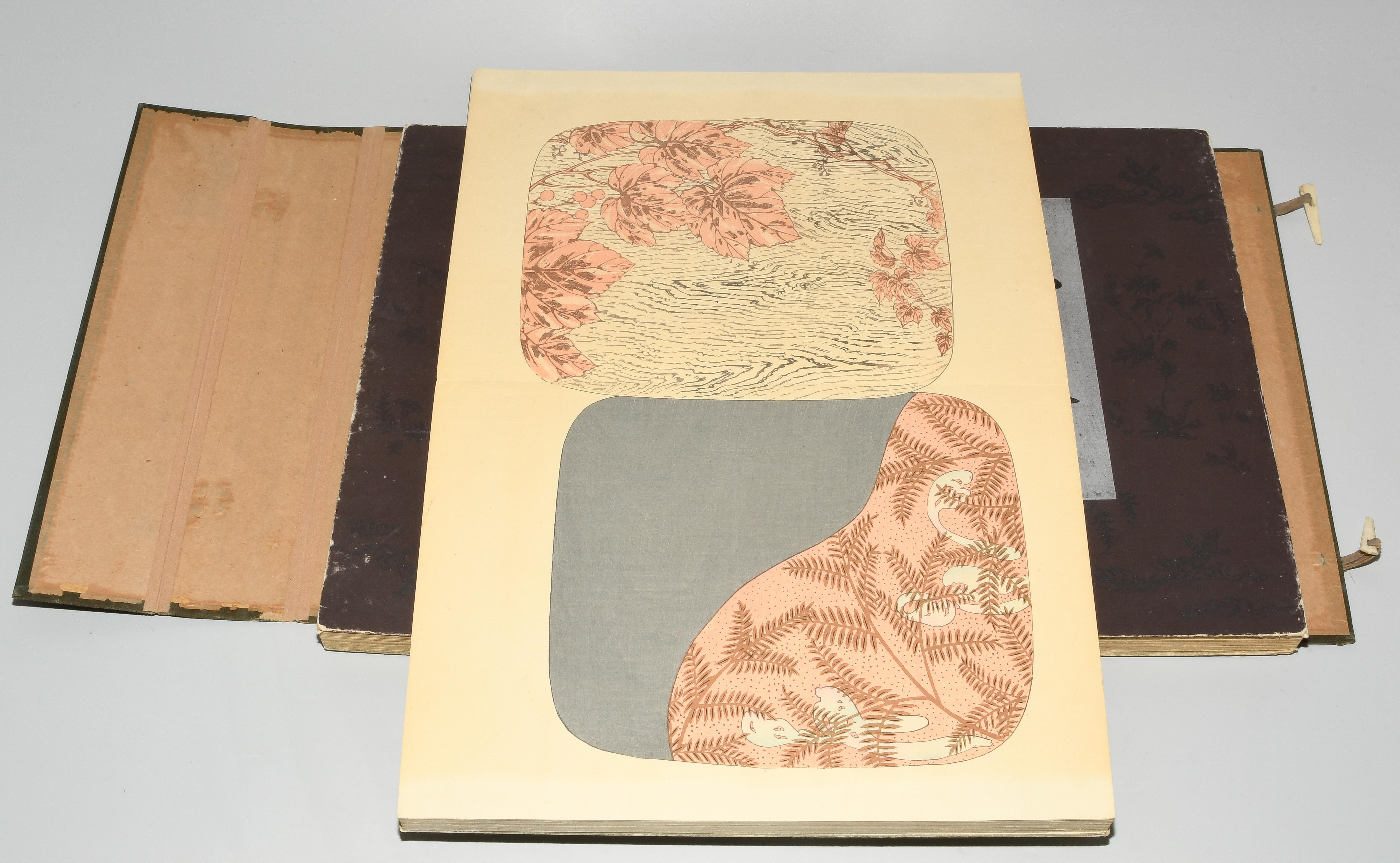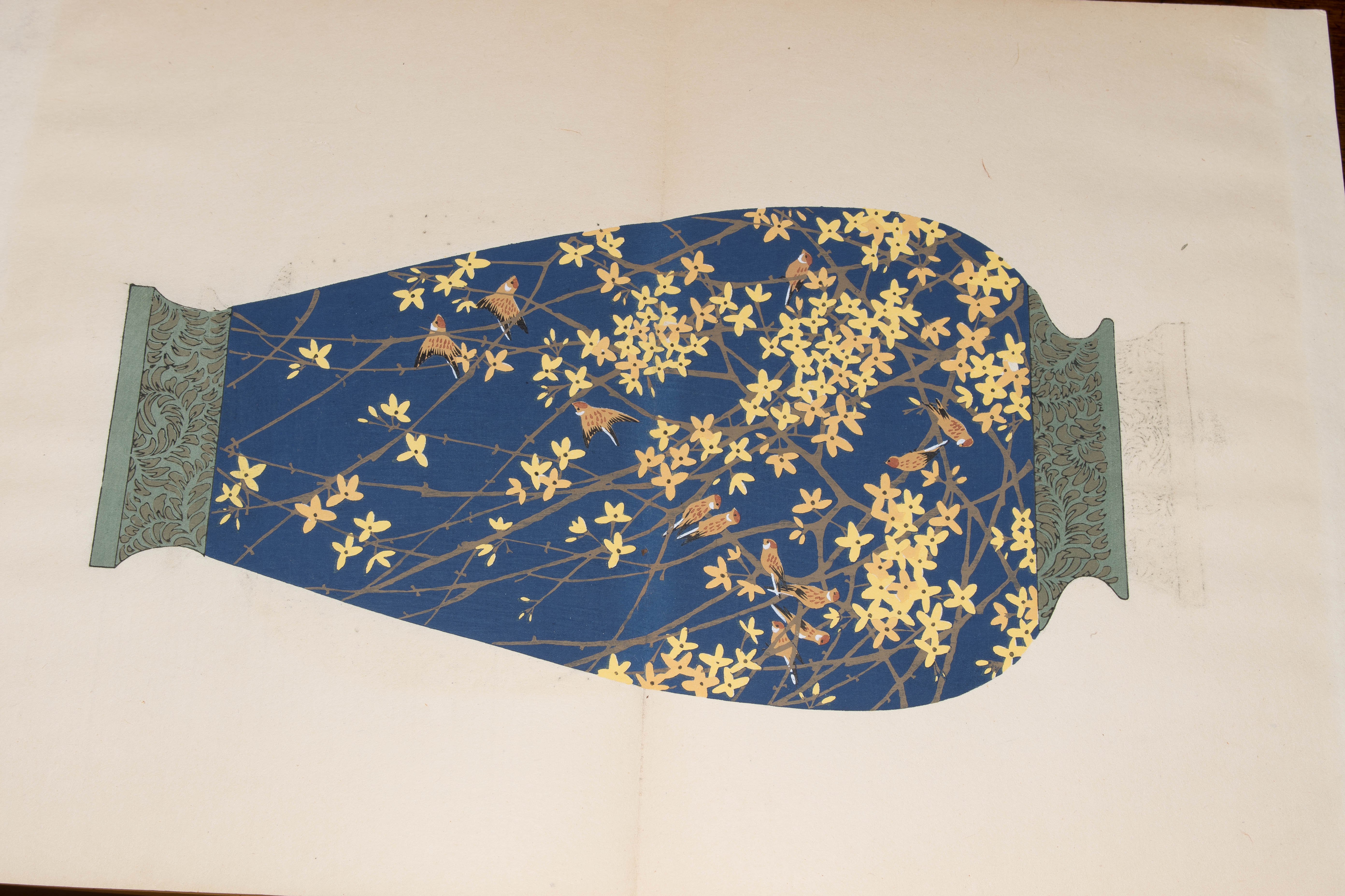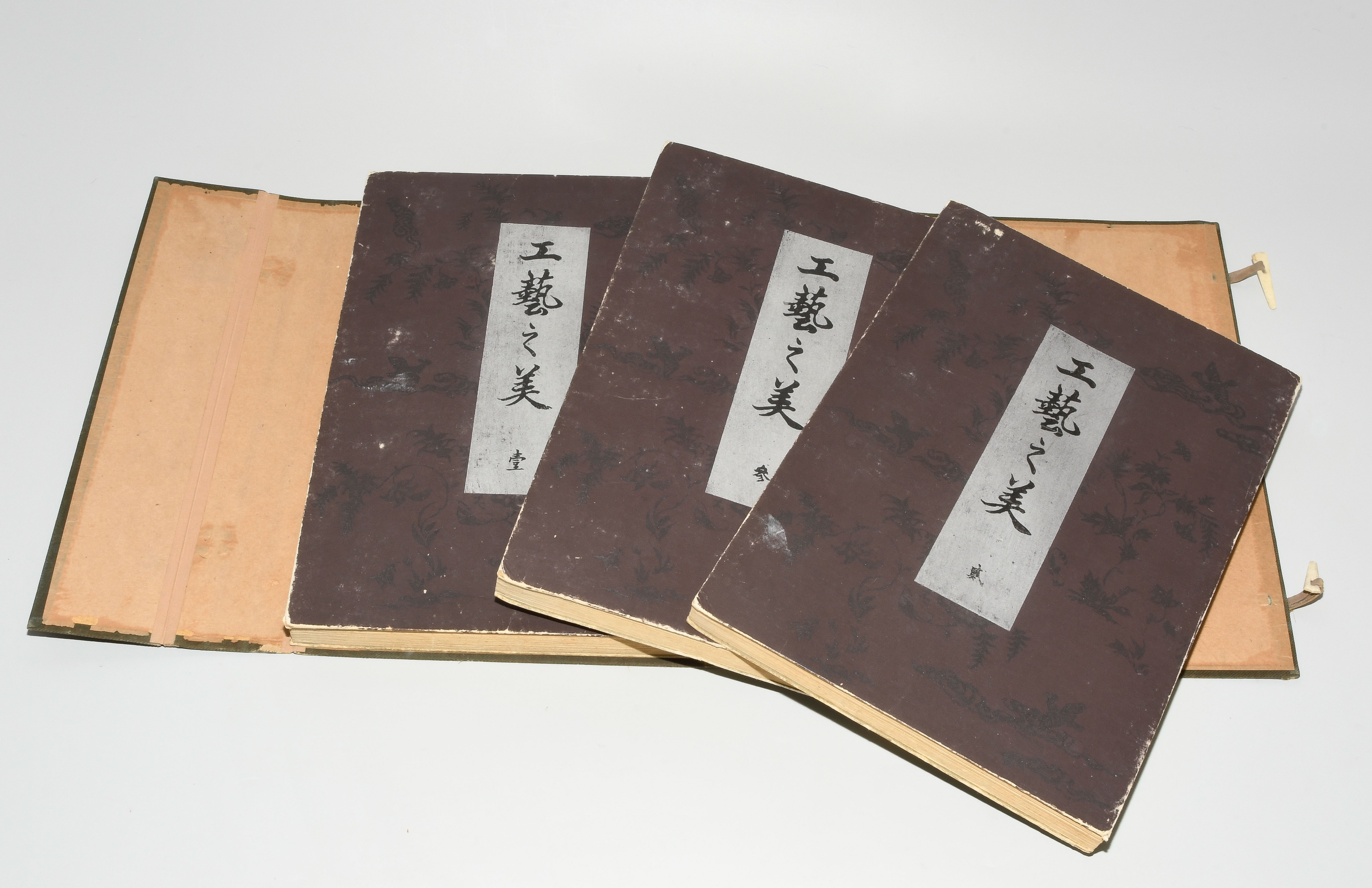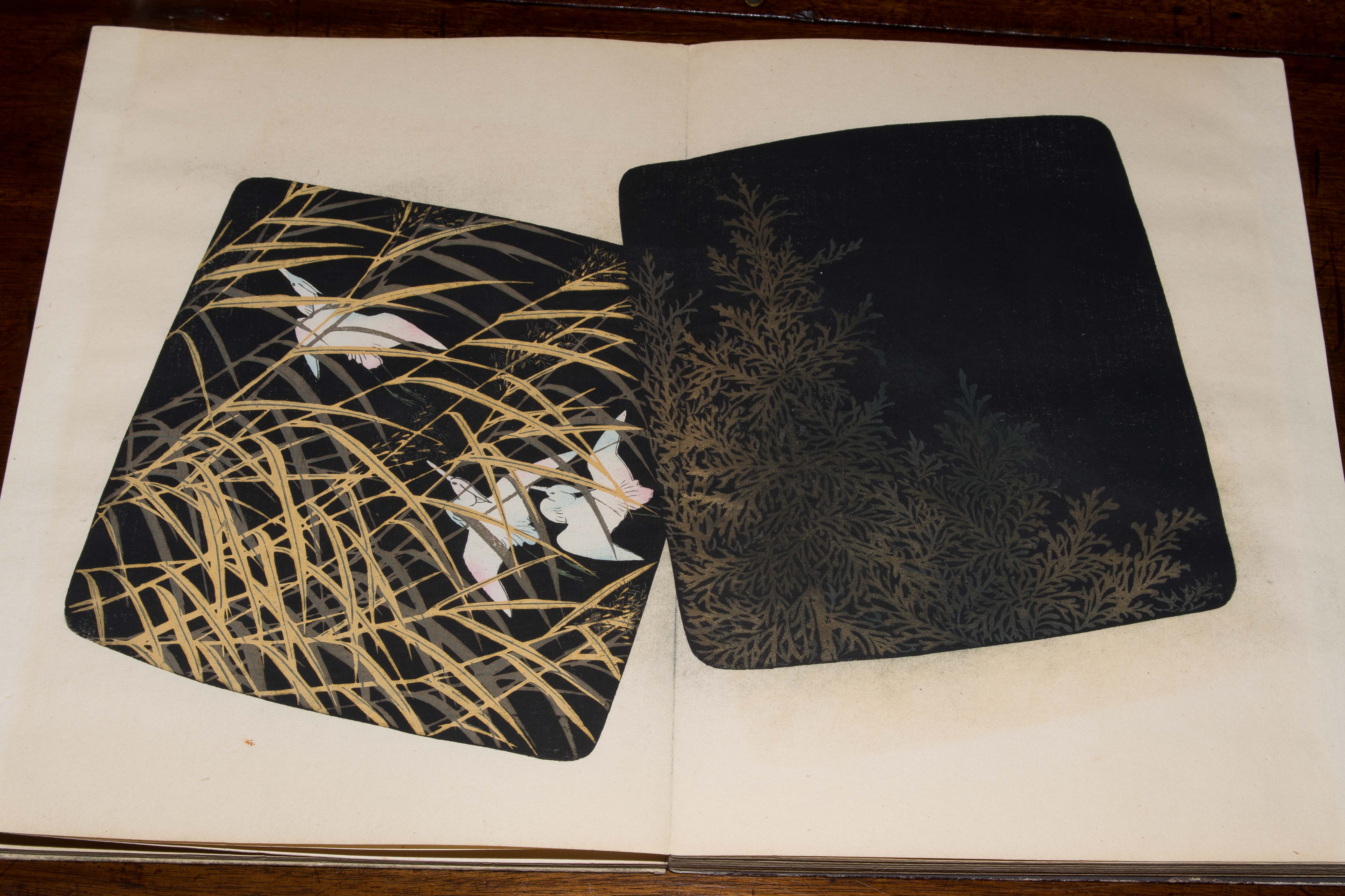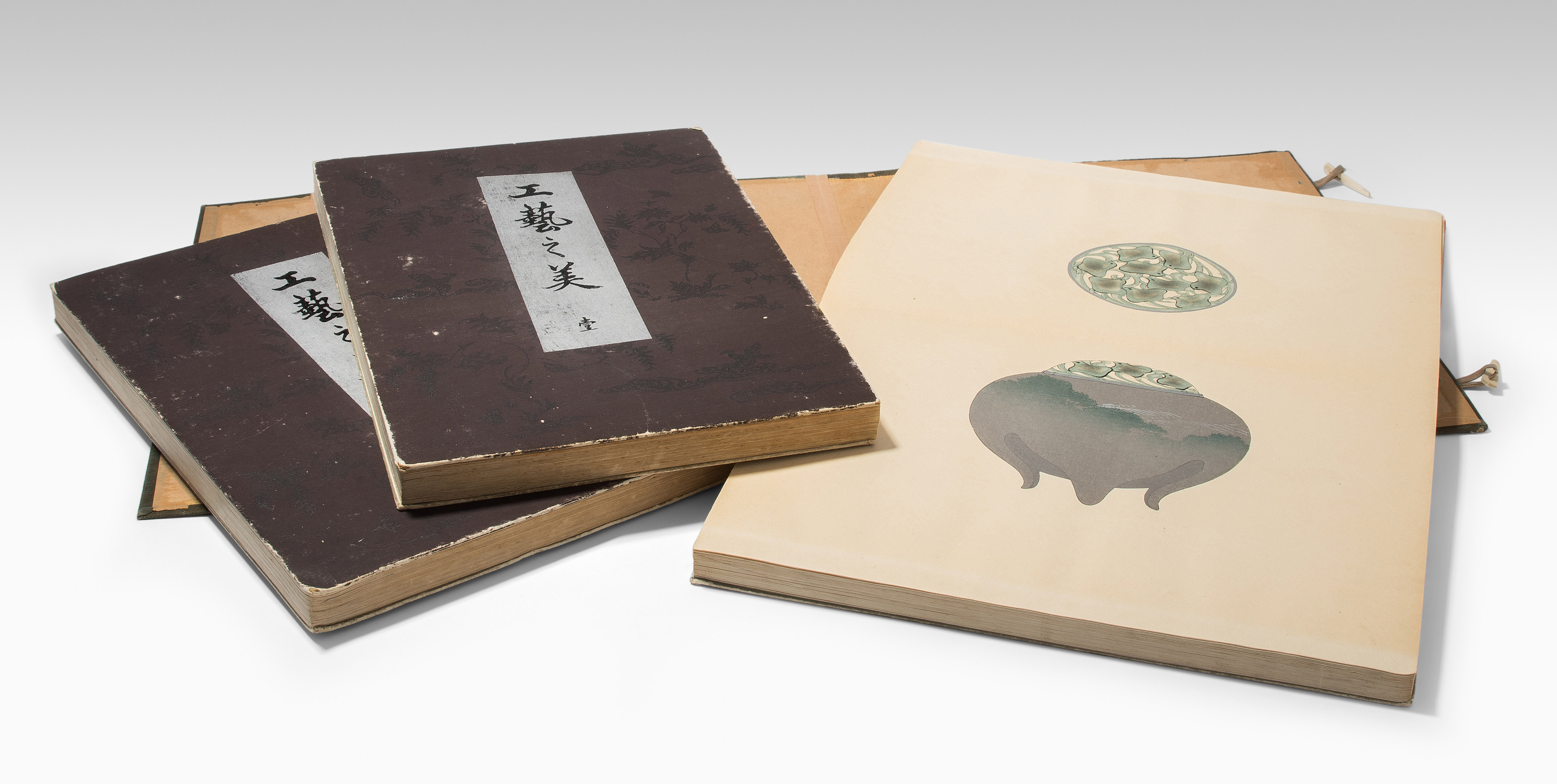 Japan. Farben und Metallpigmente auf Papier. Ori-hon-Bindung. Die Schönheit der Handwerkskunst. Kyôto, Meiji 41 (1908), Unsôdô (Hrsg.). 3 Bde. Mit Kartonschuber.