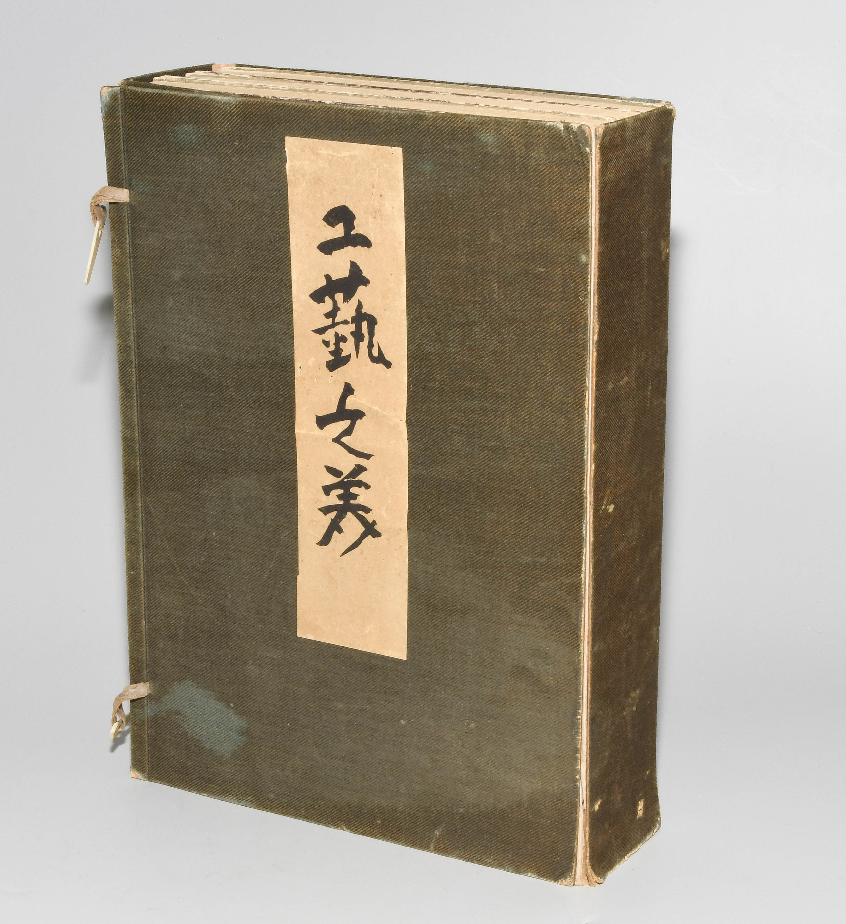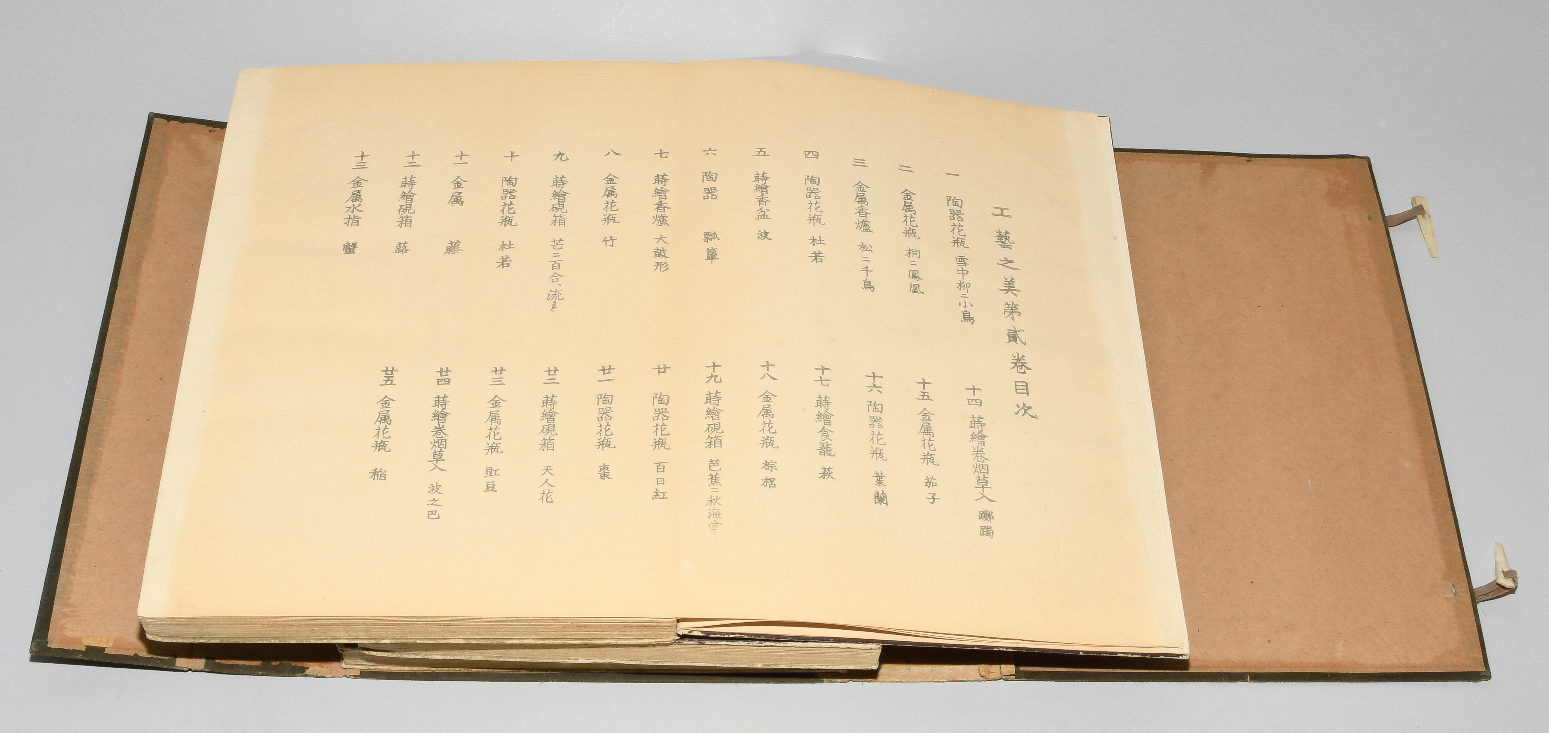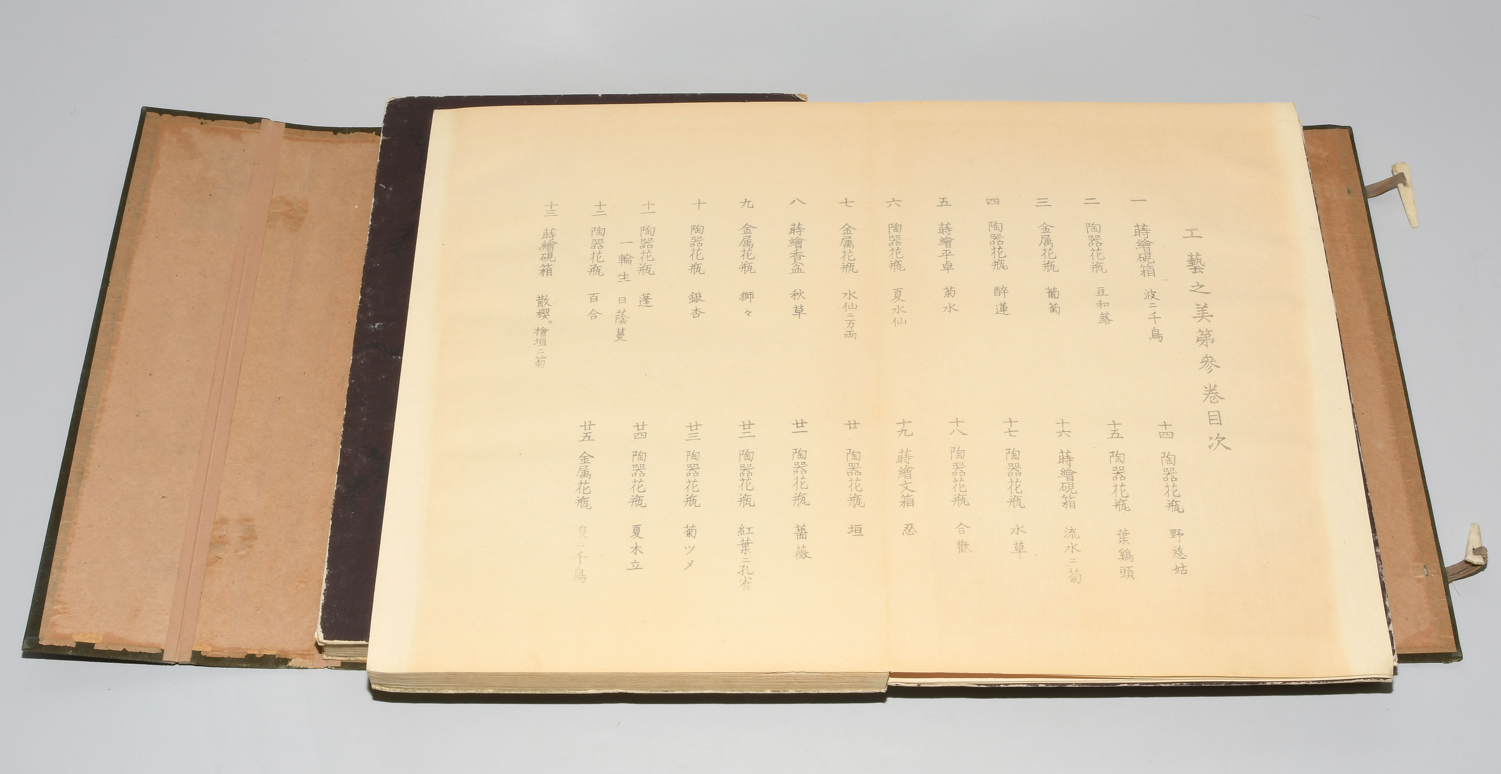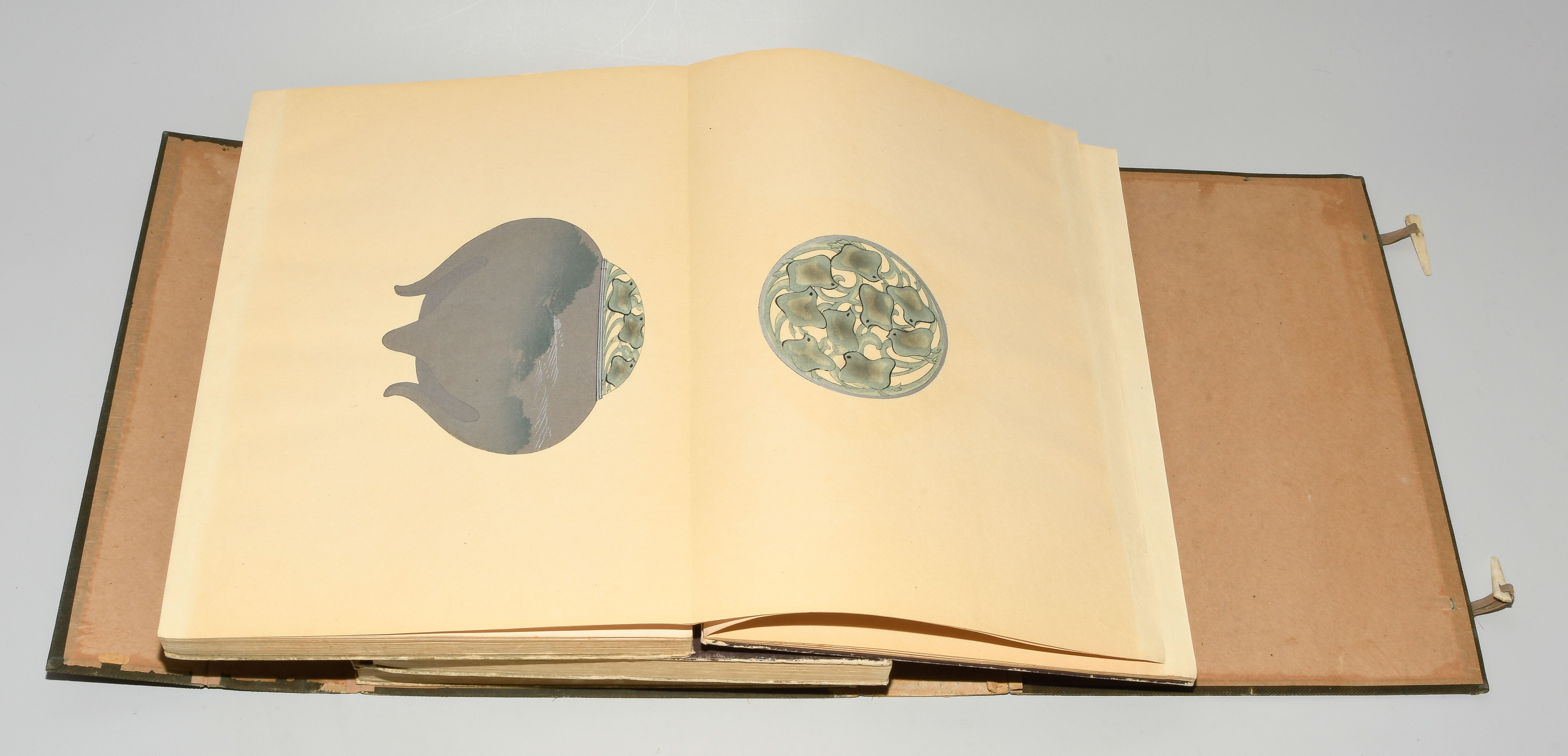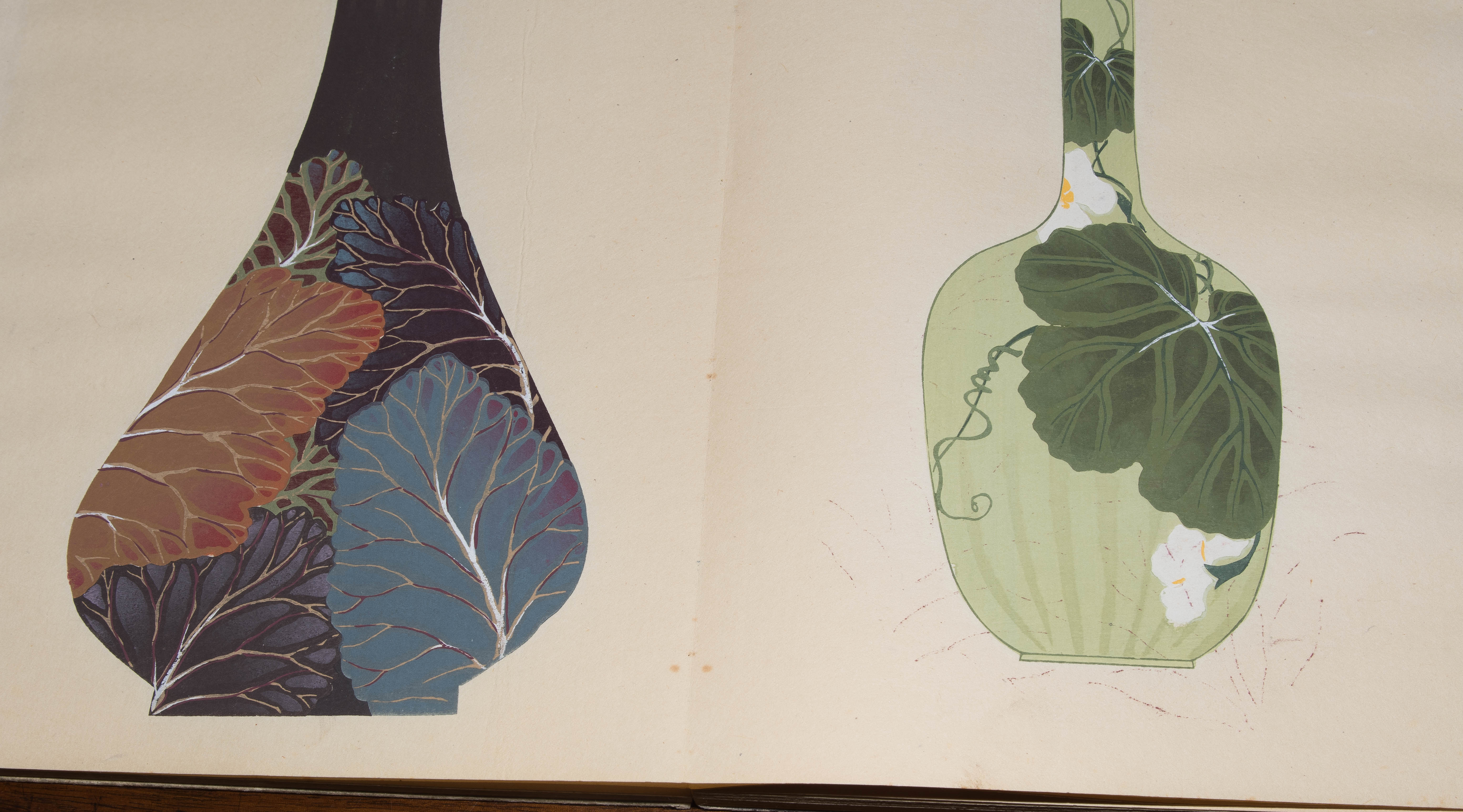 Japan. Farben und Metallpigmente auf Papier. Ori-hon-Bindung. Die Schönheit der Handwerkskunst. Kyôto, Meiji 41 (1908), Unsôdô (Hrsg.). 3 Bde. Mit Kartonschuber.