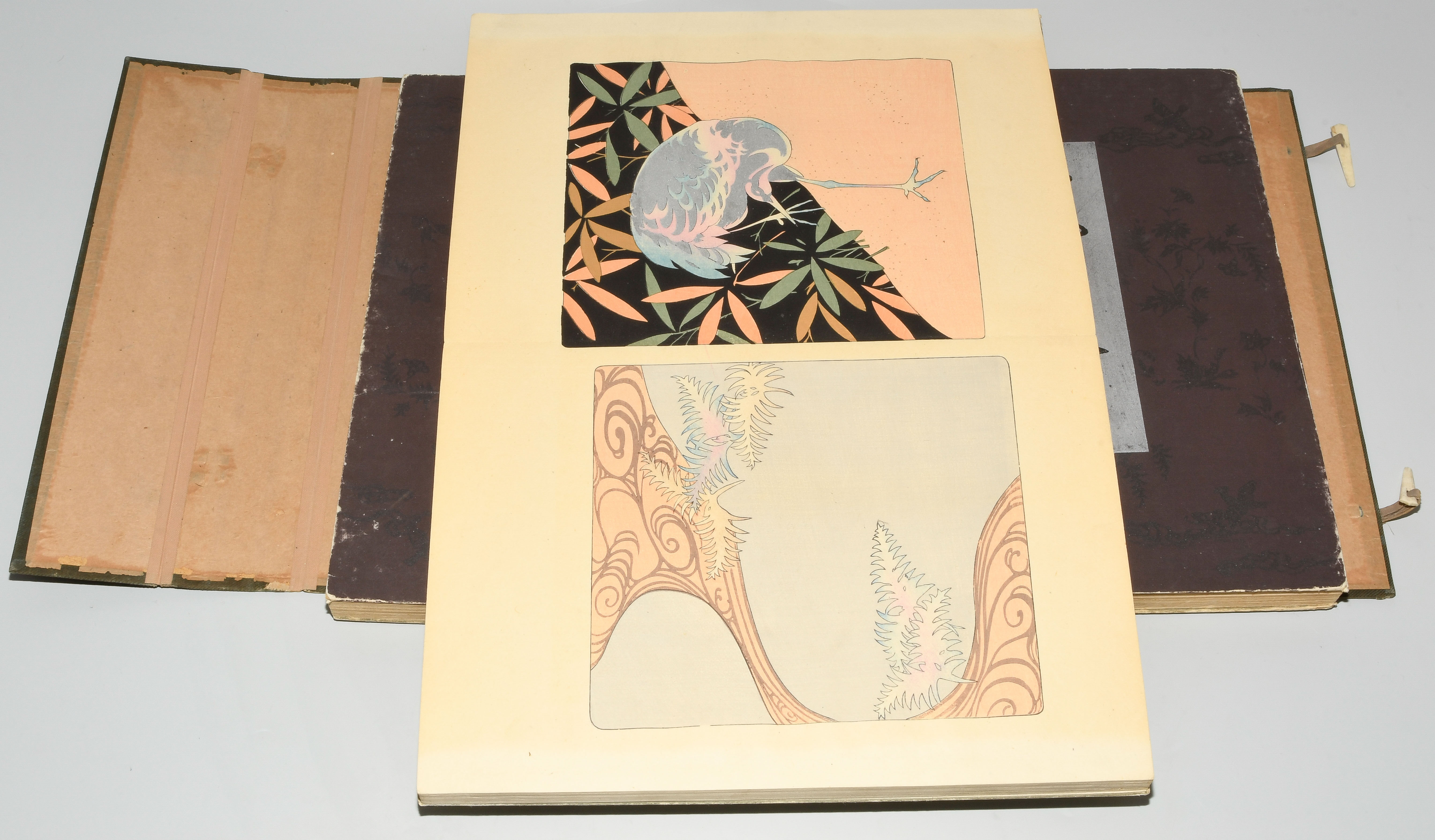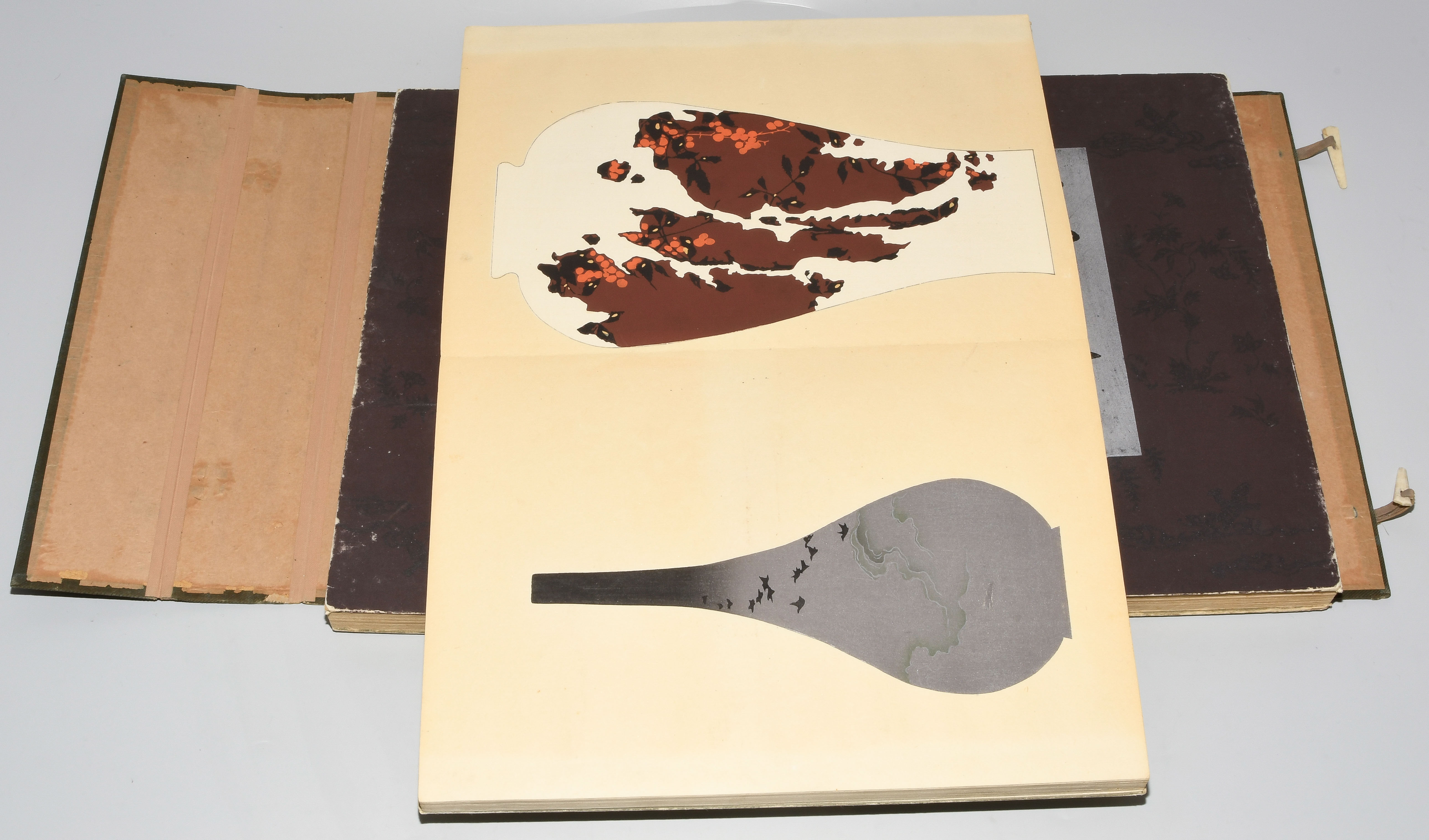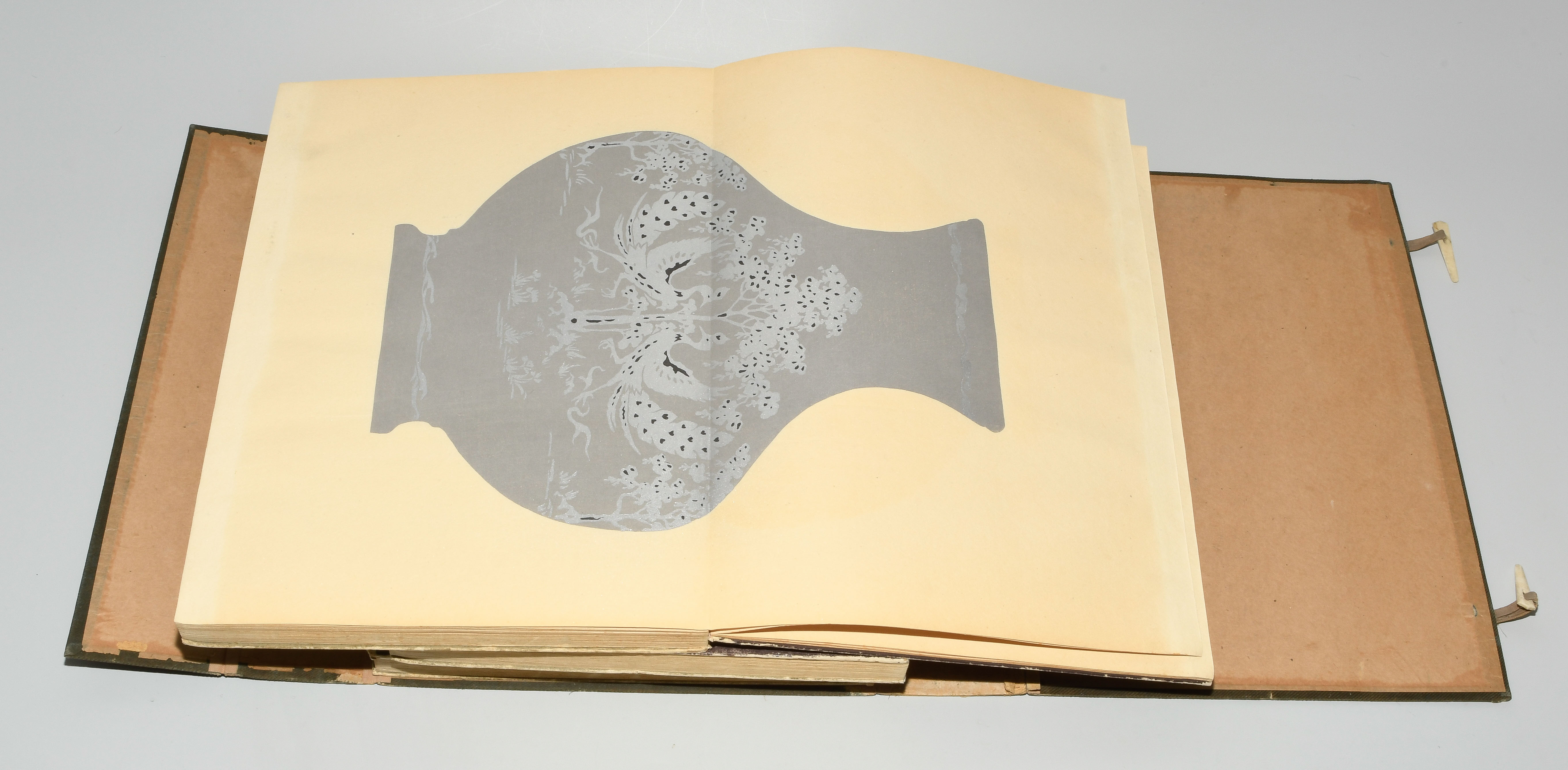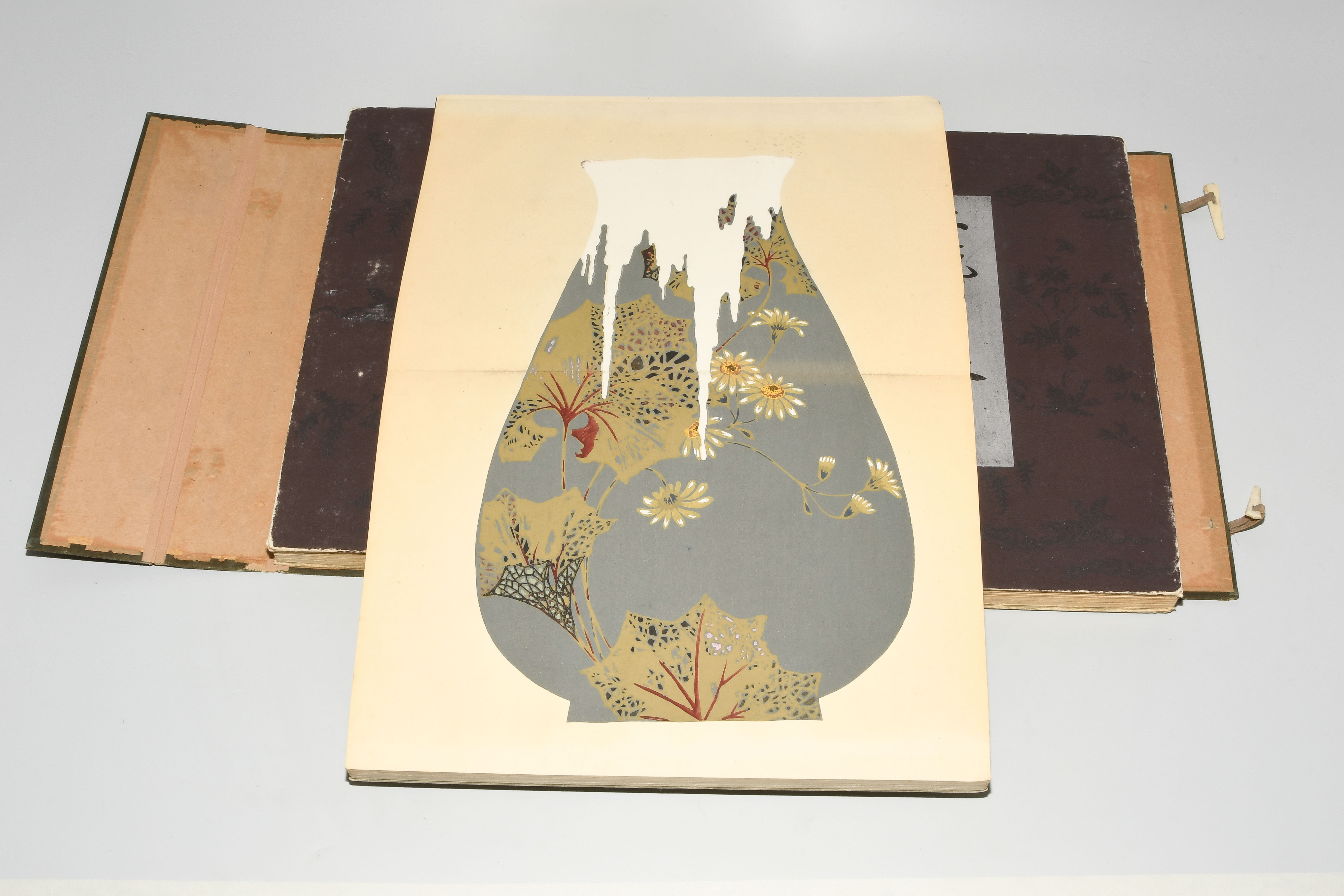 Japan. Farben und Metallpigmente auf Papier. Ori-hon-Bindung. Die Schönheit der Handwerkskunst. Kyôto, Meiji 41 (1908), Unsôdô (Hrsg.). 3 Bde. Mit Kartonschuber.