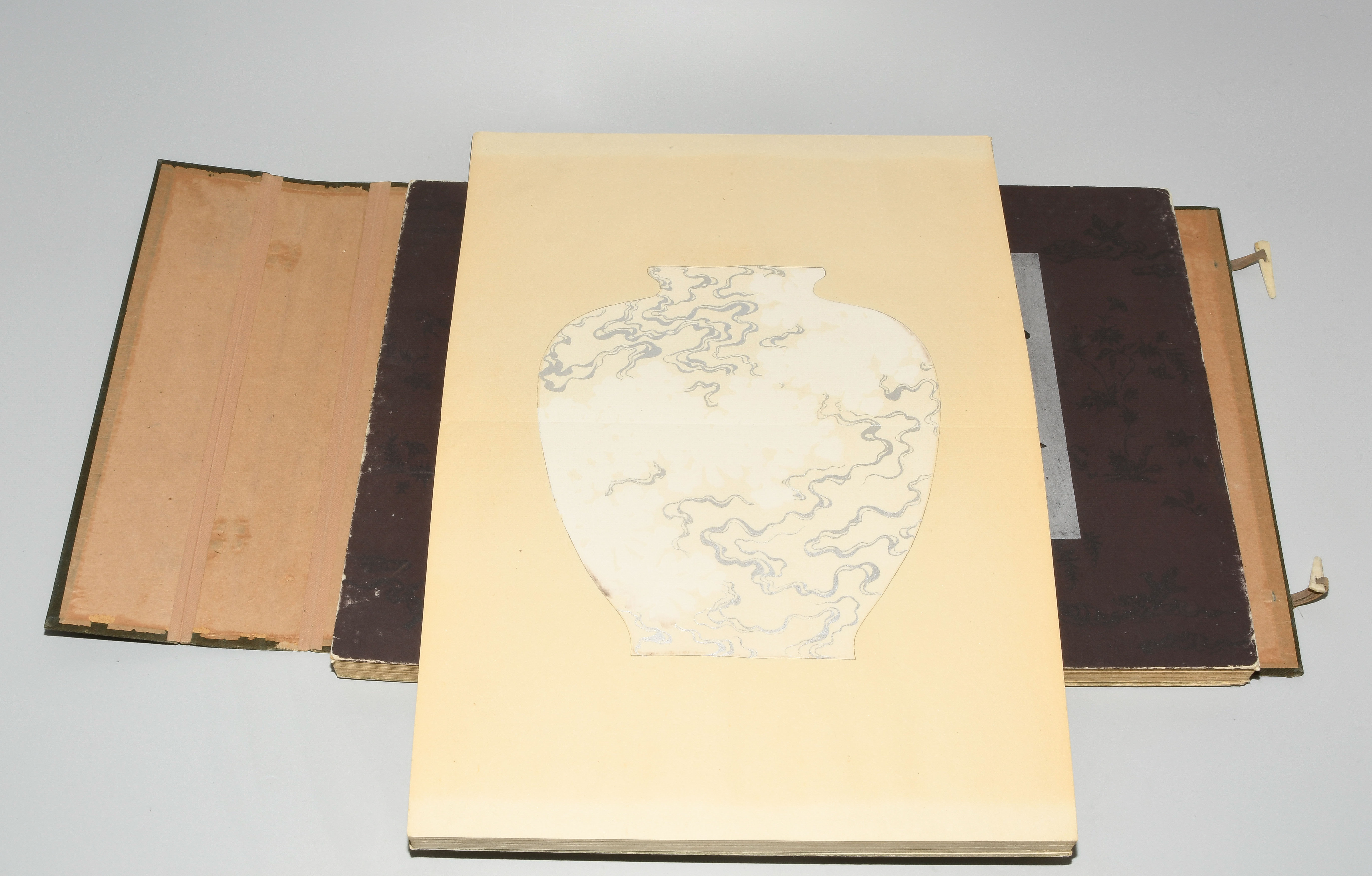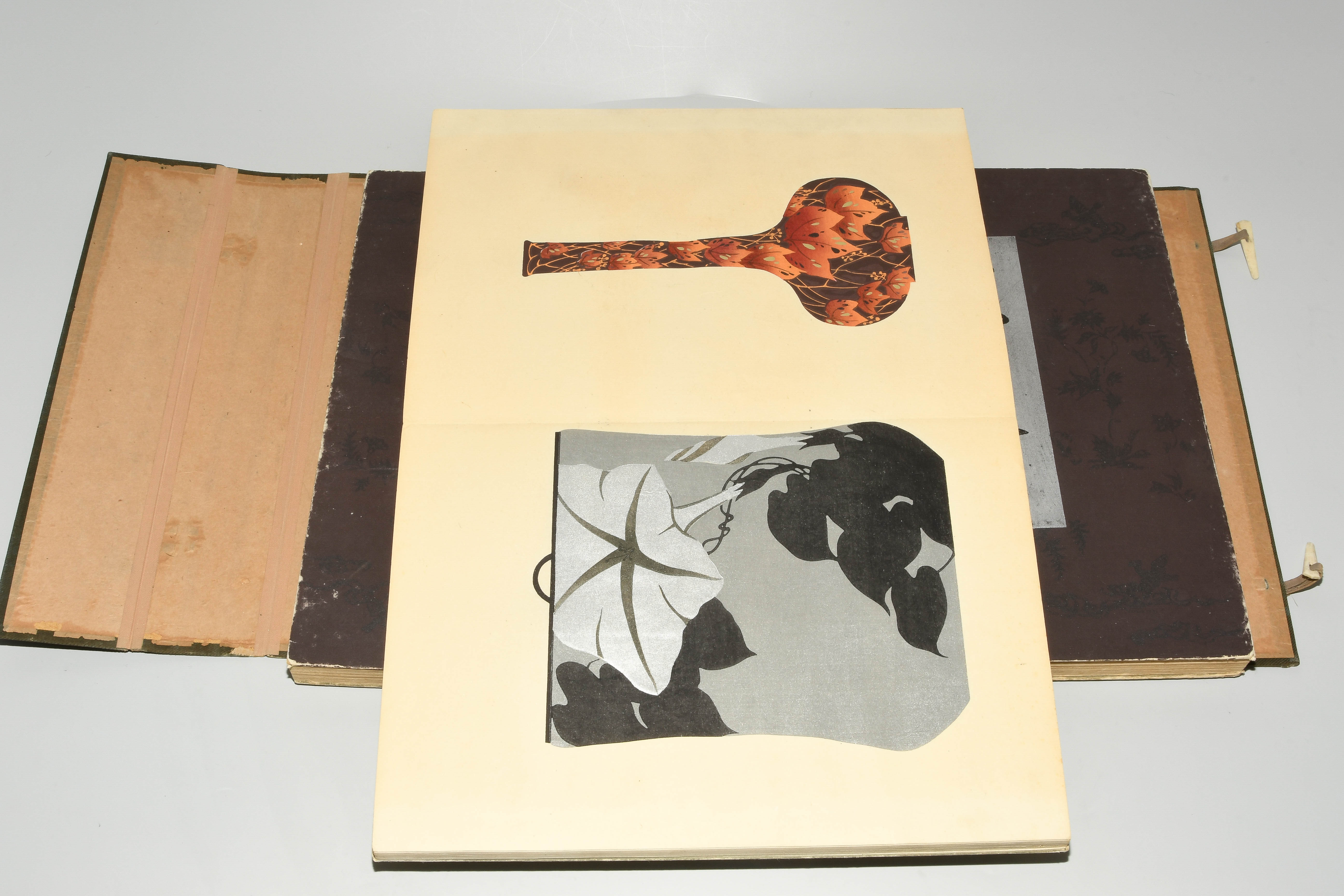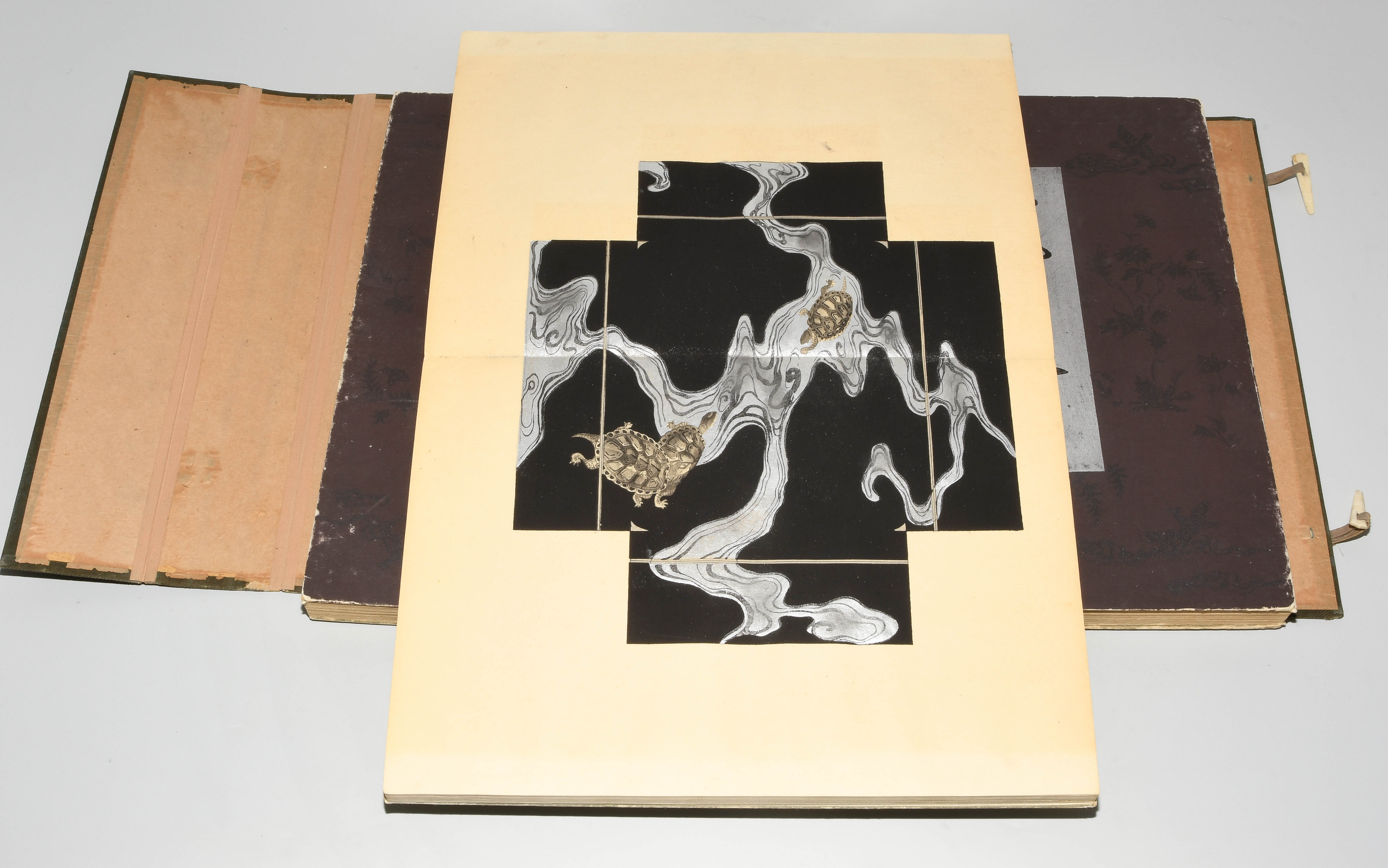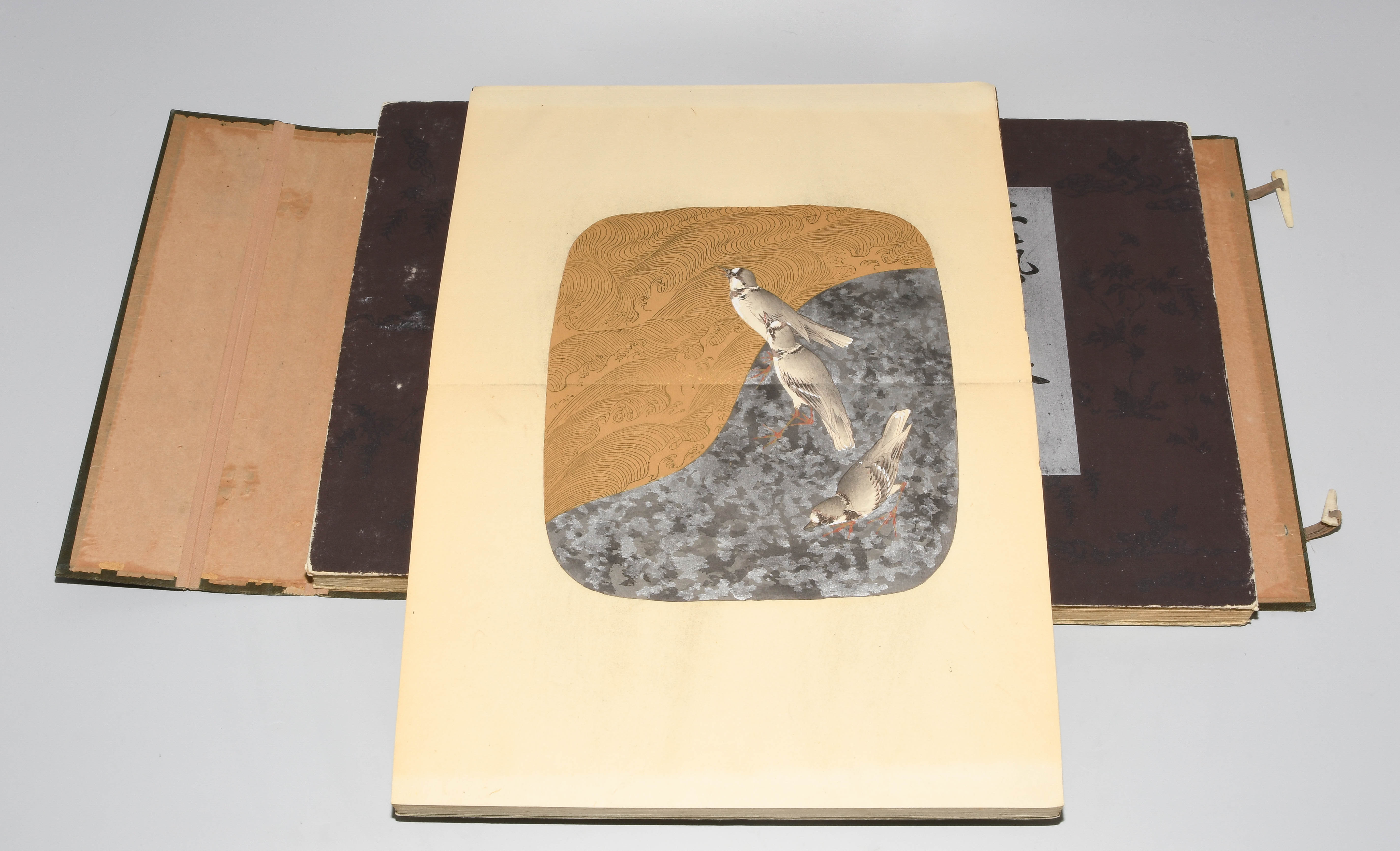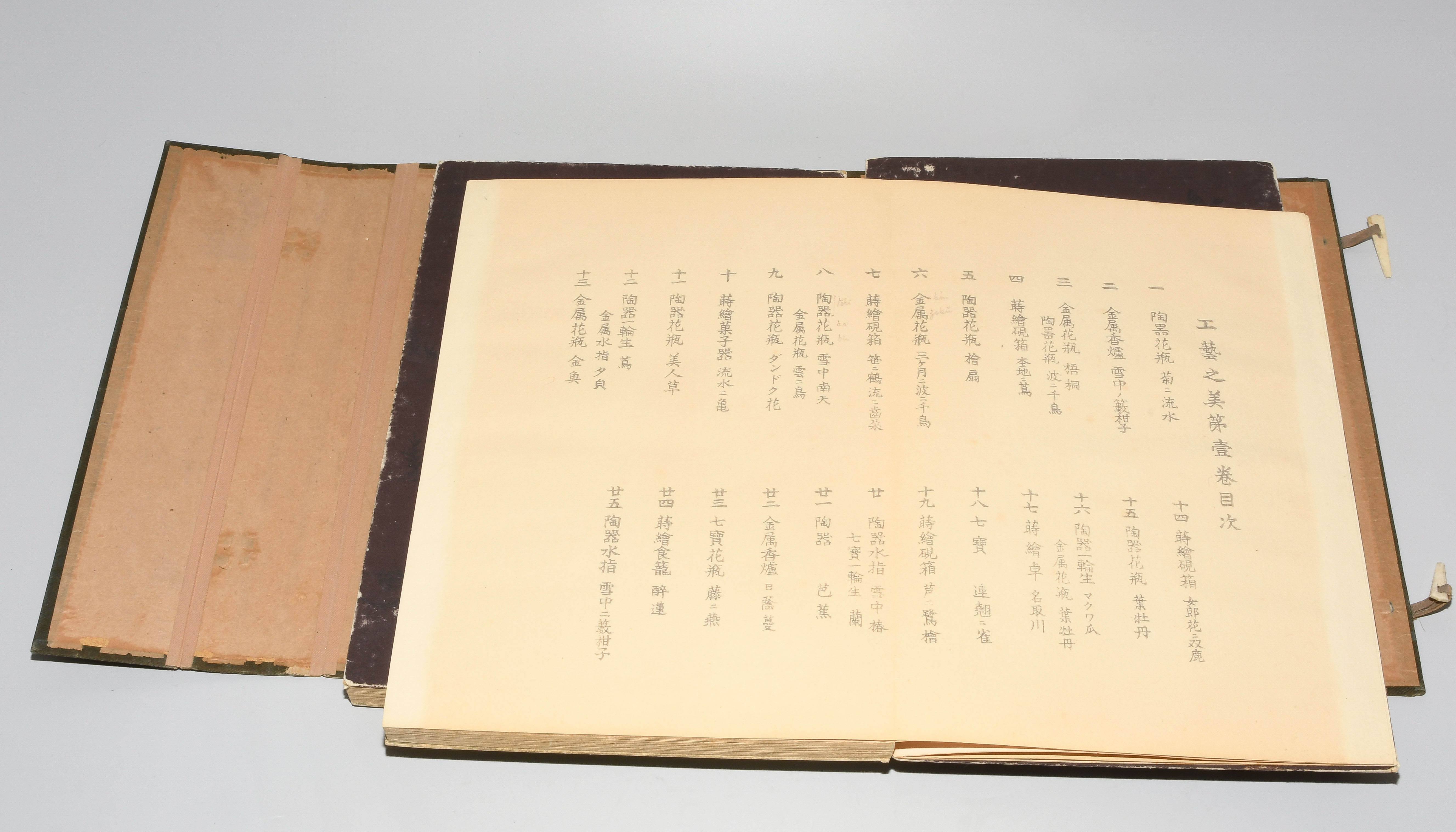 Japan. Farben und Metallpigmente auf Papier. Ori-hon-Bindung. Die Schönheit der Handwerkskunst. Kyôto, Meiji 41 (1908), Unsôdô (Hrsg.). 3 Bde. Mit Kartonschuber.