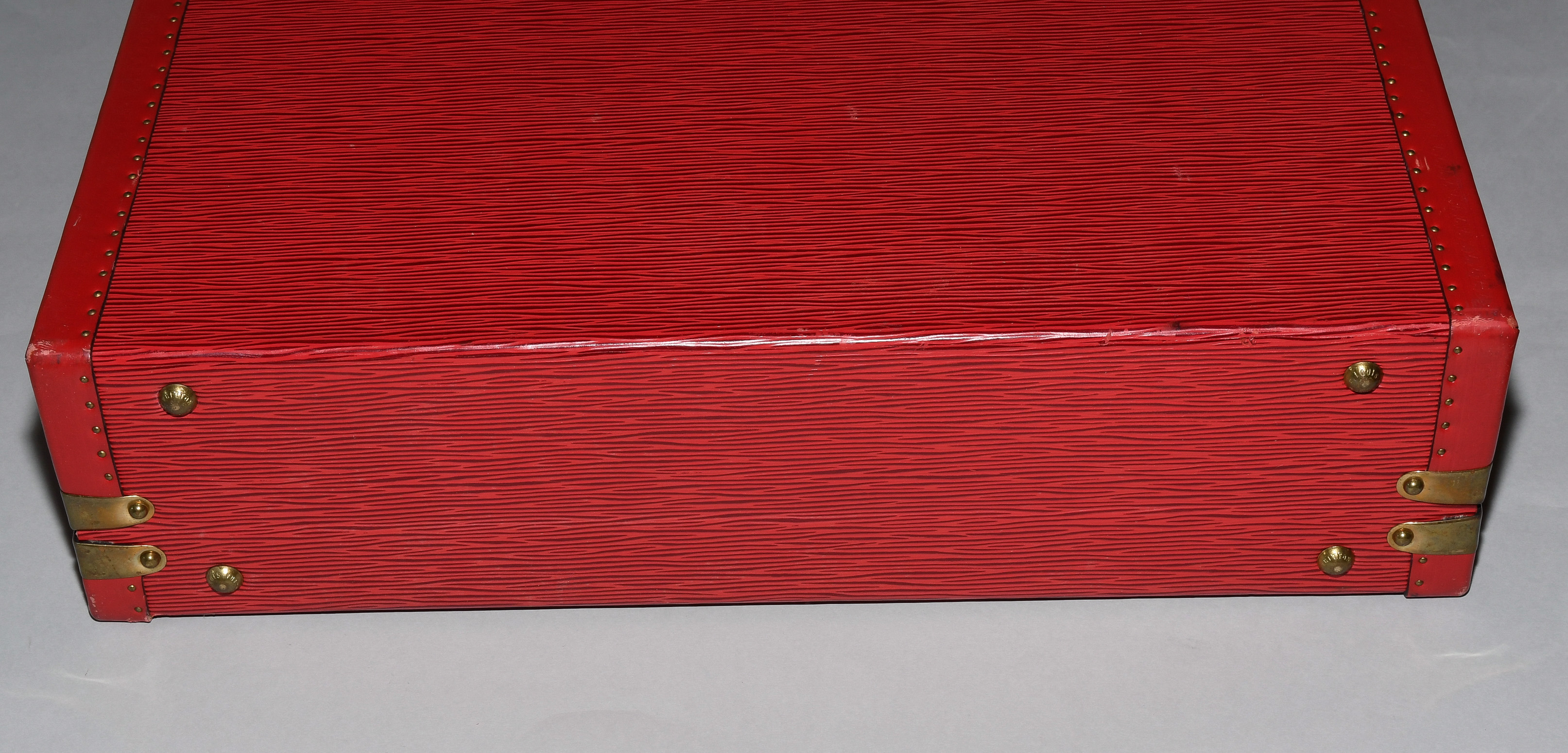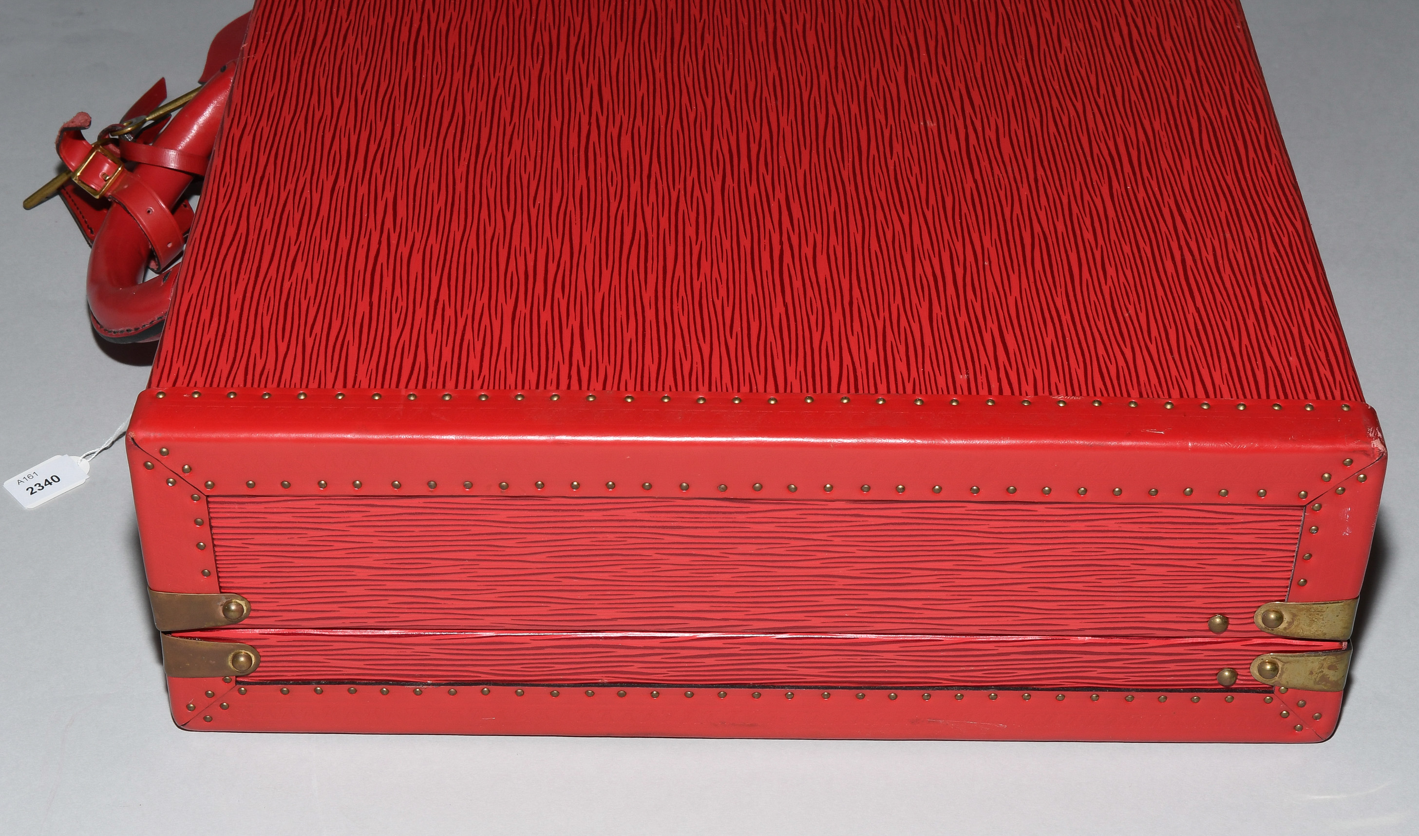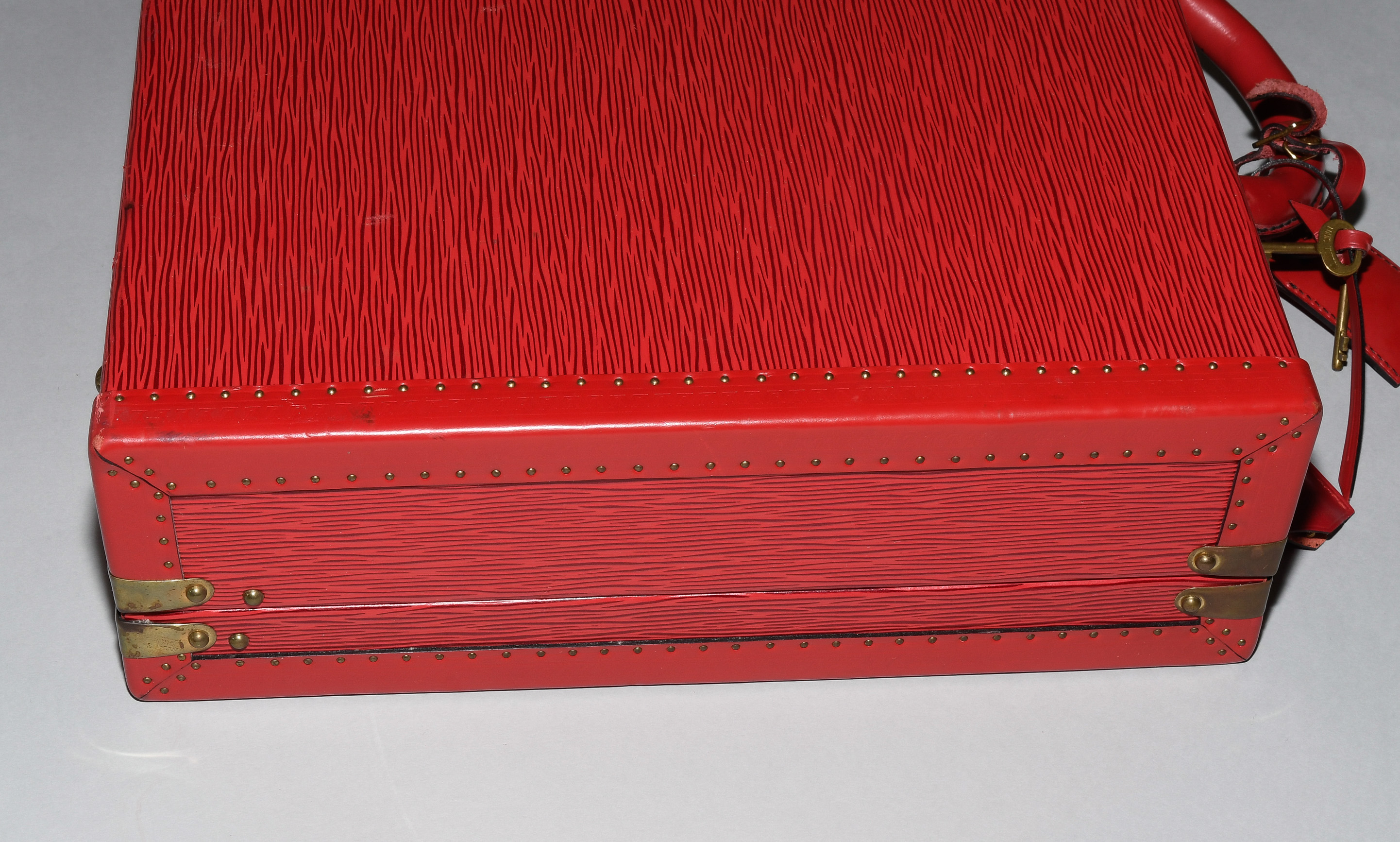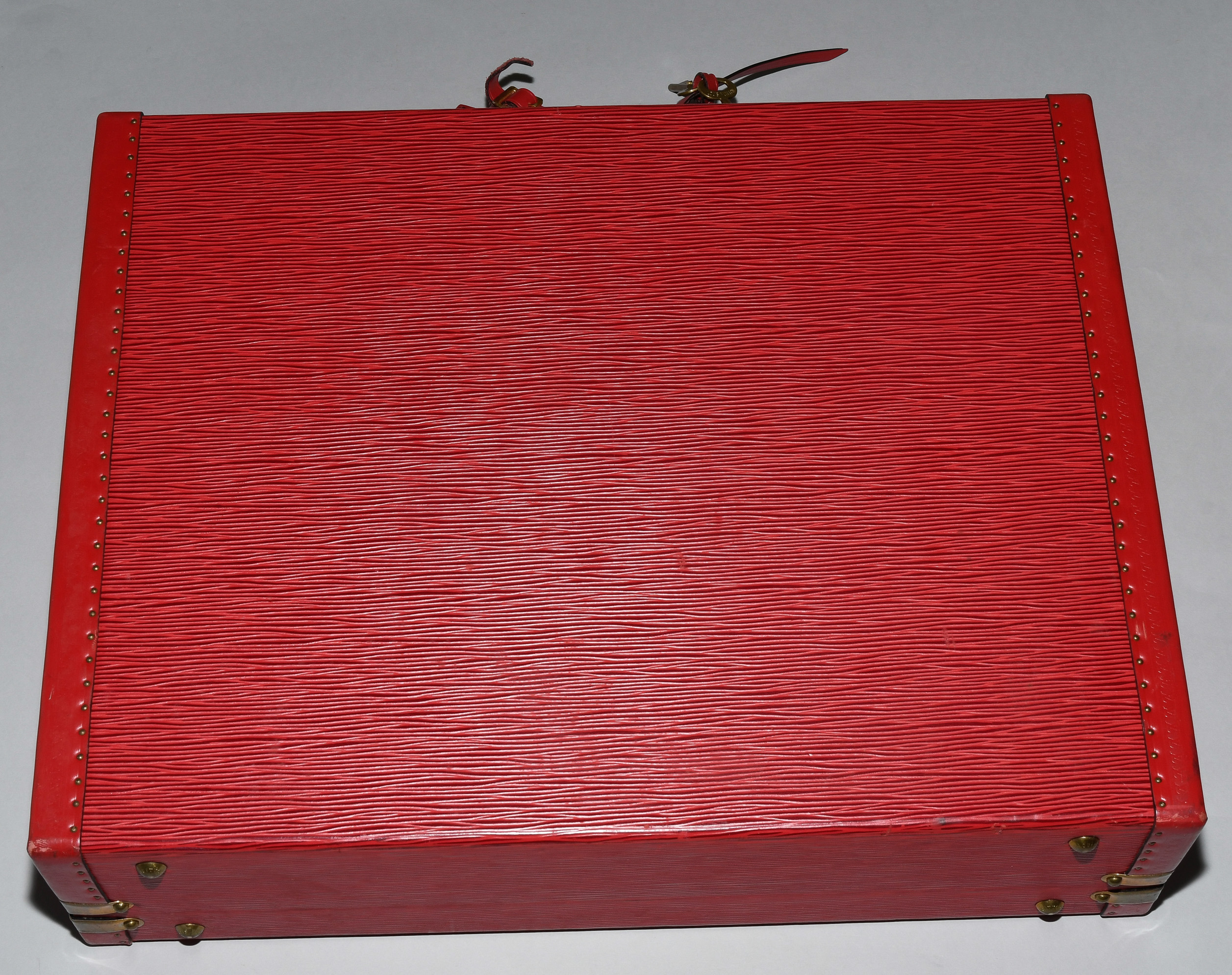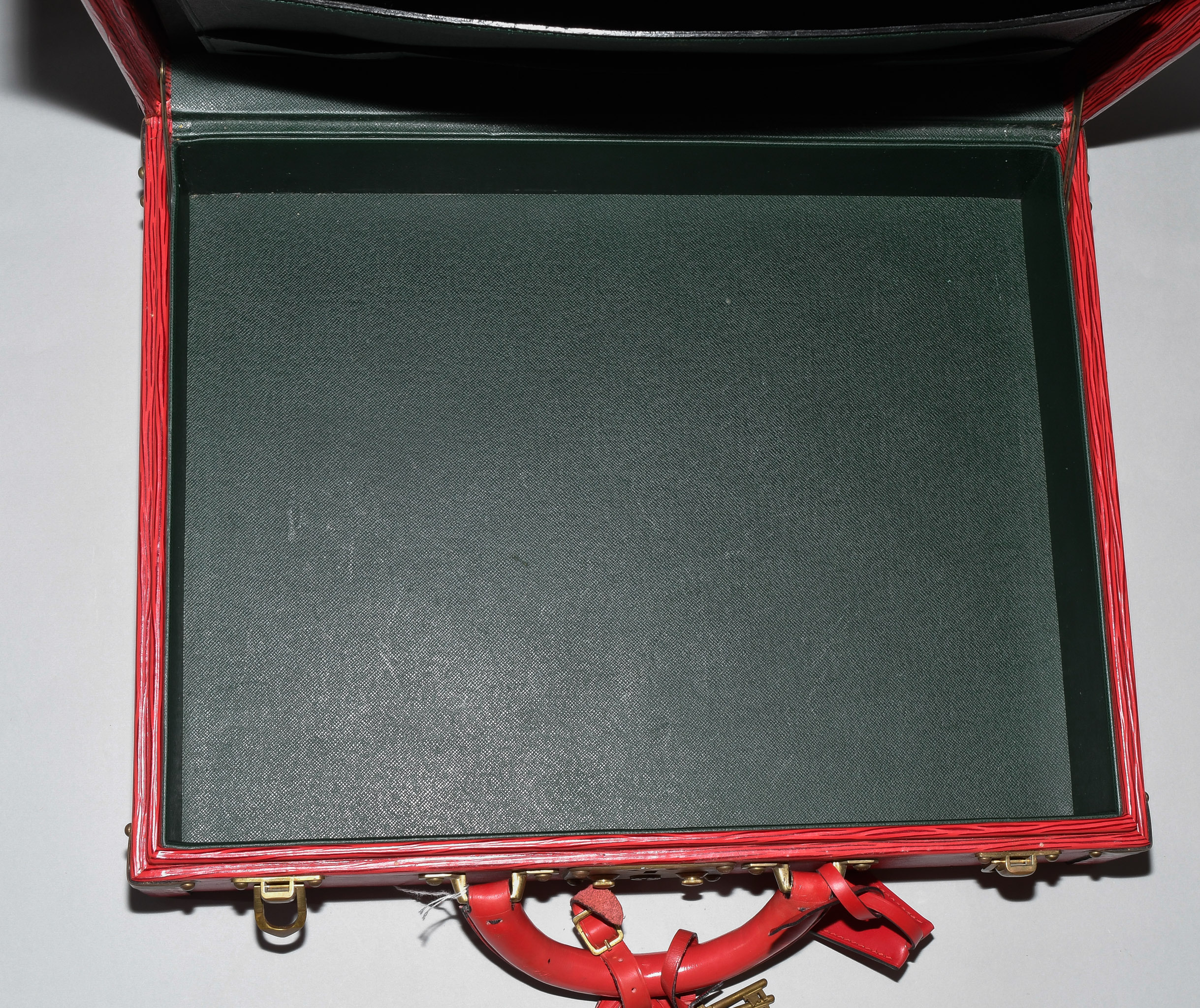 Aus rotem Epi-Leder. Clochette mit zwei Schlüsseln. Adressanhänger. Druckknopfverschluss, flankiert von zwei Schnappverschlüssen. Mit Schutzbeutel. 45x45x11,5 cm.
