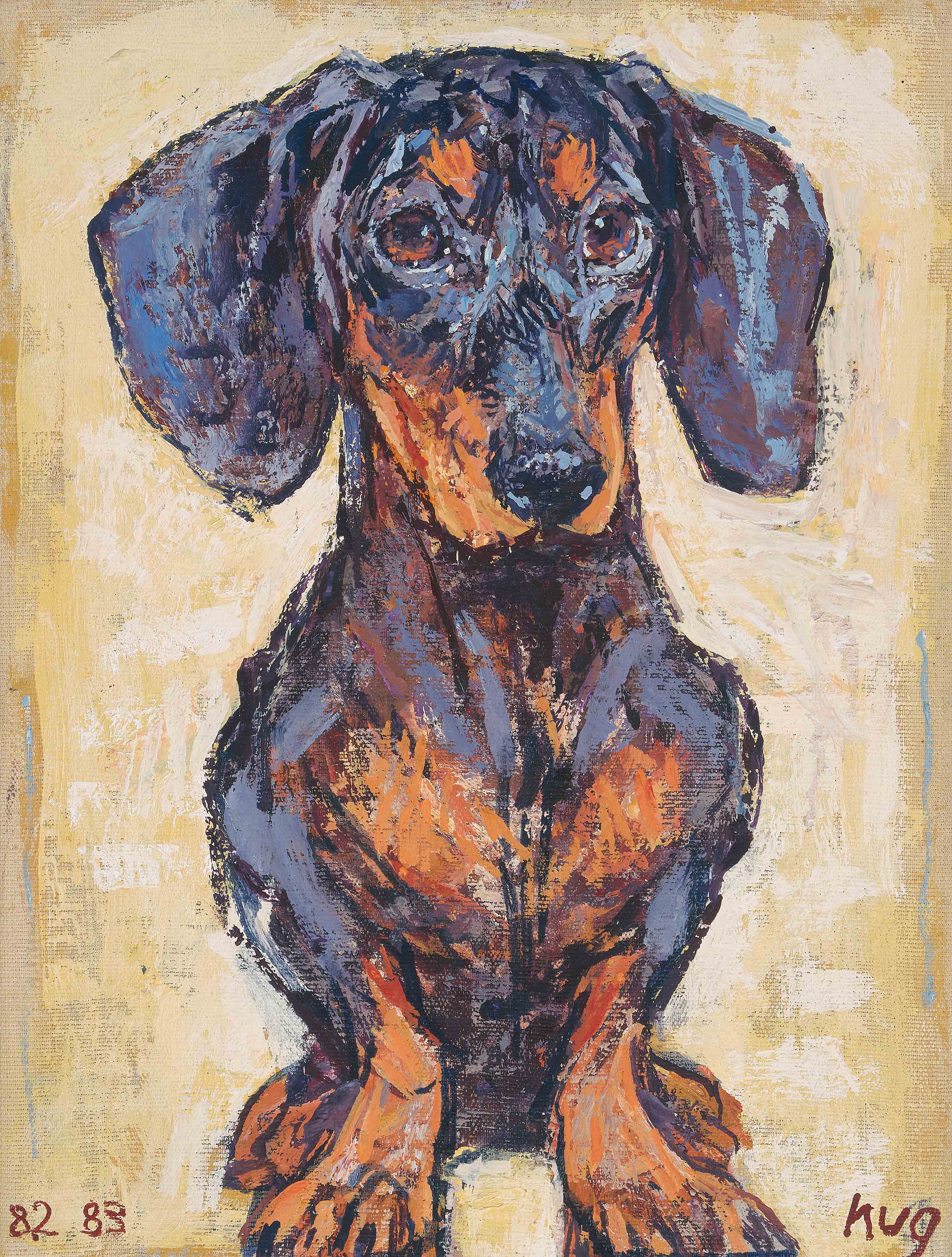 Sitzender Kurzhaardackel, 1982/83. Öl auf Leinwand. Unten rechts signiert, unten links datiert. 40x30 cm.