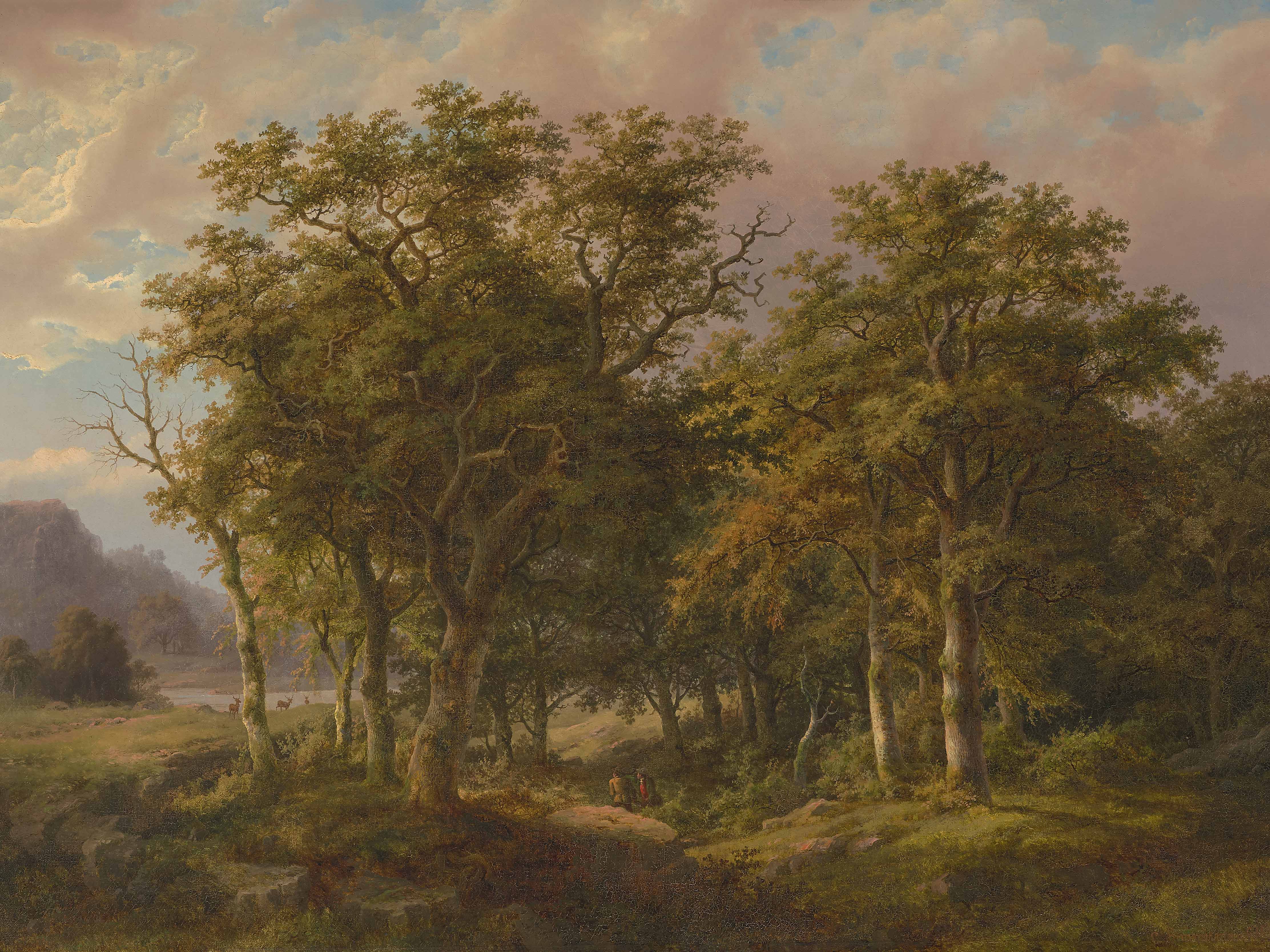 Bewaldete Landschaft mit Jägern. 1861. Öl auf Leinwand. Unten rechts signiert und datiert. 76,5x102 cm.