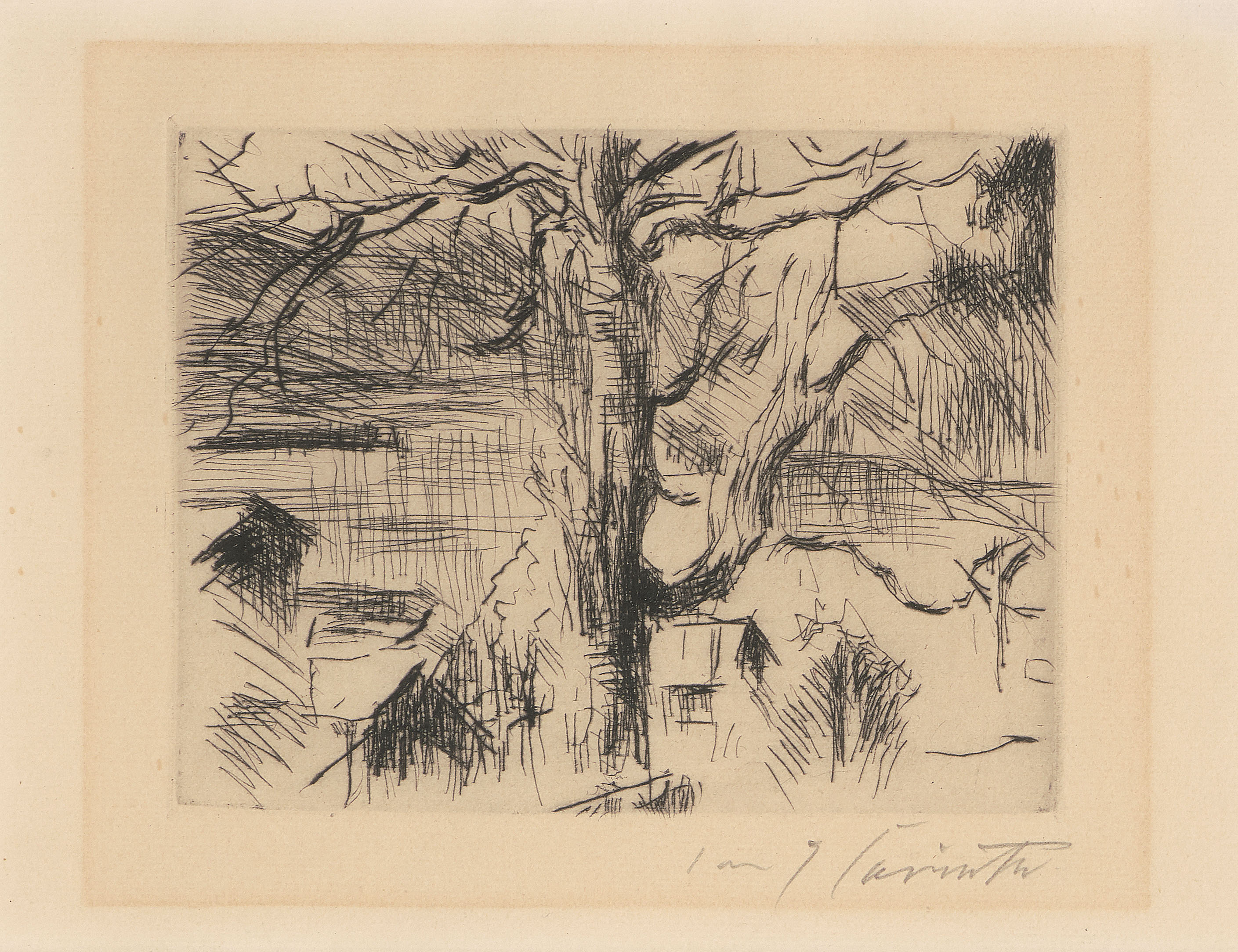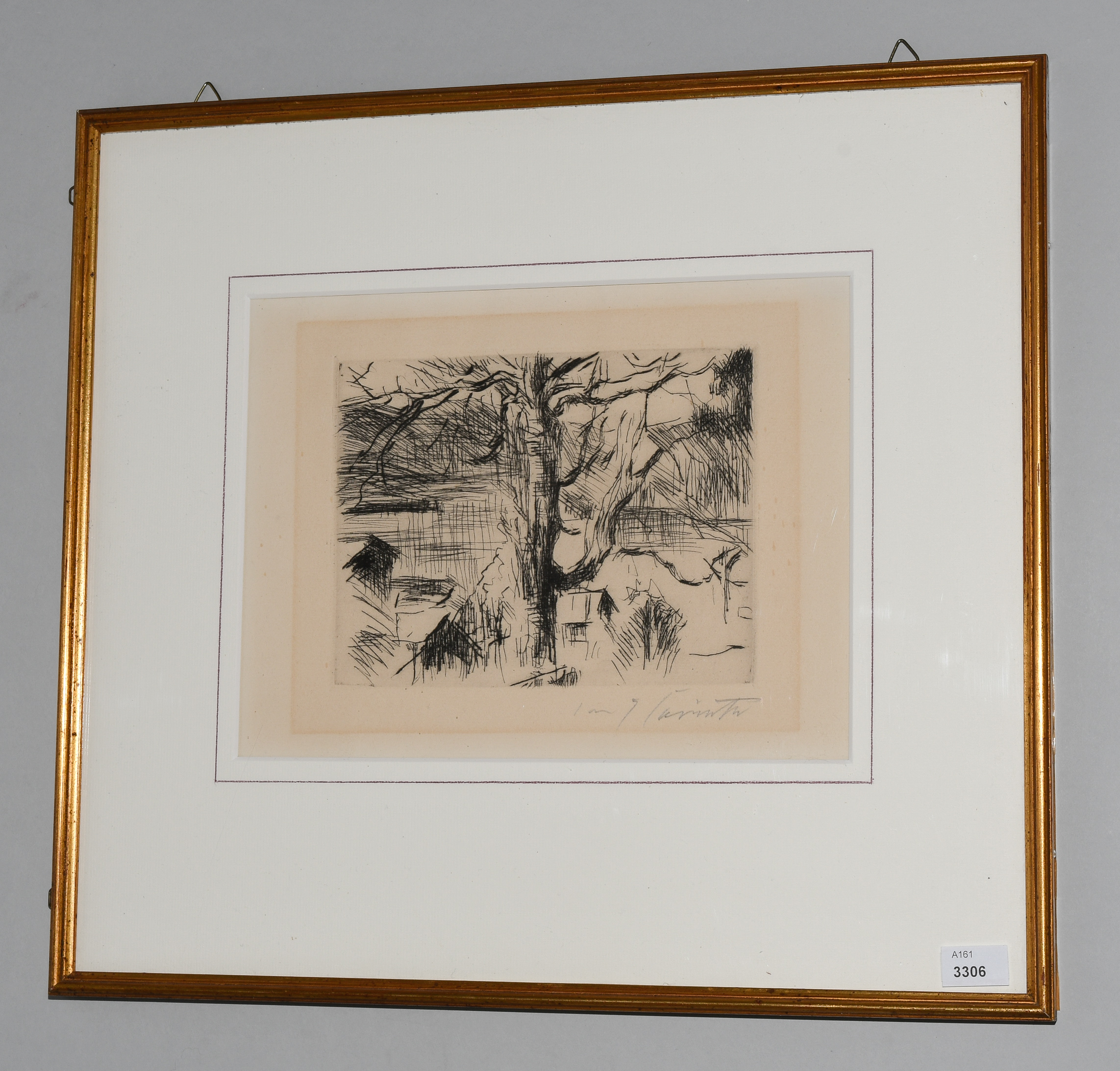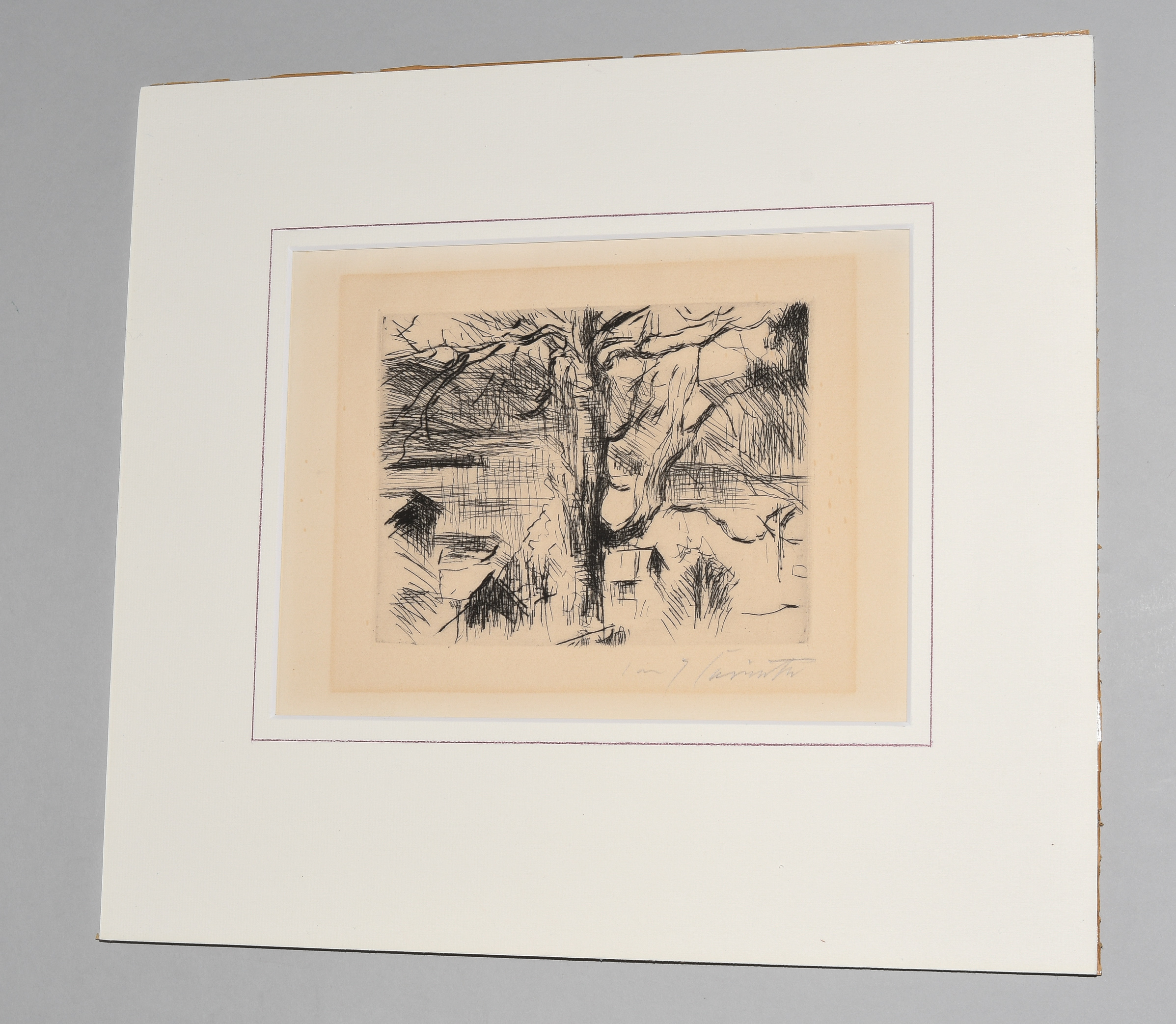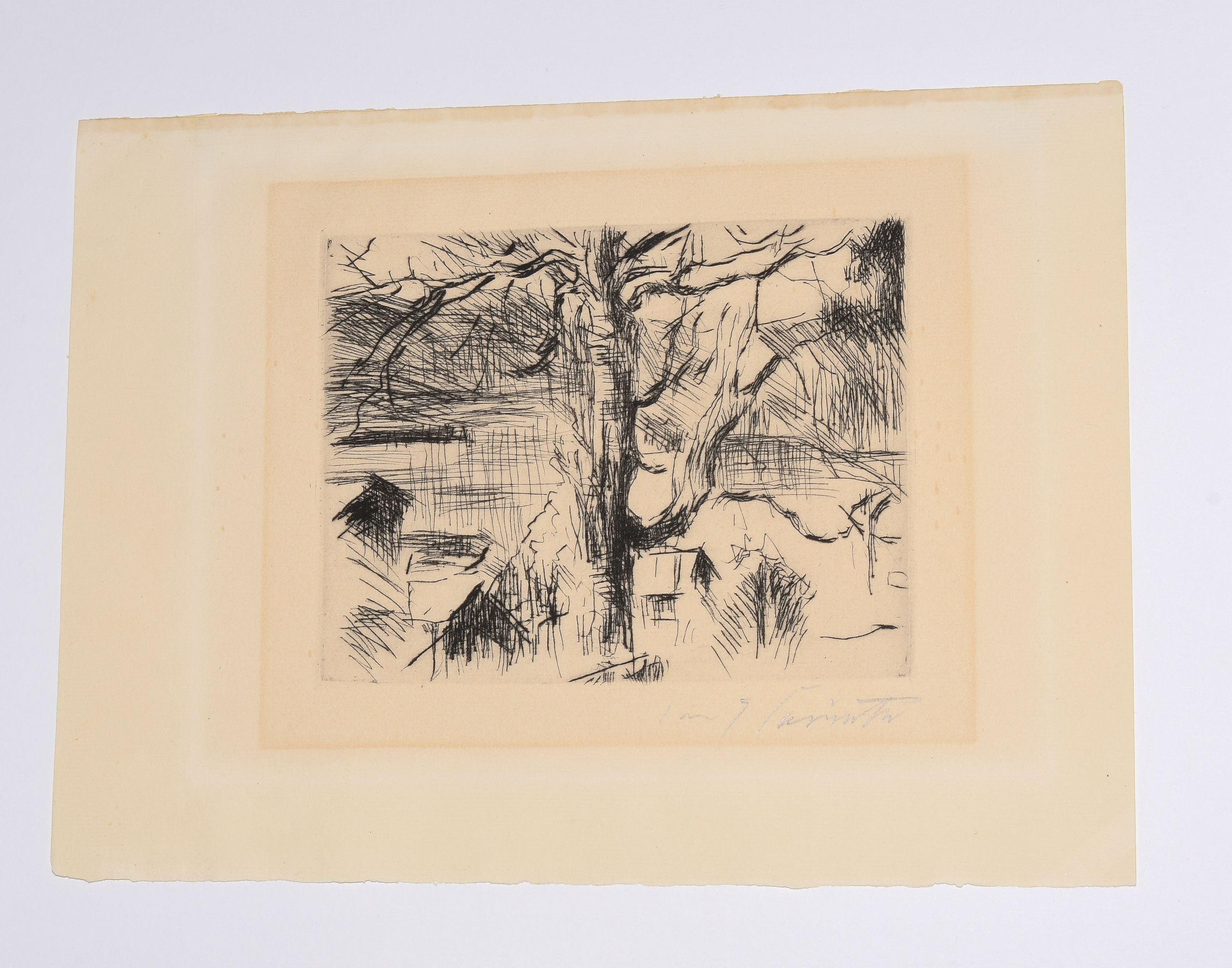 Baum am Walchensee. 1923. Radierung. Unten rechts in Bleistift signiert. Plattengrösse 13,5x17,2 cm. Blattgrösse 23x31,2 cm. Gerahmt. -Blatt leicht gebräunt. Hellerer Lichtrand. Leicht gewellt und wenig fleckig. Verso am oberen Rand an Rückkarton montiert.