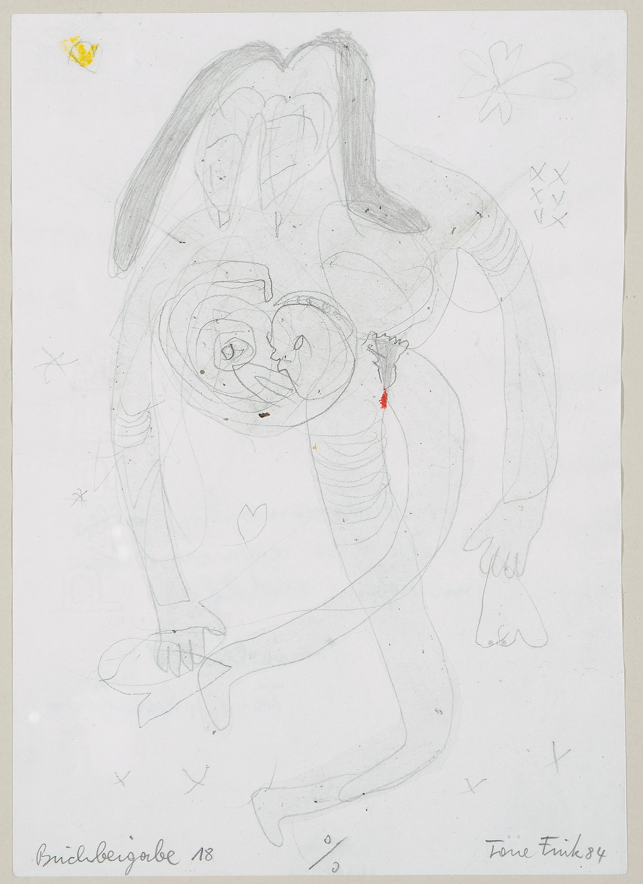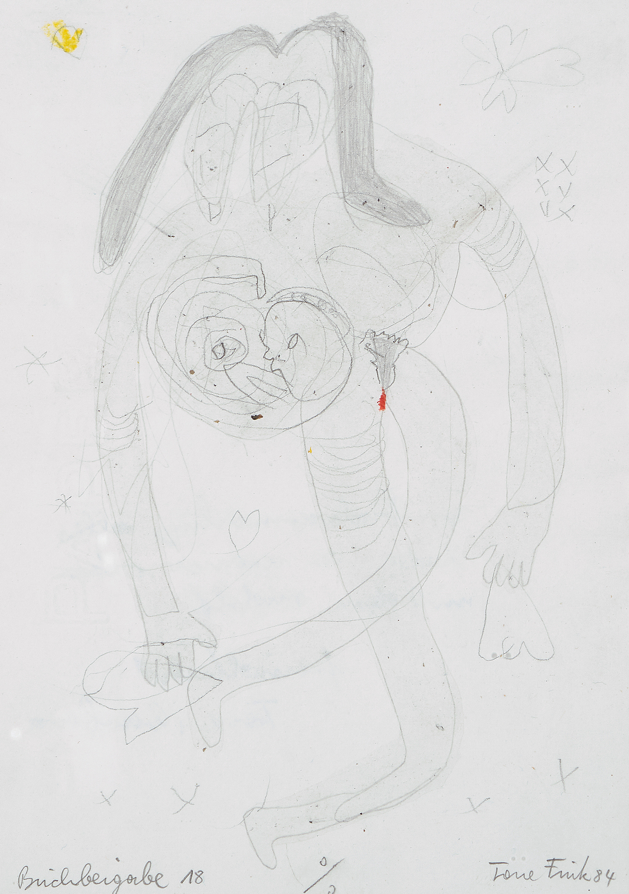 "Buchbeigabe 18". 1984. Bleistift mit wenig Buntstift auf Papier. Unten rechts in Bleistift signiert und datiert. Unten links betitelt. Verso mit Widmung. Blattgrösse 20,9x14,6 cm. Gerahmt. -Blatt leicht gewellt. Ränder und Ecken minimst bestossen. Verso am oberen Rand an Rückkarton montiert.