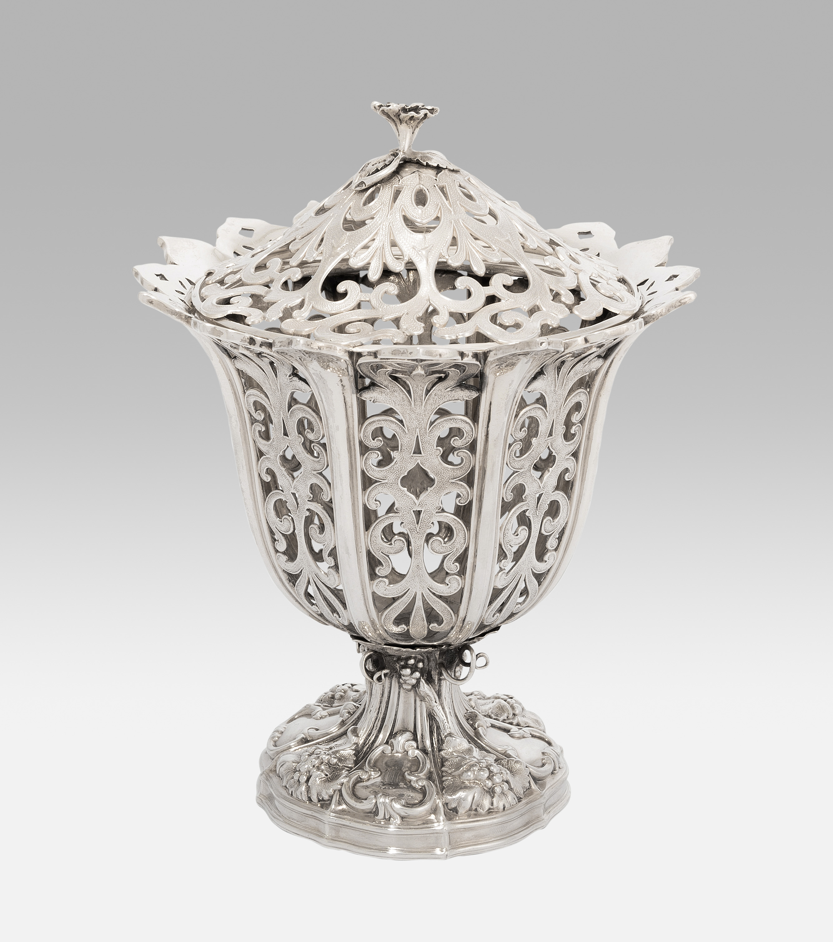 Birmingham, 1844. Silber. Herstellermarke John Robinson, Samuel S. Edkins & Thomas Aston. Fassonierter Rundfuss, darüber zylindrische Schale mit gwölbtem Deckel. Wandung ornamental durchbrochen. Fuss reliefiert mit alternierendem Weinlaub- und Kartuschendekor. Gemarkt. H 21 cm.