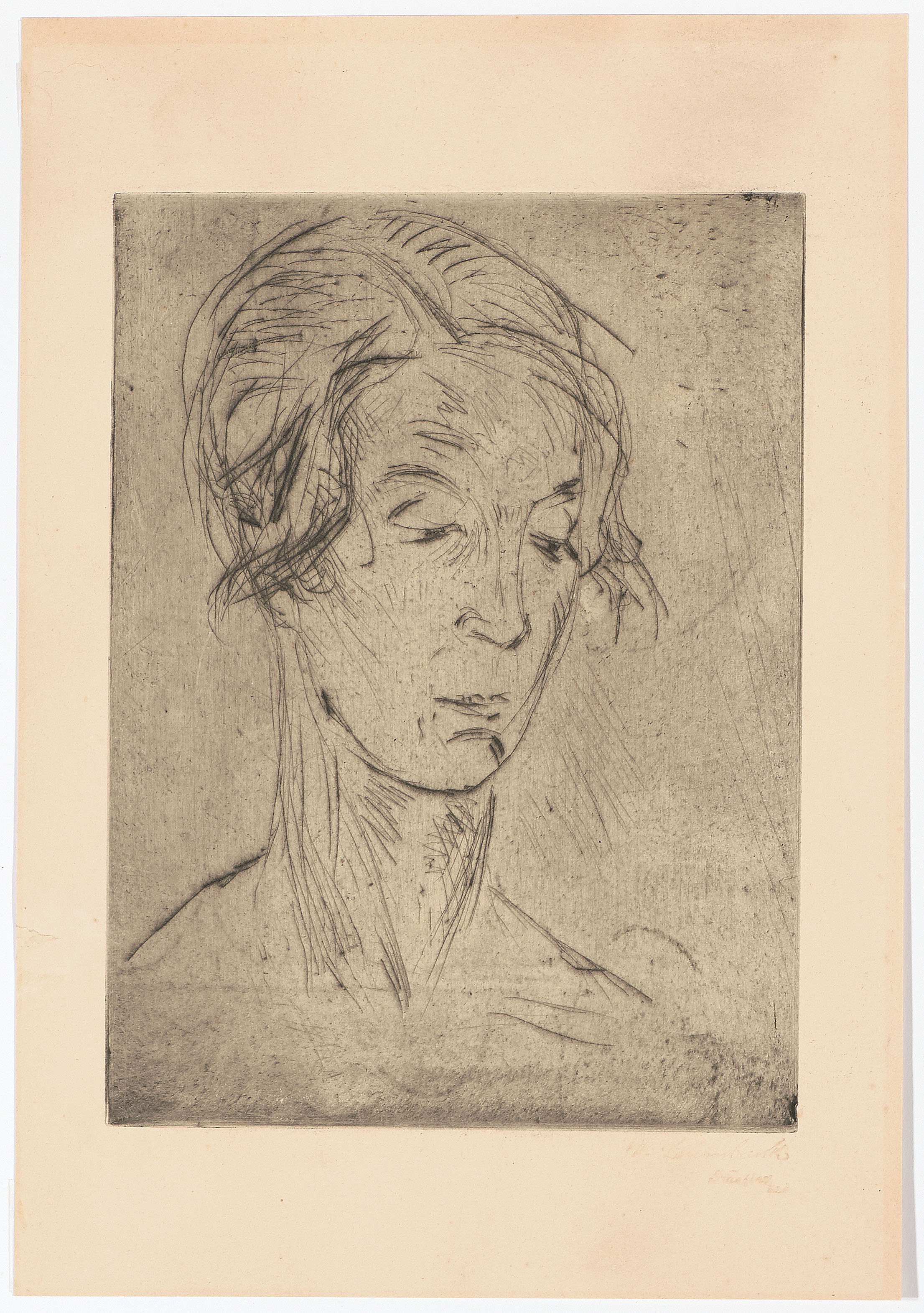 "Frauenkopf V (Frau Ö)". 1915. Radierung. Unten rechts mit kaum sichtbaren Nachlassstempel. Plattengrösse 23,8x17,7 cm. Blattgrösse 32,7x22,6 cm. -Blatt leicht gebräunt. Linker Rand mit Restaurierung (Darstellung nicht betroffen). Verso am linken Rand an Rückkarton montiert.