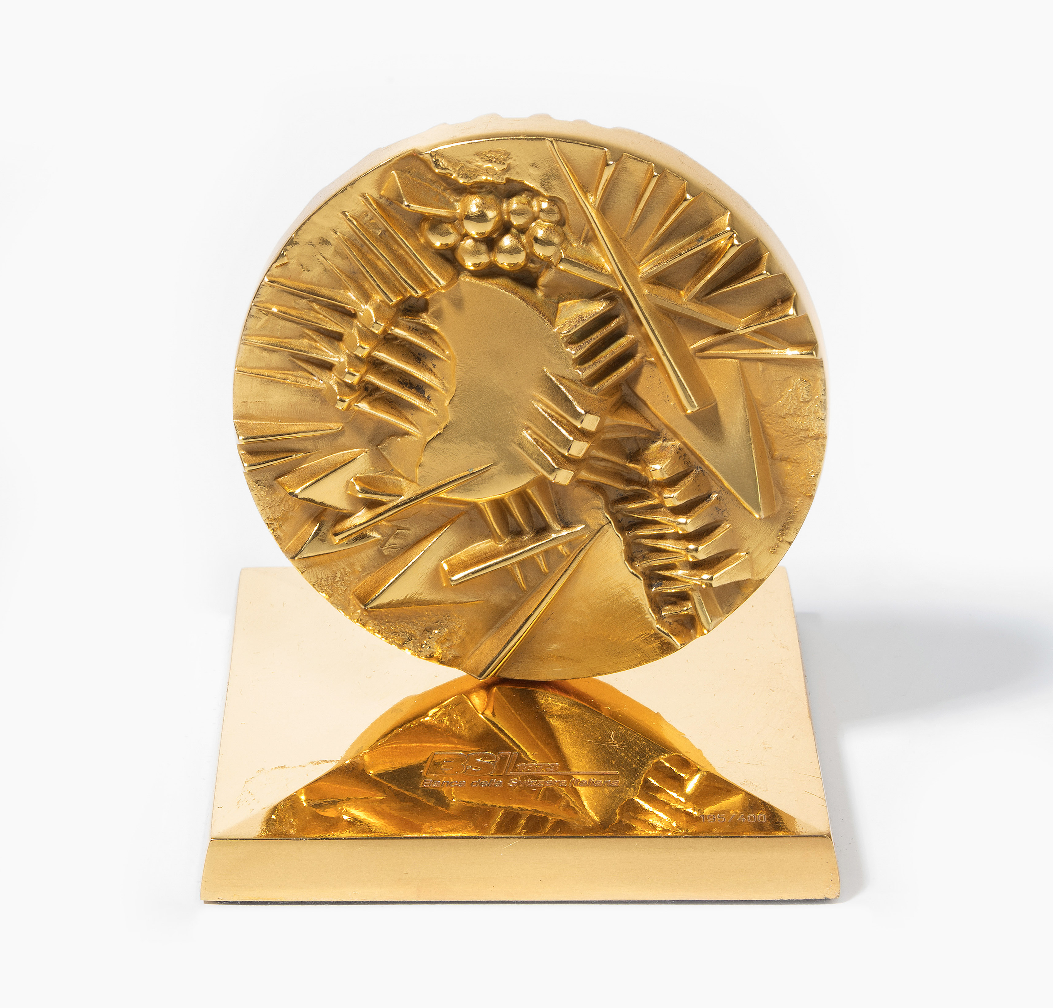 "Disco per BSI". Bronze, gold patiniert. 195/400. Auf der Bronze signiert und bezeichnet: "S. Johnson". Auf dem Sockel nummeriert und bezeichnet: "BSI 1873 Banca della Svizzera Italiana". H 8 auf Sockel 9 cm. -Patina.