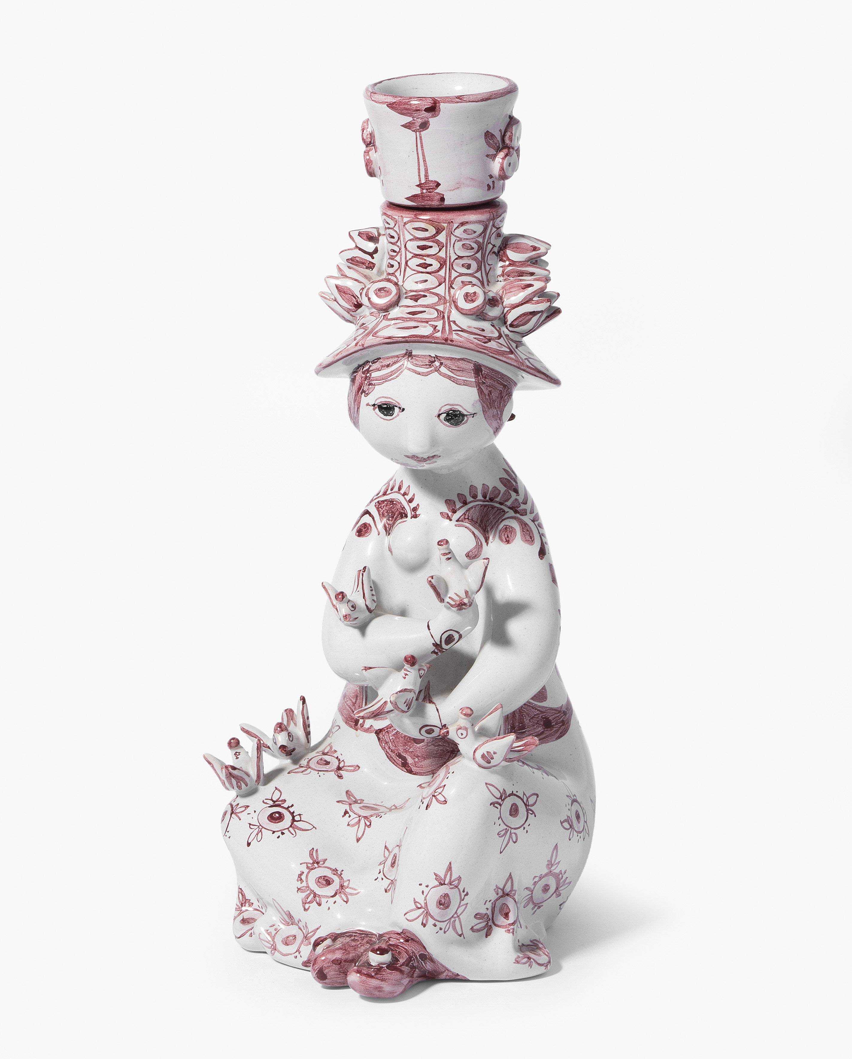 Kerzenstock. Dänemark, datiert 1982. Keramik, purpurfarbene Bemalung auf weissem Grund. Sitzende Frauenfigur. Mit Künstlersignatur. H 31,5 cm.