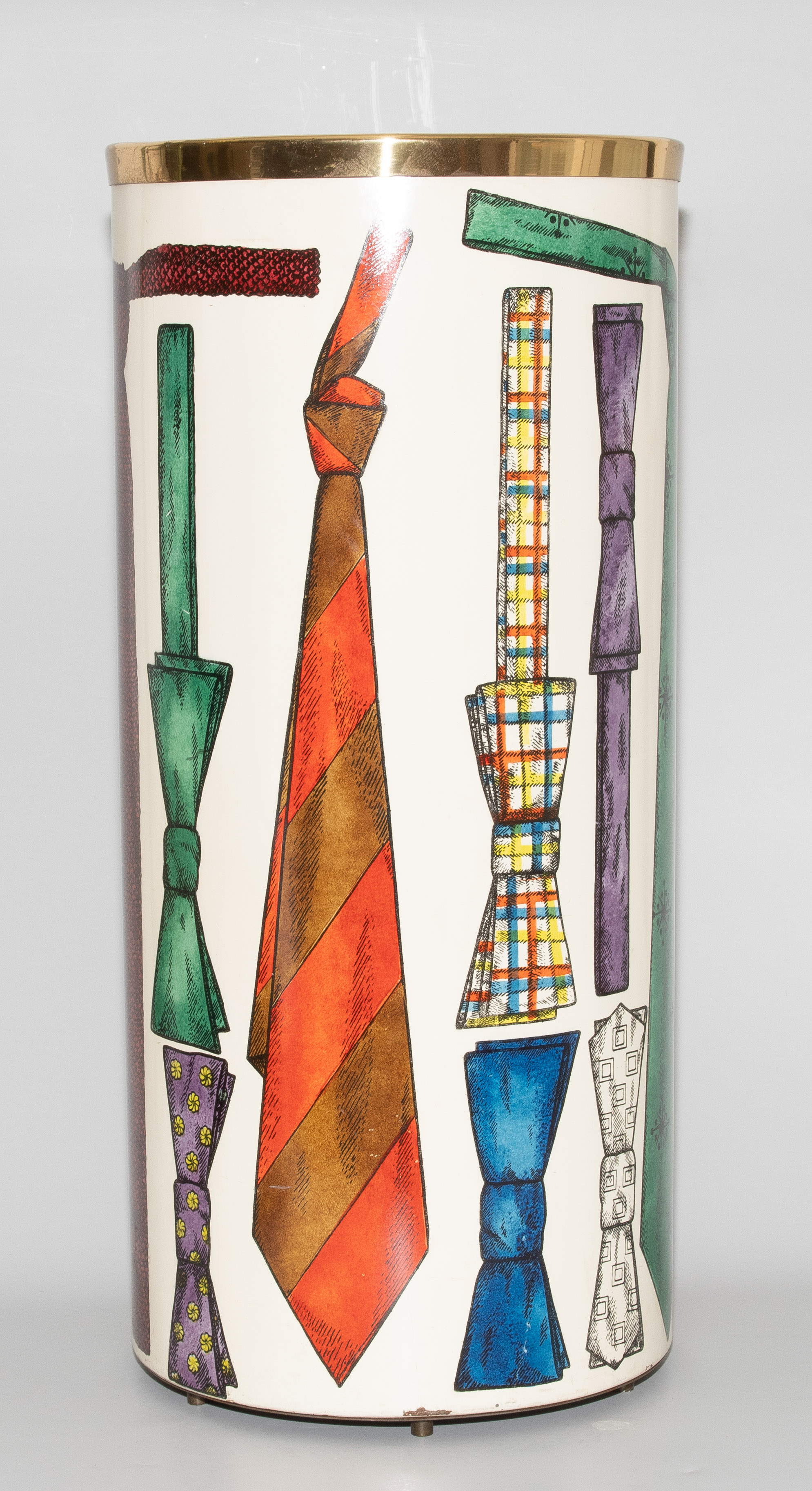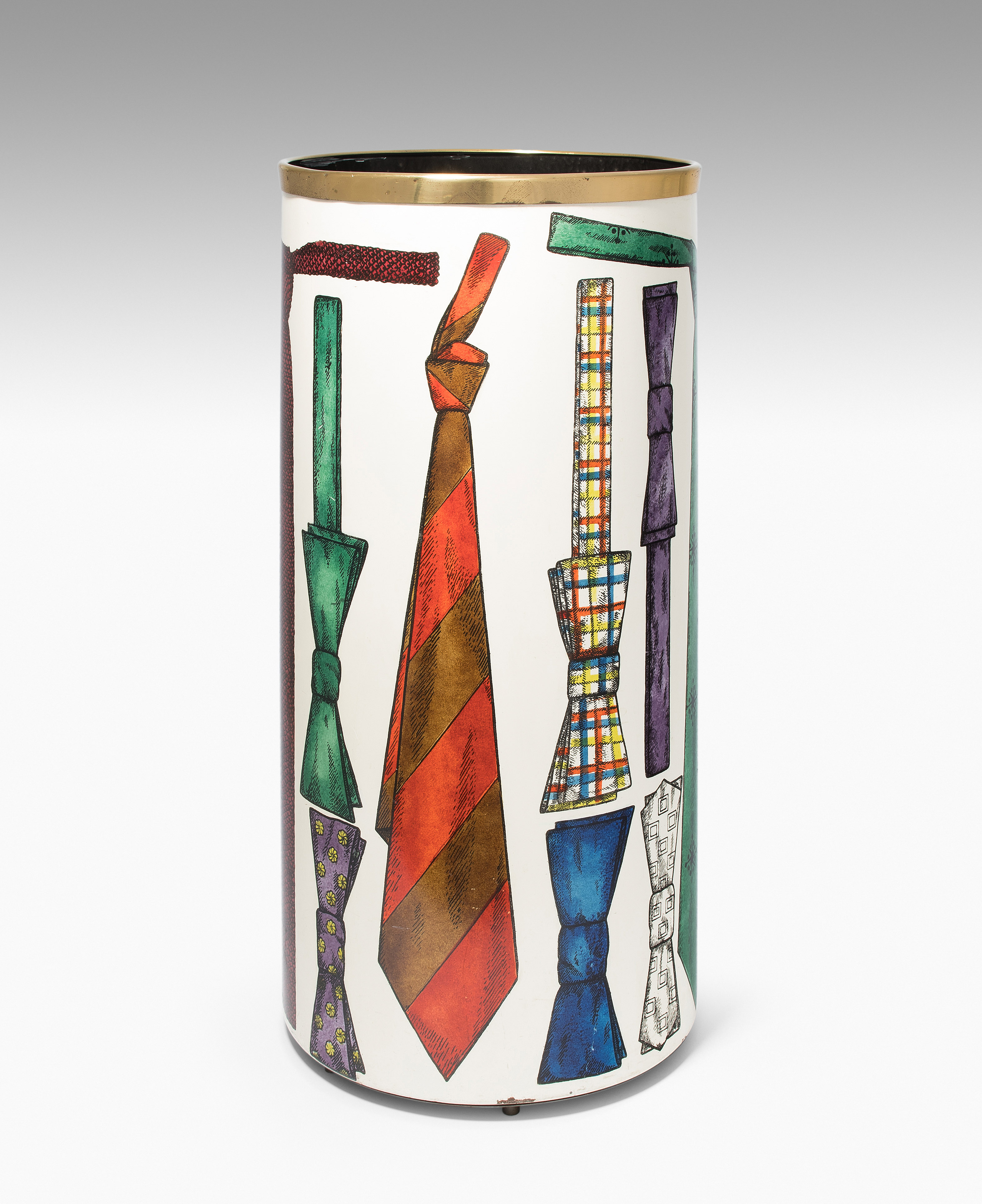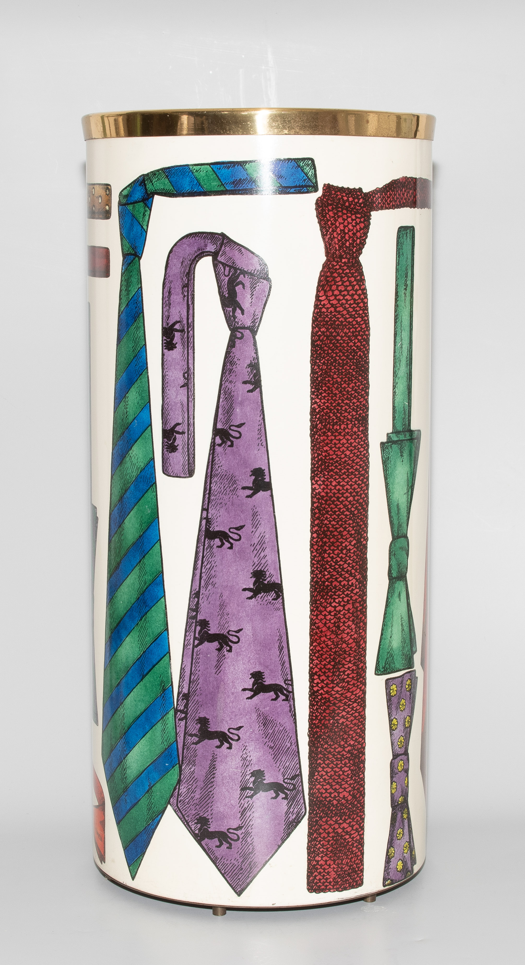 Papierkorb. Mailand, um 1960. Metallblech, polychrom lackiert mit Krawattendekor. Bezeichnet: FORNASETTI MILANO, MADE IN ITALY (Herstelleretikett). H 57 cm.