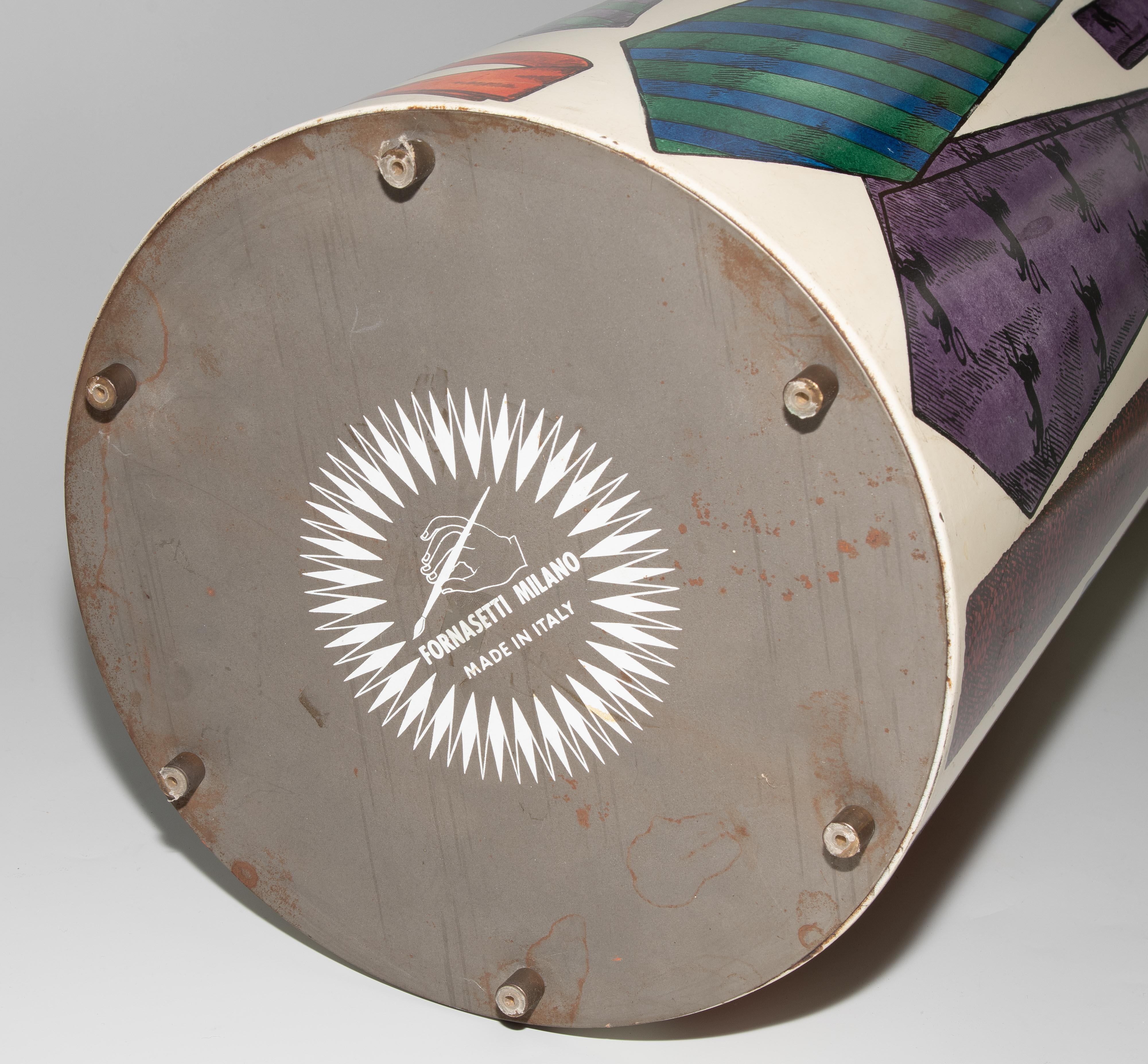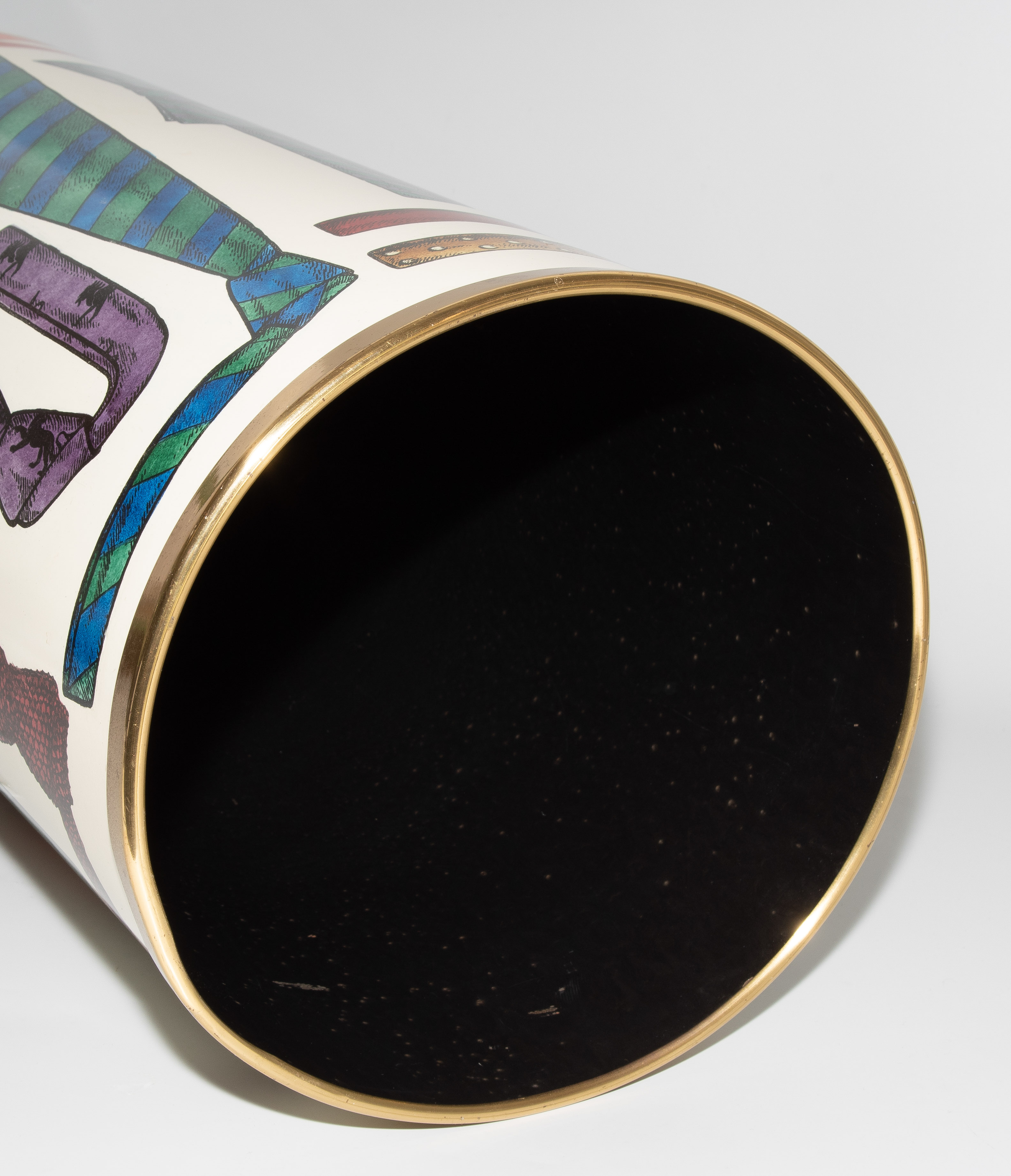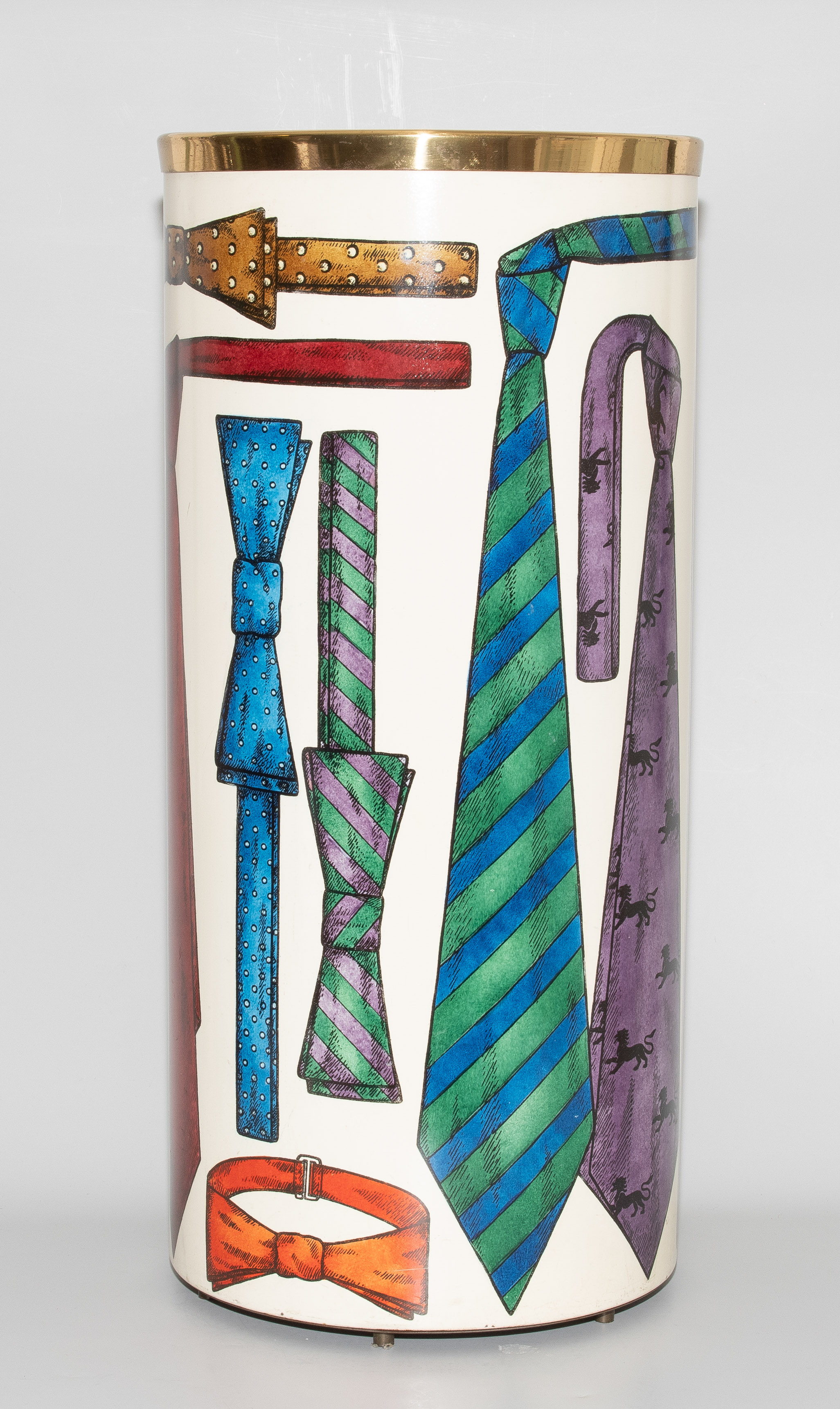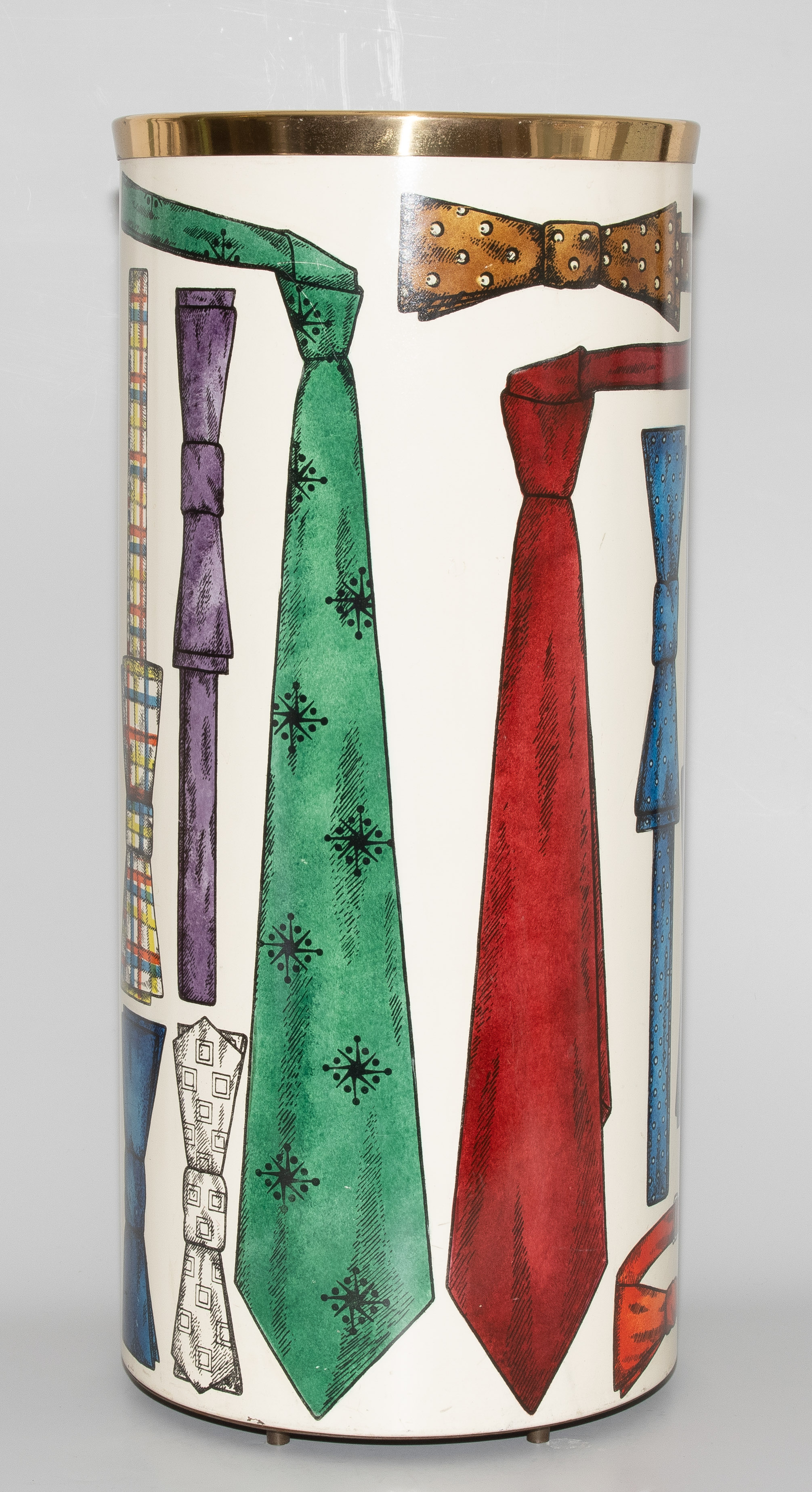 Papierkorb. Mailand, um 1960. Metallblech, polychrom lackiert mit Krawattendekor. Bezeichnet: FORNASETTI MILANO, MADE IN ITALY (Herstelleretikett). H 57 cm.