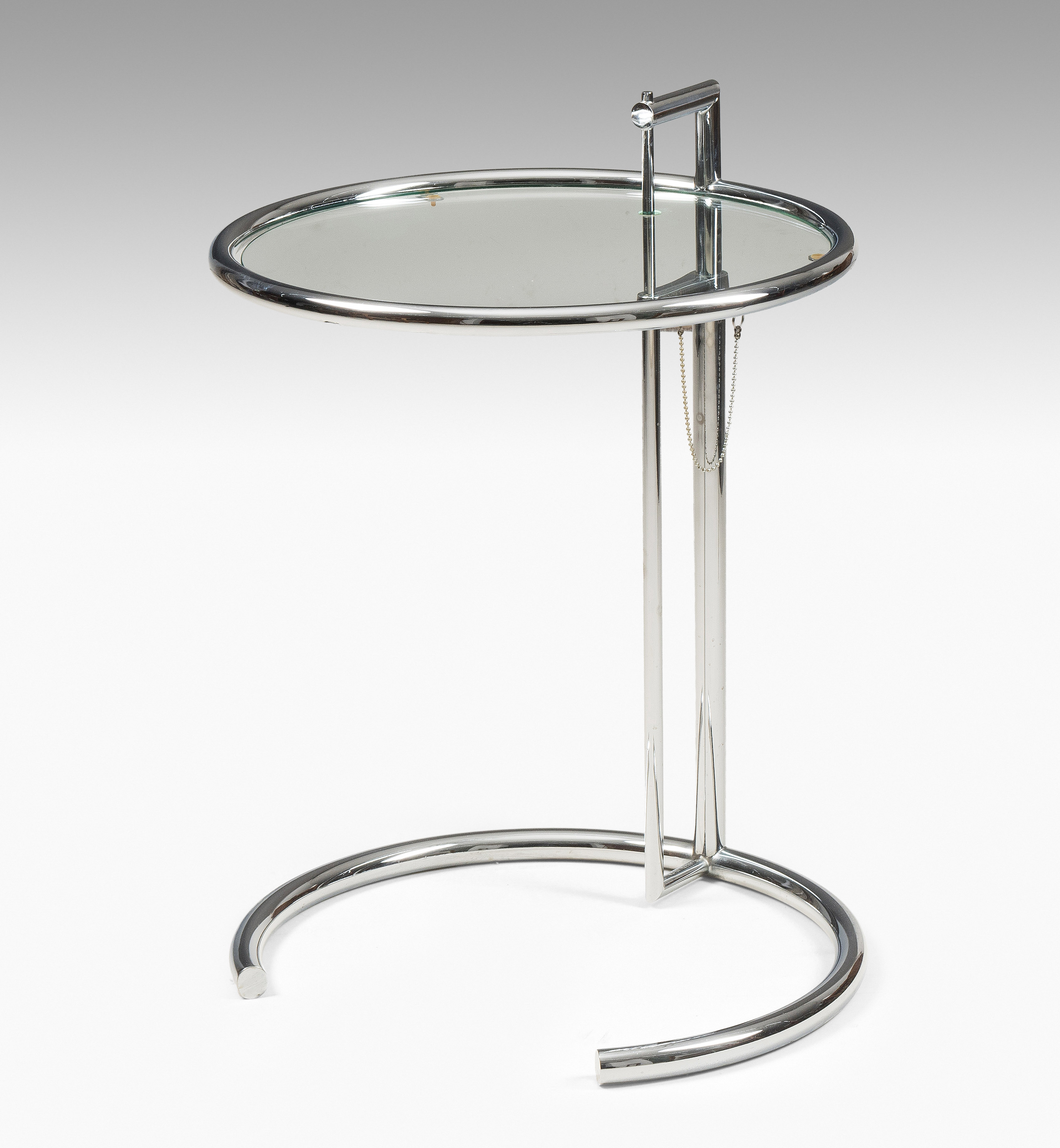 Beistelltisch "E 1027". Entwurf: 1926/27. Ausführung: ClassiCon. Stahlrohr verchromt, Glas. In der Höhe verstellbar. Bezeichnet: "CLASSICON 10.93". H 64–94 cm. D 51 cm.