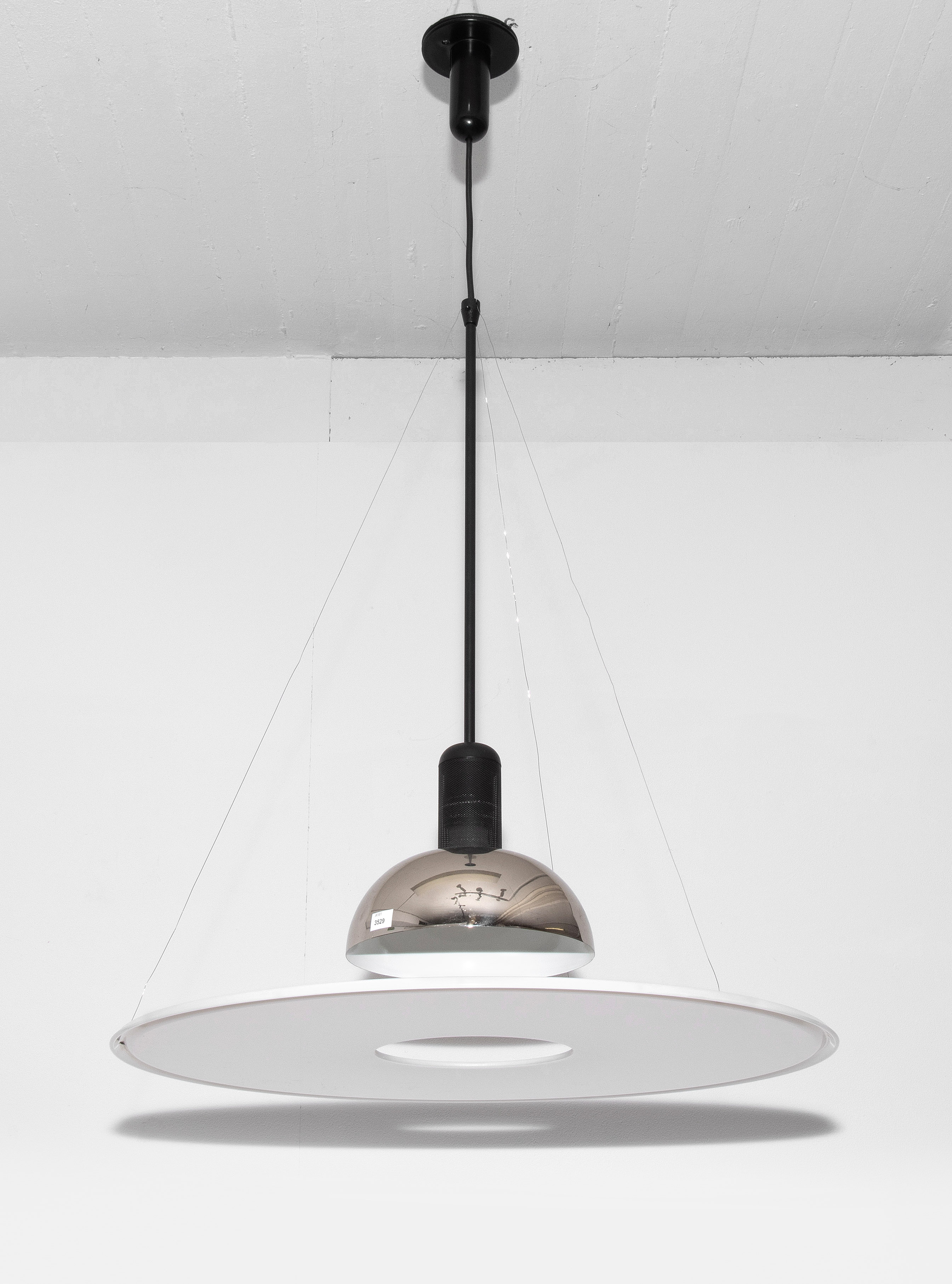 Pendelleuchte "Frisbi". Entwurf: 1978 für Flos, Italien. Metall und Plexiglas. Mit Herstelleretikett. H 100 cm. D 60 cm.