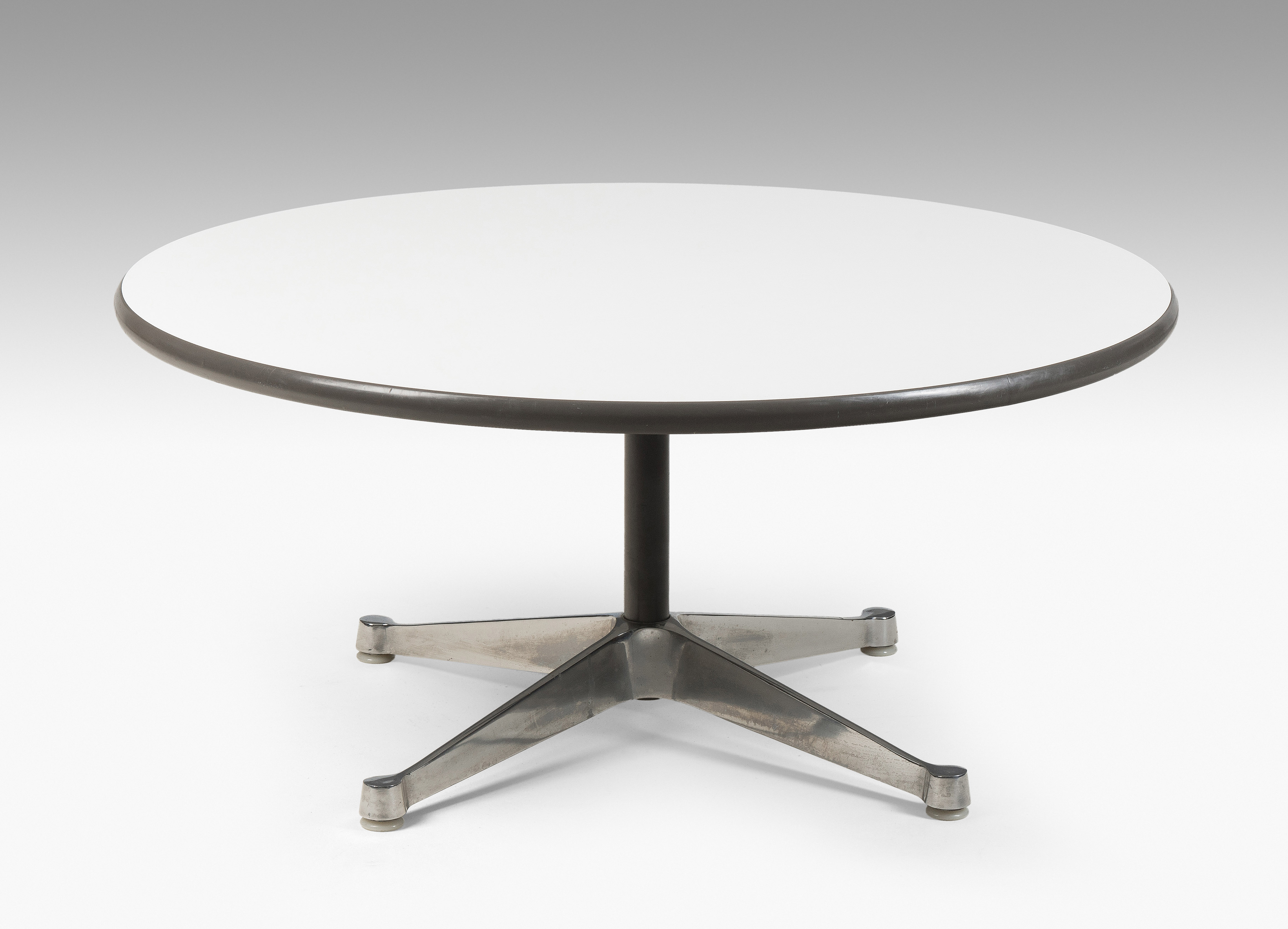 Clubtisch "Segmented Table". Entwurf 1964. Frühe Ausführung von Vitra. Verchromtes Aluminiumgestell mit 4-strahligem Fuss, runde Tischplatte. H 41cm. D 91 cm.