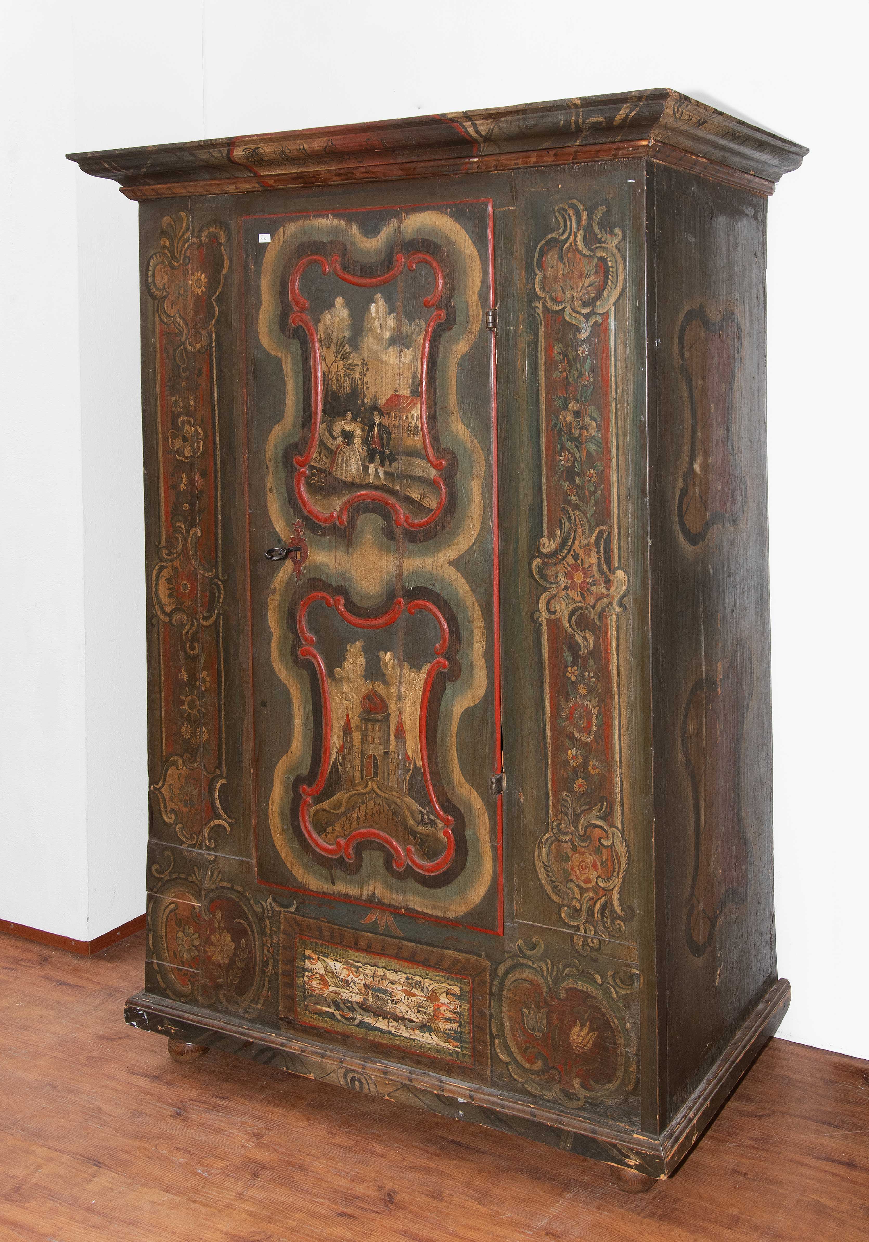 Barock 18. Jh. Nadelholz, polychrome Fassung. Eintüriger Korpus auf Kugelfüssen mit profiliertem Gesims. Grüngrundige Fassung. Front mit Liebespaar und Burg-Motiv bemalt. Gebrauchsspuren. 125x64x189 cm.