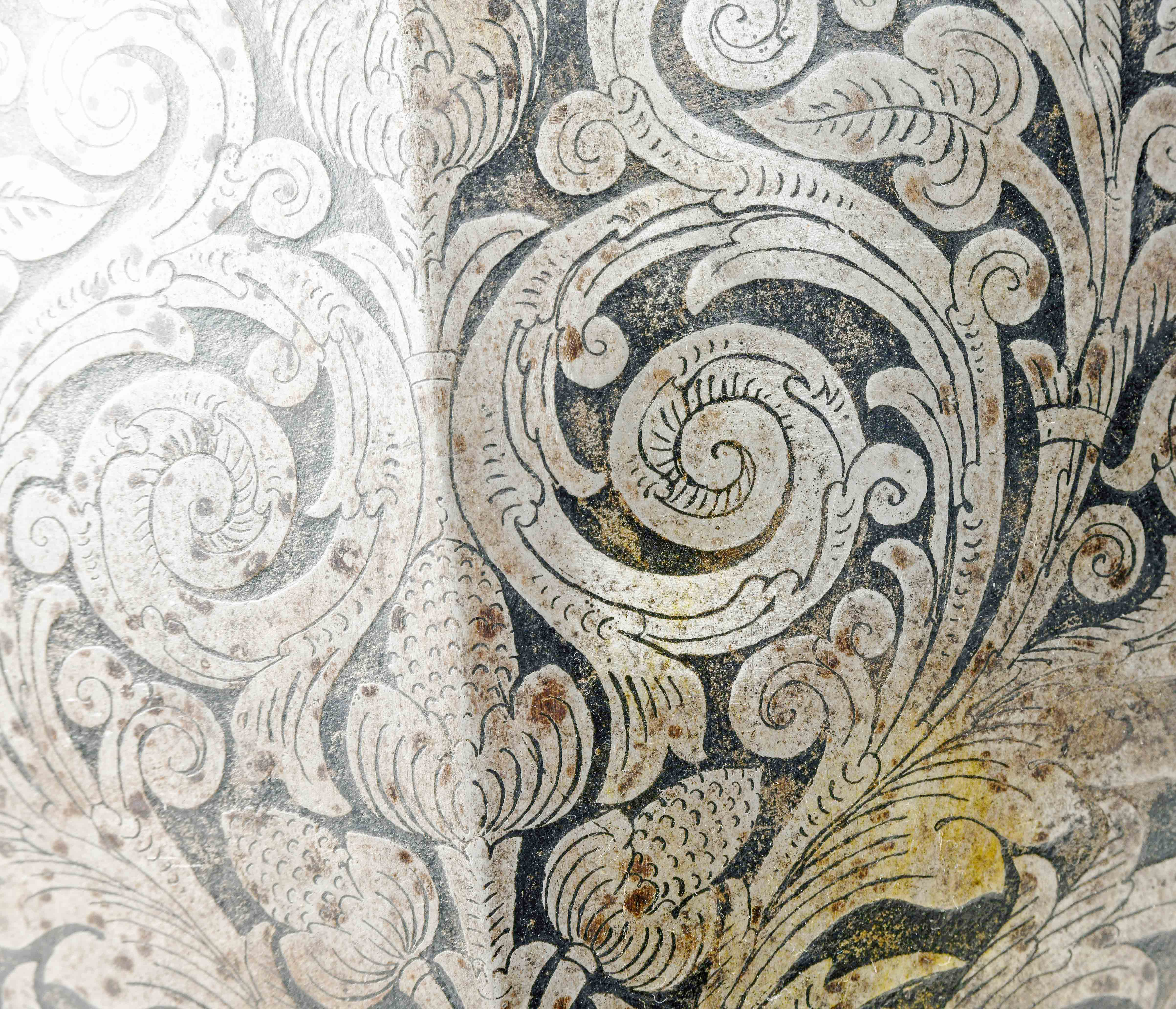Im Italienischen Stil des 16.Jh, französische Arbeit. Eisen, geätzter Dekor. Bombiert, Hals- und Armausschnitte mit wulstigen Borten, Bauchreifen mit Lederriemennieten (Riemen fehlen). Brustfläche mit geätztem Dekor: florale Ranken und Schnörkel. H ca. 45 cm.