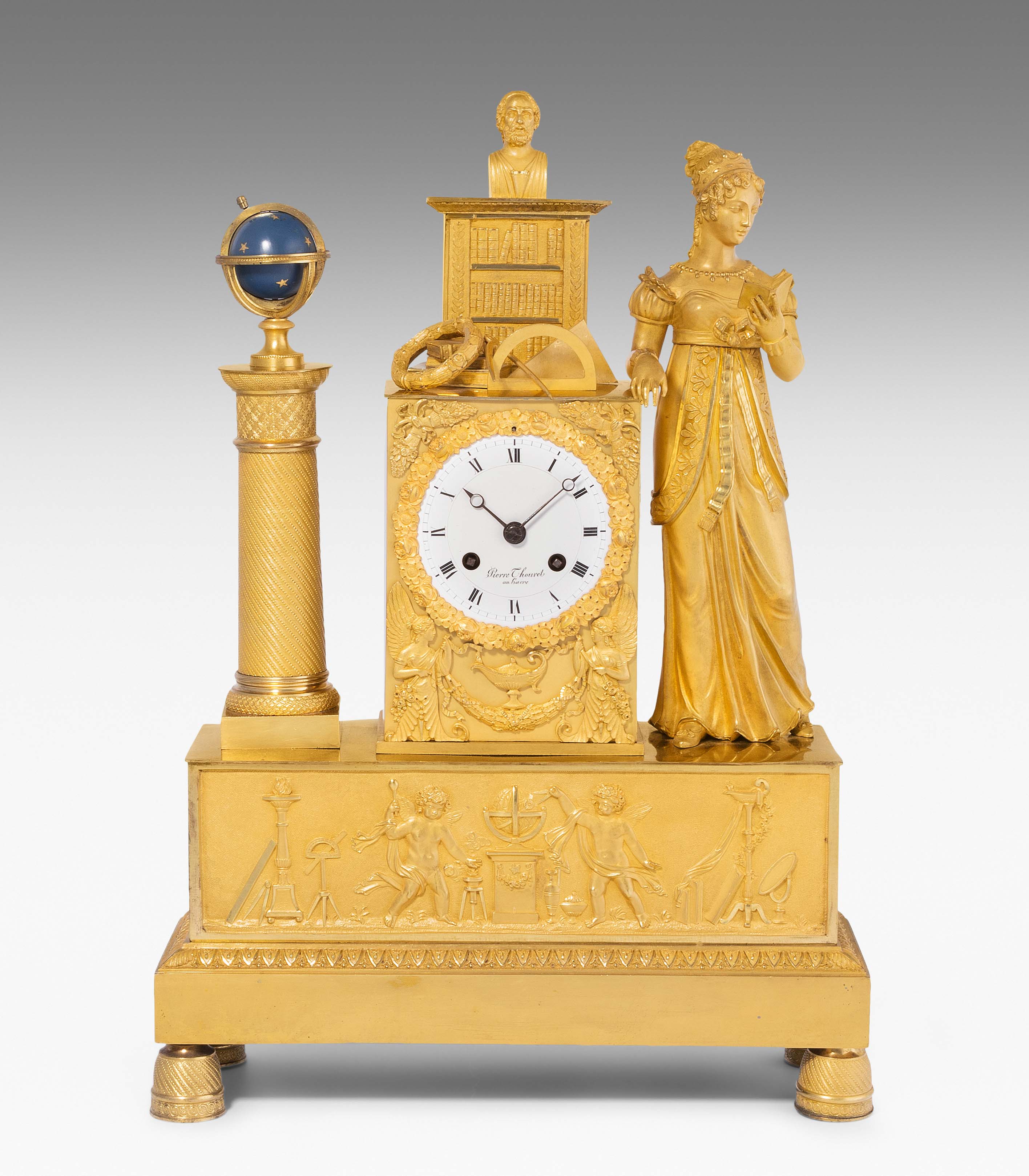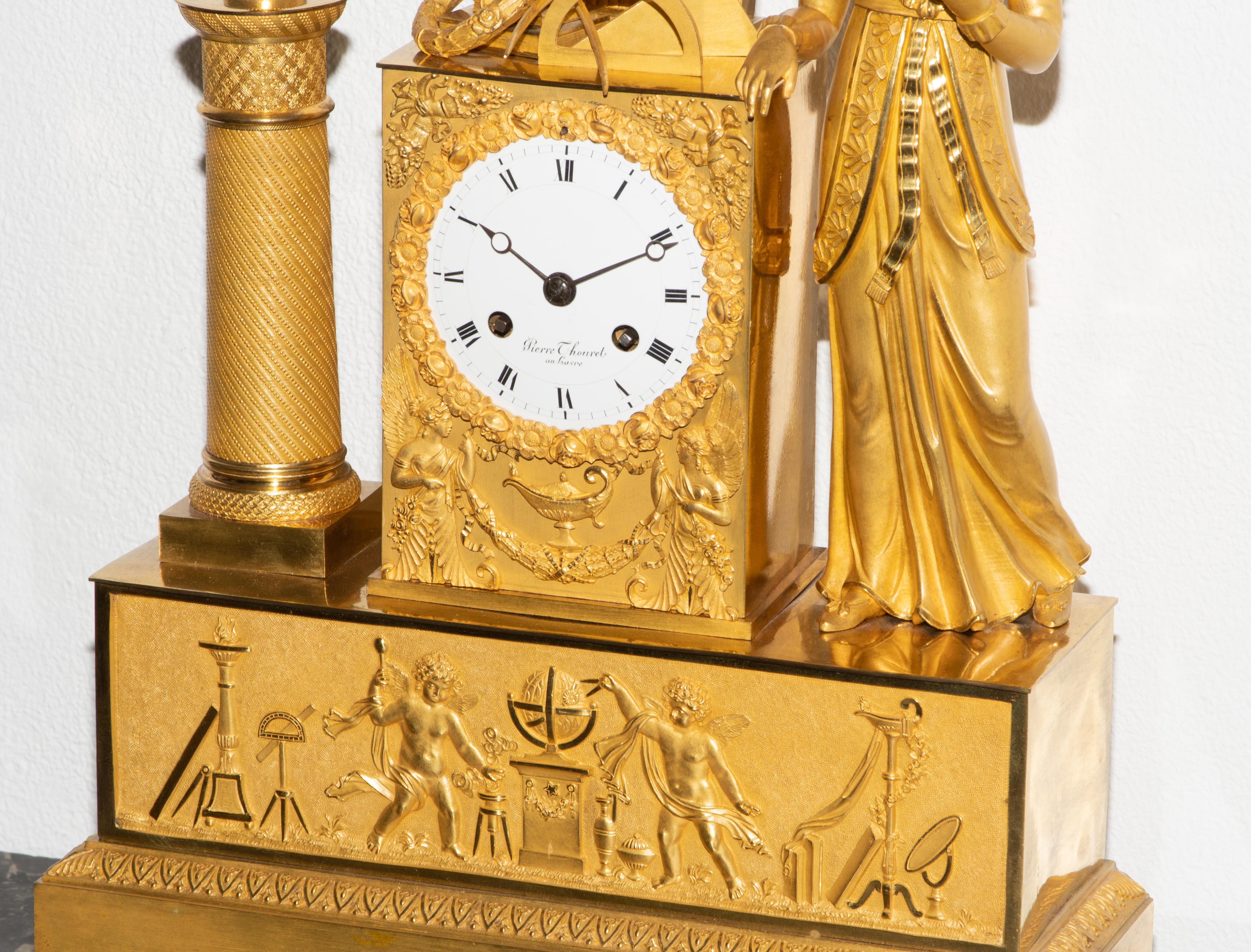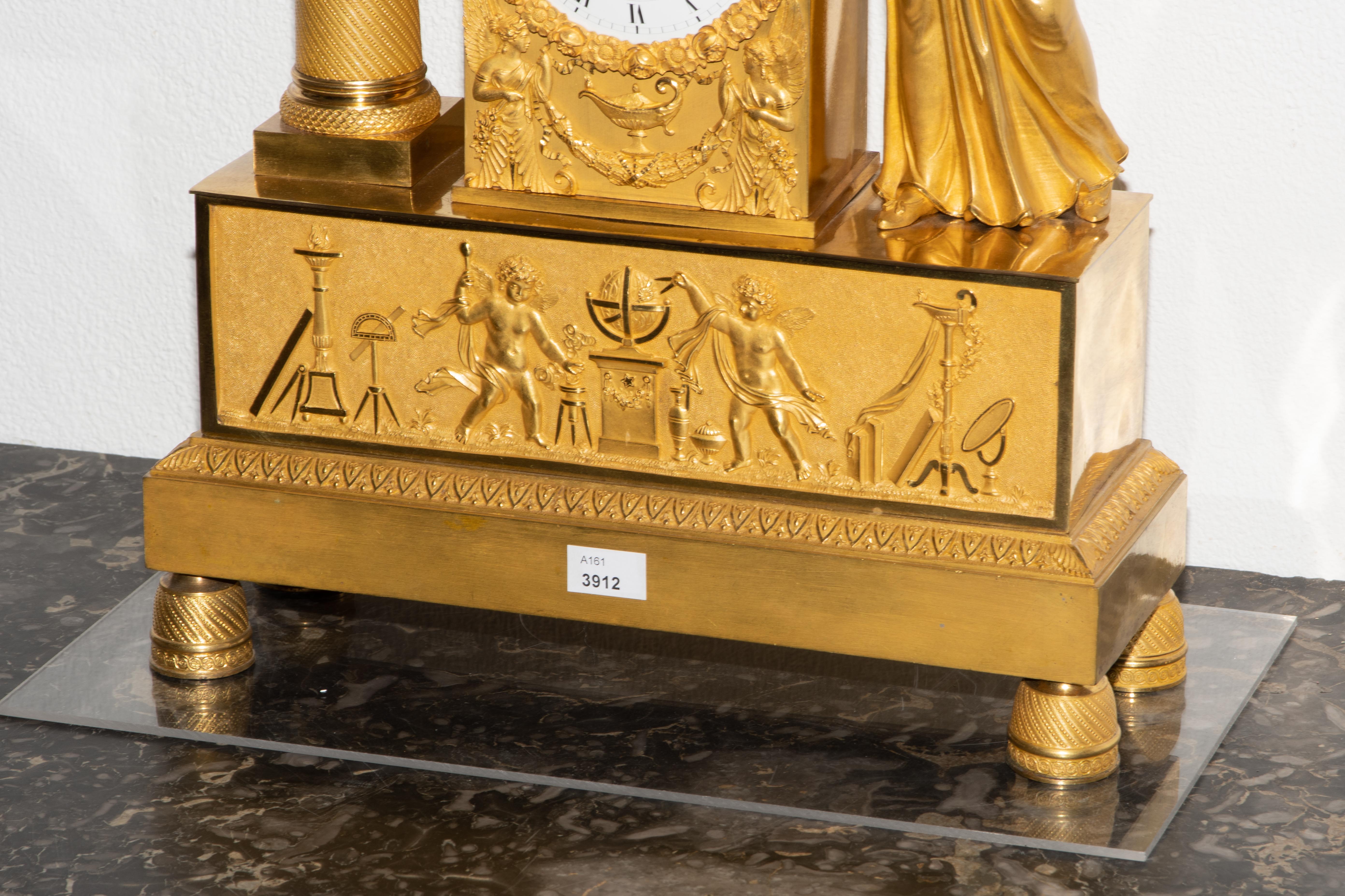 Frankreich, um 1820. Restauration. Verkäufersignatur Pierre Thouret au Havre. Gehäuse aus feuervergoldeter, fein ziselierter Bronze. Am Sockel Relief mit Putten und astronomischen Werkzeugen. Fein gearbeiteter, matt- und glanzvergoldeter Figurenaufsatz mit allegorischer Frauenfigur der Urania und Himmelsglobus. Emailzifferblatt und Stahlzeiger. Pendulenwerk mit Halbstundenschlag auf Glocke. Pendel mit Fadenaufhängung. Gangfähig. Schlüssel vorhanden. H 44 cm.