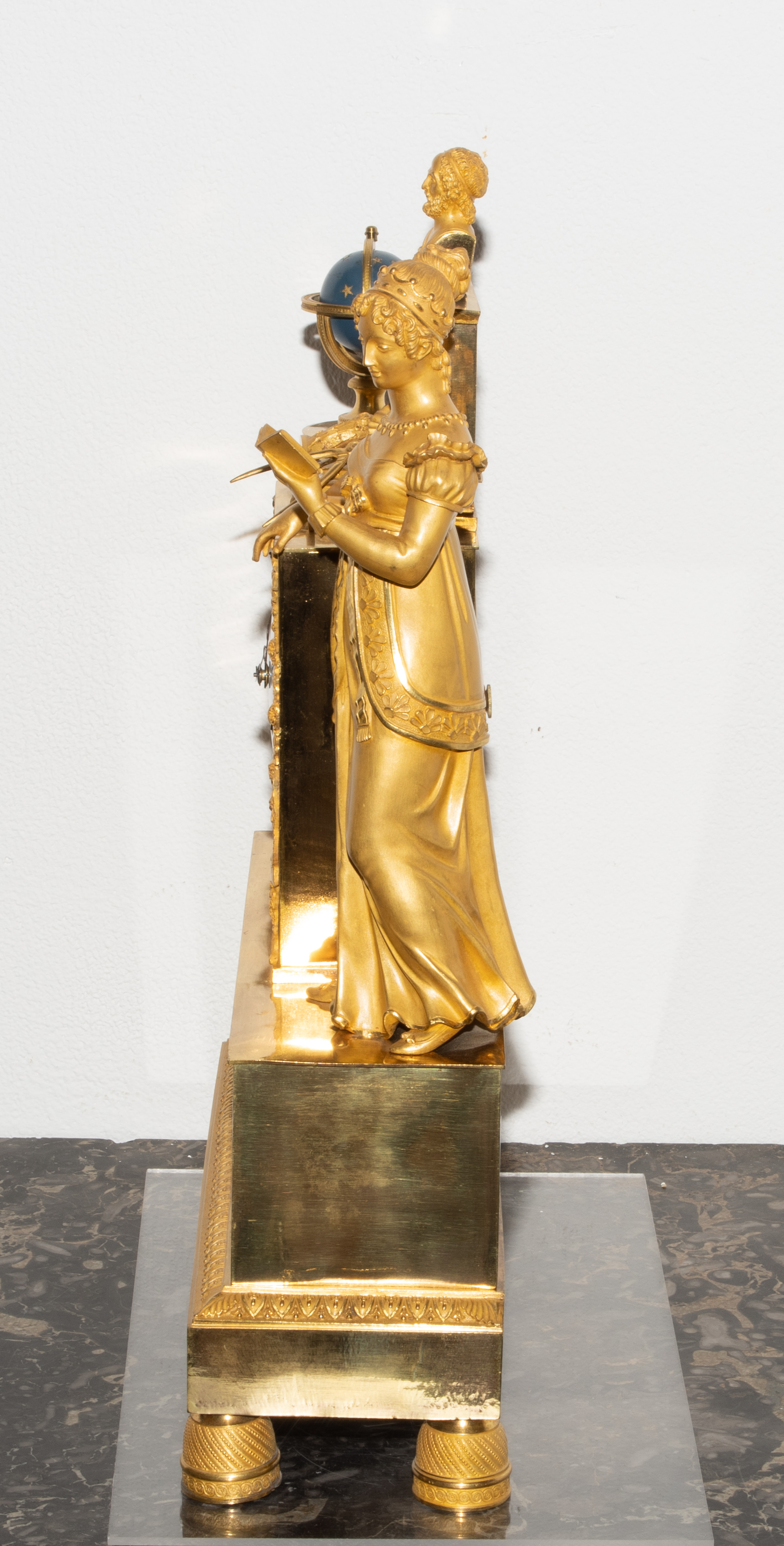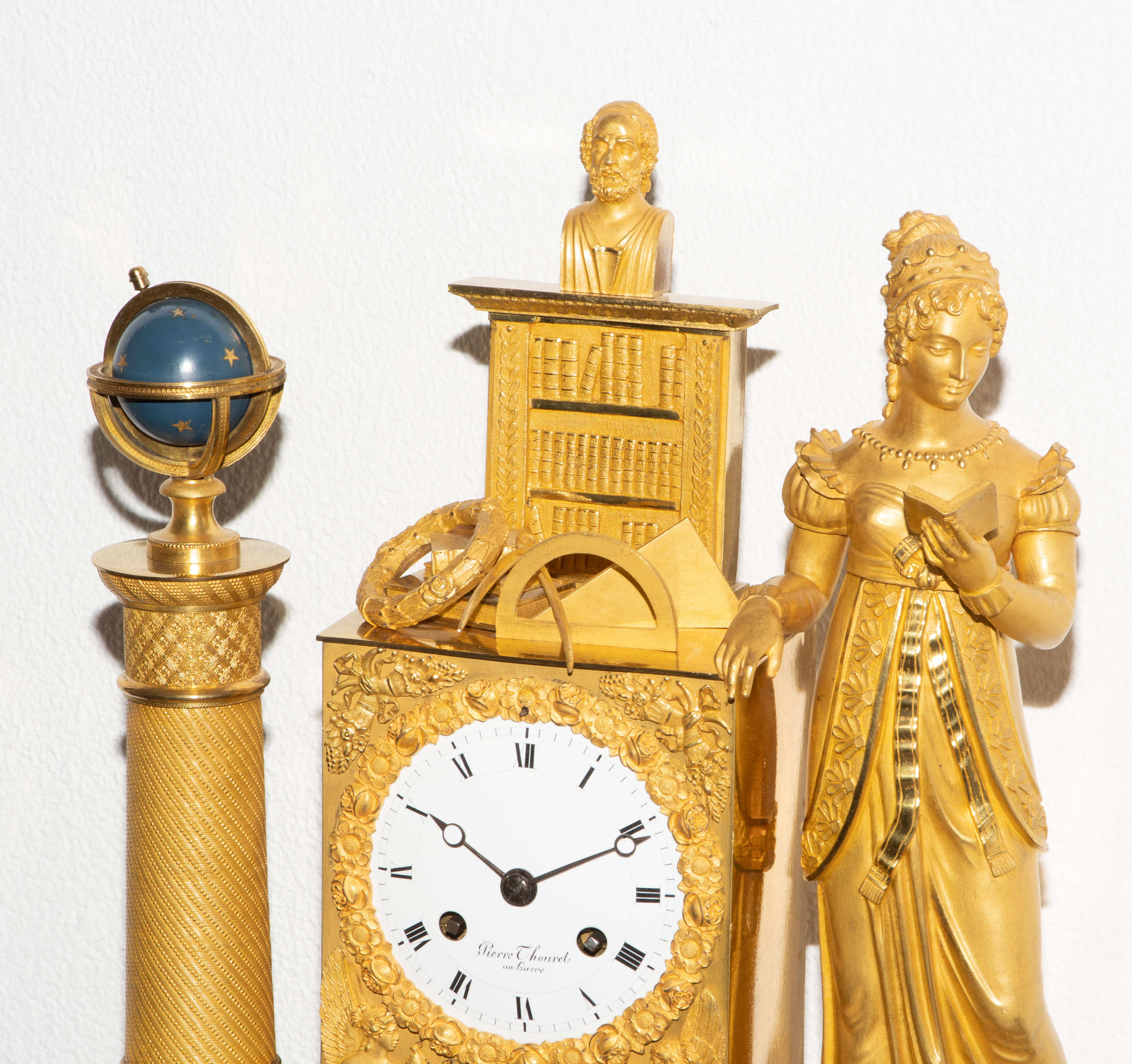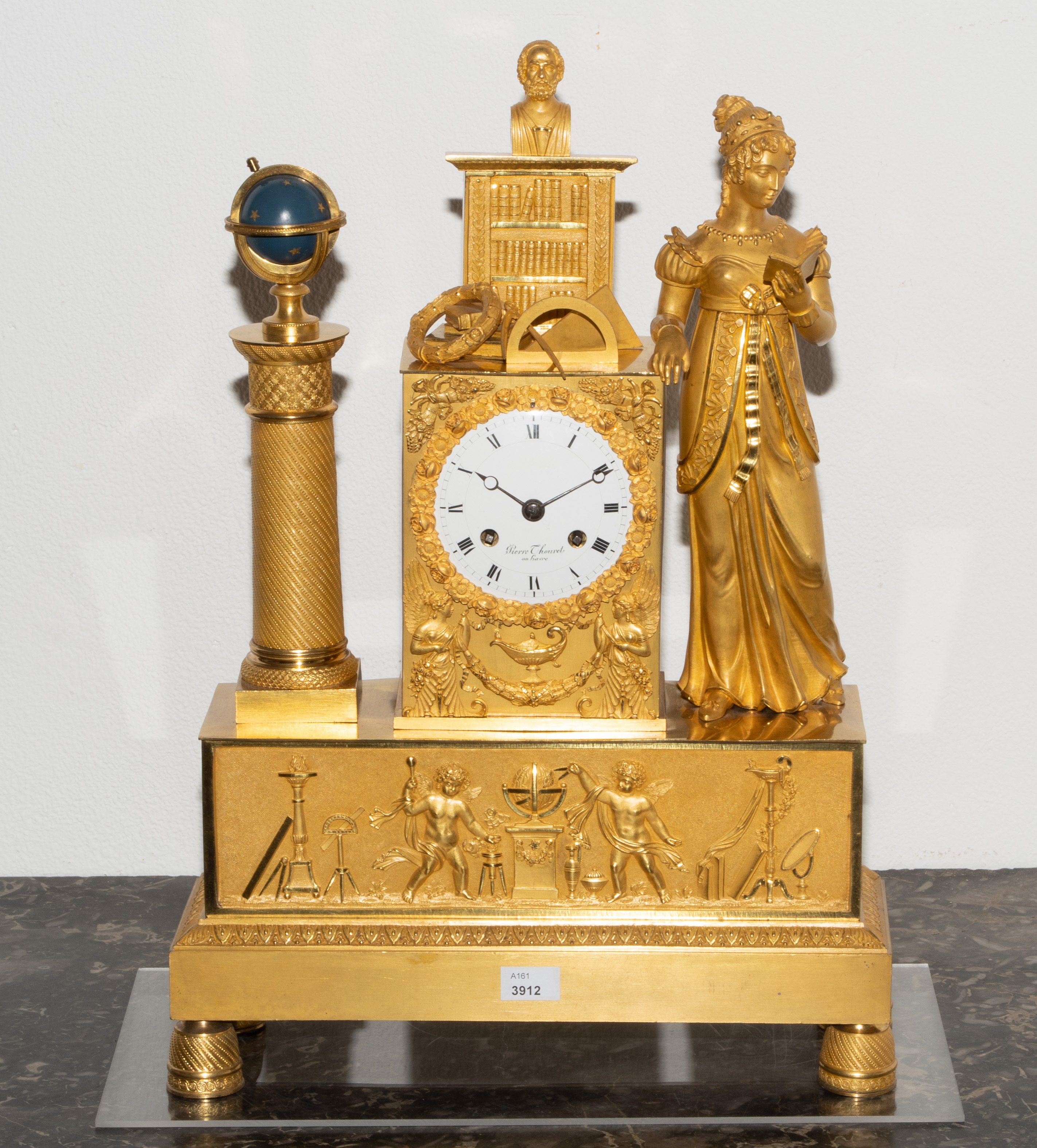 Frankreich, um 1820. Restauration. Verkäufersignatur Pierre Thouret au Havre. Gehäuse aus feuervergoldeter, fein ziselierter Bronze. Am Sockel Relief mit Putten und astronomischen Werkzeugen. Fein gearbeiteter, matt- und glanzvergoldeter Figurenaufsatz mit allegorischer Frauenfigur der Urania und Himmelsglobus. Emailzifferblatt und Stahlzeiger. Pendulenwerk mit Halbstundenschlag auf Glocke. Pendel mit Fadenaufhängung. Gangfähig. Schlüssel vorhanden. H 44 cm.