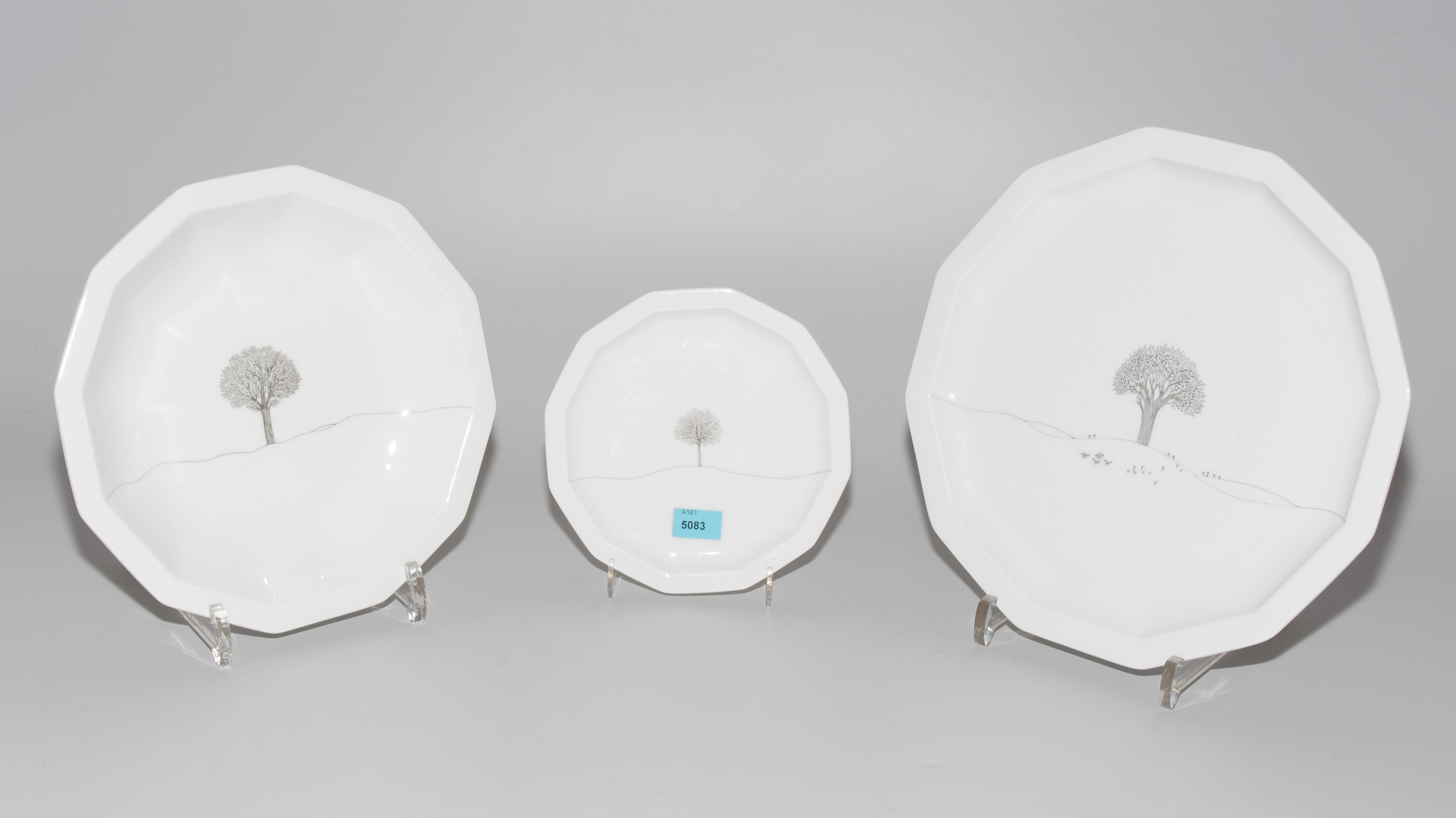 Porzellan. Modell "Winterreise", Form "Polygon", 1973. Bestand: 4 kleine Teller (D 15,5 cm), 2 Suppenteller (D 22,5 cm), 8 Fleischteller (D 26 cm).