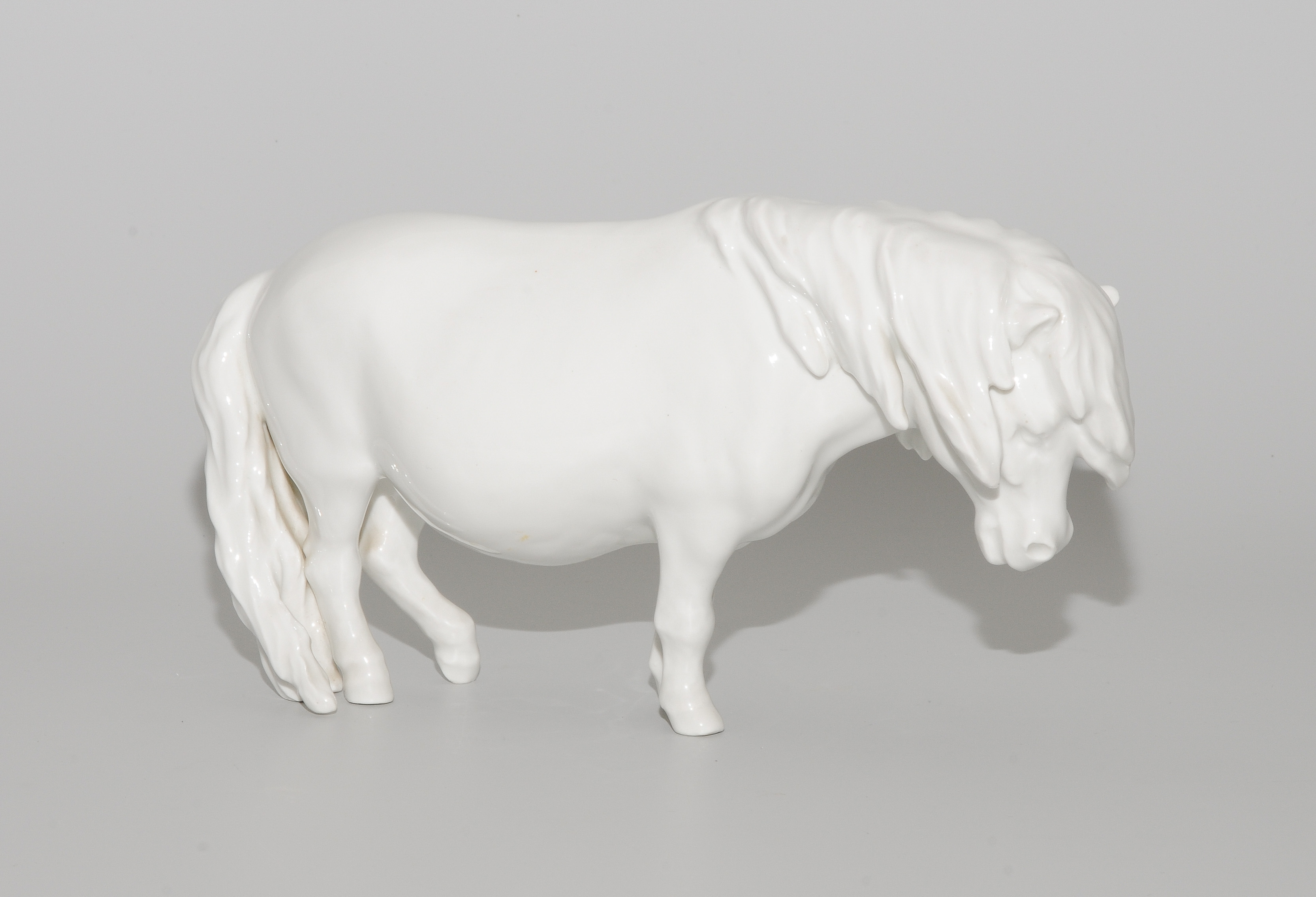Tierfigur: "Shetlandpony". Modell: Heinrich Drake; Modelljahr: 1957. Porzellan, weiss. Bezeichnet: Schwertermarke (1. Wahl), Modellnummer "T 251". H 12 cm.