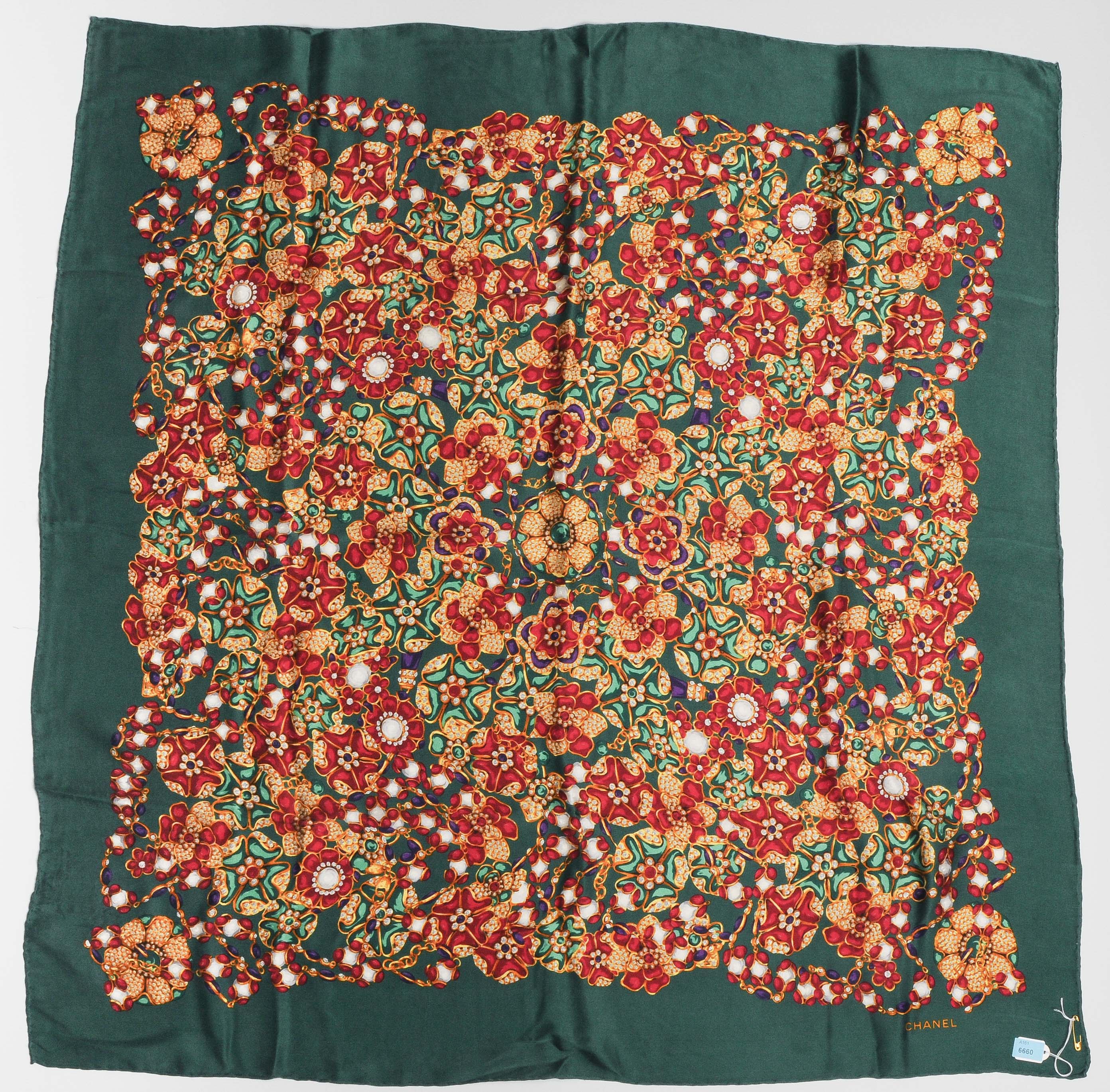 Seide in Rot, Gelb und Violett. Umrandung in Smaragdgrün. 88x88 cm.