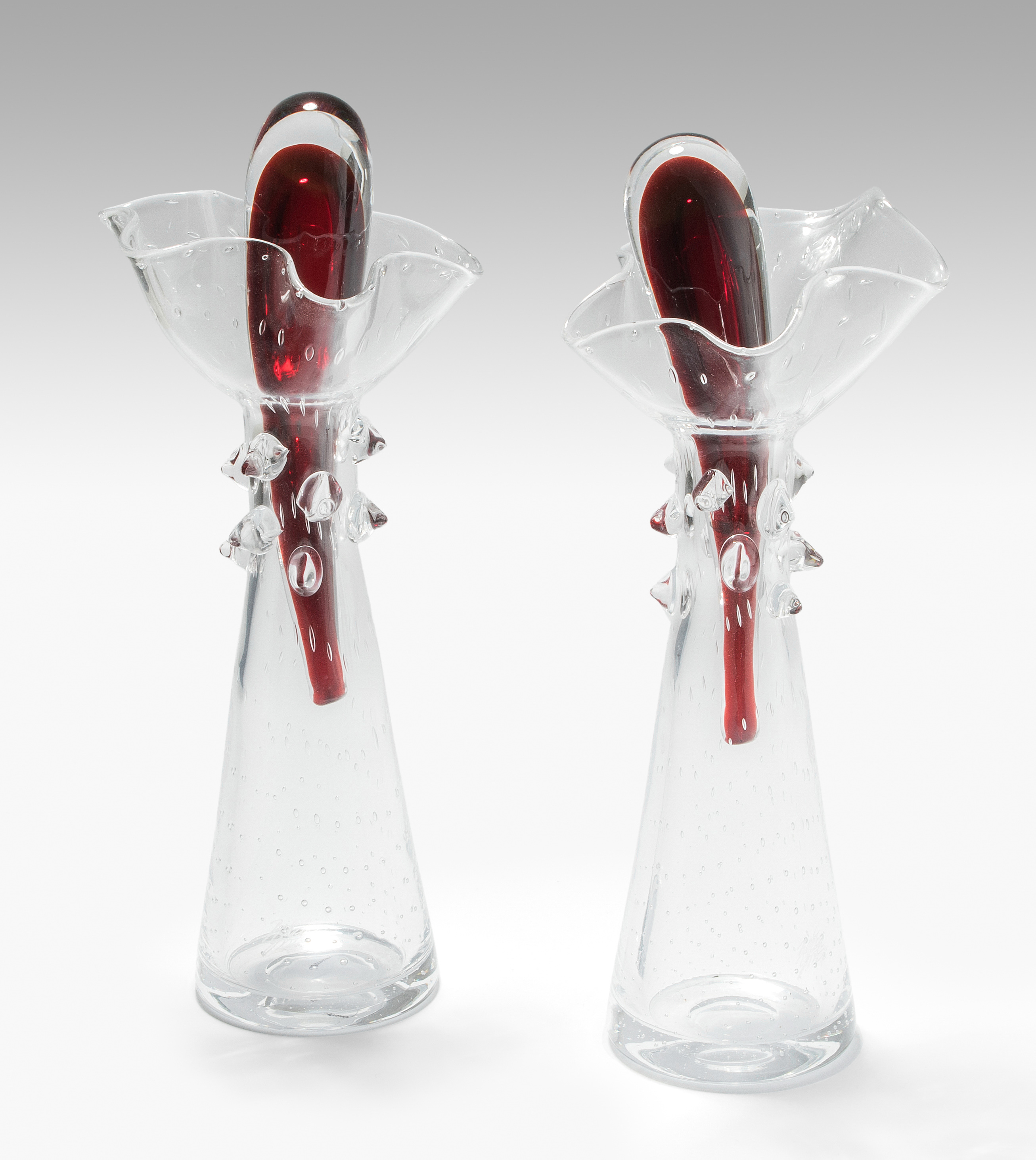 1 Paar Karaffen "Paolo", 1990er Jahre. Farbloses Glas mit aufgeschmolzenen Nuppen und eingestochenen Luftblasen. Stöpsel mit roten Einschmelzungen. Mit Etikett "driade". H 26,5 cm.