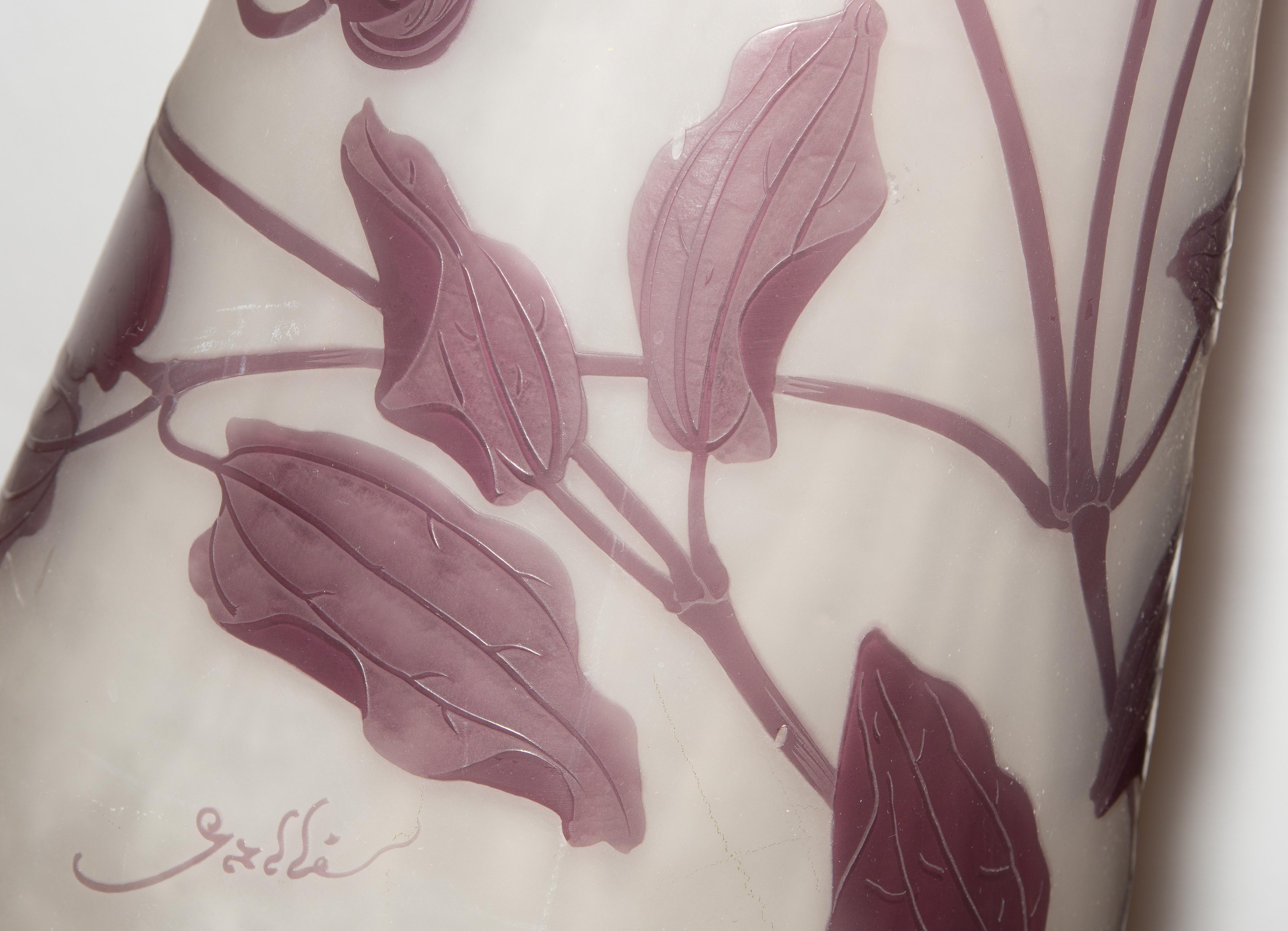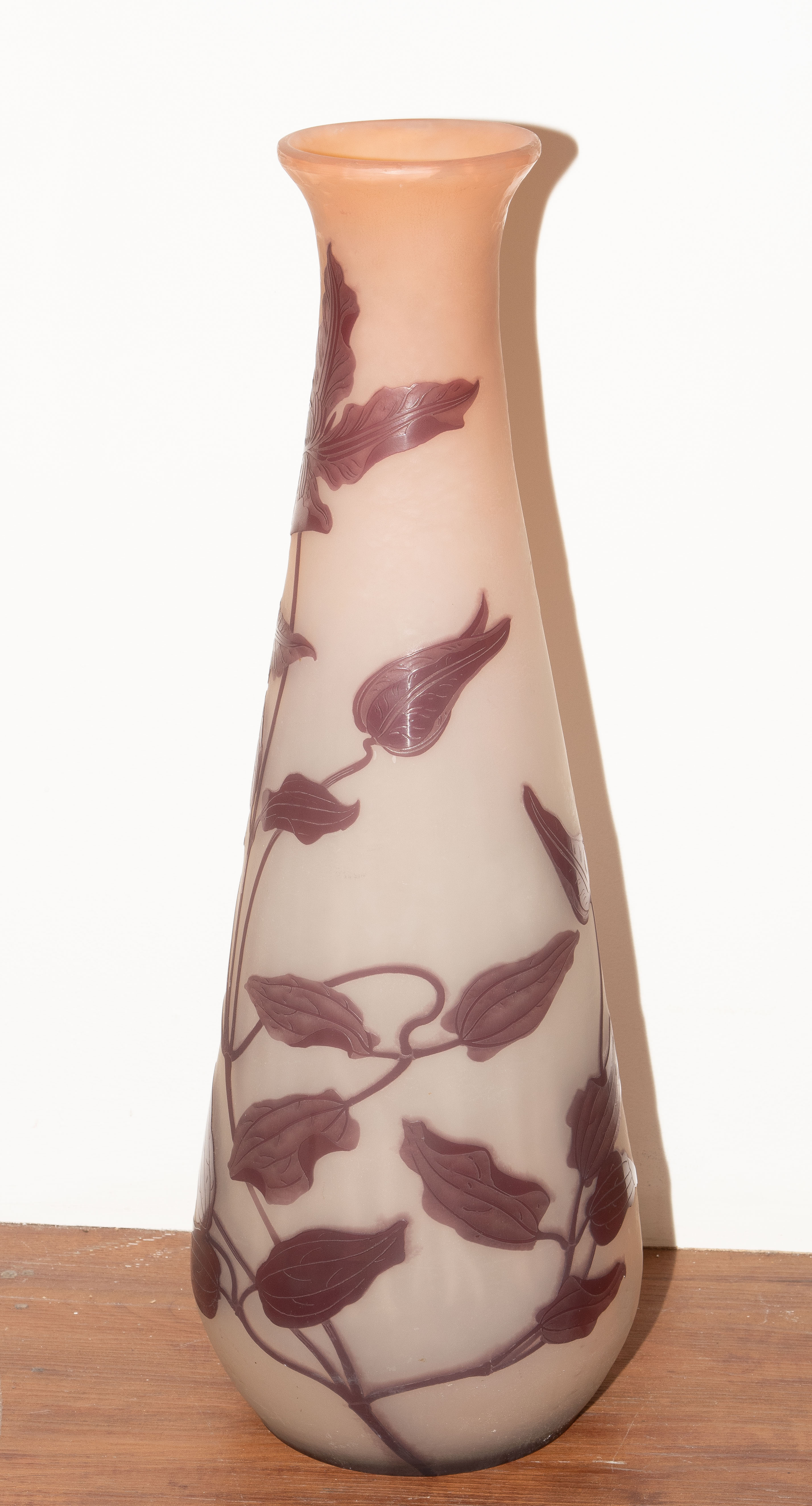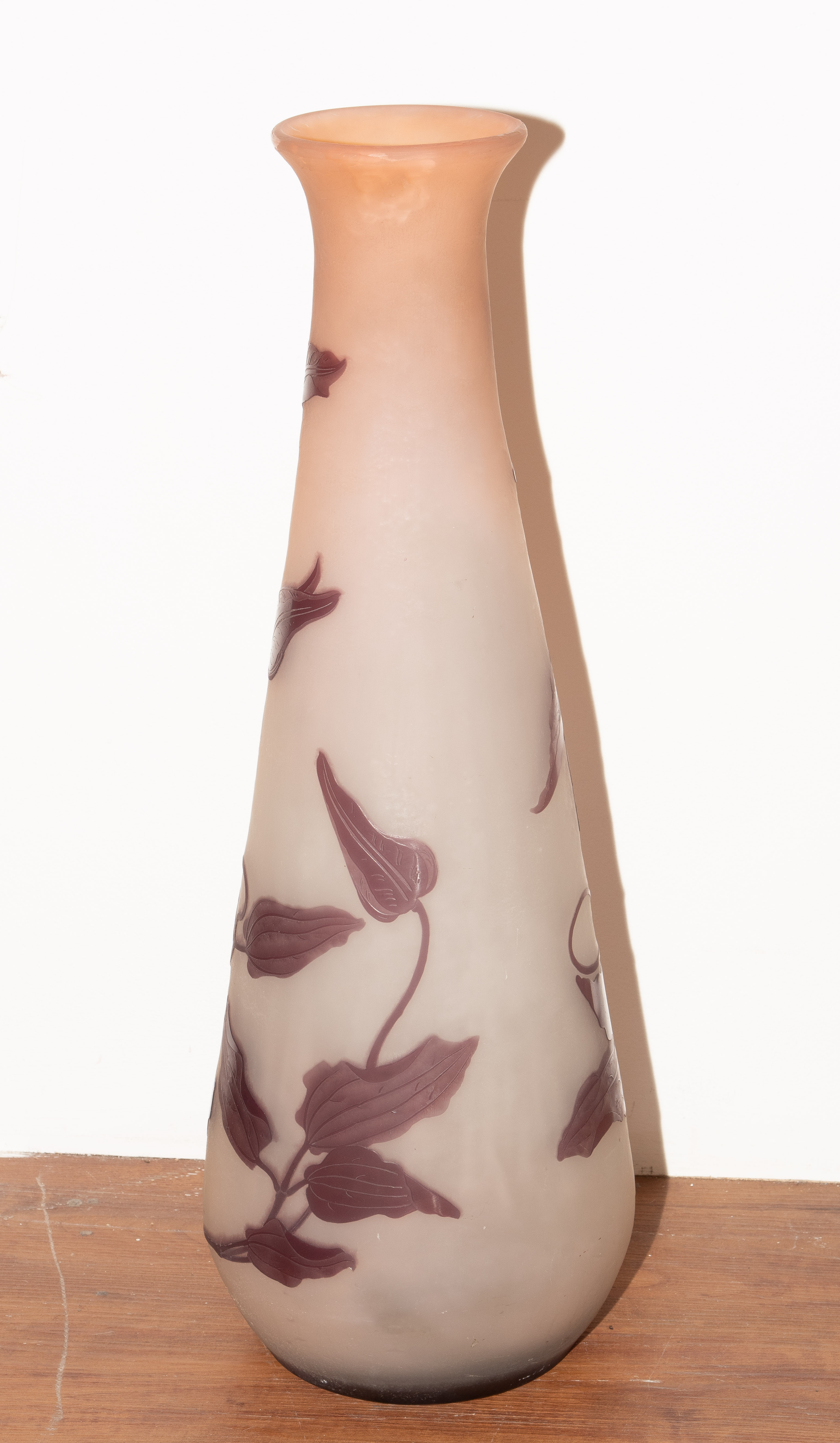 Nancy, Anfang 20.Jh. Hochgeätzte Signatur. Farbloses Glas mit weissen und roten Pulvereinschmelzungen, violett überfangen. Auf mattiertem Grund hochgeätzter Floraldekor mit Clematisblüten. Binnenzeichnung in flacher Hochätzung. H 59 cm.