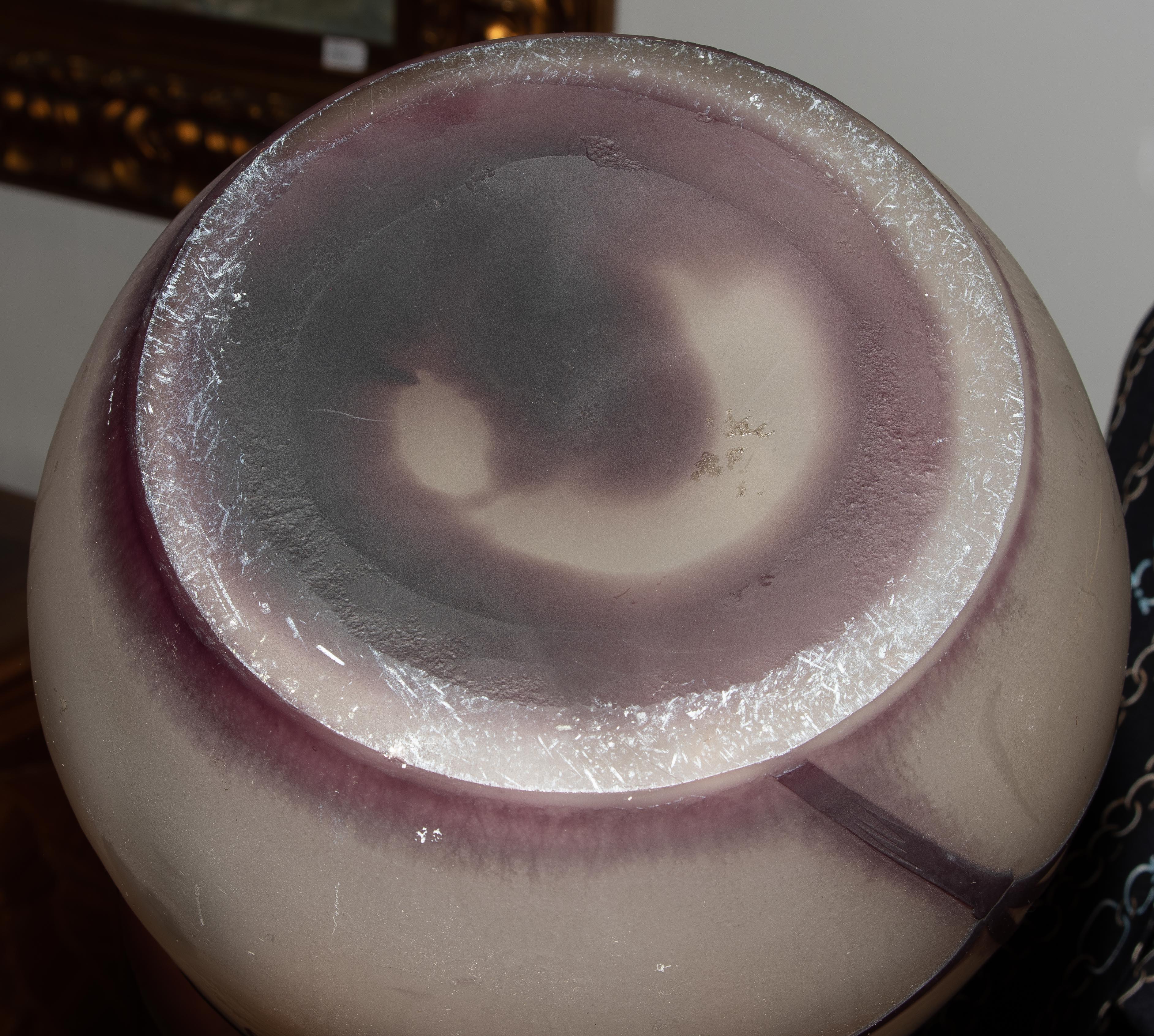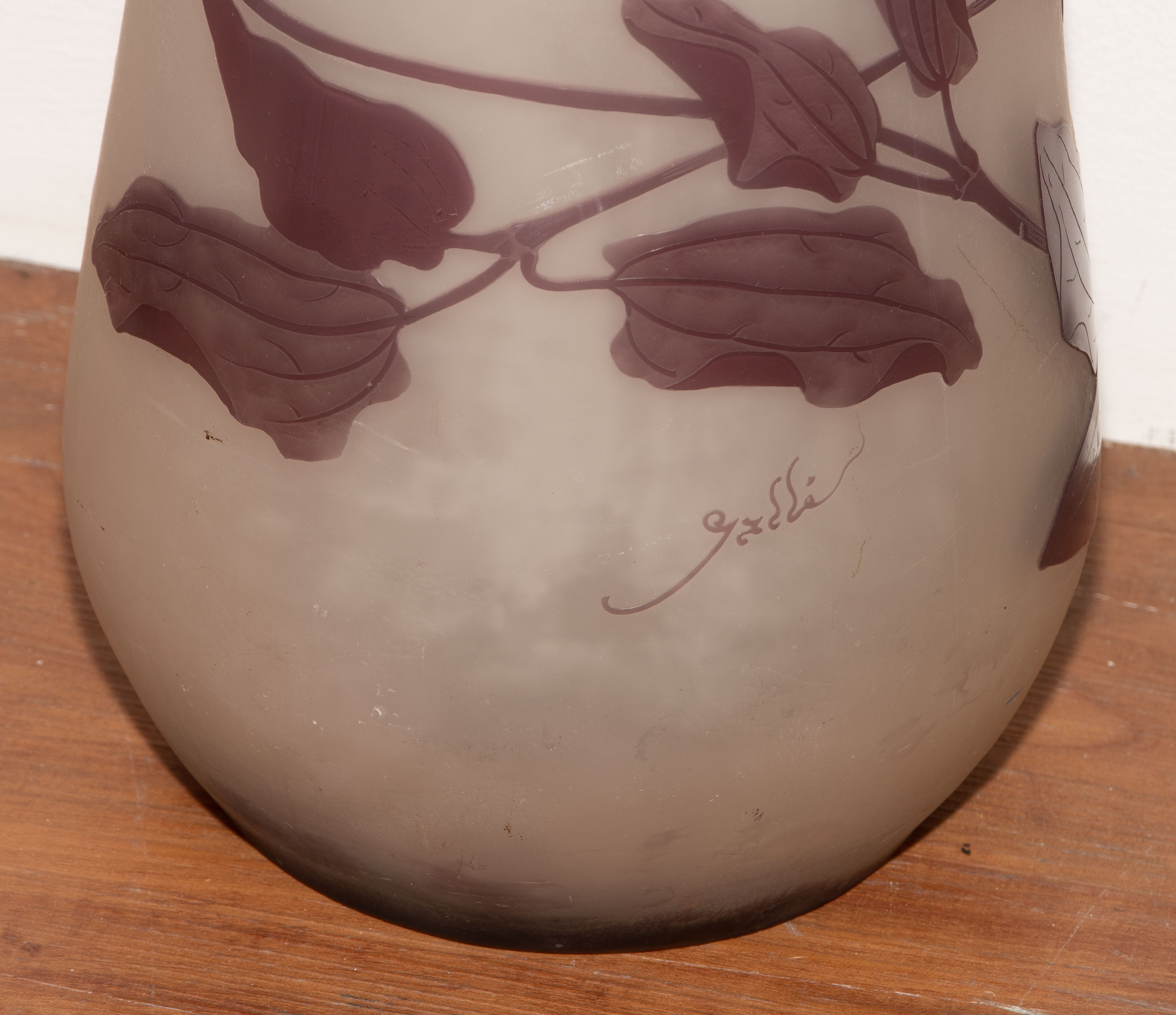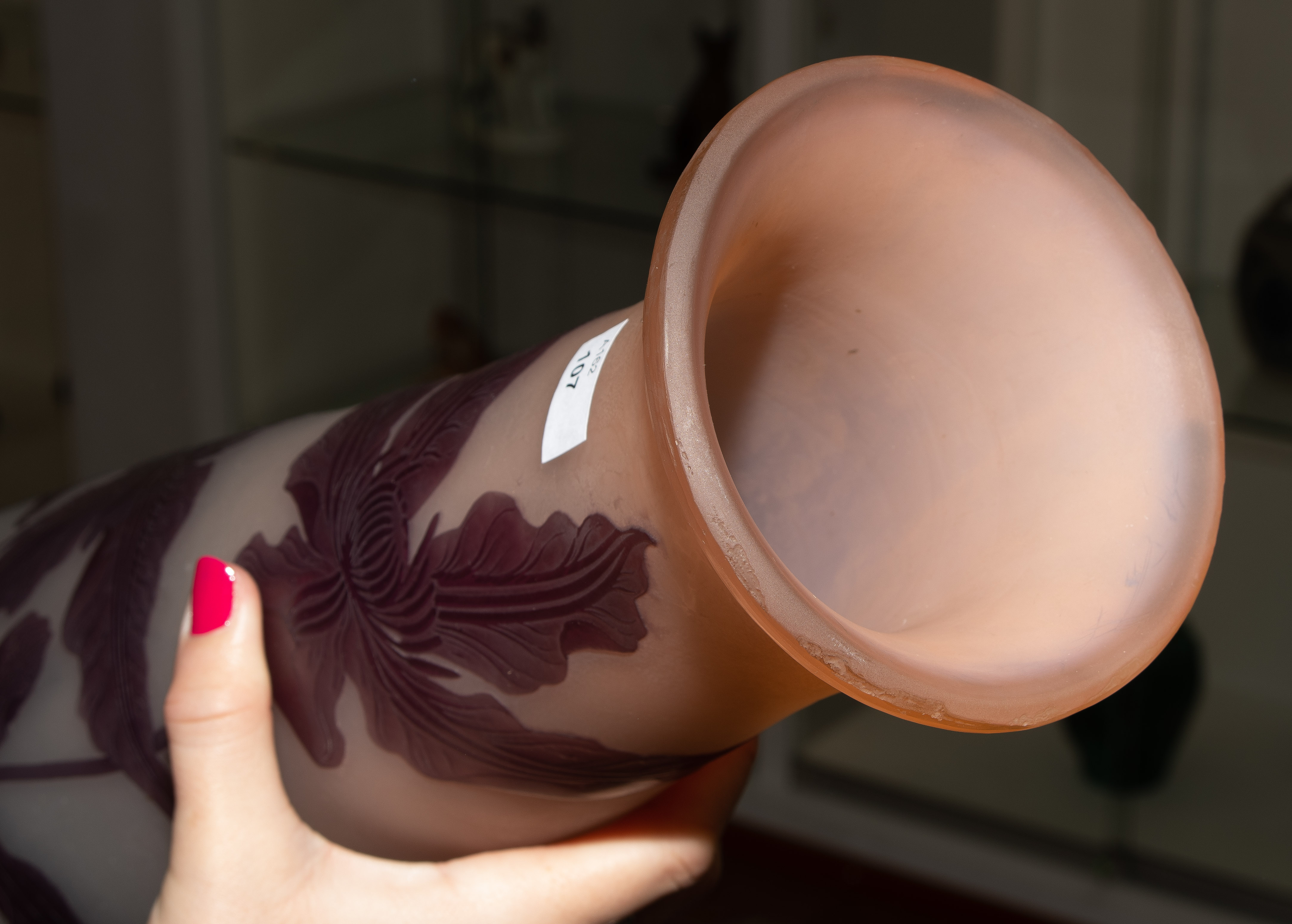 Nancy, Anfang 20.Jh. Hochgeätzte Signatur. Farbloses Glas mit weissen und roten Pulvereinschmelzungen, violett überfangen. Auf mattiertem Grund hochgeätzter Floraldekor mit Clematisblüten. Binnenzeichnung in flacher Hochätzung. H 59 cm.