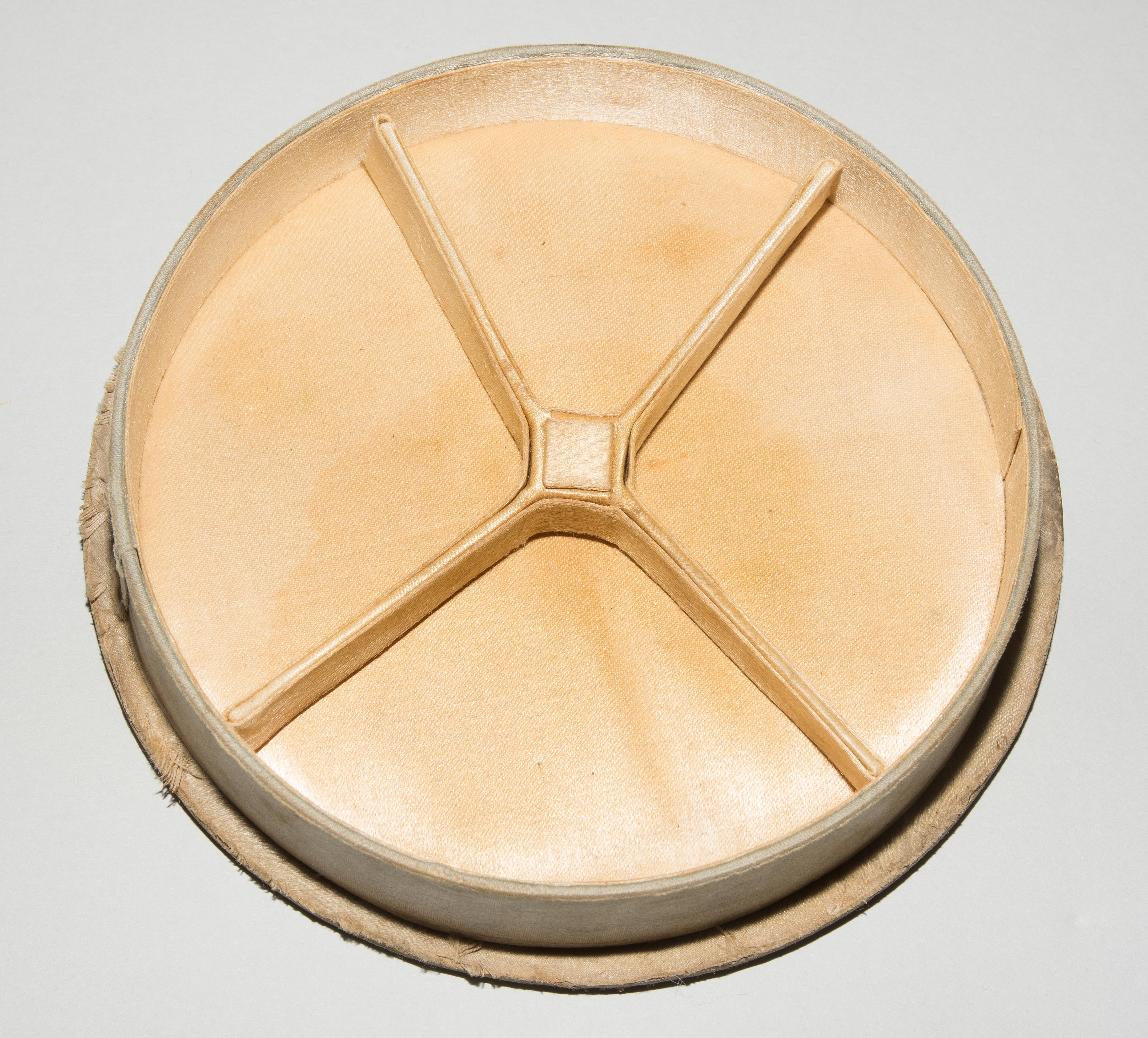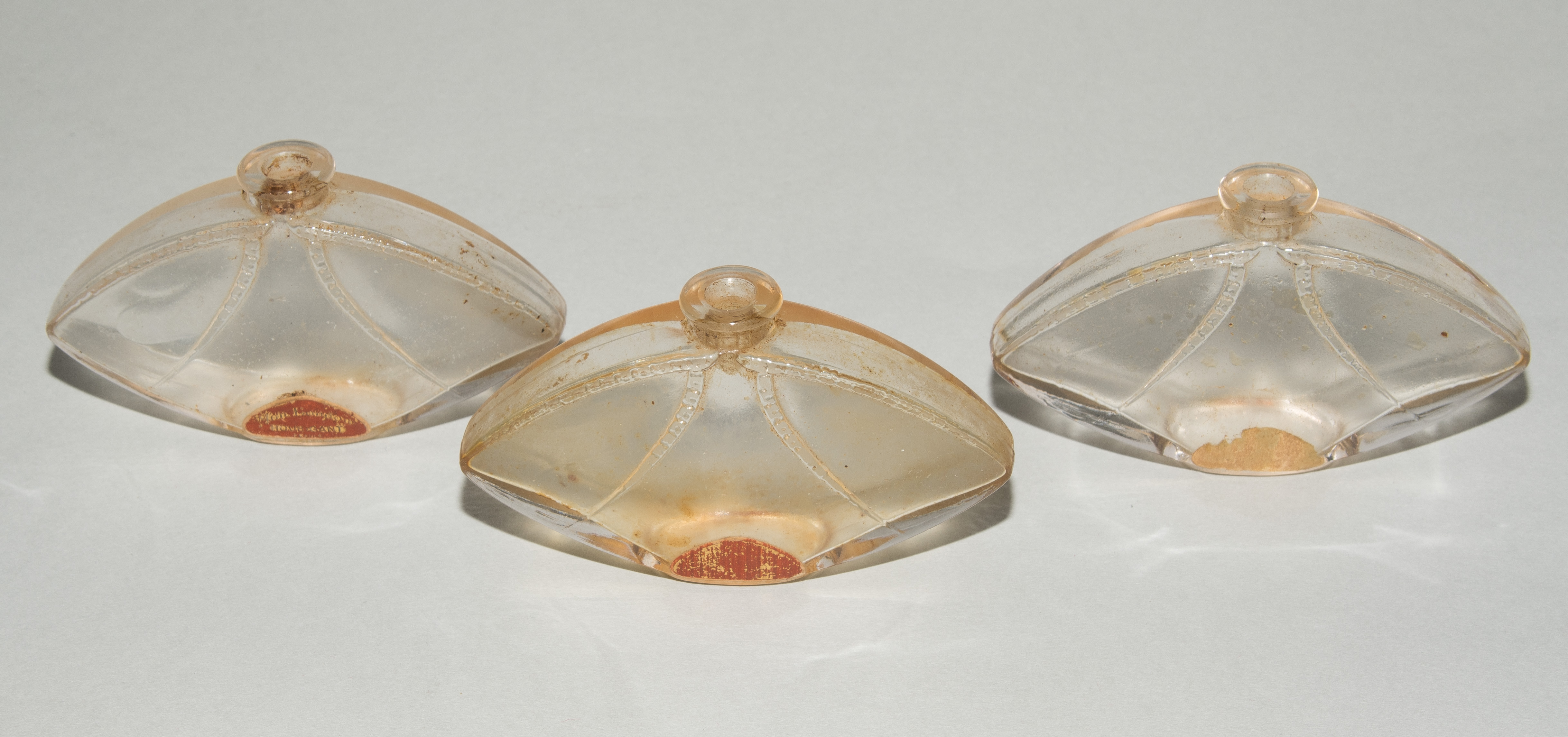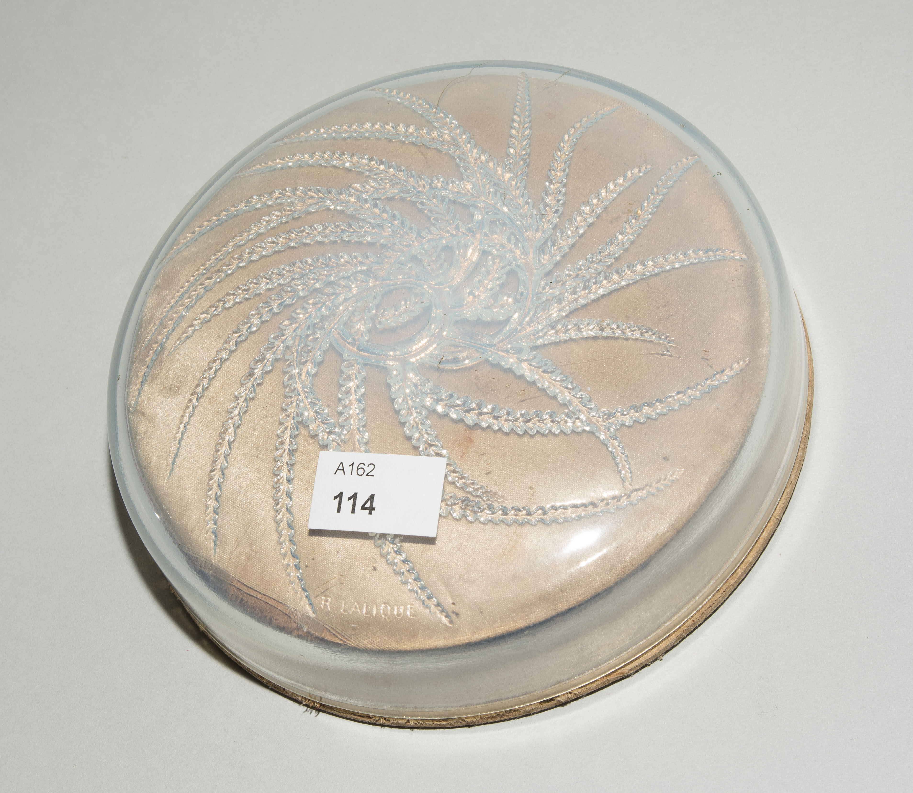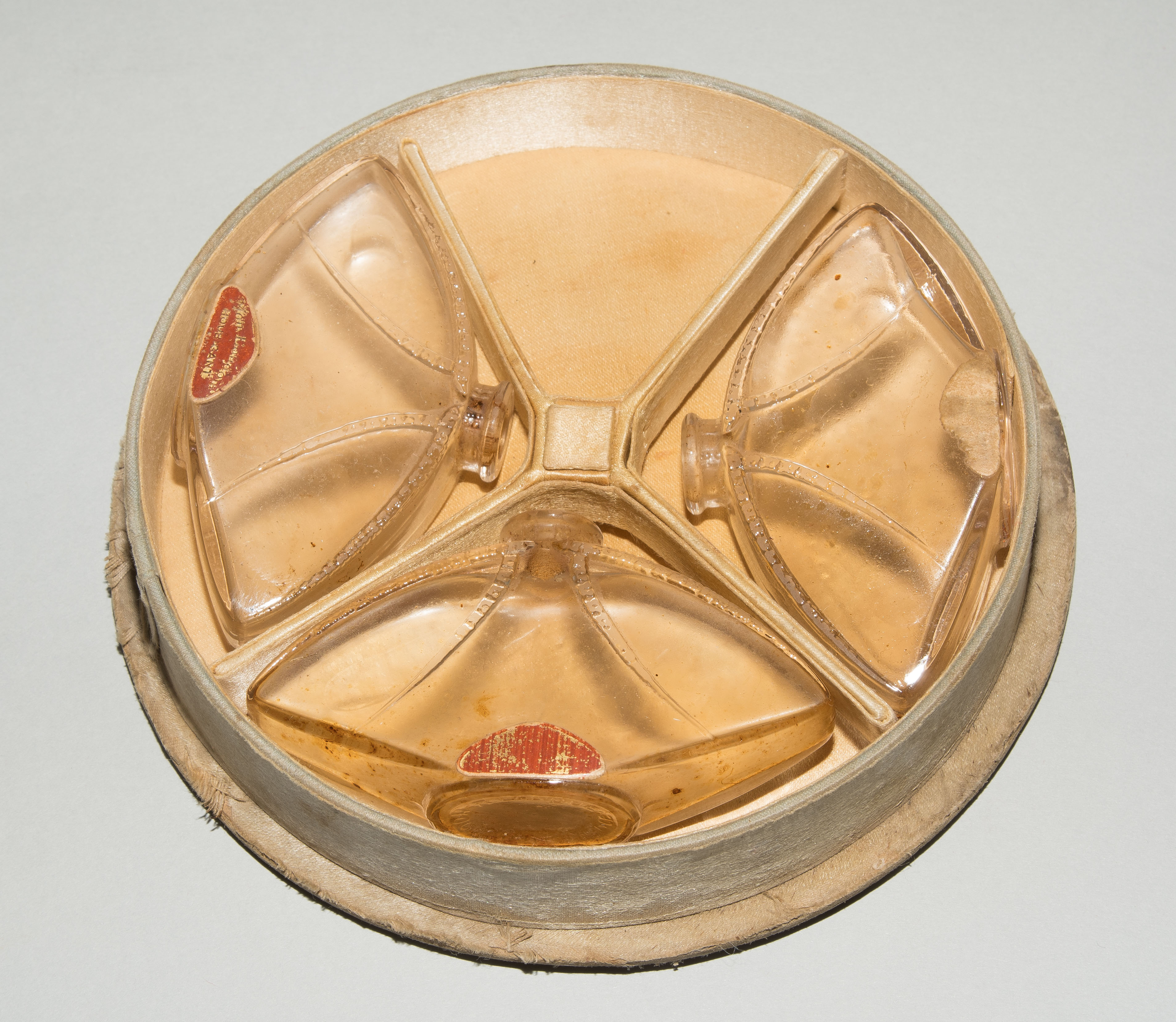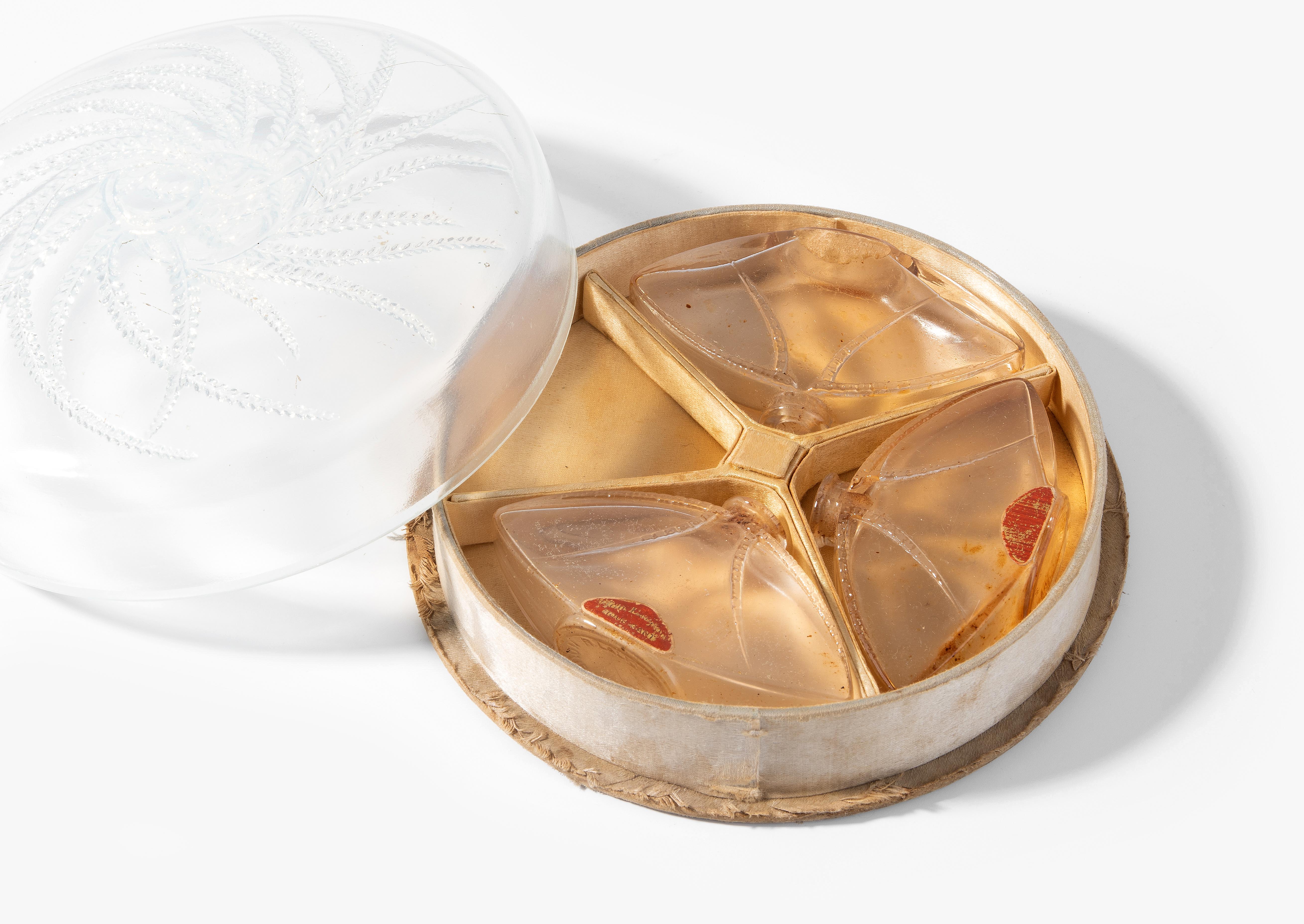 Wingen-sur-Moder, um 1928. (1) Deckel. Farbloses Kristallglas, moulé-pressé, opaleszent. Reliefierte Signatur: "R. LALIQUE". D 14 cm. (2) Dose. Mit beiger Seide kaschierter Karton. Darin 3 Flakons aus farblosem Glas mit reliefierter Signatur: "R. LALIQUE HOUBIGANT FRANCE". D 14 cm.
