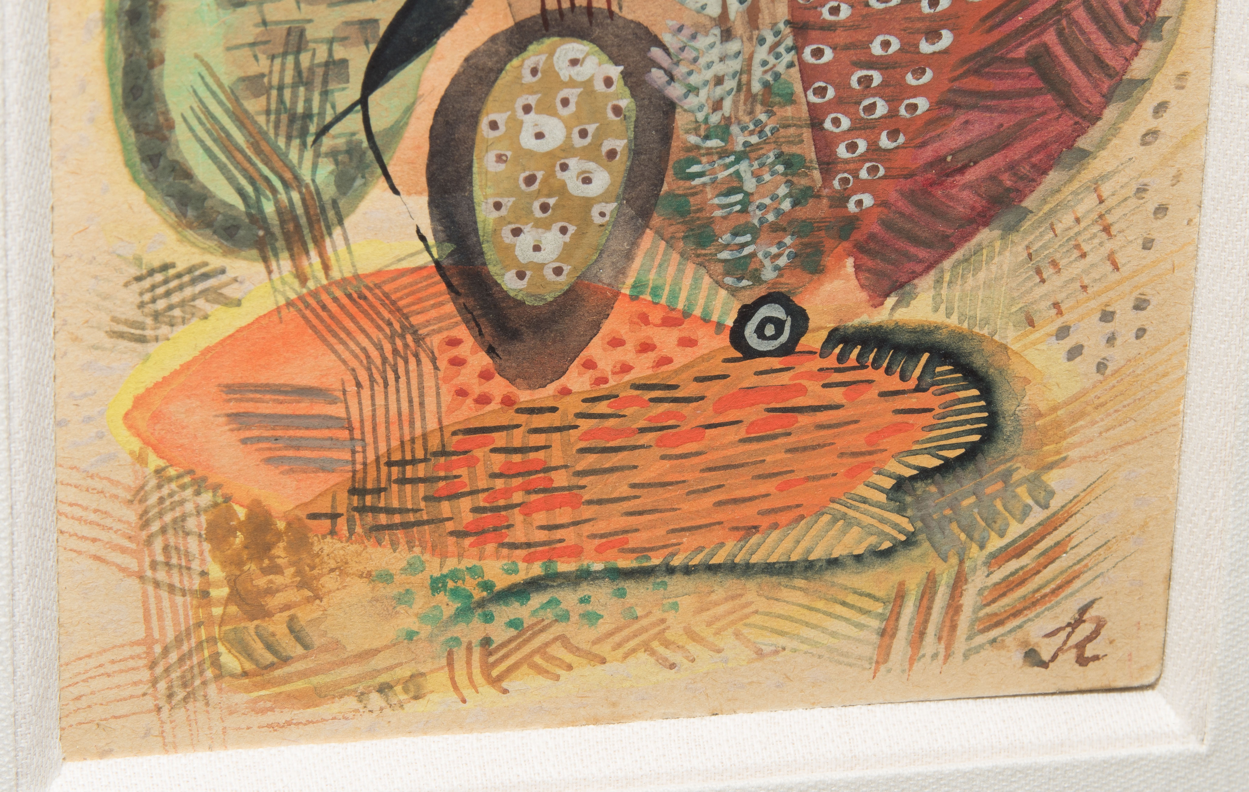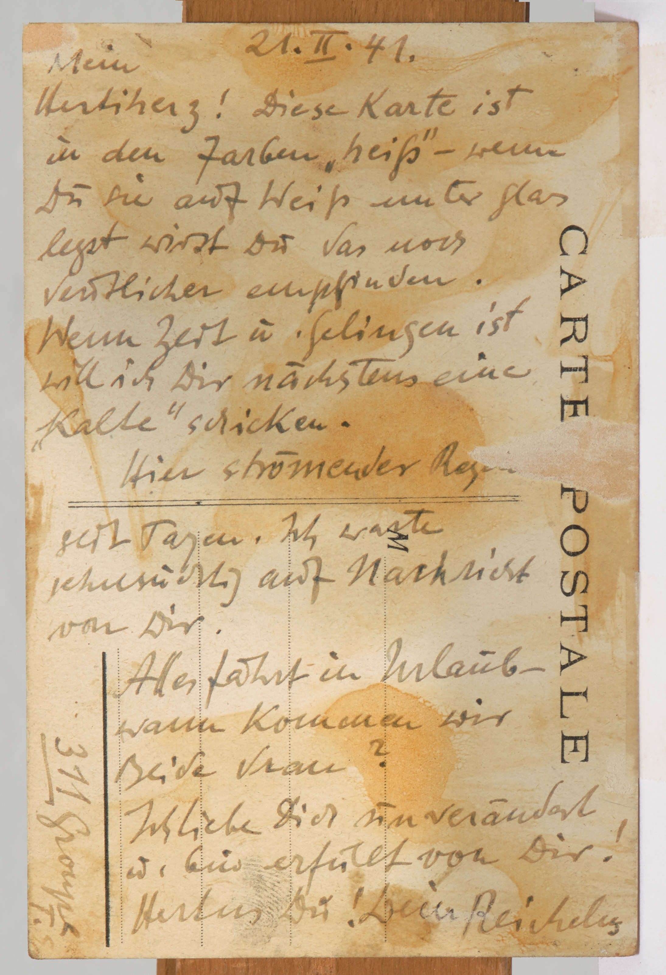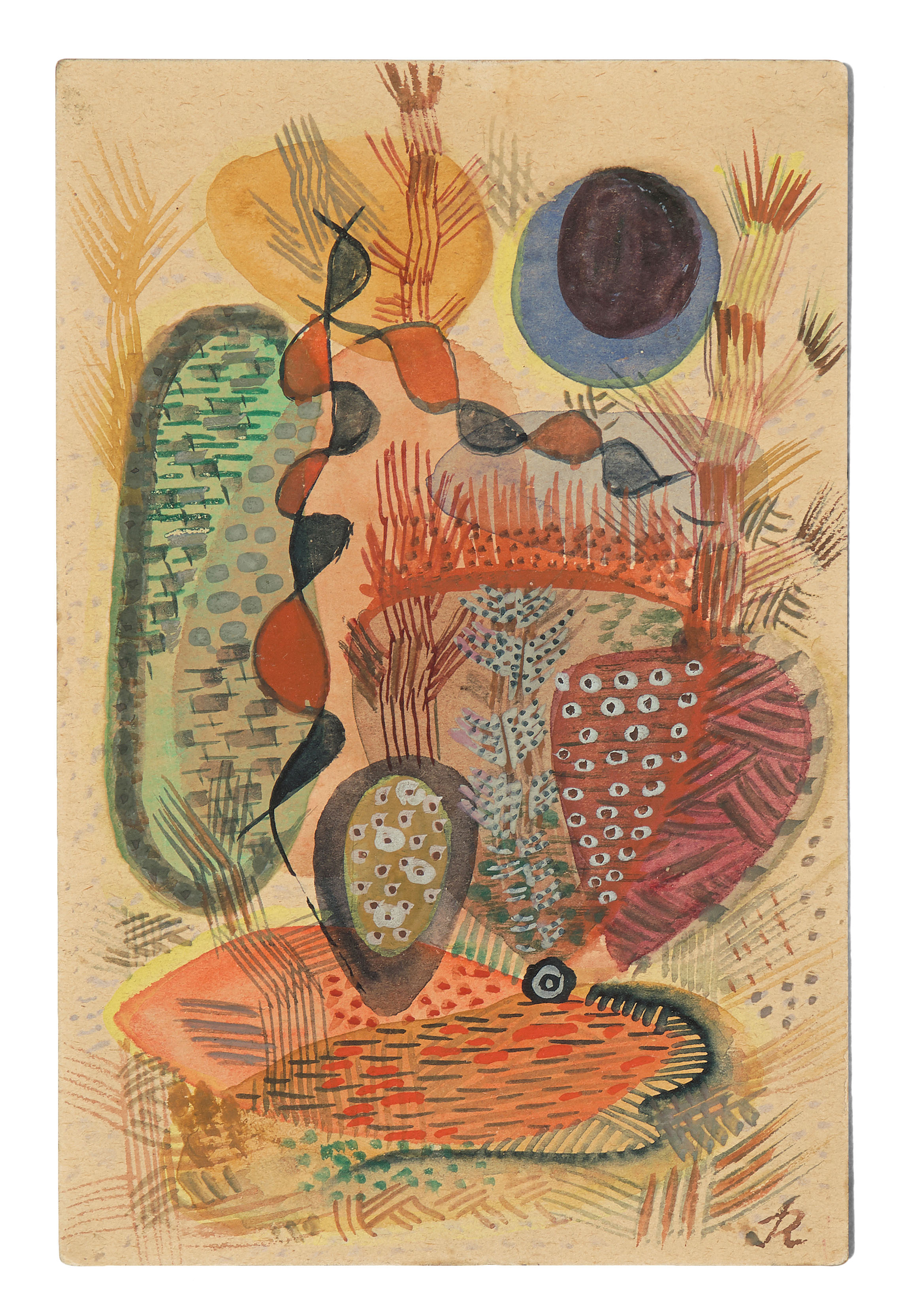 "Heiß". Komposition. 1941. Aquarell, Gouache und Tusche auf Postkarte. Unten rechts monogrammiert. "R". Verso mit Zeilen an "Hertiherz", signiert: "Reichel" und datiert: "21.II.41". Blattgrösse 13,9x9 cm. Gerahmt. -Blatt leicht gebräunt. Ränder und Ecken leicht bestossen. Verso am linken Rand partiell an Rückkarton montiert.