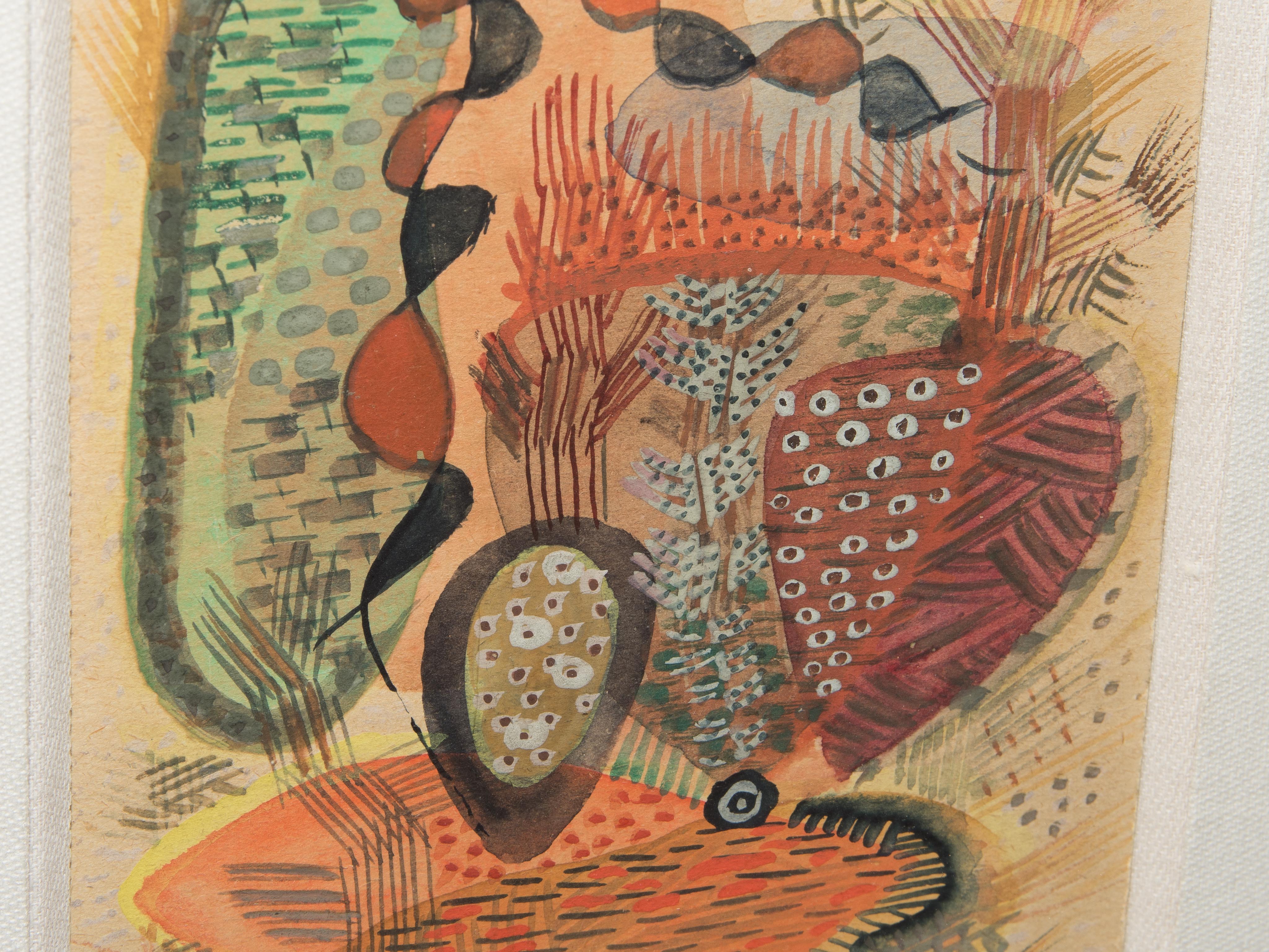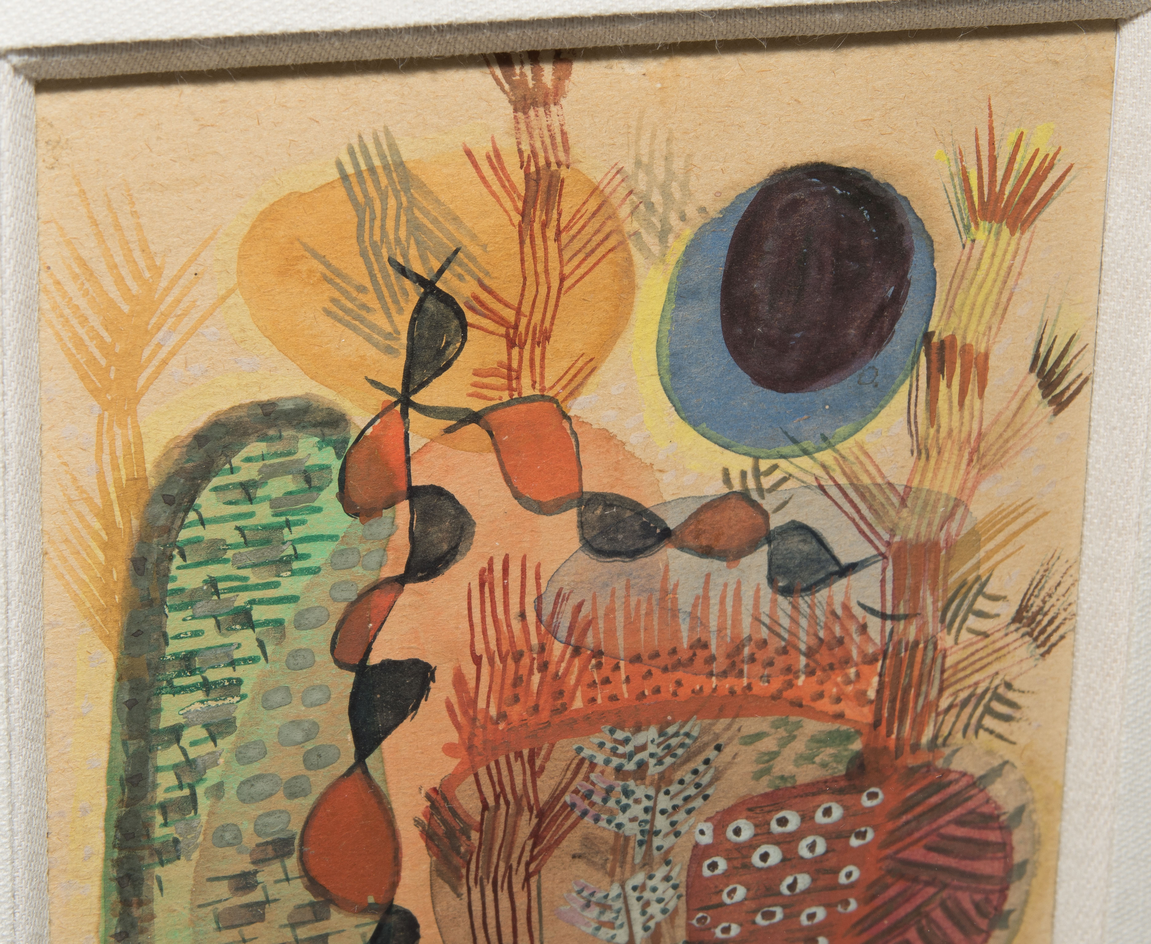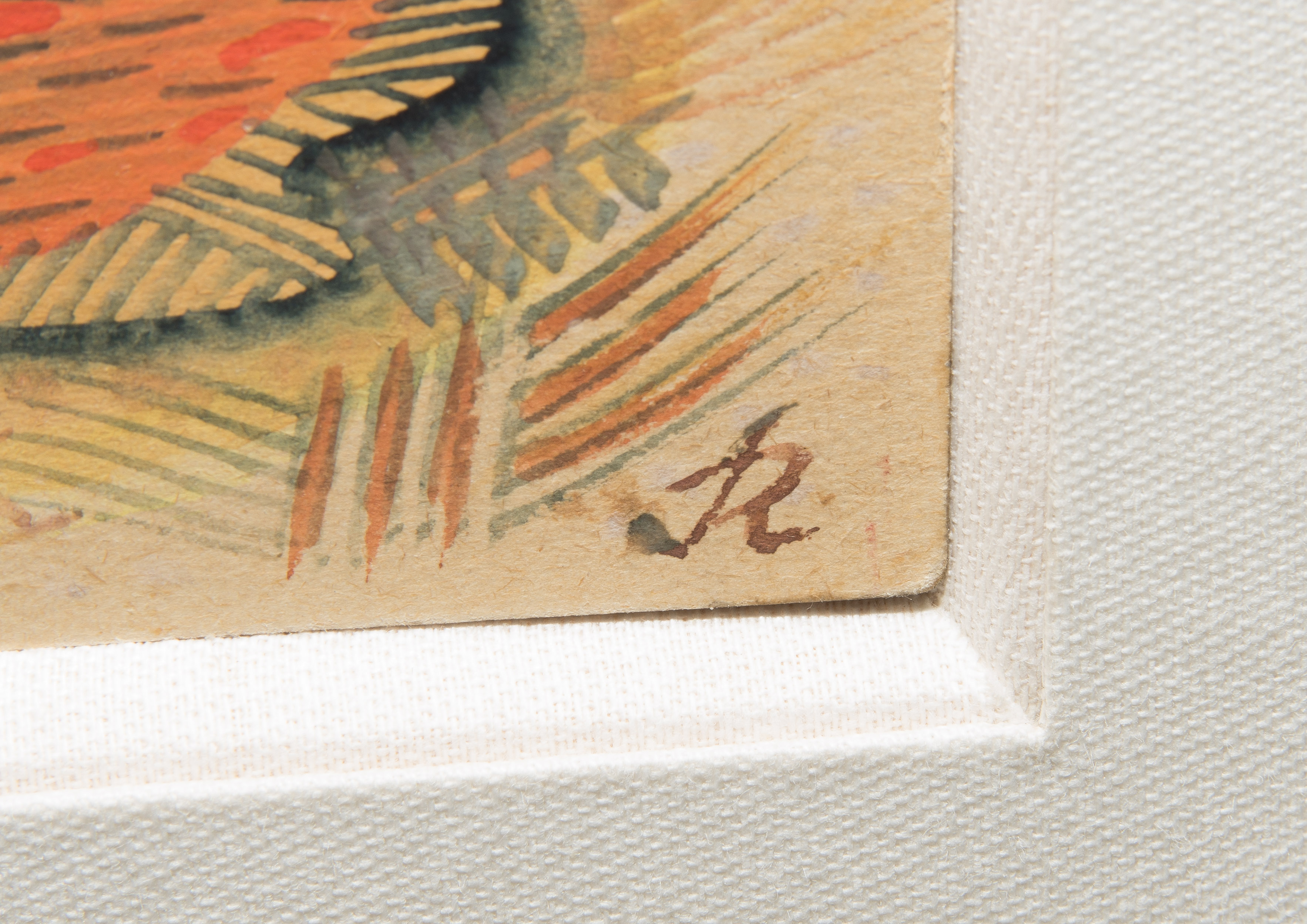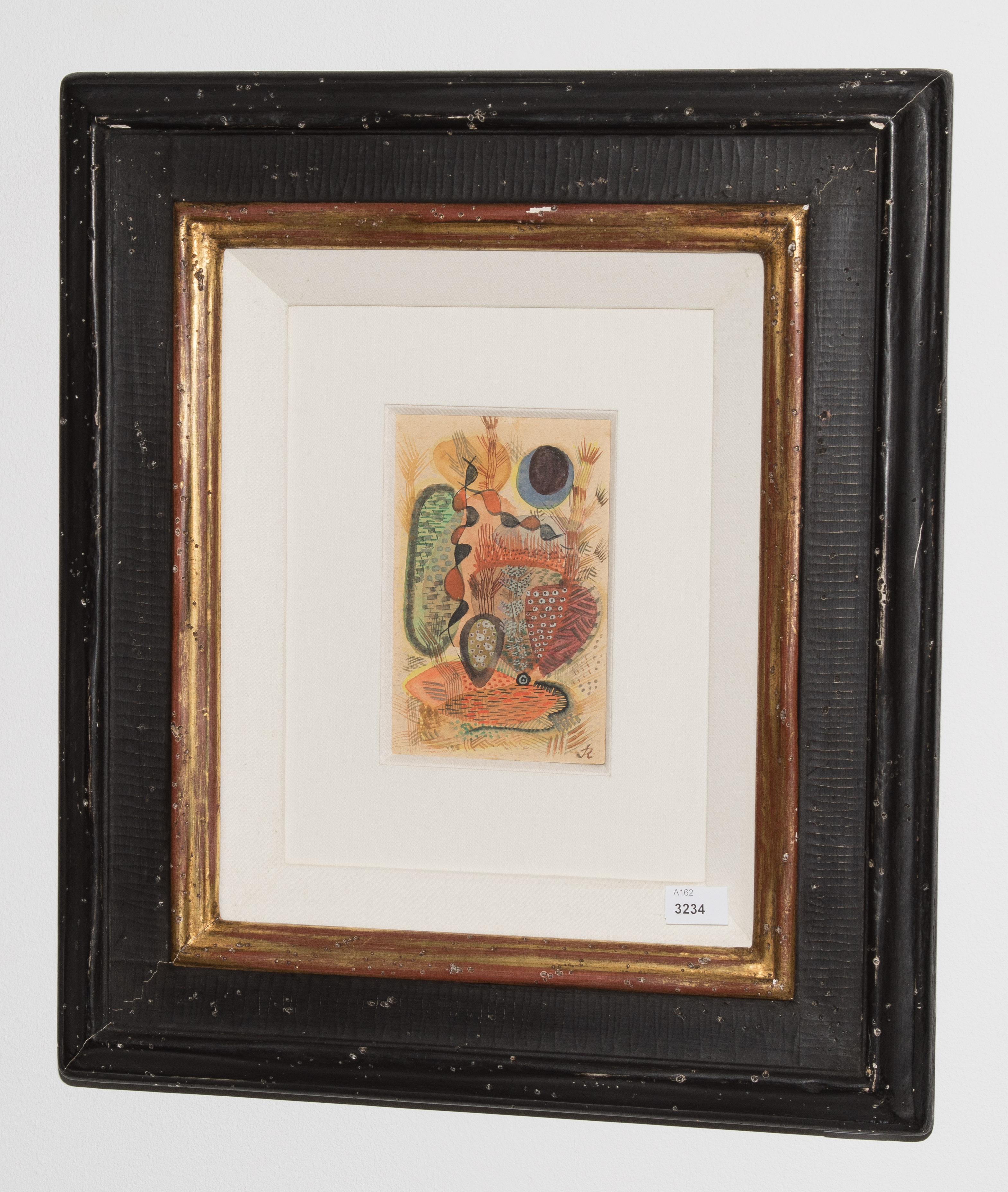 "Heiß". Komposition. 1941. Aquarell, Gouache und Tusche auf Postkarte. Unten rechts monogrammiert. "R". Verso mit Zeilen an "Hertiherz", signiert: "Reichel" und datiert: "21.II.41". Blattgrösse 13,9x9 cm. Gerahmt. -Blatt leicht gebräunt. Ränder und Ecken leicht bestossen. Verso am linken Rand partiell an Rückkarton montiert.