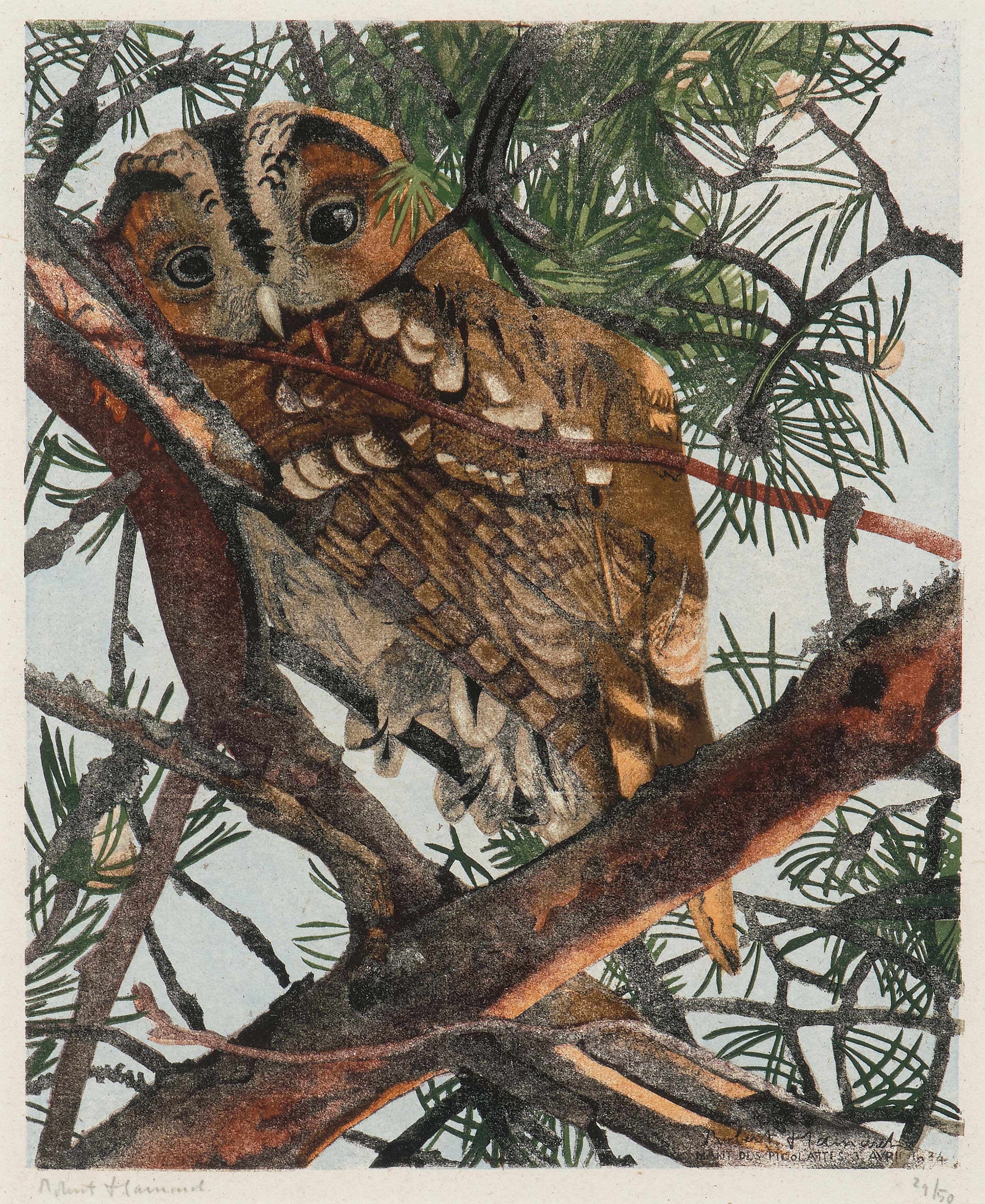 Hulotte. 1934. Holzschnitt. 24/50. Unten links in Bleistift signiert. Unten rechts im Druck signiert und bezeichnet: "Mont des Picolattes, 3 avril 1934". Lichtmass 28x23 cm. Gerahmt. -Blatt wenig fleckig. Blatt wurde zwischen Passepartout und Rückkarton montiert.