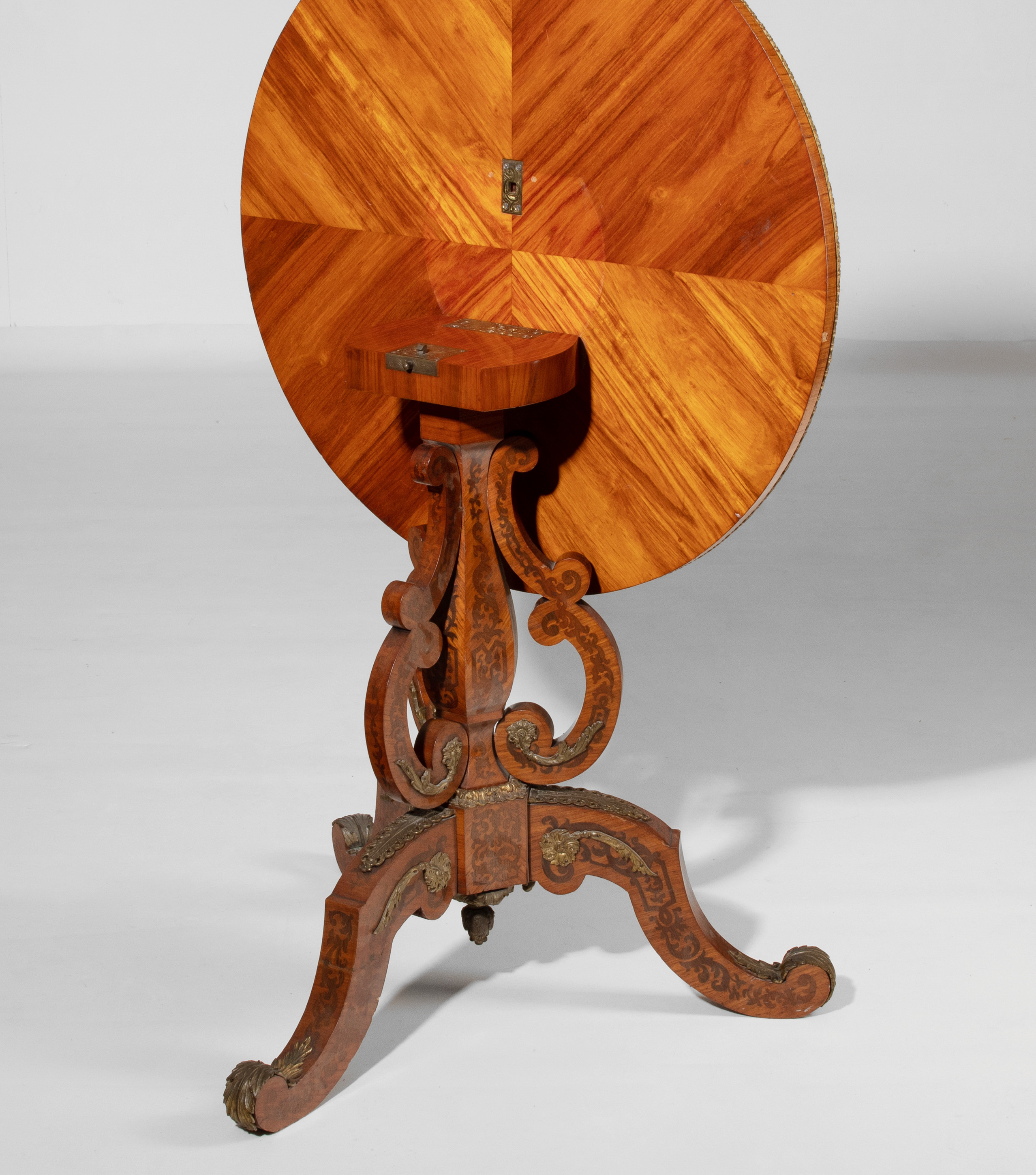 Napoleon III ca. 1880. Palisander, Rosenholz. Balusterförmiger Schaft auf dreipassigem Fussgestell. Umseitig mit arabeskem Dekor intarsiert. Unter der Platte Klebeetikette: Kaiser Friedrich, Zimmer Nr. 930, Lfde Nr. 93. Gebrauchsspuren. 71x71x7 cm.