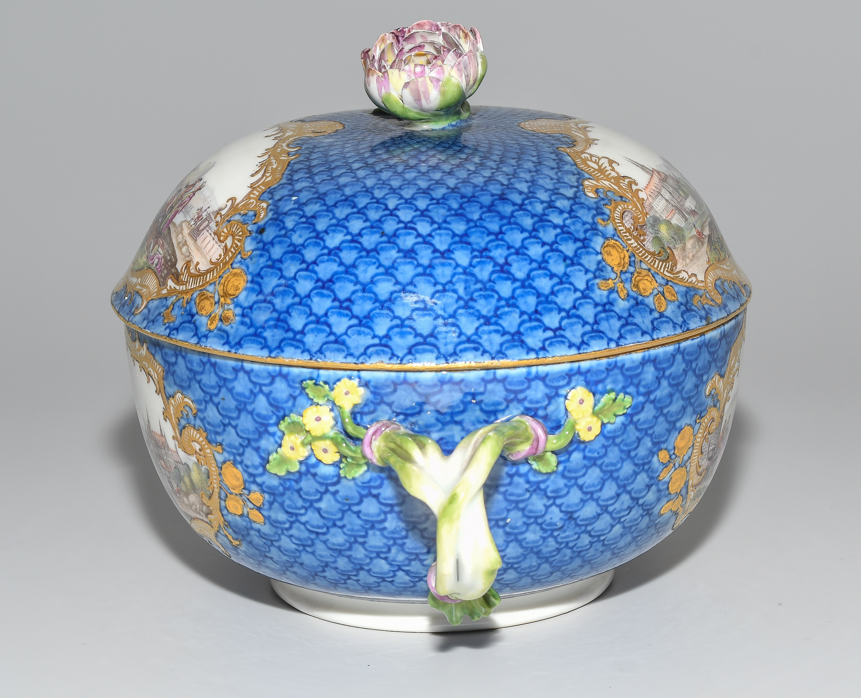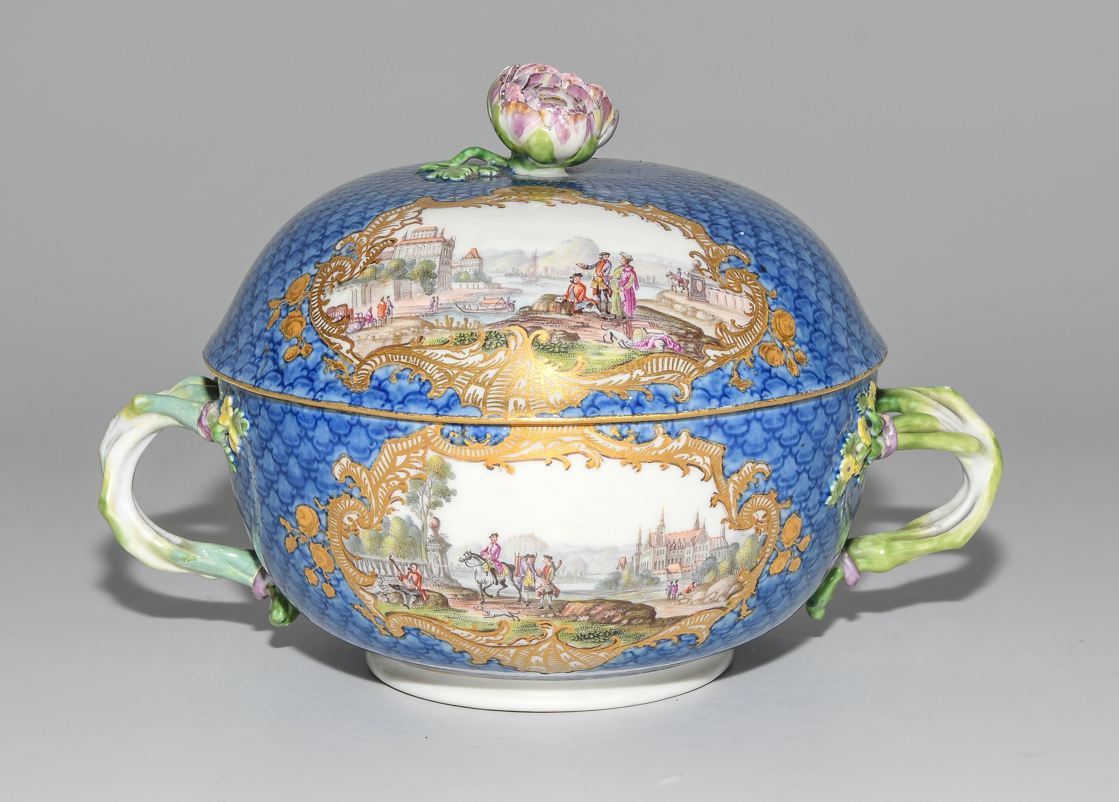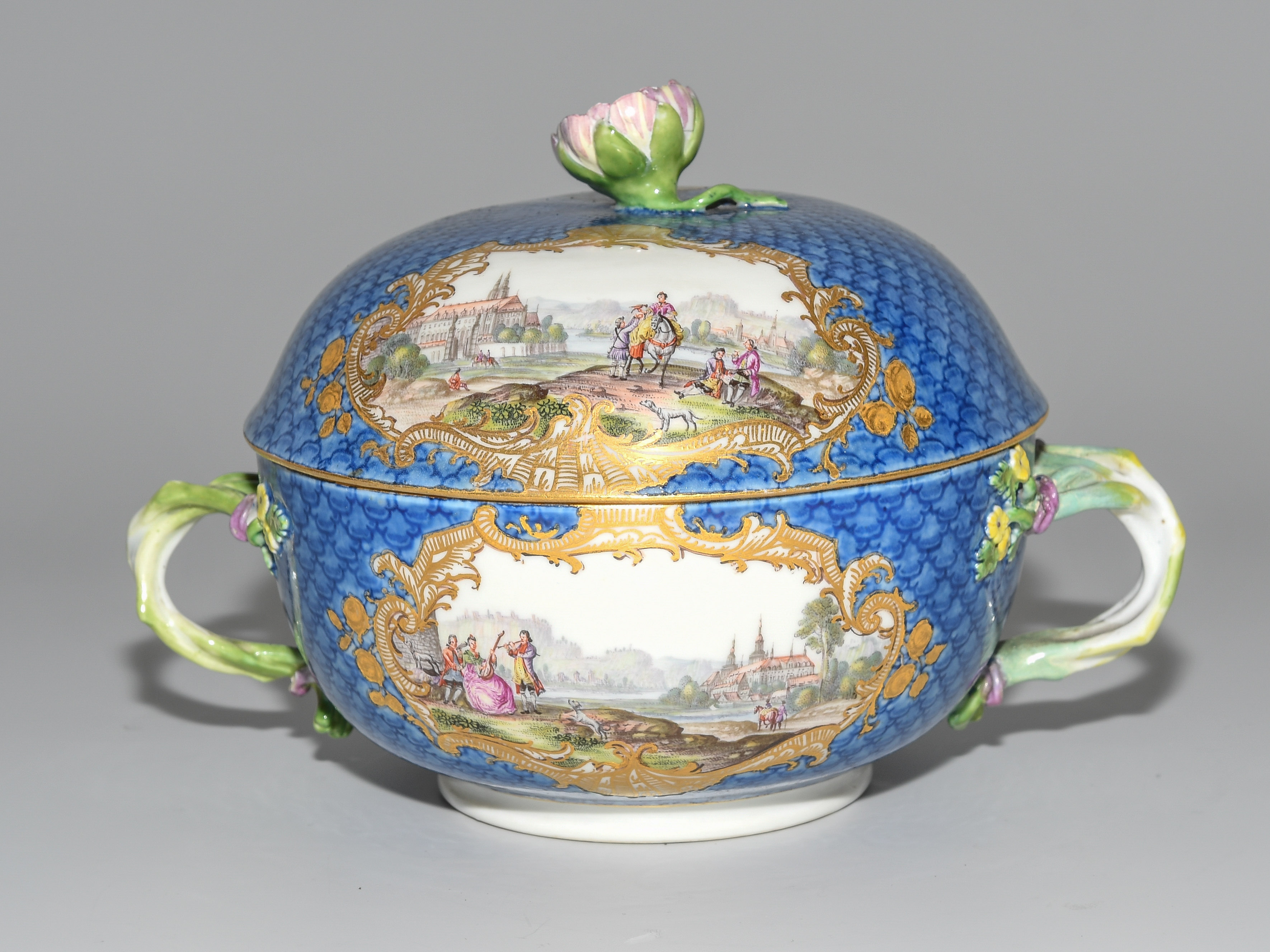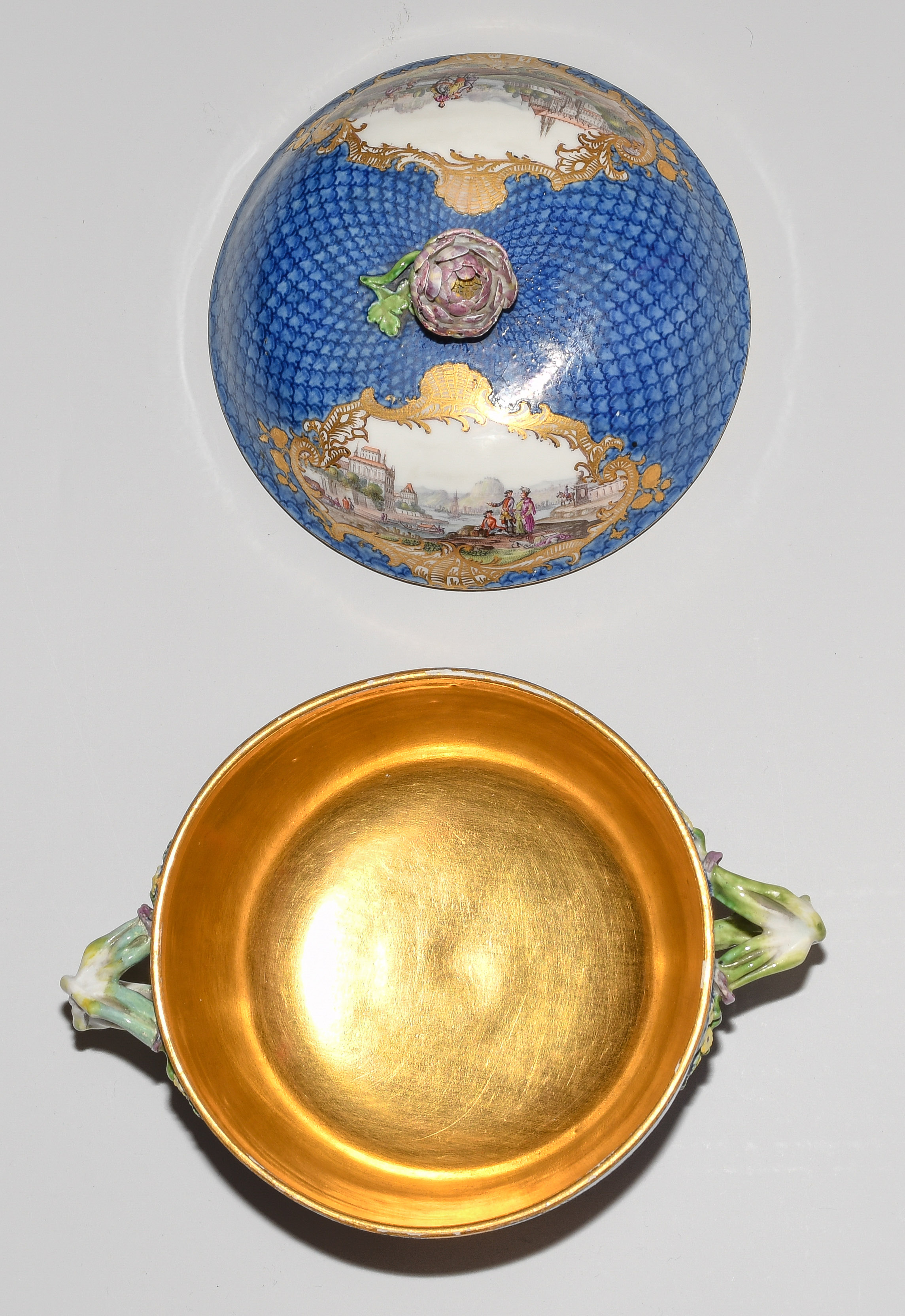 2.Hälfte 18.Jh. Porzellan. Unterglasurblaue Schwertermarke, Pressnummer 22 (Unterschale). Auf blauem Fond mit Schuppenmuster Flusslandschaften mit Schlossansichten und Gesellschaften in Goldkartuschen mit Braunkonturen. Terrine mit Knauf in Blütenform und zwei Doppelasthenkeln. Innen vergoldet, im Deckelinnern Reserve mit Manierblumen, umgeben von Goldrahmen mit Braunkontur. Unterschale mit radierten Goldblumenbouquets und Blumenfestons. D 14, 24 cm.