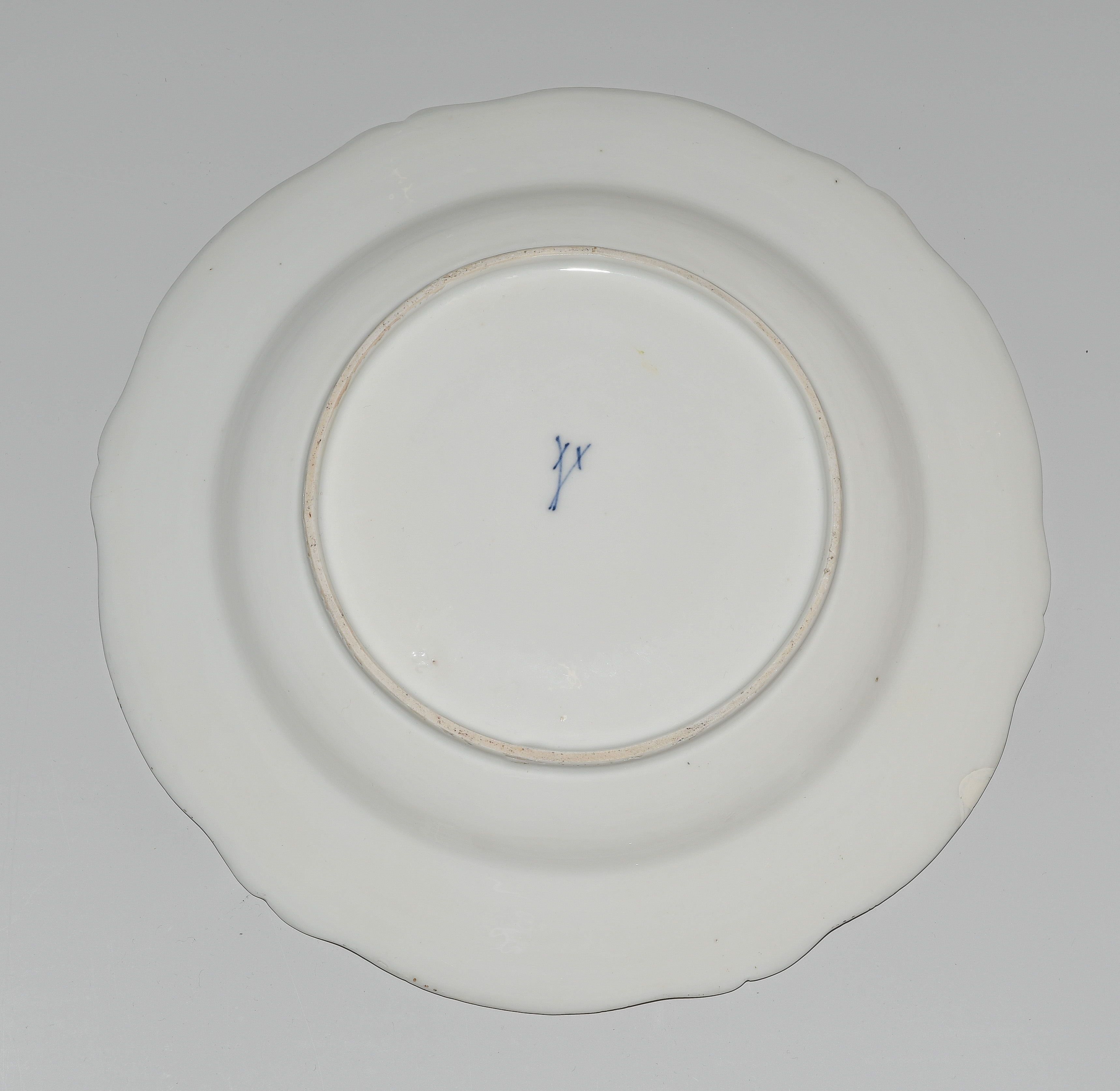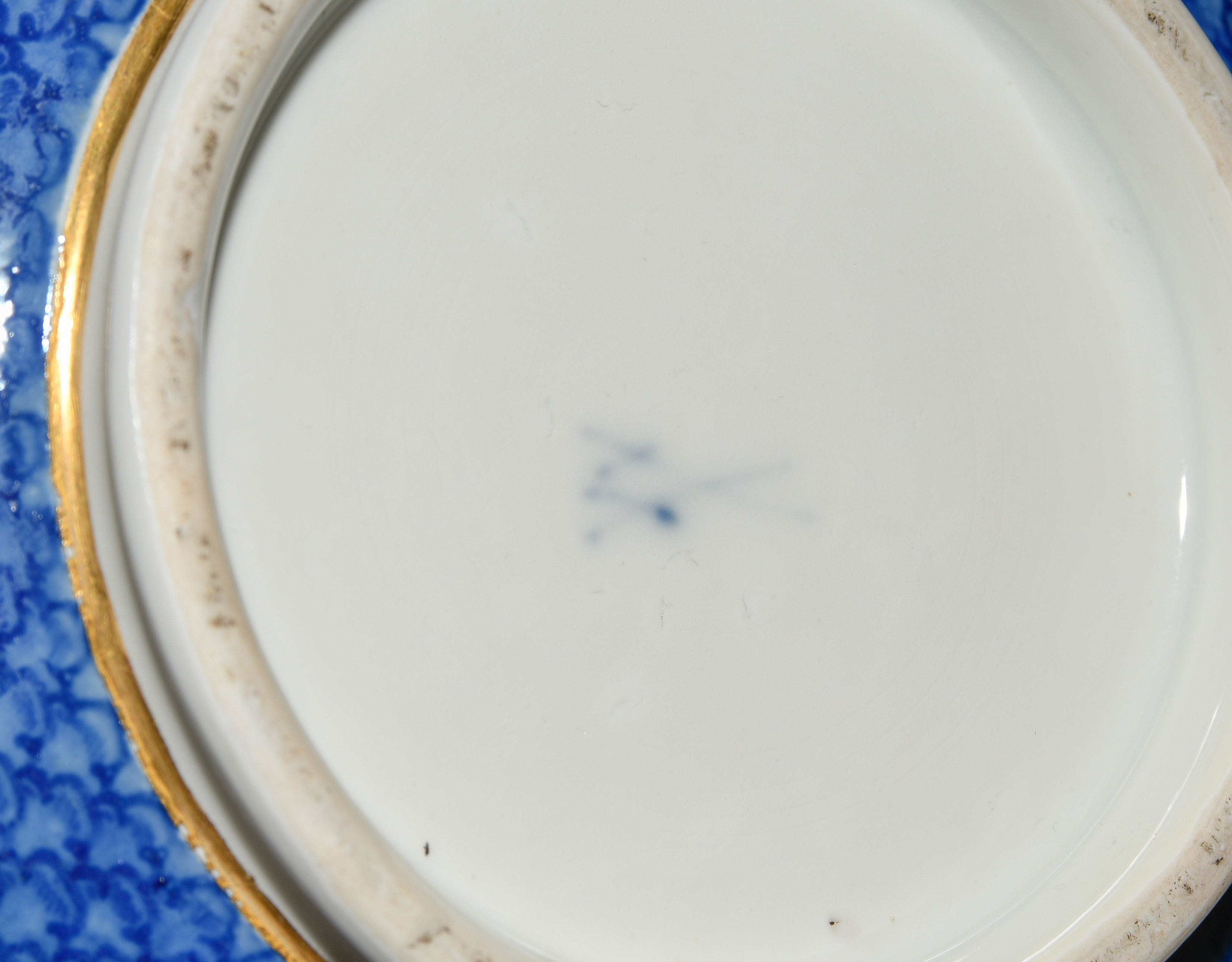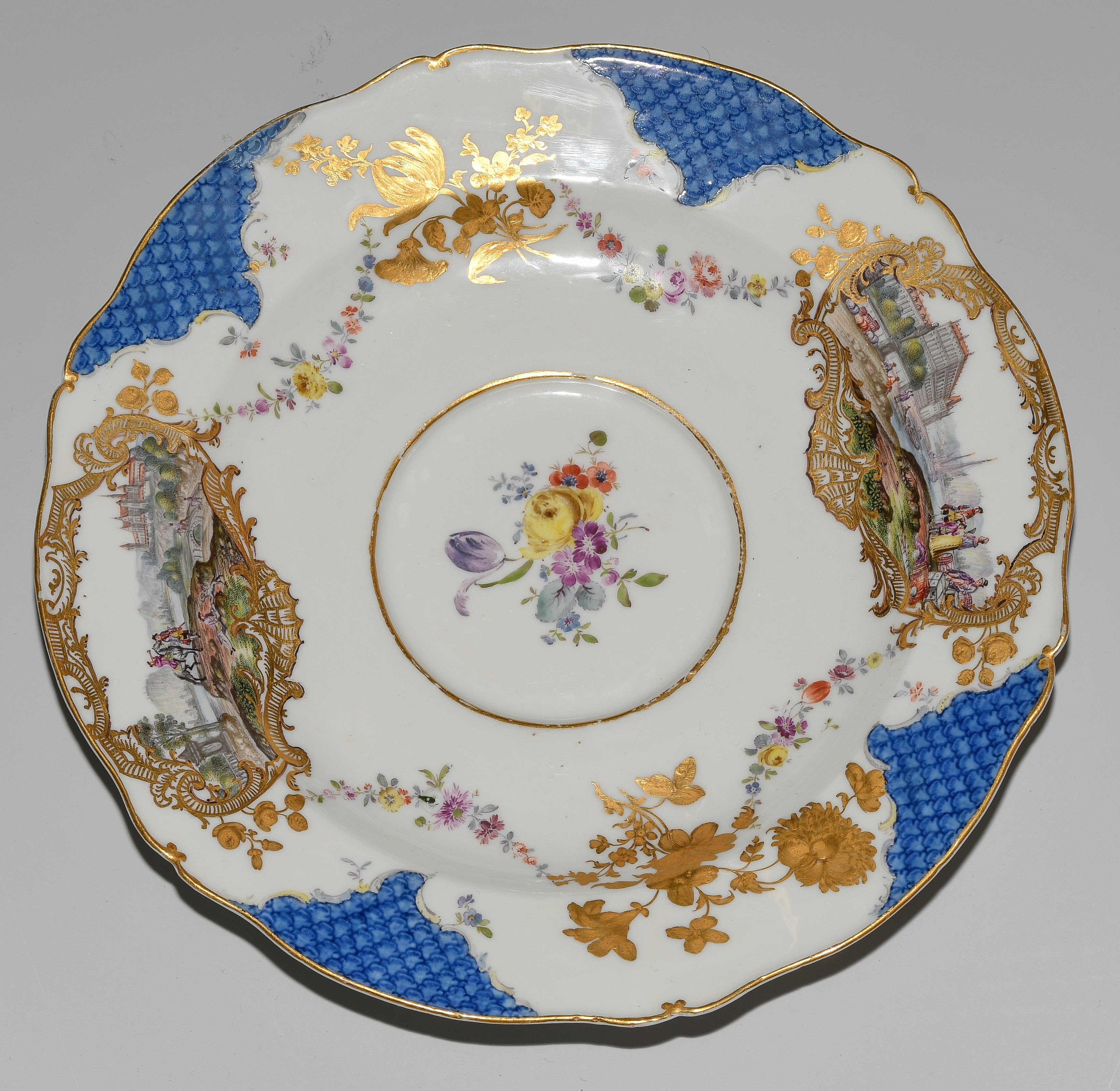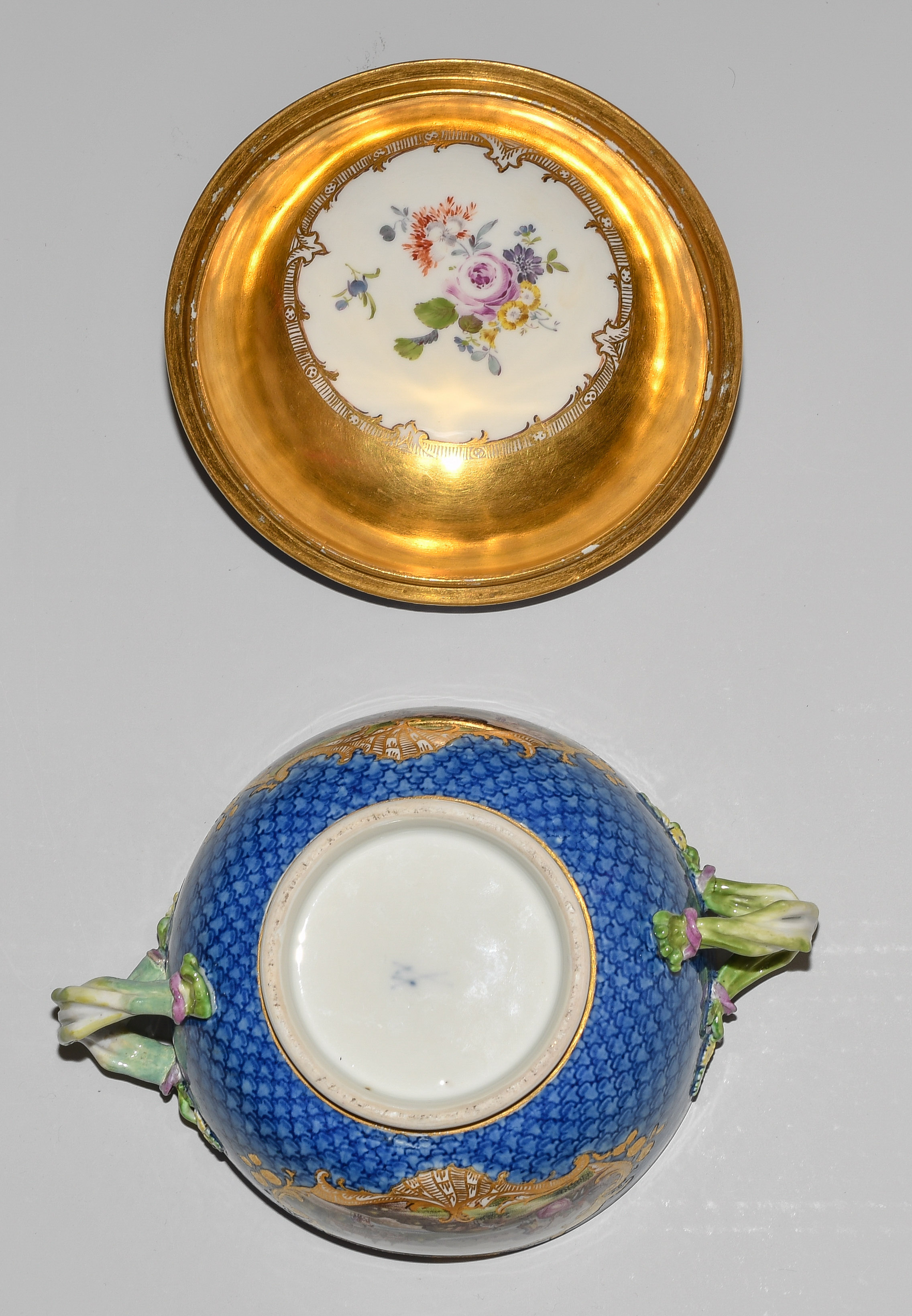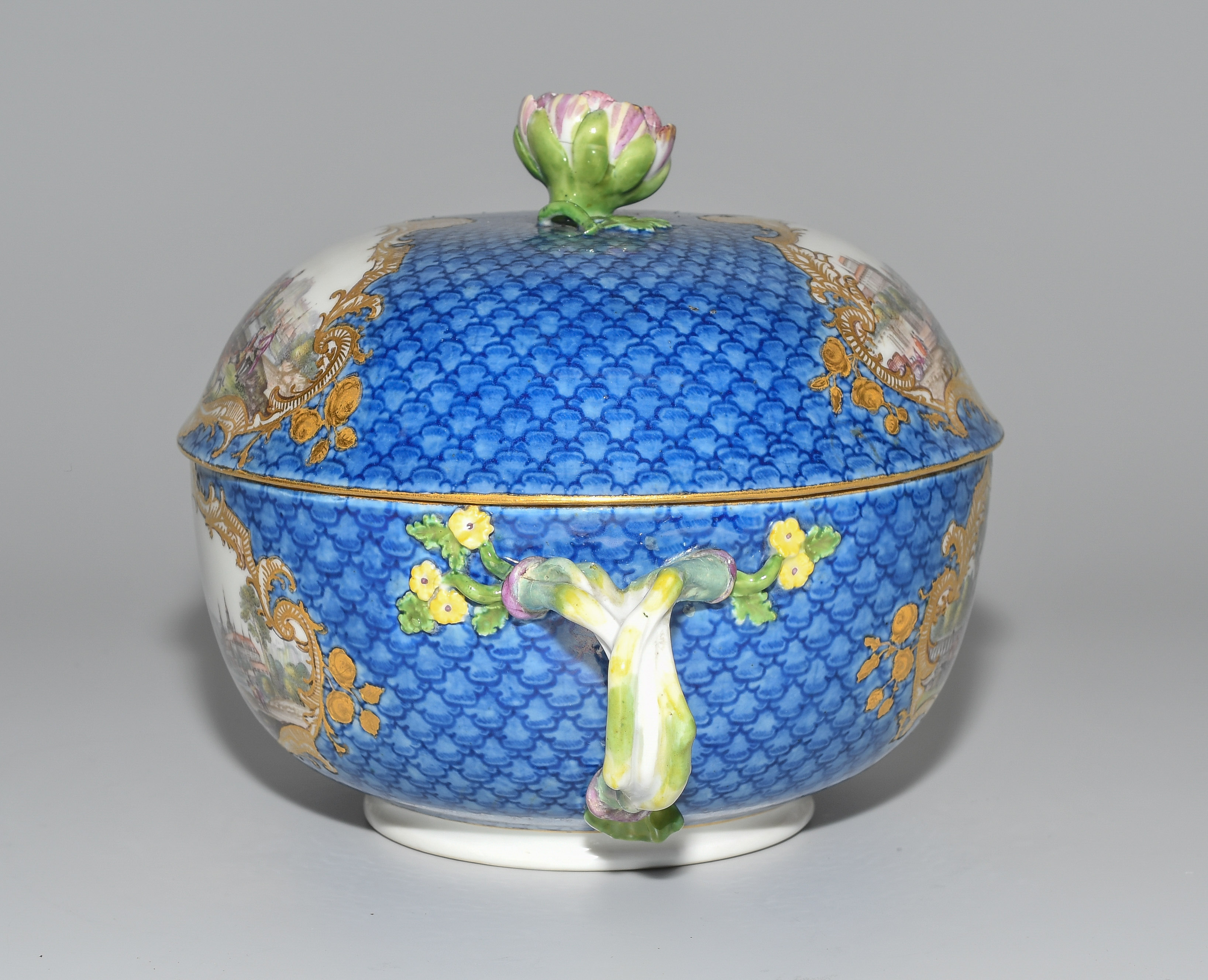 2.Hälfte 18.Jh. Porzellan. Unterglasurblaue Schwertermarke, Pressnummer 22 (Unterschale). Auf blauem Fond mit Schuppenmuster Flusslandschaften mit Schlossansichten und Gesellschaften in Goldkartuschen mit Braunkonturen. Terrine mit Knauf in Blütenform und zwei Doppelasthenkeln. Innen vergoldet, im Deckelinnern Reserve mit Manierblumen, umgeben von Goldrahmen mit Braunkontur. Unterschale mit radierten Goldblumenbouquets und Blumenfestons. D 14, 24 cm.