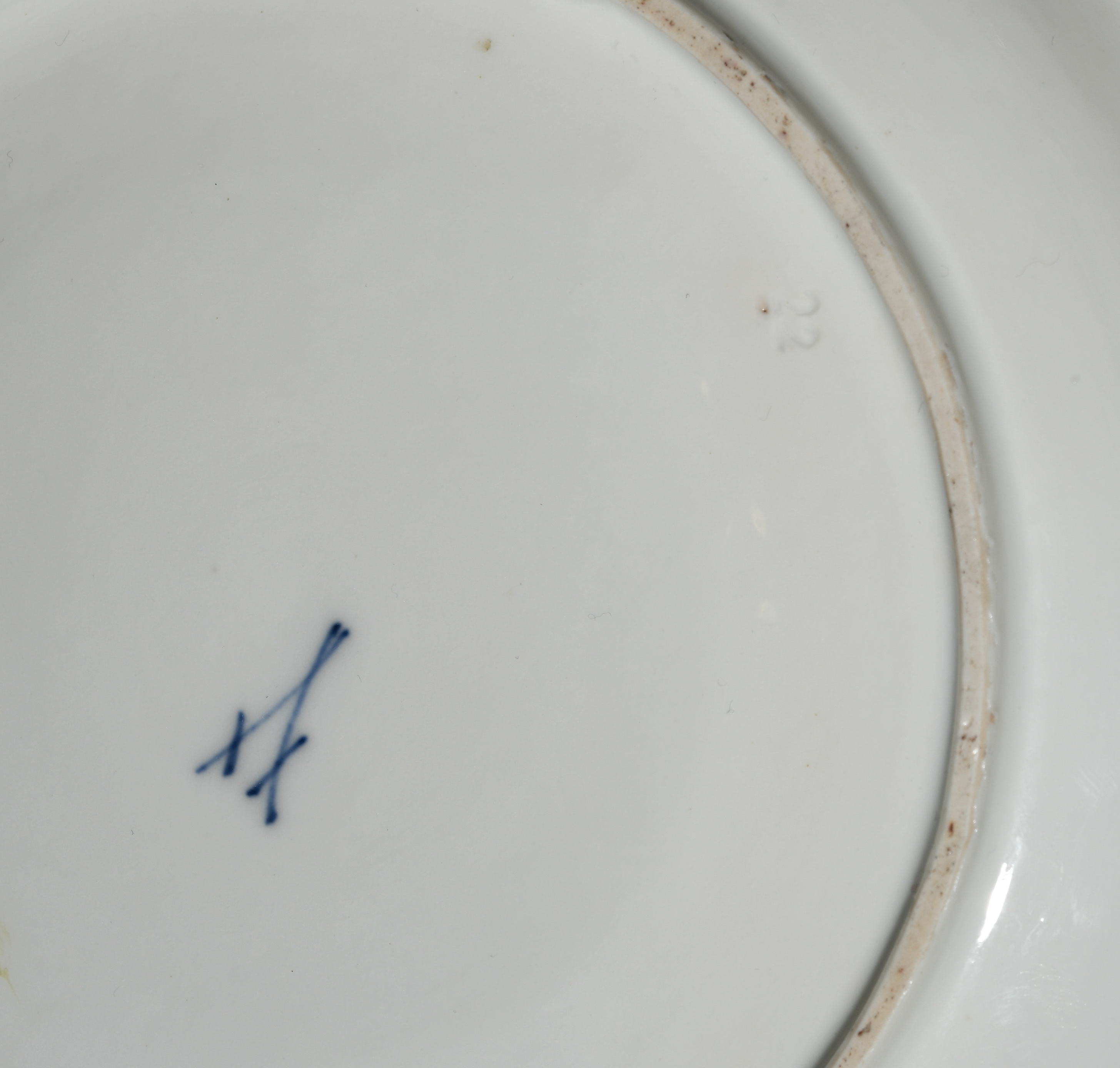 - 1 Henkel repariert. Rand der Unterschale mit alter Reparaturstelle. Vergoldung leicht berieben.