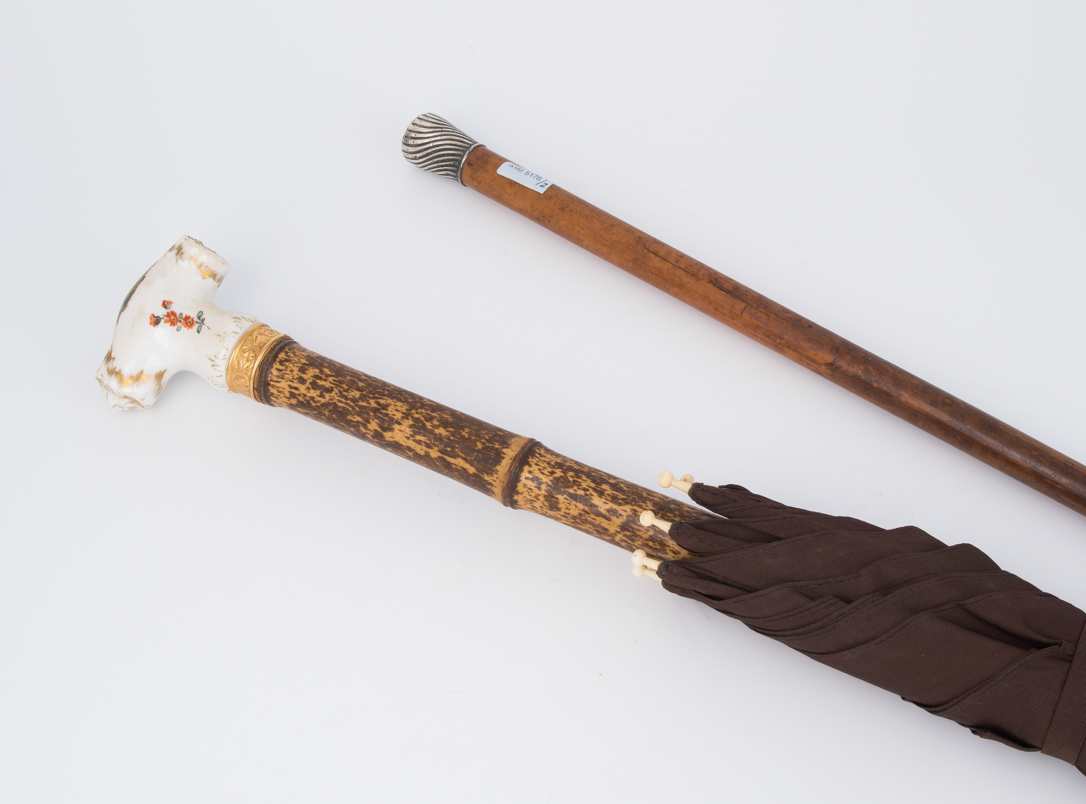 19.Jh./um 1900. Damenschirm aus brauner Seide mit bemaltem Porzellangriff, der Schuss aus Bambusrohr mit Beinzwinge. Spazierstock mit kleinem Silberknauf und einem Makassa-Schuss mit Messingzwinge. L ca. 90 cm.