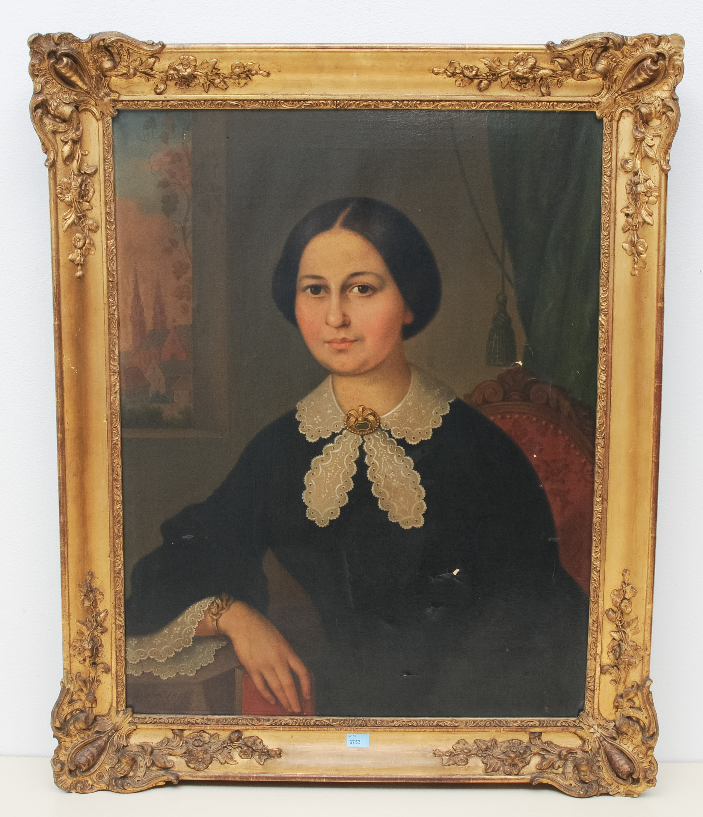 Maria Susanna Merian, in einer Loggia mit Blick auf das Basler Münster sitzend, 1856. Öl auf Leinwand. Unten links signiert und datiert. 68x53 cm.
