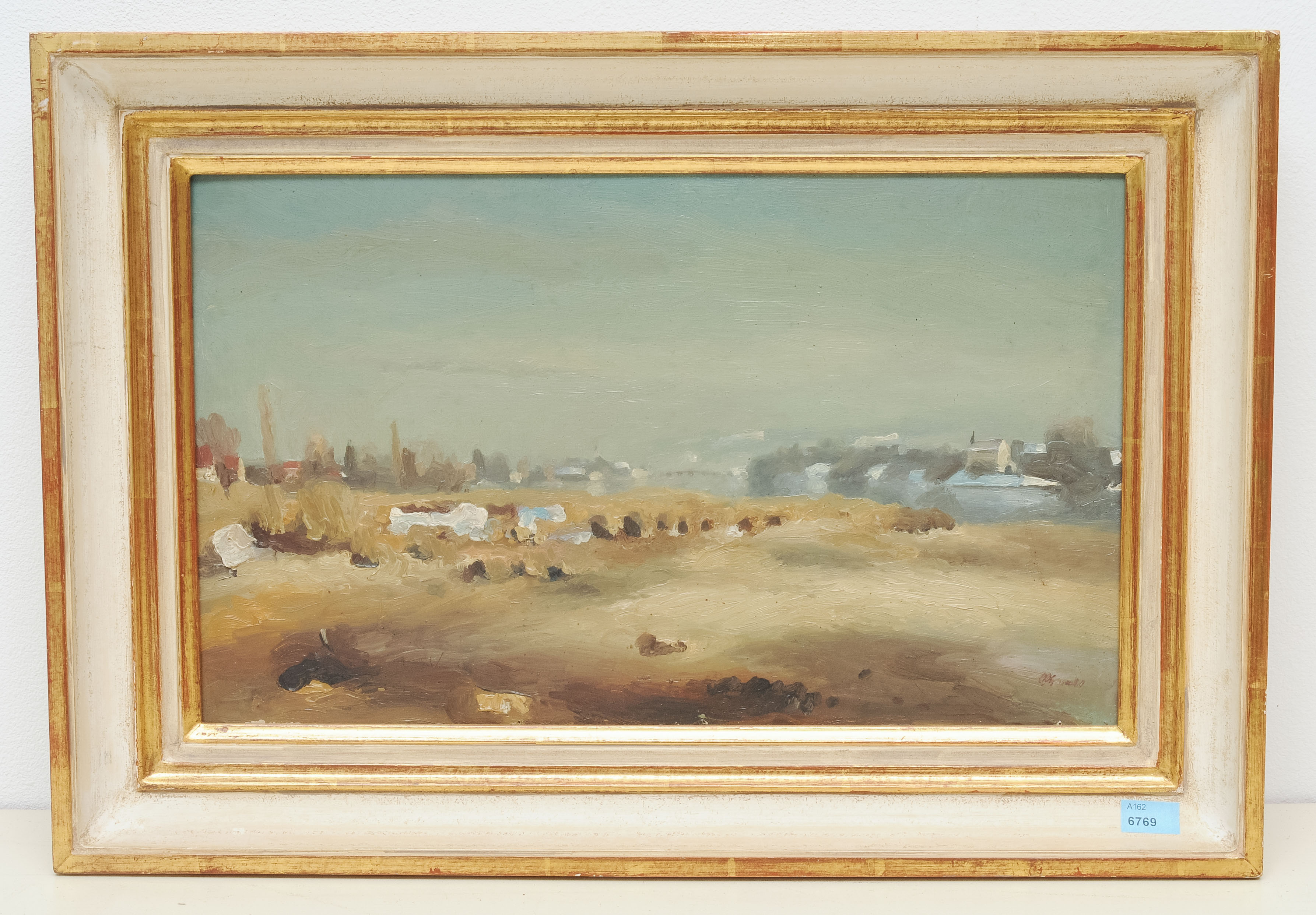 Blick auf Stein am Rhein im Spätwinter. Öl auf Holz. Unten rechts signiert. 25,5x41 cm.