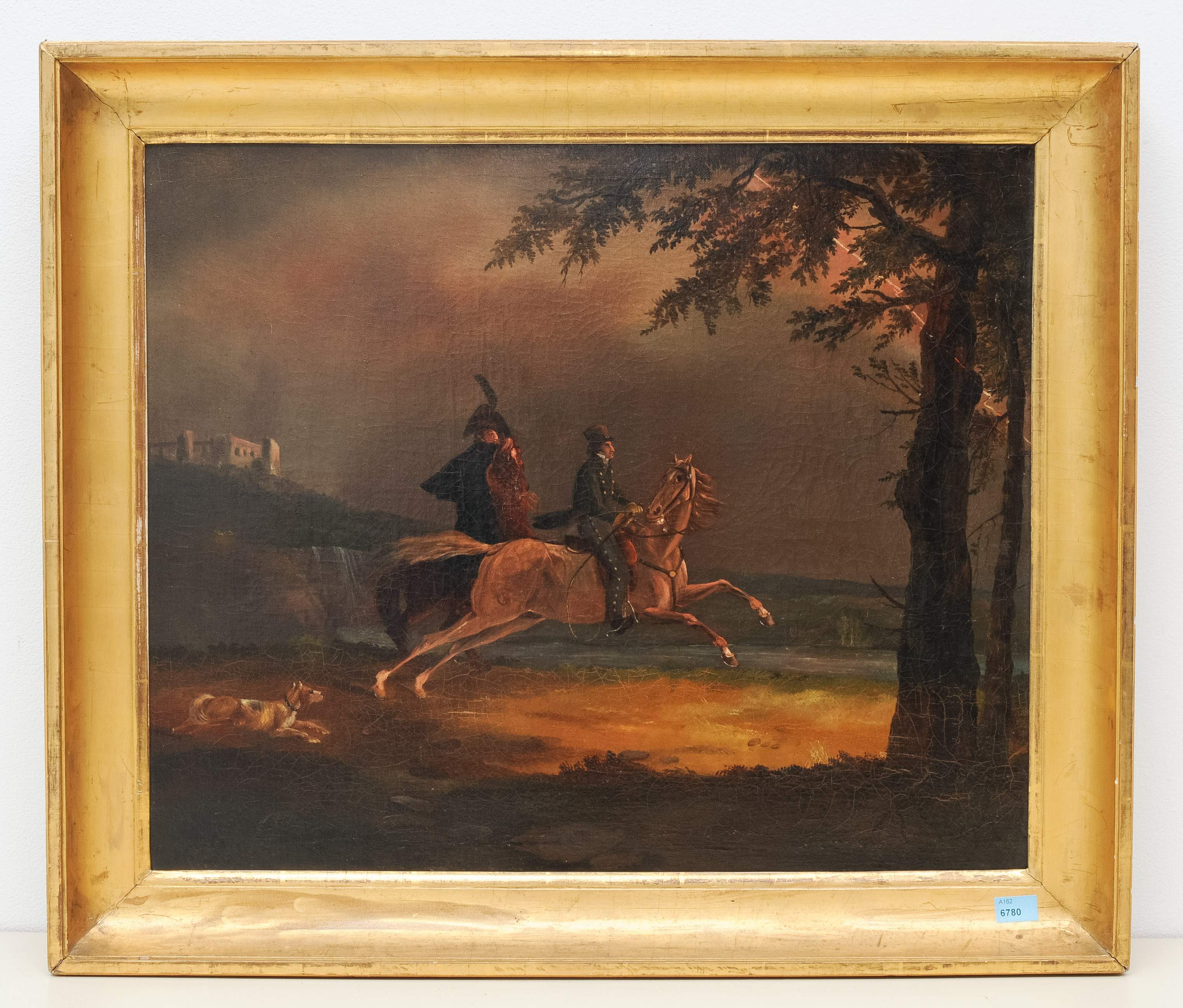 Zwei Reiter in nächtlicher Gewitterlandschaft. Öl auf Leinwand. 43x53 cm.
