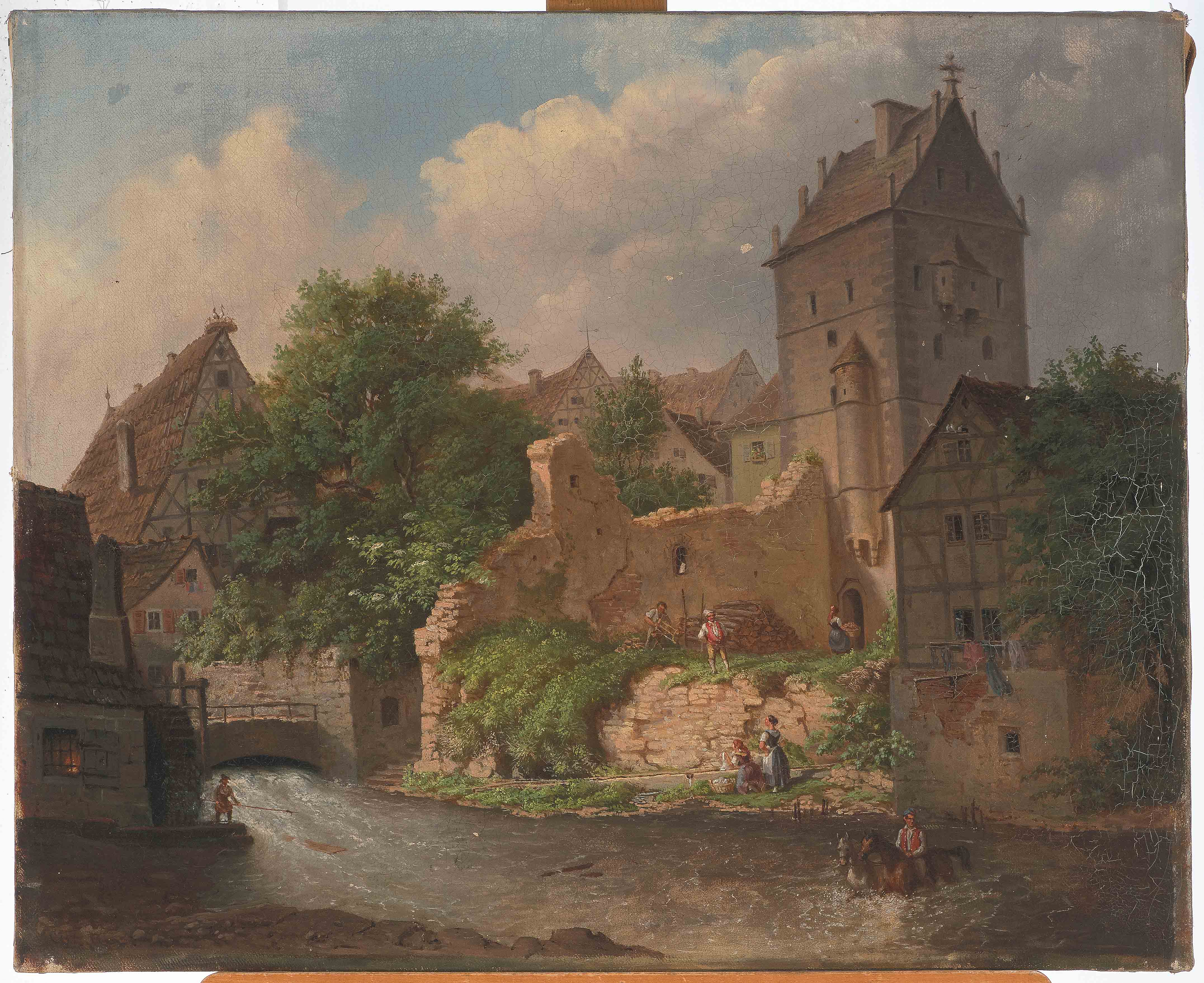 Ansicht einer Stadt mit Turm. Öl auf Leinwand. Unten links signiert. Verso Stempel von Albert Martz, Stuttgart. 55,5x69 cm.