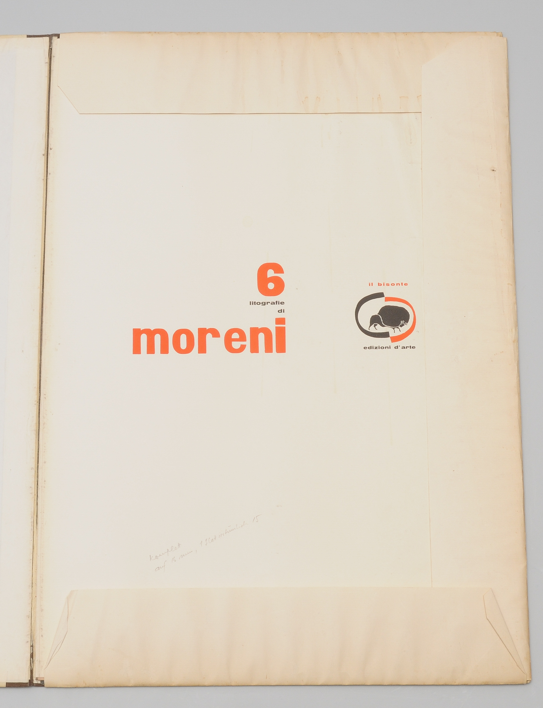 Portfolio «6 lithografie di moreni». 1960. Il bisonte edizione d’arte. 6 Farblithographien.15 bzw. 16/100. Alle signiert. Lose in Kartonportfolio. 66,5x46,5 cm.