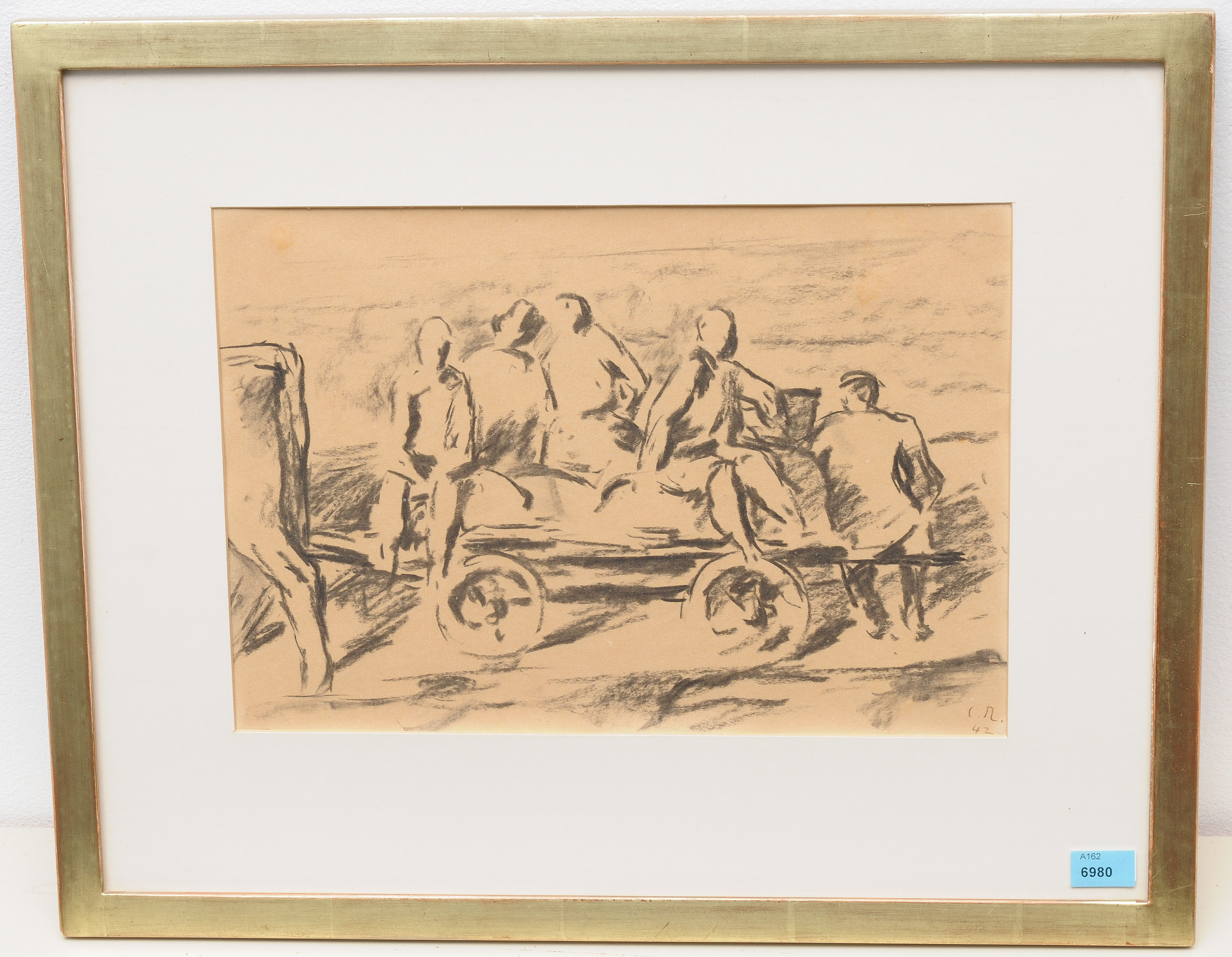 Erntearbeiter. 1942. Kohle auf Papier. Unten rechts monogrammiert und datiert. Lichtmass 20,8x30,2 cm. Gerahmt.