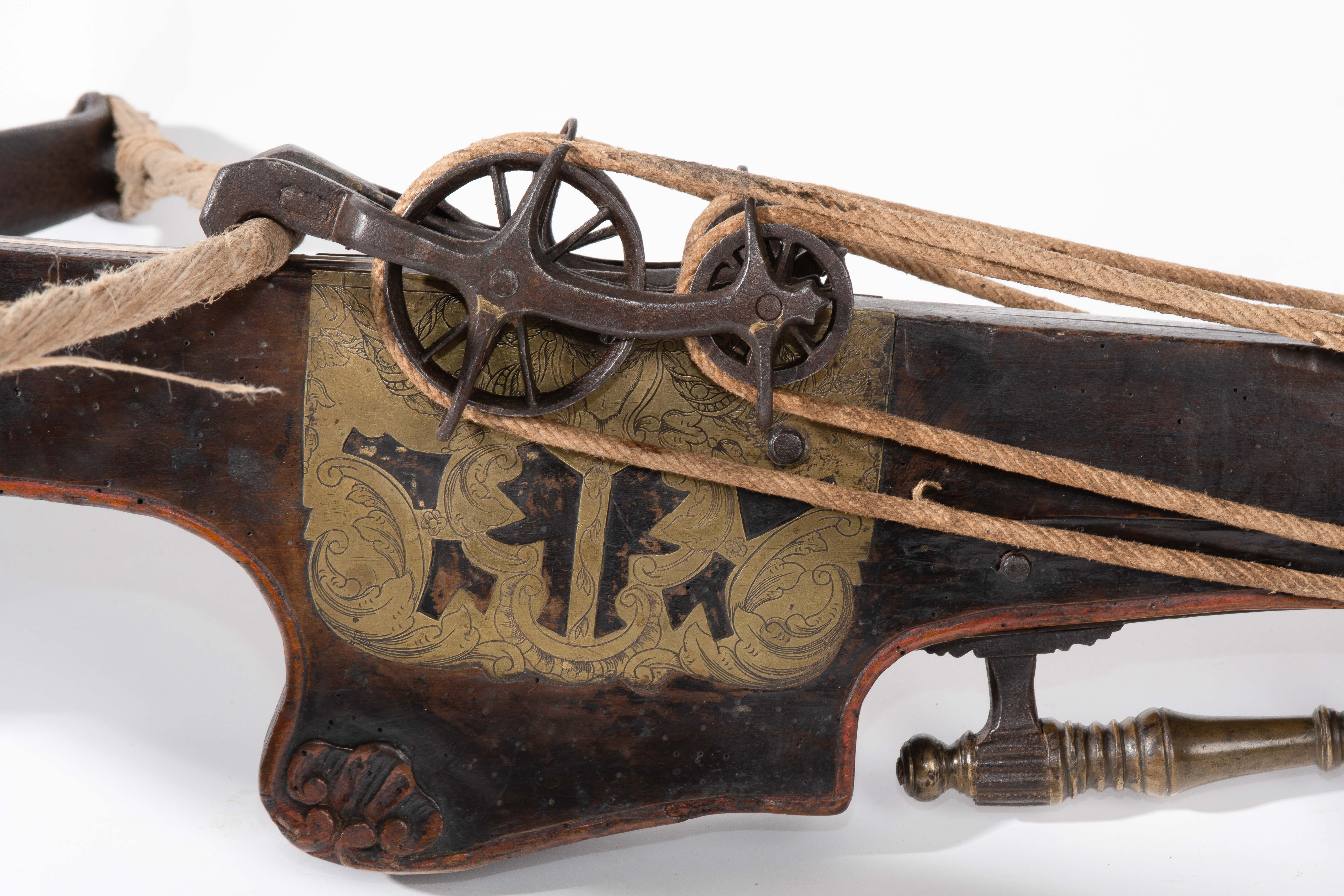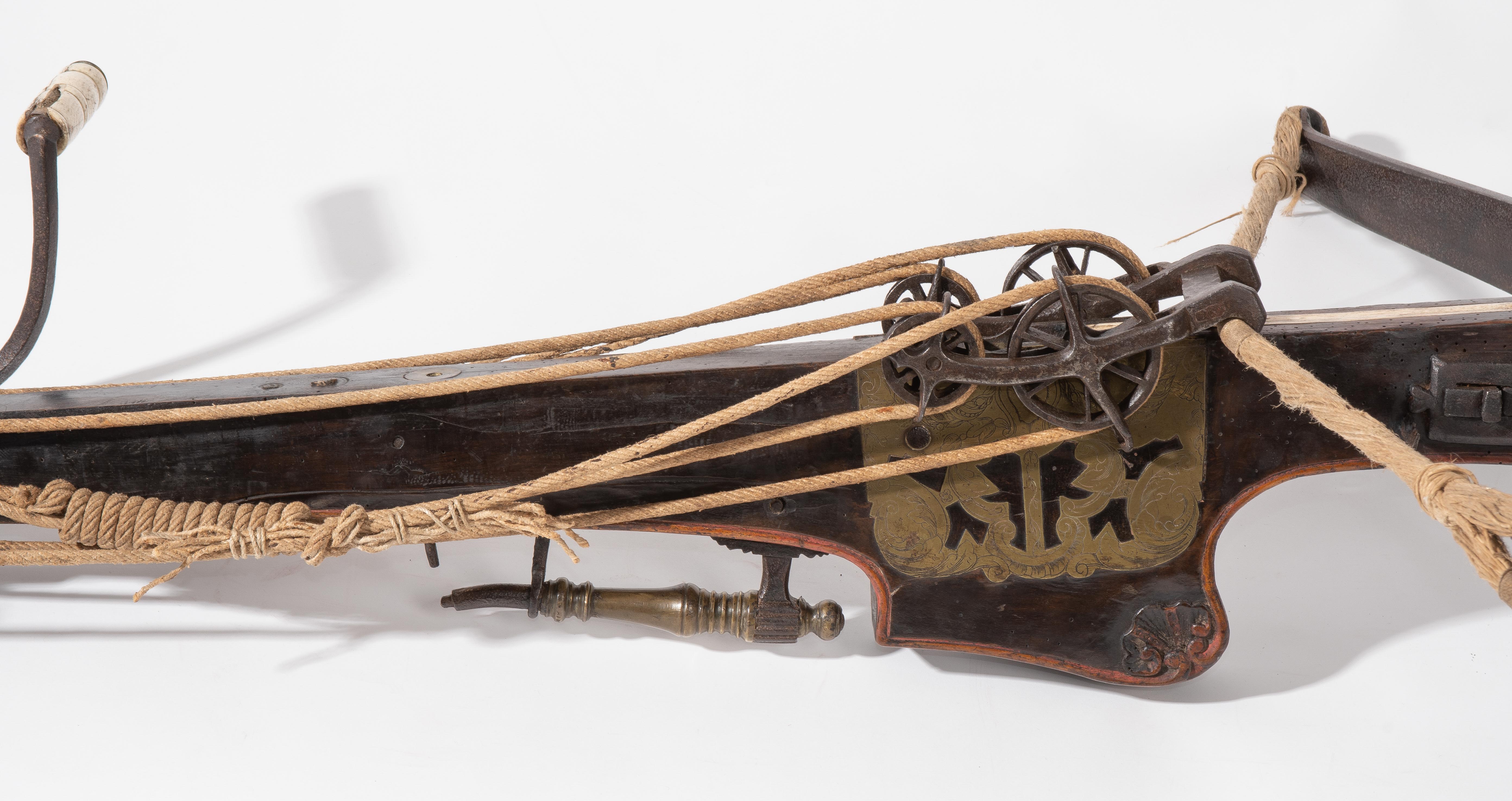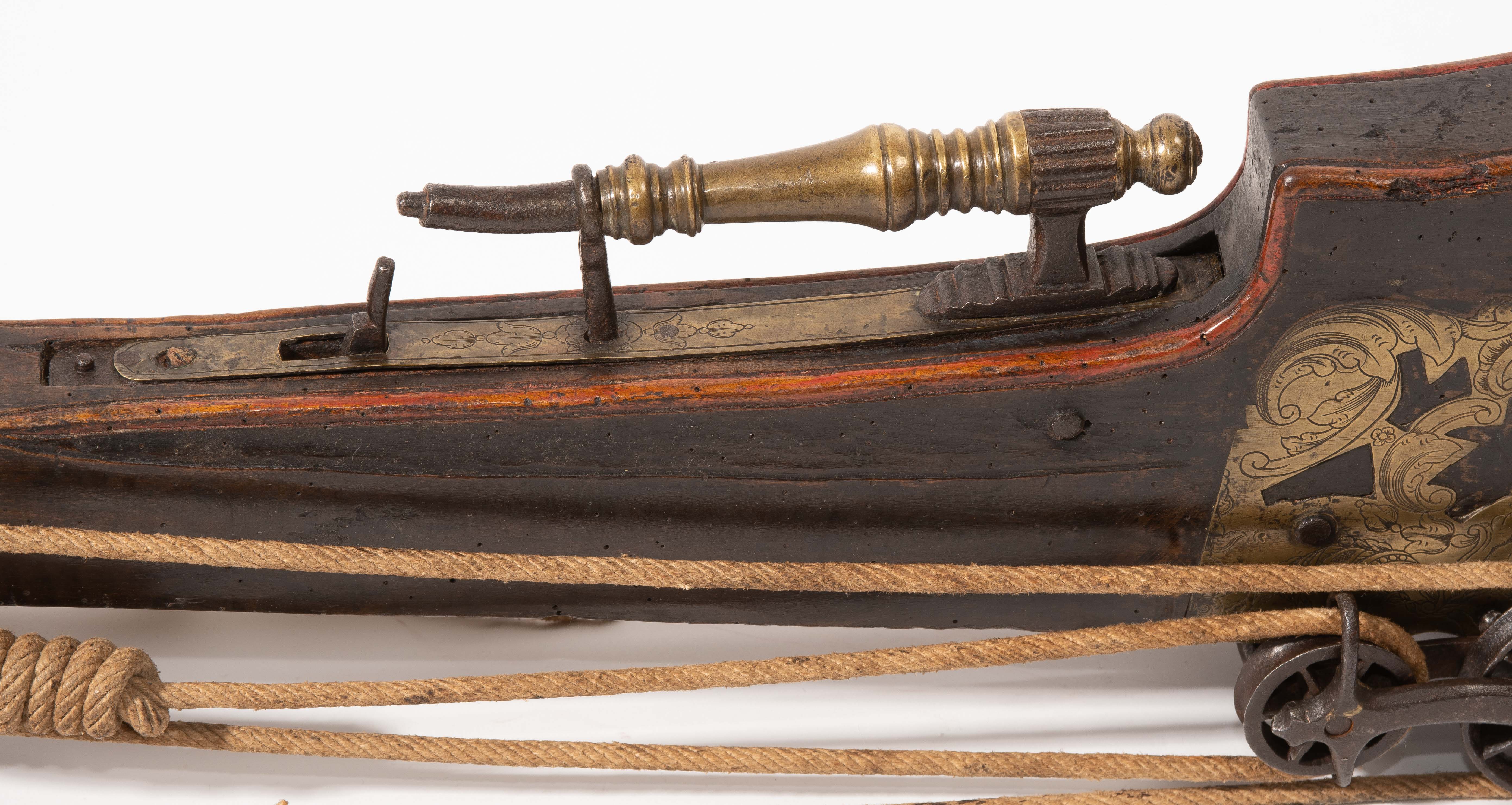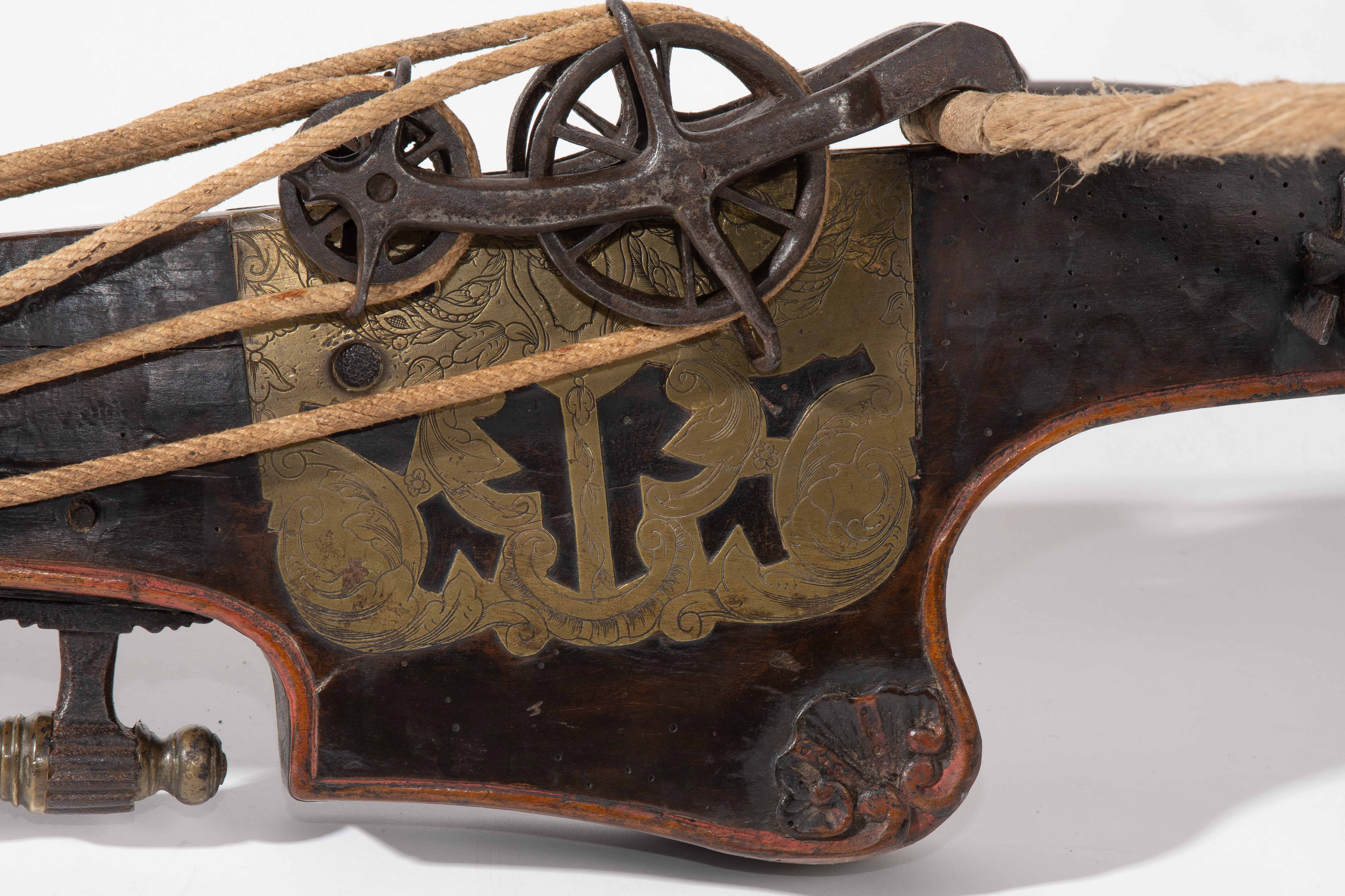 Spanische Niederlande/flämisch, um 1700. Etwas wurmstichige Fruchtholzsäule (L 102 cm) mit eingelegtem Bolzenlager aus Bein, geschnitzter Volutenzier an der Unterseite und zwei symmetrisch floral gravierten Schlossplatten aus Messing. Auf der Oberseite eine messingumrandete Bohrung zur Fixierung eines Visiers. Am Säulenfuss die noch spätgotisch verzierte eiserne Spannkurbel mit Griffstücken aus Bein. Aufwändiger Spannmechanismus mit Doppelkralle und je drei eisernen Umlenkrollen auf beiden Seiten der Säule, sog. "englische Winde"; Spannschnüre alt, aber kaum original. Vor dem Bogen ein eiserner Spannsteigbügel mit zwei Standfüsschen aus Messing. Nuss fehlt, noch 18 cm lang erhaltene, balusterförmig gedrehte Abzugstange aus Messing. Der Stahlbogen ist 78,8 cm lang, Bogenstärke 1,9 cm, ohne Schmiedemarken, wohl im 18./19. Jh. ergänzte Sehne. Eingedenk der wenigen erhaltenen Originalstücke aus dem späten 15./frühen 16. Jh. besonders rare Spätform, vergleichbar den grossen Zweihandschwertern, deren Handhabung noch bis um 1700 gelehrt wurde. G ca. 11 kg. L ohne Winde 109 cm, mit Winde ca. 115 cm.