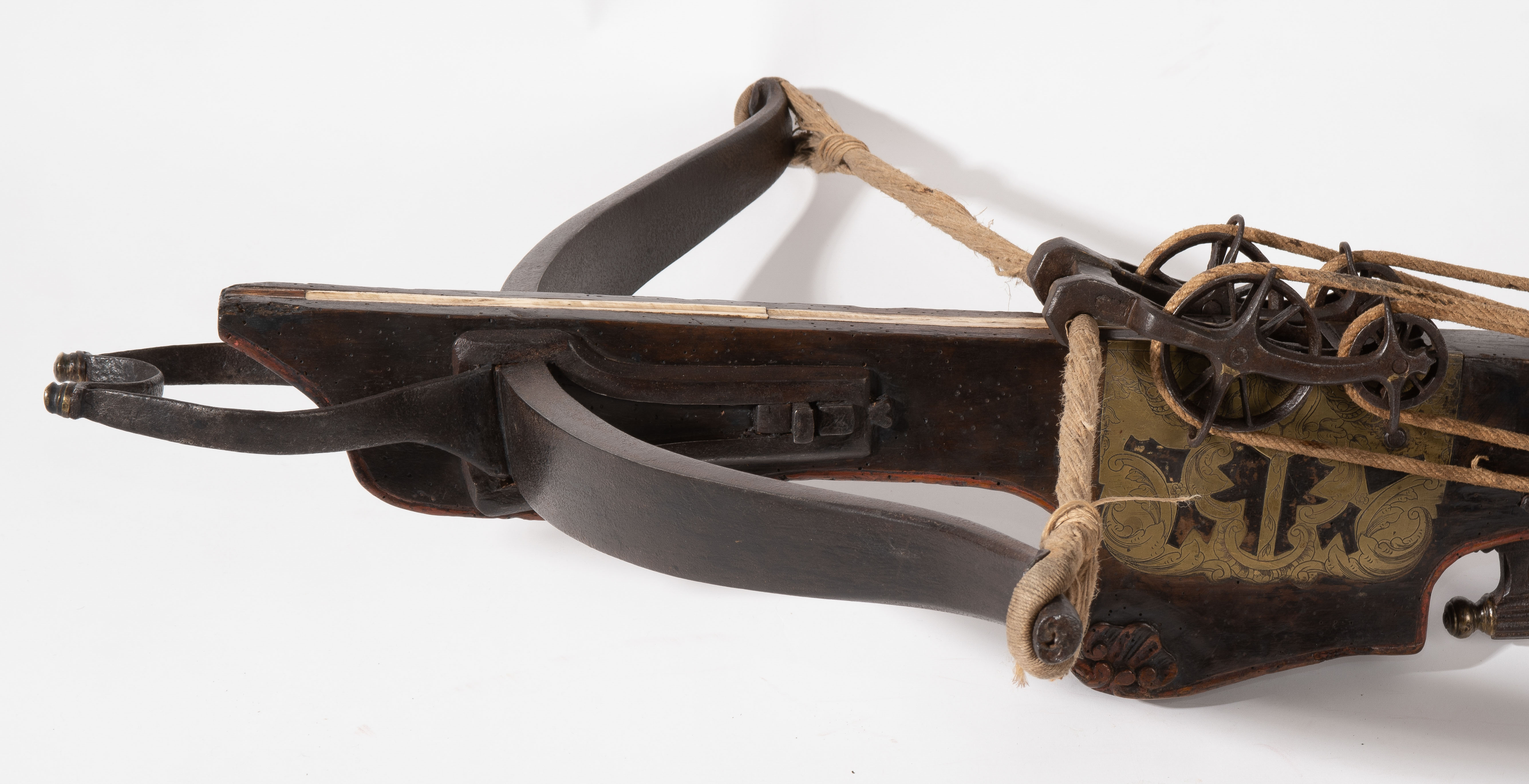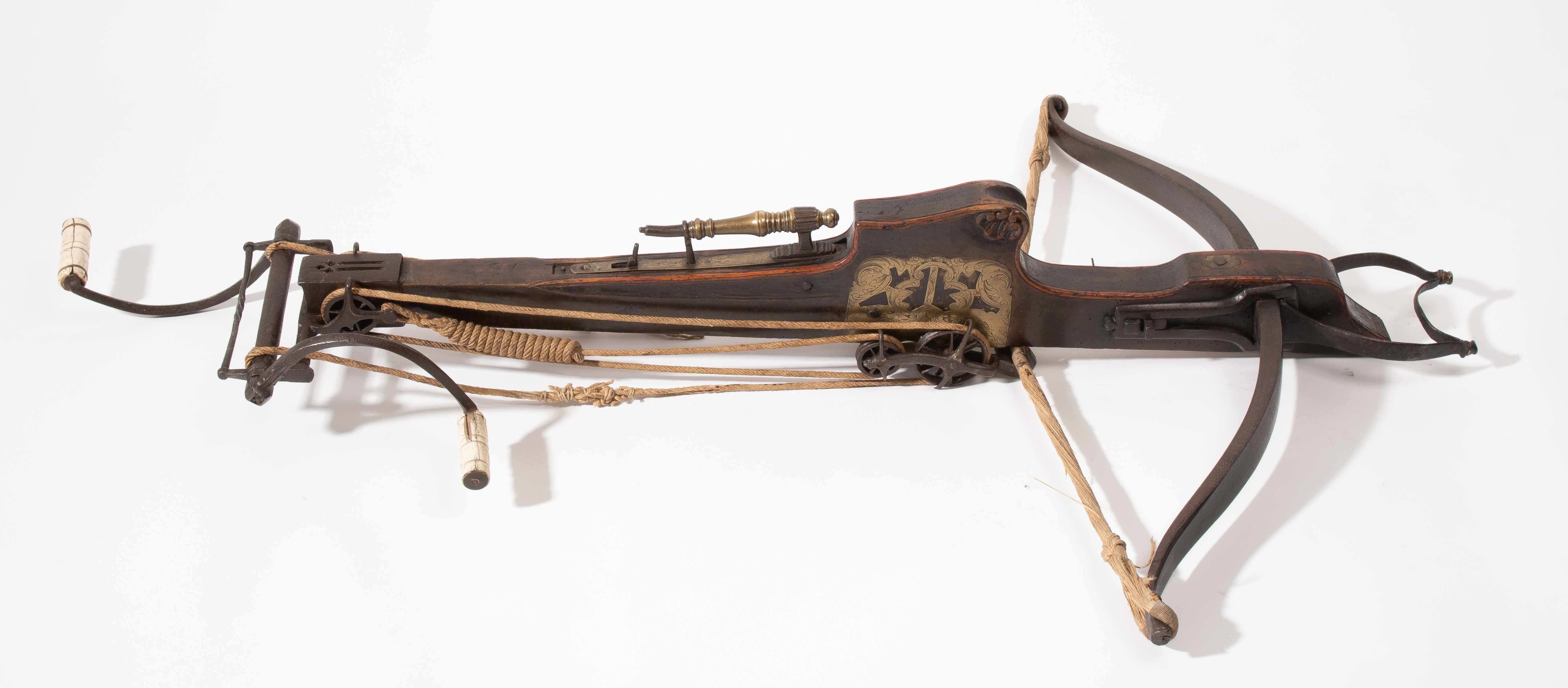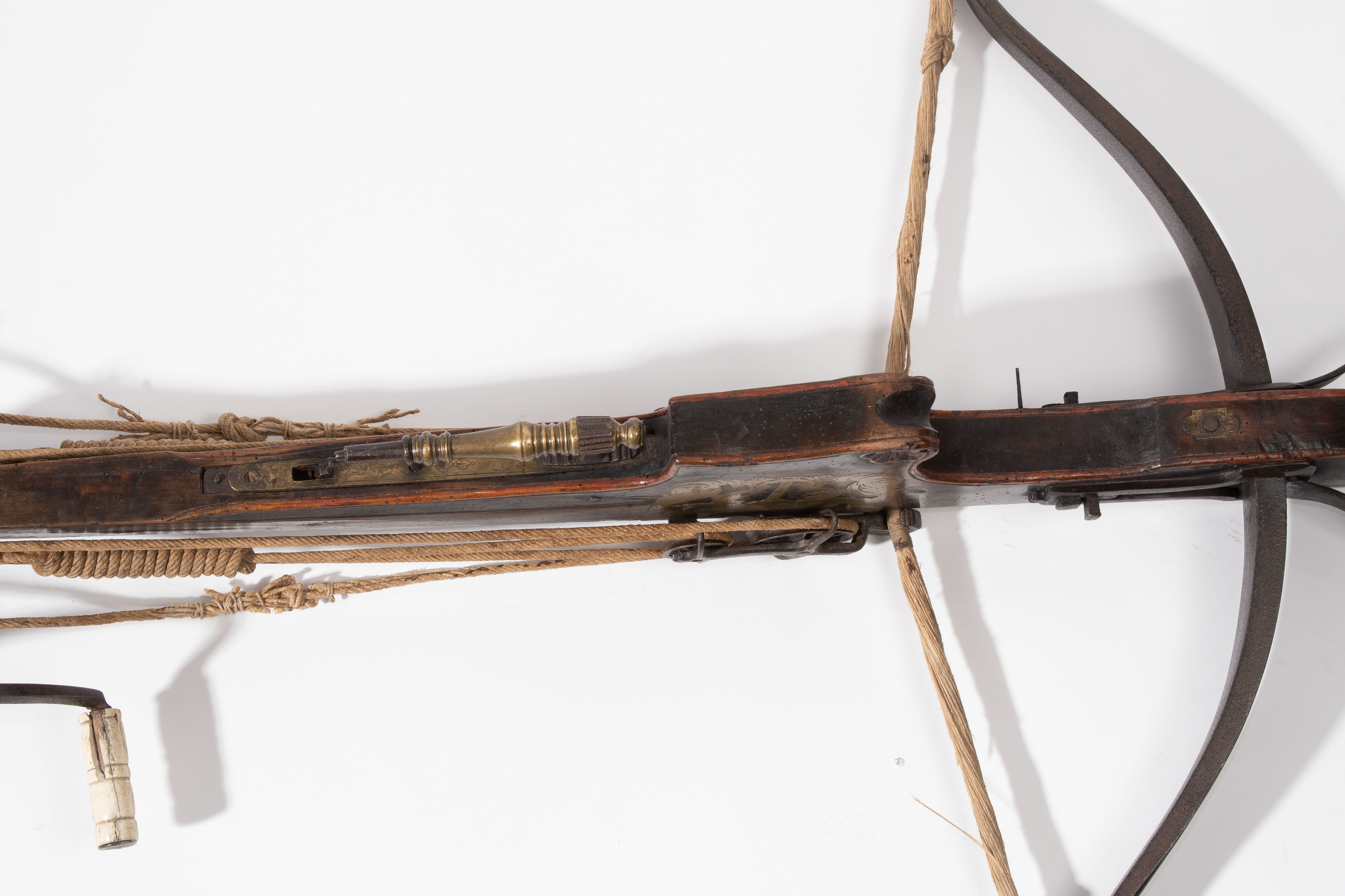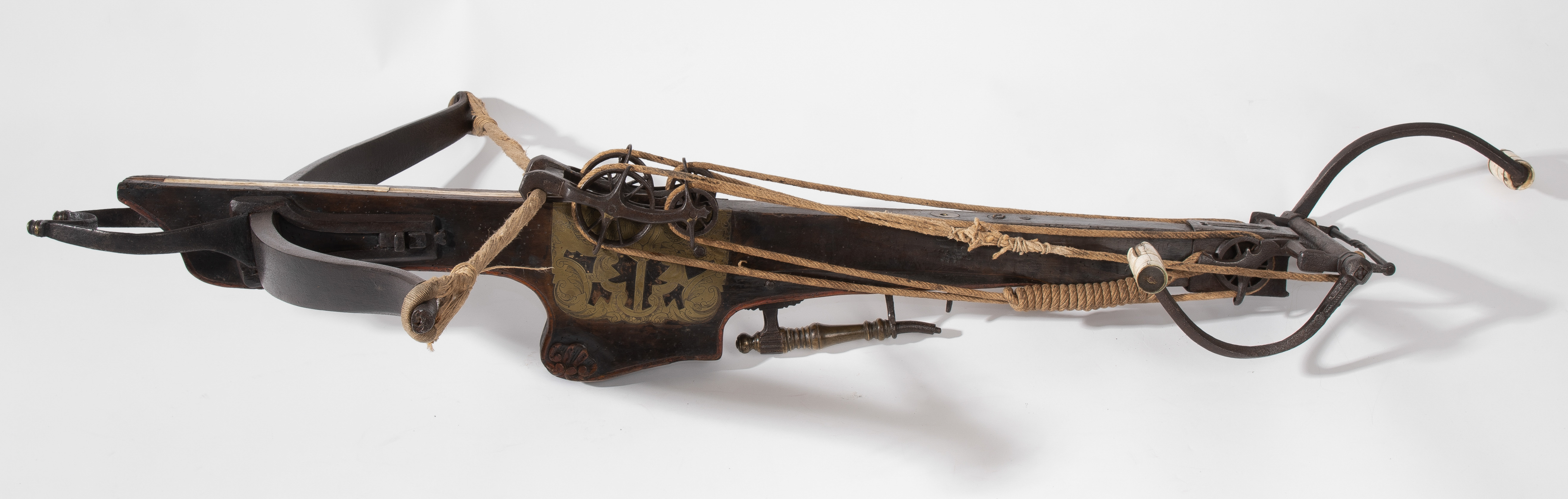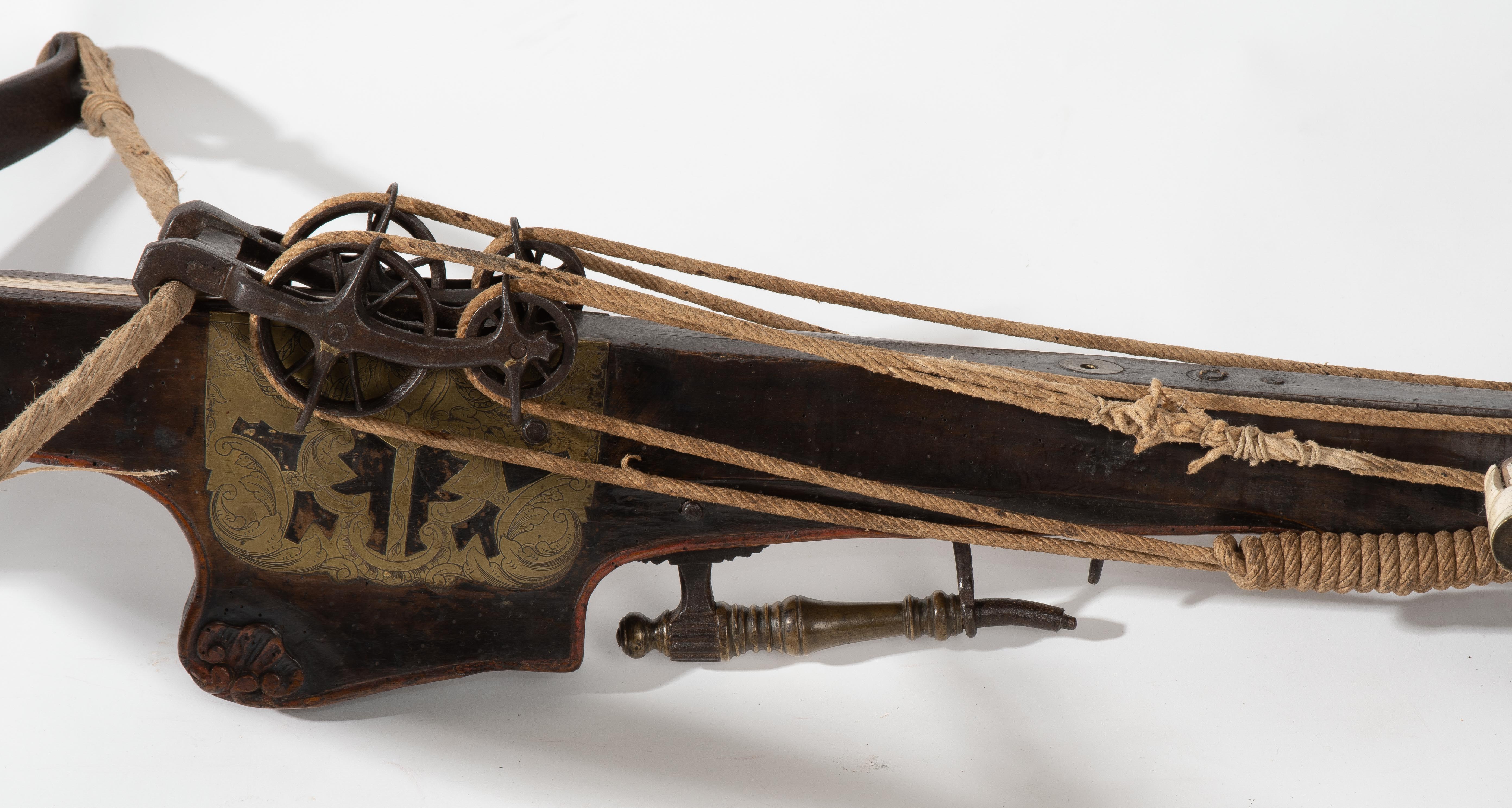 Spanische Niederlande/flämisch, um 1700. Etwas wurmstichige Fruchtholzsäule (L 102 cm) mit eingelegtem Bolzenlager aus Bein, geschnitzter Volutenzier an der Unterseite und zwei symmetrisch floral gravierten Schlossplatten aus Messing. Auf der Oberseite eine messingumrandete Bohrung zur Fixierung eines Visiers. Am Säulenfuss die noch spätgotisch verzierte eiserne Spannkurbel mit Griffstücken aus Bein. Aufwändiger Spannmechanismus mit Doppelkralle und je drei eisernen Umlenkrollen auf beiden Seiten der Säule, sog. "englische Winde"; Spannschnüre alt, aber kaum original. Vor dem Bogen ein eiserner Spannsteigbügel mit zwei Standfüsschen aus Messing. Nuss fehlt, noch 18 cm lang erhaltene, balusterförmig gedrehte Abzugstange aus Messing. Der Stahlbogen ist 78,8 cm lang, Bogenstärke 1,9 cm, ohne Schmiedemarken, wohl im 18./19. Jh. ergänzte Sehne. Eingedenk der wenigen erhaltenen Originalstücke aus dem späten 15./frühen 16. Jh. besonders rare Spätform, vergleichbar den grossen Zweihandschwertern, deren Handhabung noch bis um 1700 gelehrt wurde. G ca. 11 kg. L ohne Winde 109 cm, mit Winde ca. 115 cm.
