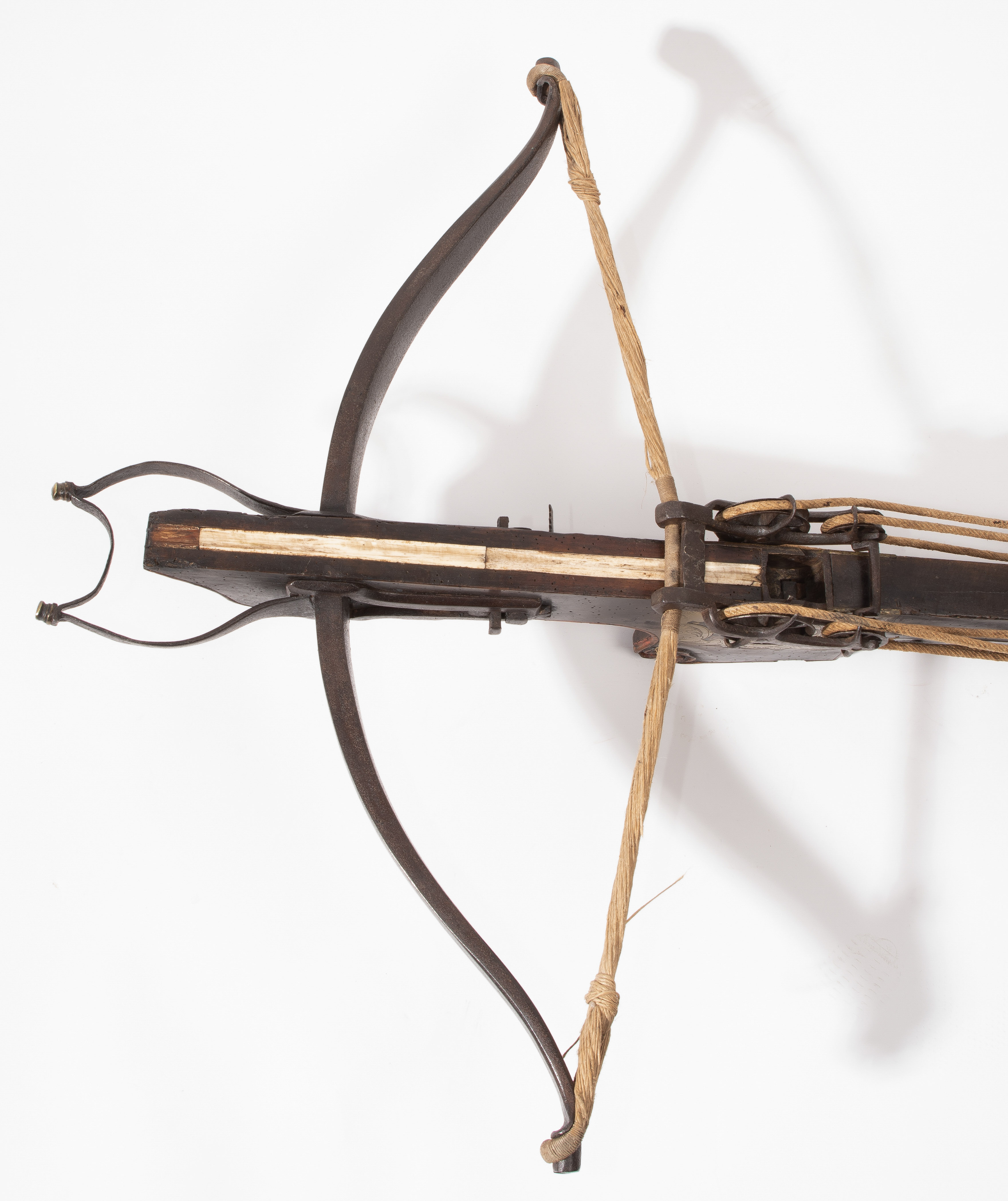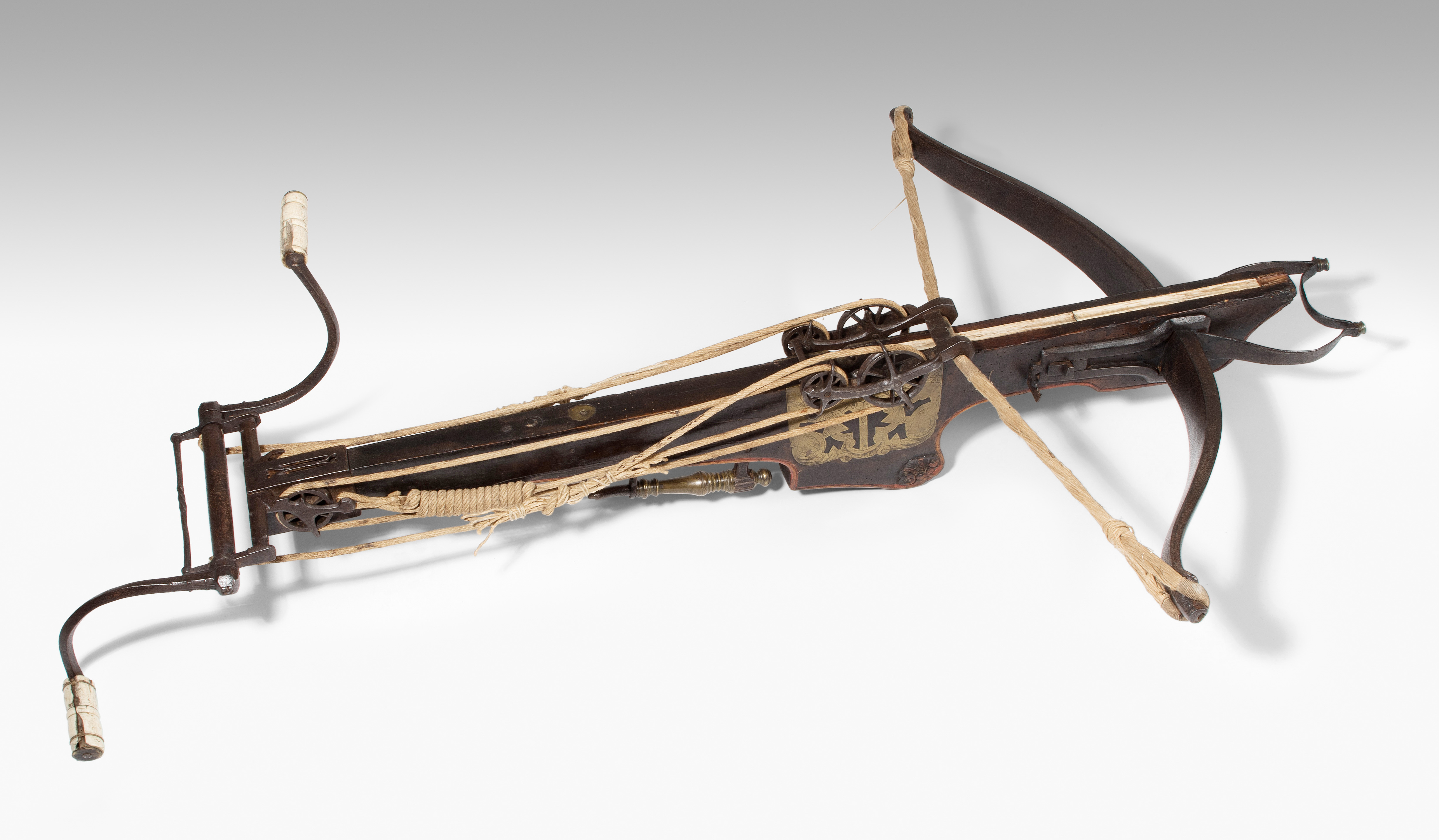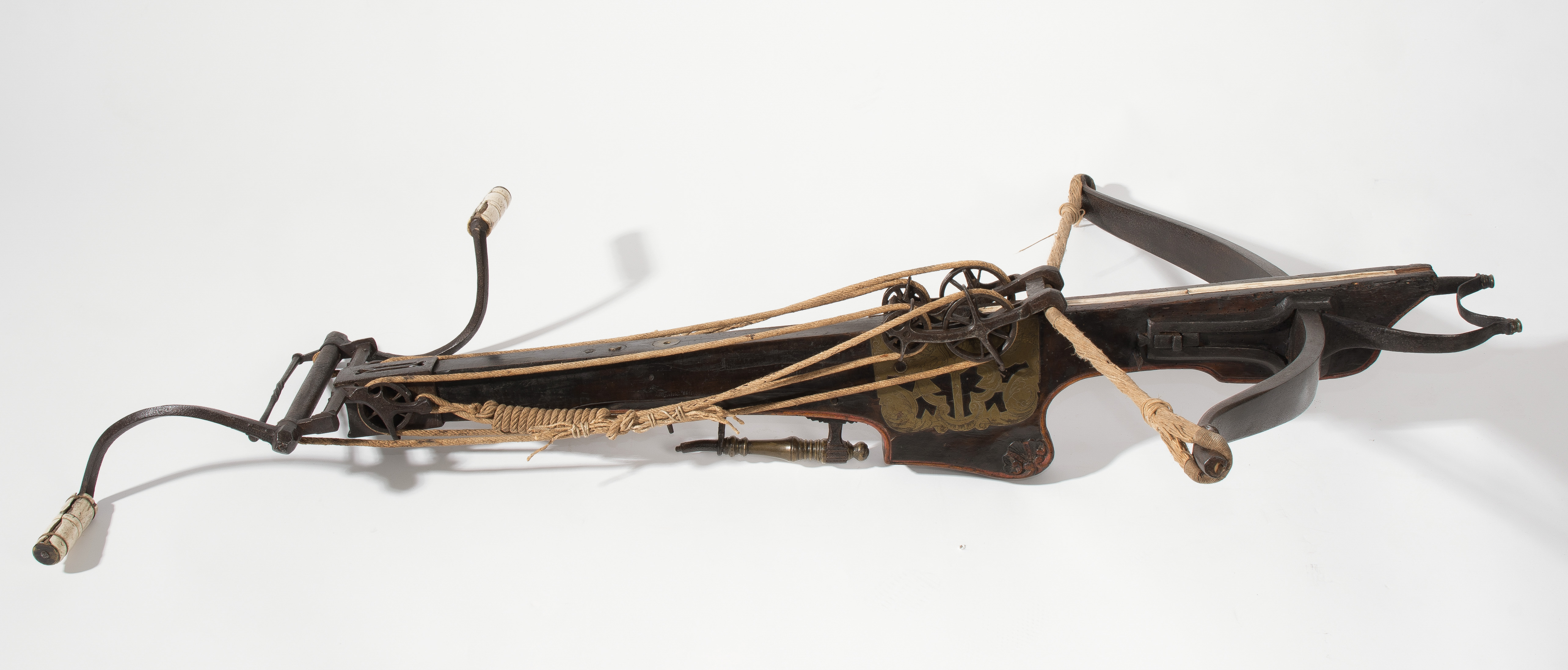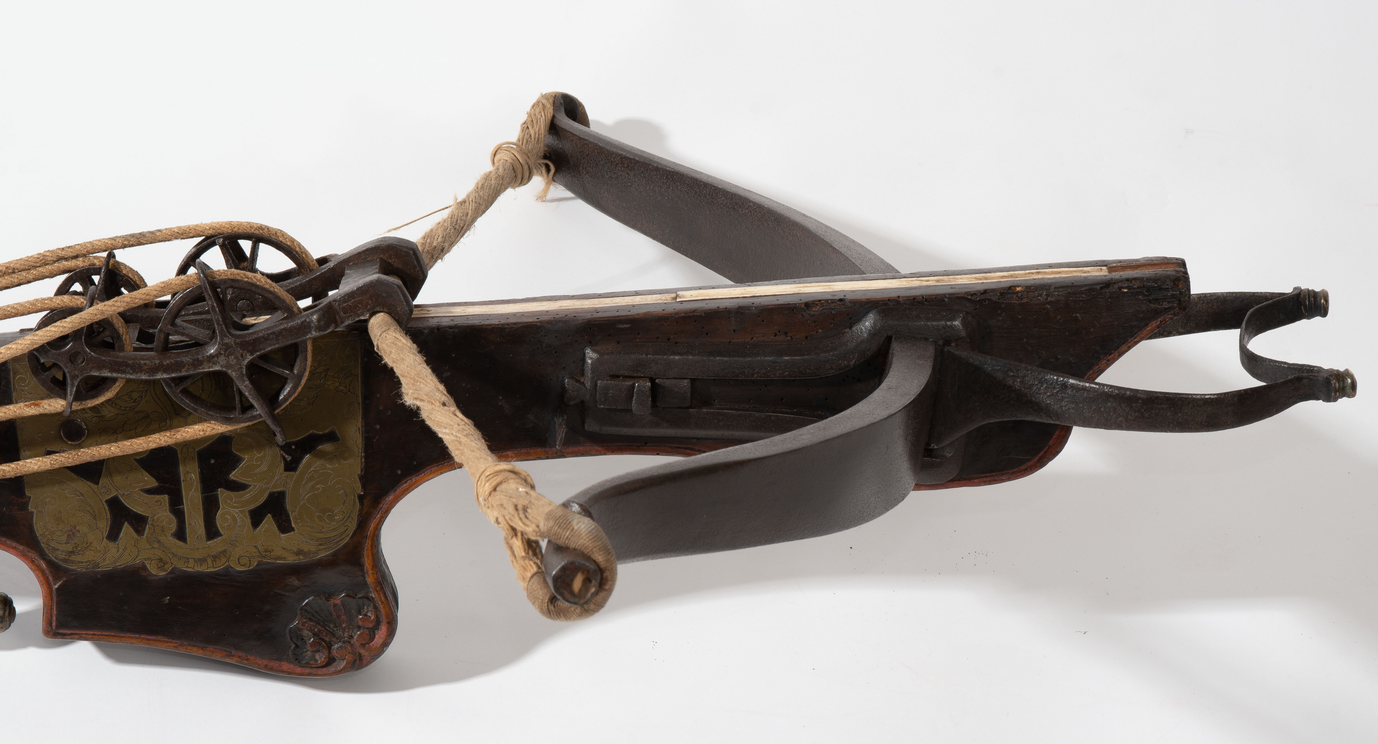 Spanische Niederlande/flämisch, um 1700. Etwas wurmstichige Fruchtholzsäule (L 102 cm) mit eingelegtem Bolzenlager aus Bein, geschnitzter Volutenzier an der Unterseite und zwei symmetrisch floral gravierten Schlossplatten aus Messing. Auf der Oberseite eine messingumrandete Bohrung zur Fixierung eines Visiers. Am Säulenfuss die noch spätgotisch verzierte eiserne Spannkurbel mit Griffstücken aus Bein. Aufwändiger Spannmechanismus mit Doppelkralle und je drei eisernen Umlenkrollen auf beiden Seiten der Säule, sog. "englische Winde"; Spannschnüre alt, aber kaum original. Vor dem Bogen ein eiserner Spannsteigbügel mit zwei Standfüsschen aus Messing. Nuss fehlt, noch 18 cm lang erhaltene, balusterförmig gedrehte Abzugstange aus Messing. Der Stahlbogen ist 78,8 cm lang, Bogenstärke 1,9 cm, ohne Schmiedemarken, wohl im 18./19. Jh. ergänzte Sehne. Eingedenk der wenigen erhaltenen Originalstücke aus dem späten 15./frühen 16. Jh. besonders rare Spätform, vergleichbar den grossen Zweihandschwertern, deren Handhabung noch bis um 1700 gelehrt wurde. G ca. 11 kg. L ohne Winde 109 cm, mit Winde ca. 115 cm.