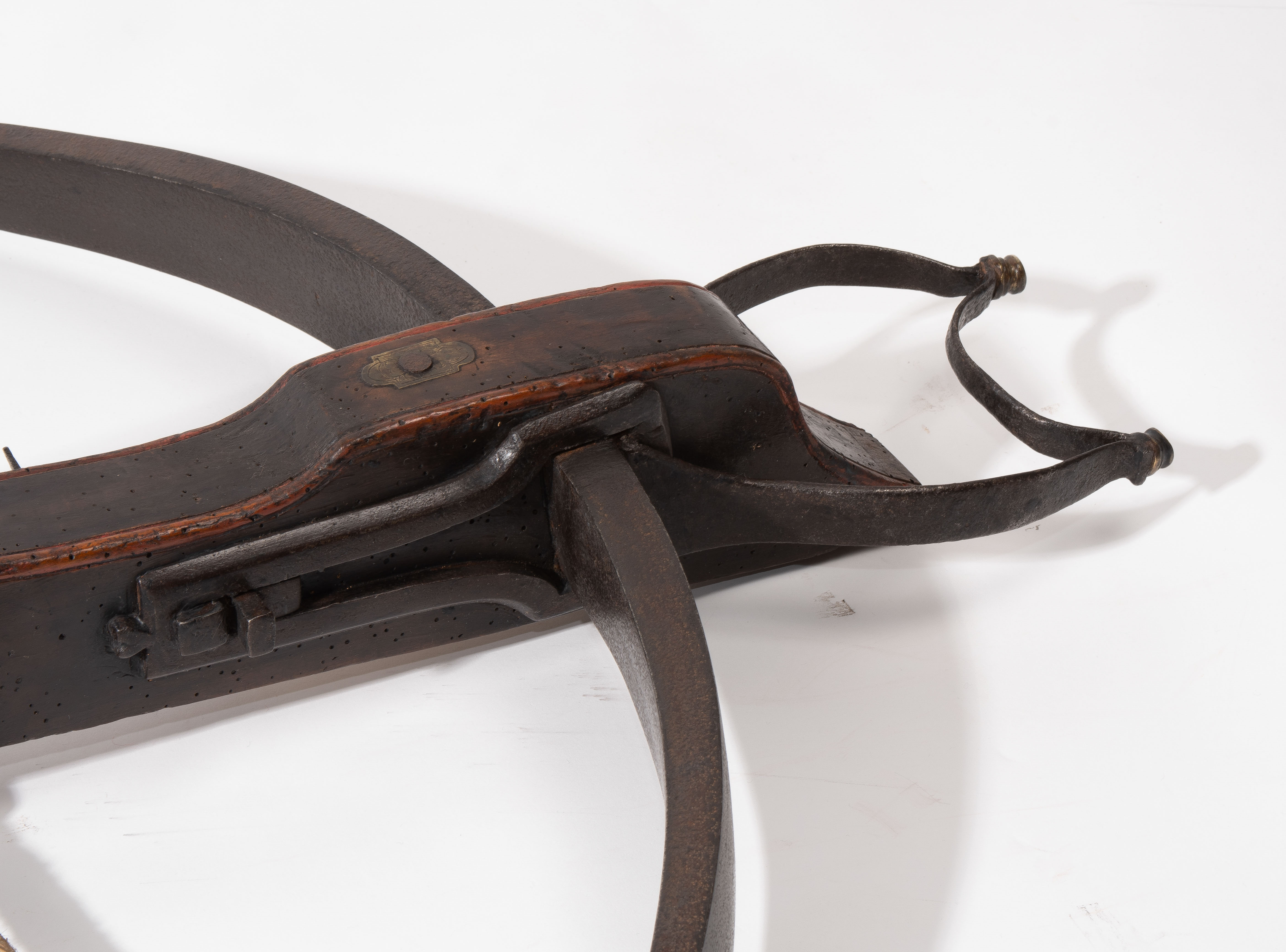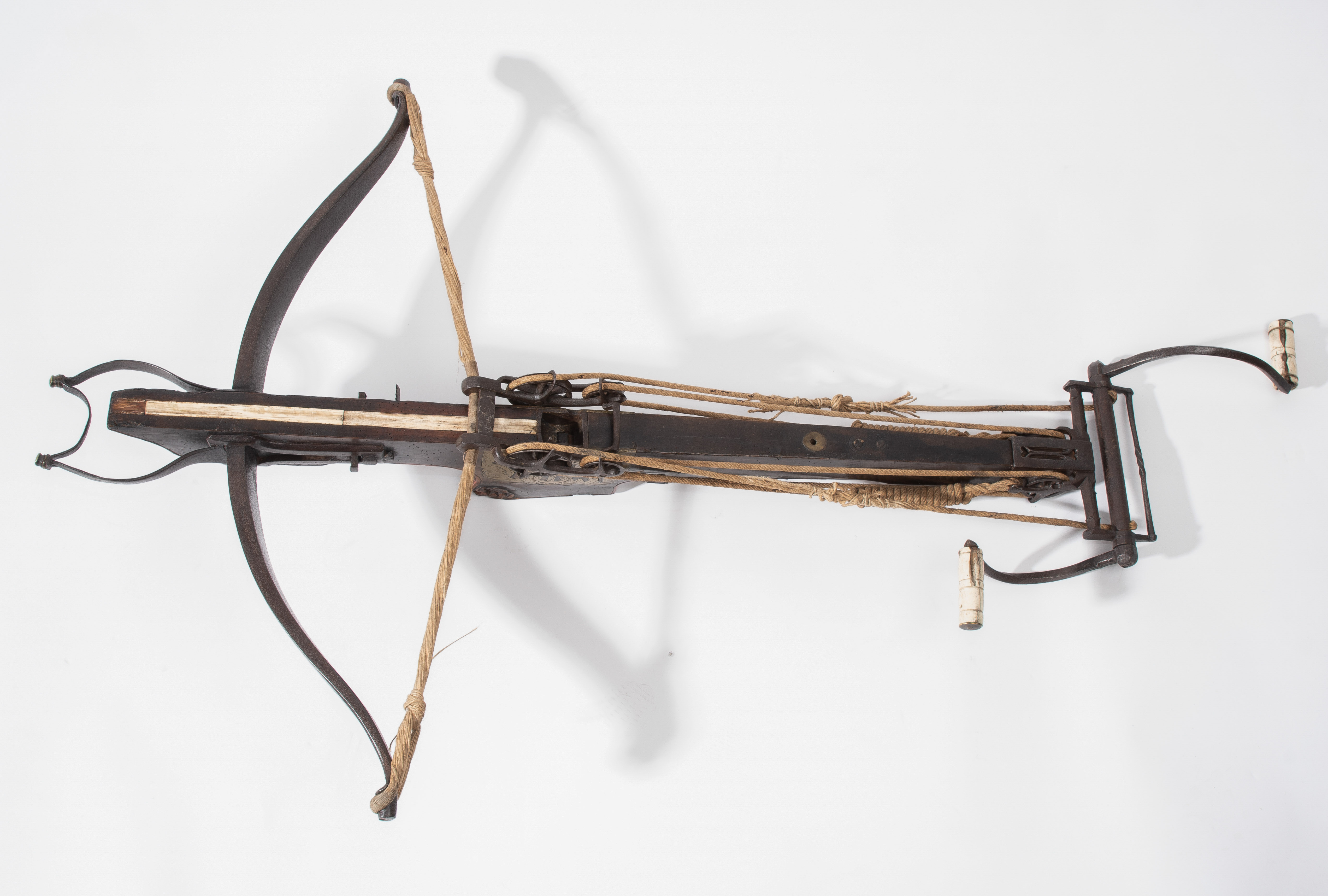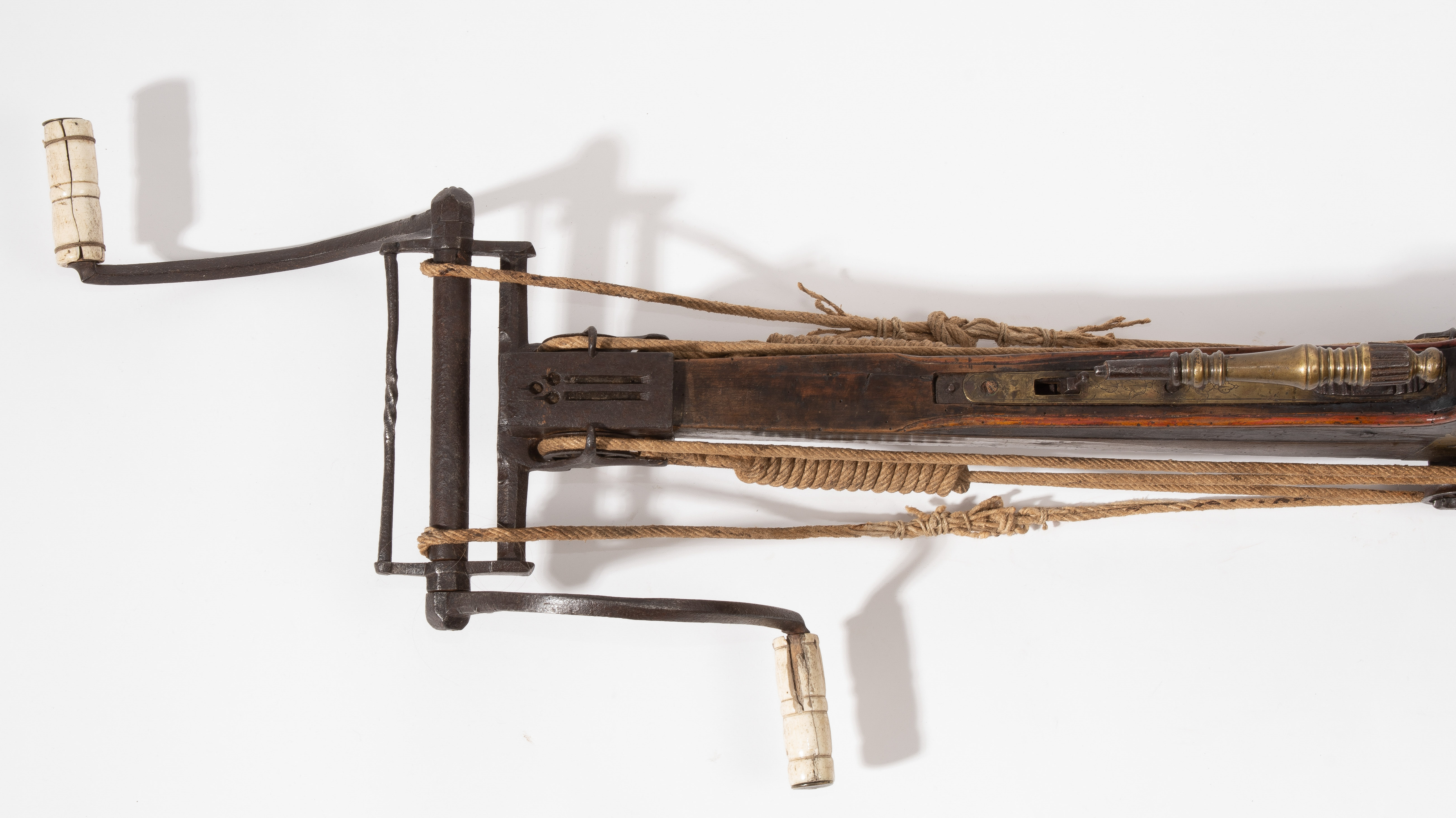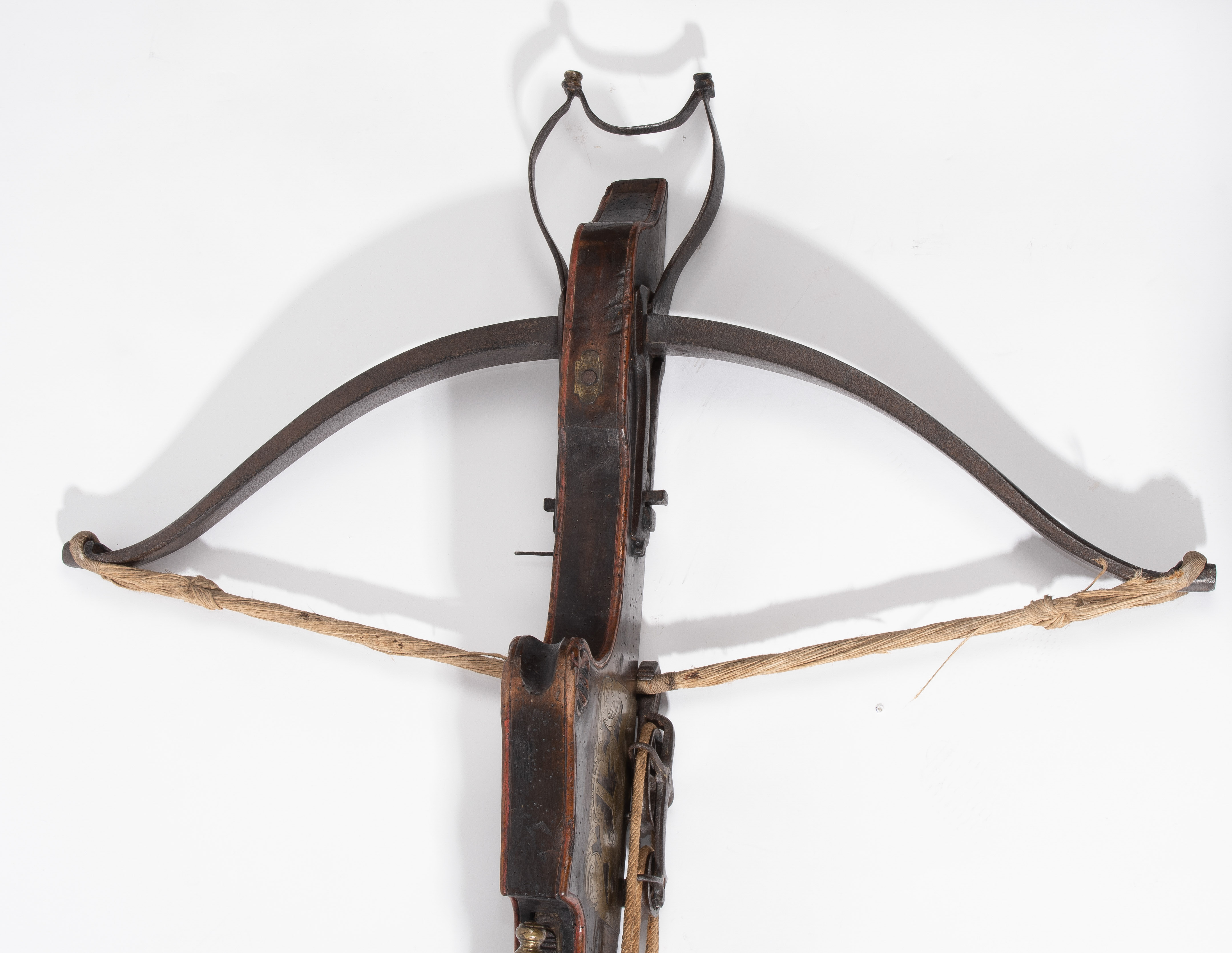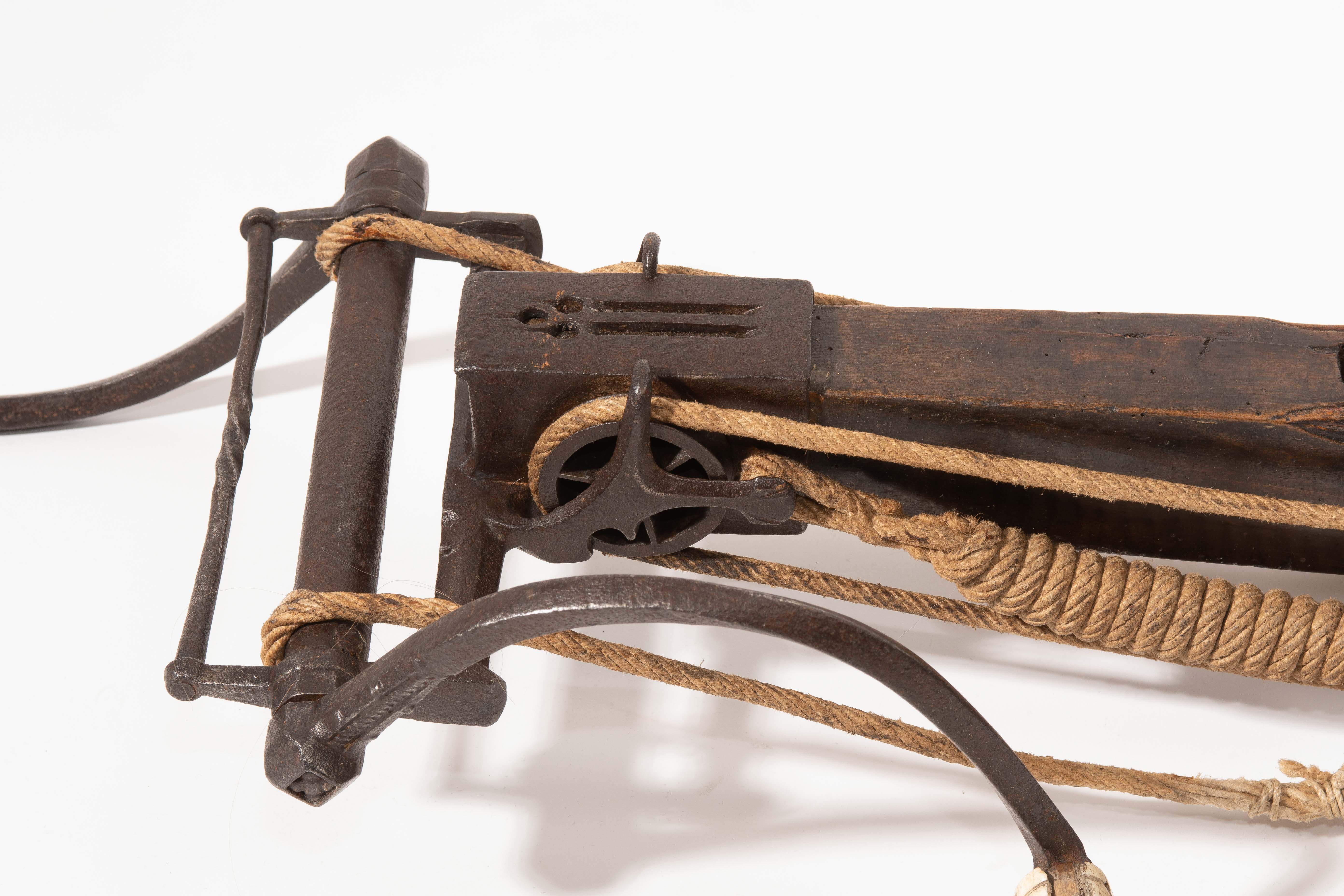 Spanische Niederlande/flämisch, um 1700. Etwas wurmstichige Fruchtholzsäule (L 102 cm) mit eingelegtem Bolzenlager aus Bein, geschnitzter Volutenzier an der Unterseite und zwei symmetrisch floral gravierten Schlossplatten aus Messing. Auf der Oberseite eine messingumrandete Bohrung zur Fixierung eines Visiers. Am Säulenfuss die noch spätgotisch verzierte eiserne Spannkurbel mit Griffstücken aus Bein. Aufwändiger Spannmechanismus mit Doppelkralle und je drei eisernen Umlenkrollen auf beiden Seiten der Säule, sog. "englische Winde"; Spannschnüre alt, aber kaum original. Vor dem Bogen ein eiserner Spannsteigbügel mit zwei Standfüsschen aus Messing. Nuss fehlt, noch 18 cm lang erhaltene, balusterförmig gedrehte Abzugstange aus Messing. Der Stahlbogen ist 78,8 cm lang, Bogenstärke 1,9 cm, ohne Schmiedemarken, wohl im 18./19. Jh. ergänzte Sehne. Eingedenk der wenigen erhaltenen Originalstücke aus dem späten 15./frühen 16. Jh. besonders rare Spätform, vergleichbar den grossen Zweihandschwertern, deren Handhabung noch bis um 1700 gelehrt wurde. G ca. 11 kg. L ohne Winde 109 cm, mit Winde ca. 115 cm.