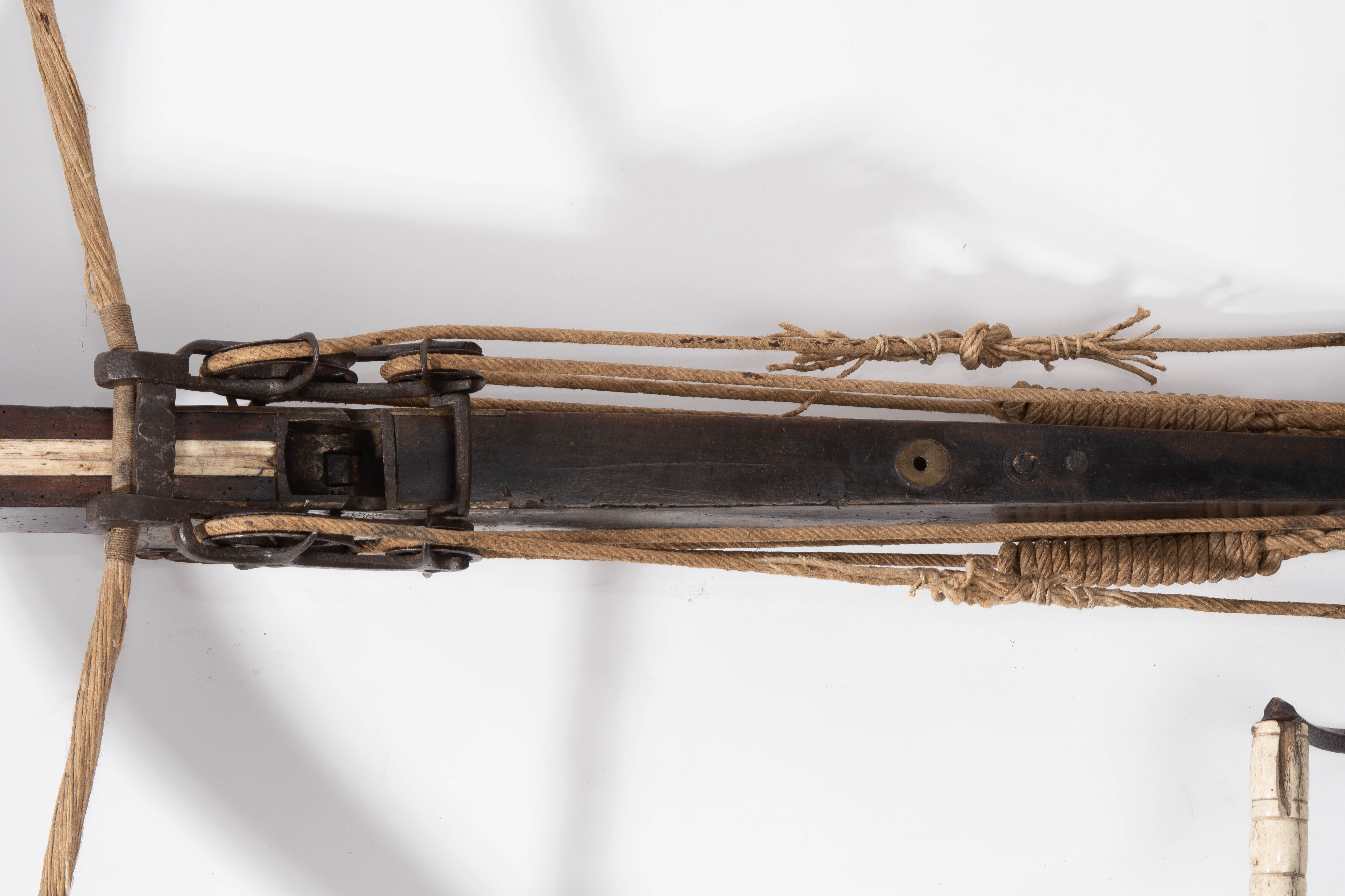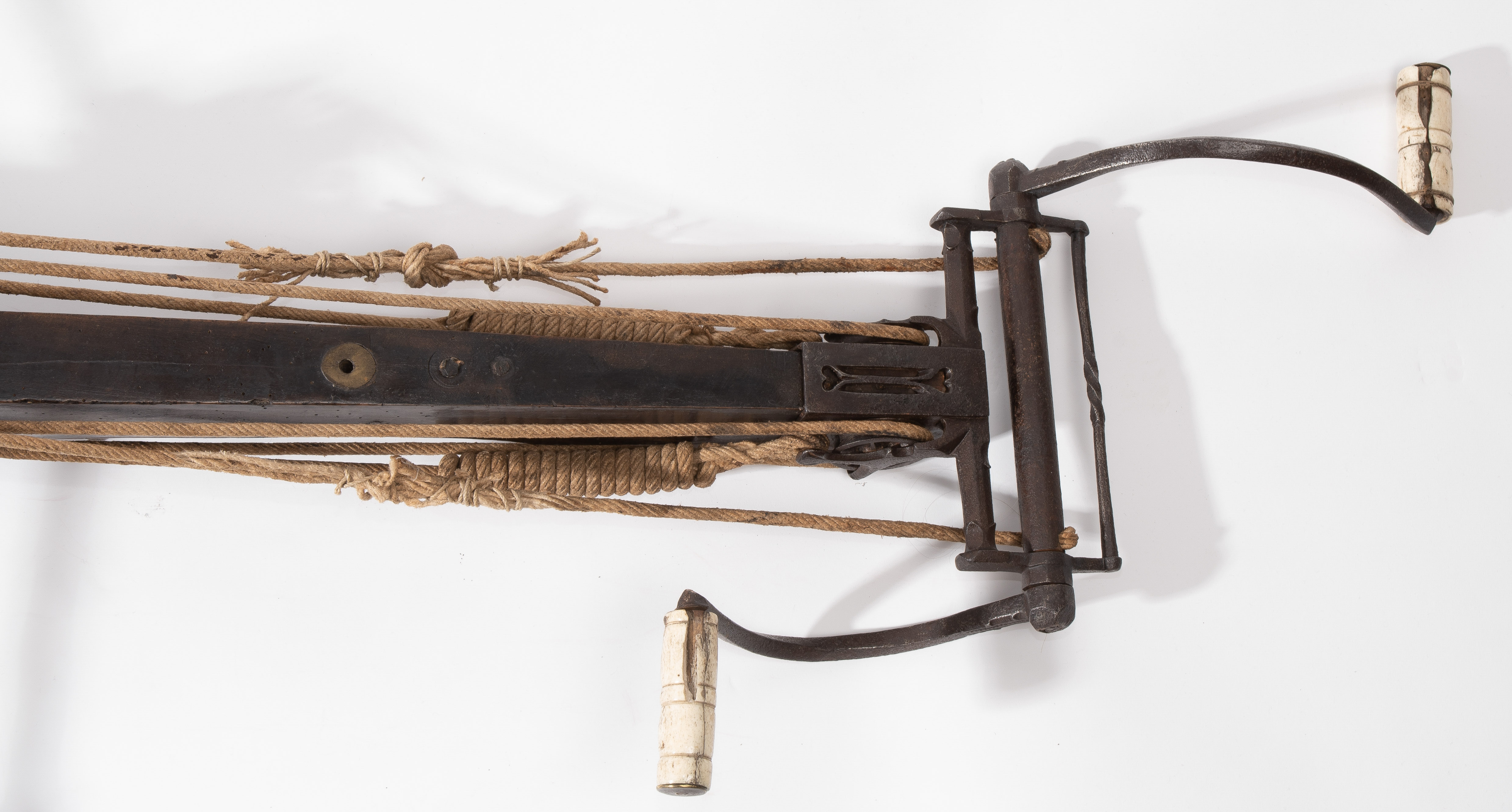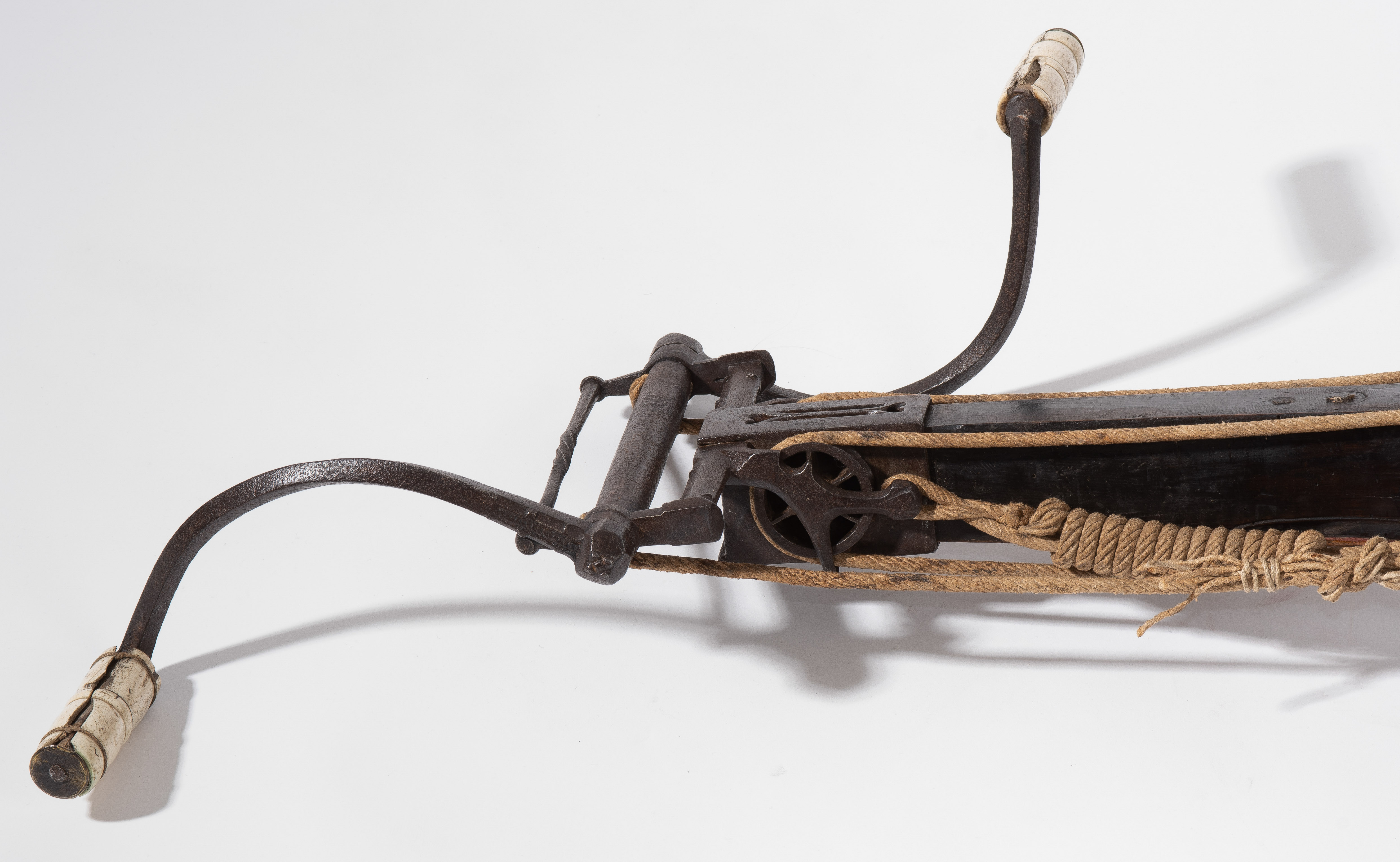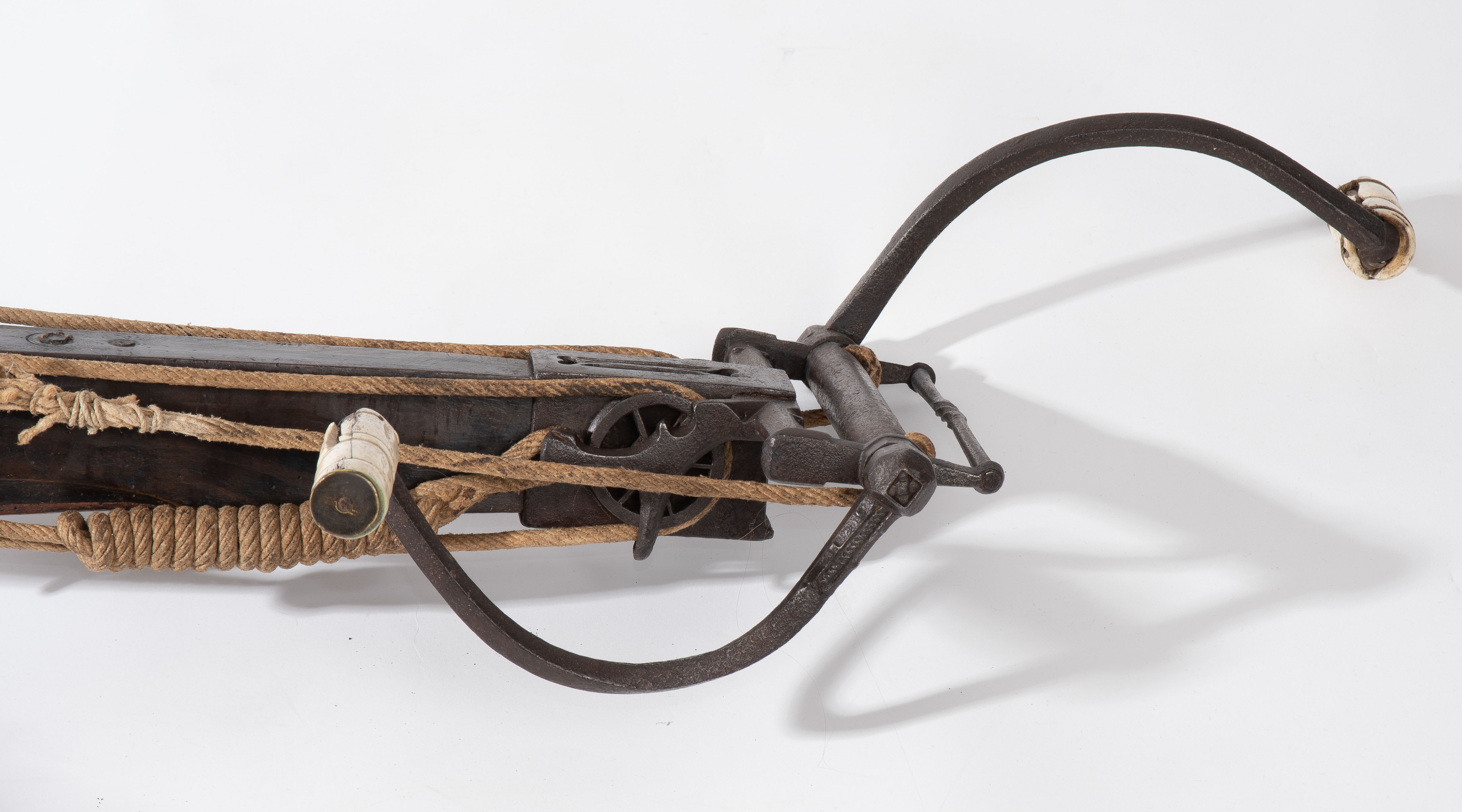 Spanische Niederlande/flämisch, um 1700. Etwas wurmstichige Fruchtholzsäule (L 102 cm) mit eingelegtem Bolzenlager aus Bein, geschnitzter Volutenzier an der Unterseite und zwei symmetrisch floral gravierten Schlossplatten aus Messing. Auf der Oberseite eine messingumrandete Bohrung zur Fixierung eines Visiers. Am Säulenfuss die noch spätgotisch verzierte eiserne Spannkurbel mit Griffstücken aus Bein. Aufwändiger Spannmechanismus mit Doppelkralle und je drei eisernen Umlenkrollen auf beiden Seiten der Säule, sog. "englische Winde"; Spannschnüre alt, aber kaum original. Vor dem Bogen ein eiserner Spannsteigbügel mit zwei Standfüsschen aus Messing. Nuss fehlt, noch 18 cm lang erhaltene, balusterförmig gedrehte Abzugstange aus Messing. Der Stahlbogen ist 78,8 cm lang, Bogenstärke 1,9 cm, ohne Schmiedemarken, wohl im 18./19. Jh. ergänzte Sehne. Eingedenk der wenigen erhaltenen Originalstücke aus dem späten 15./frühen 16. Jh. besonders rare Spätform, vergleichbar den grossen Zweihandschwertern, deren Handhabung noch bis um 1700 gelehrt wurde. G ca. 11 kg. L ohne Winde 109 cm, mit Winde ca. 115 cm.