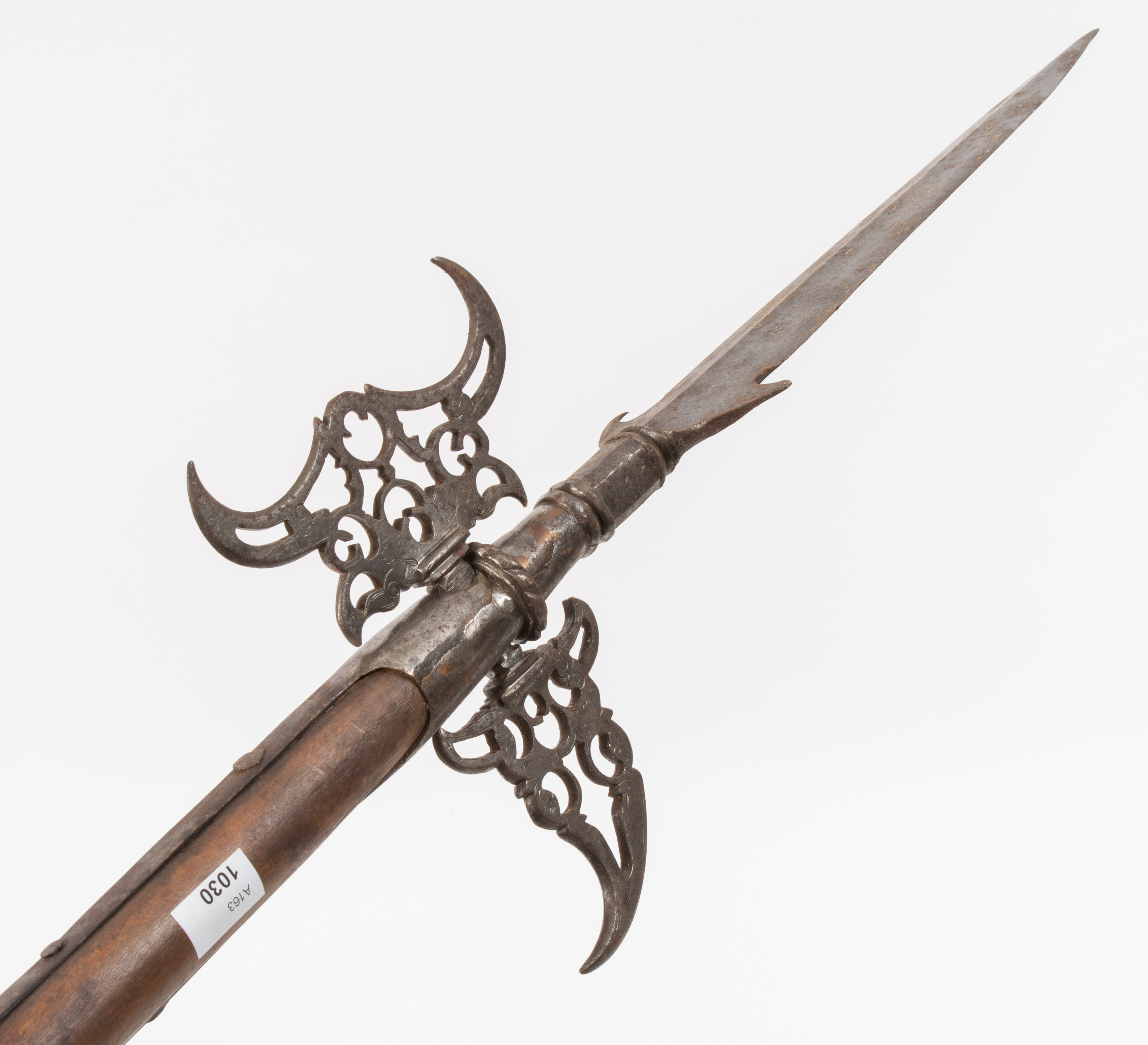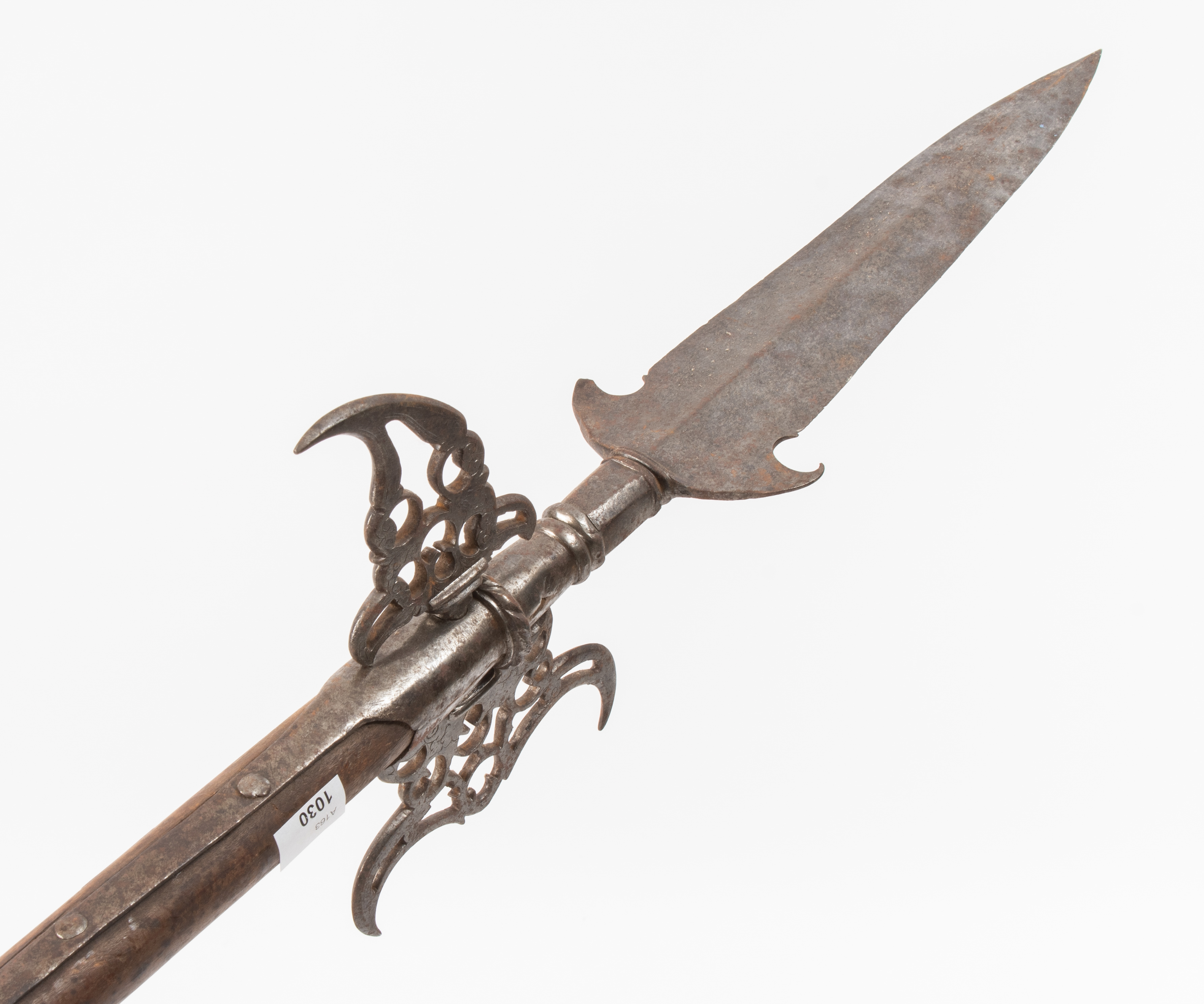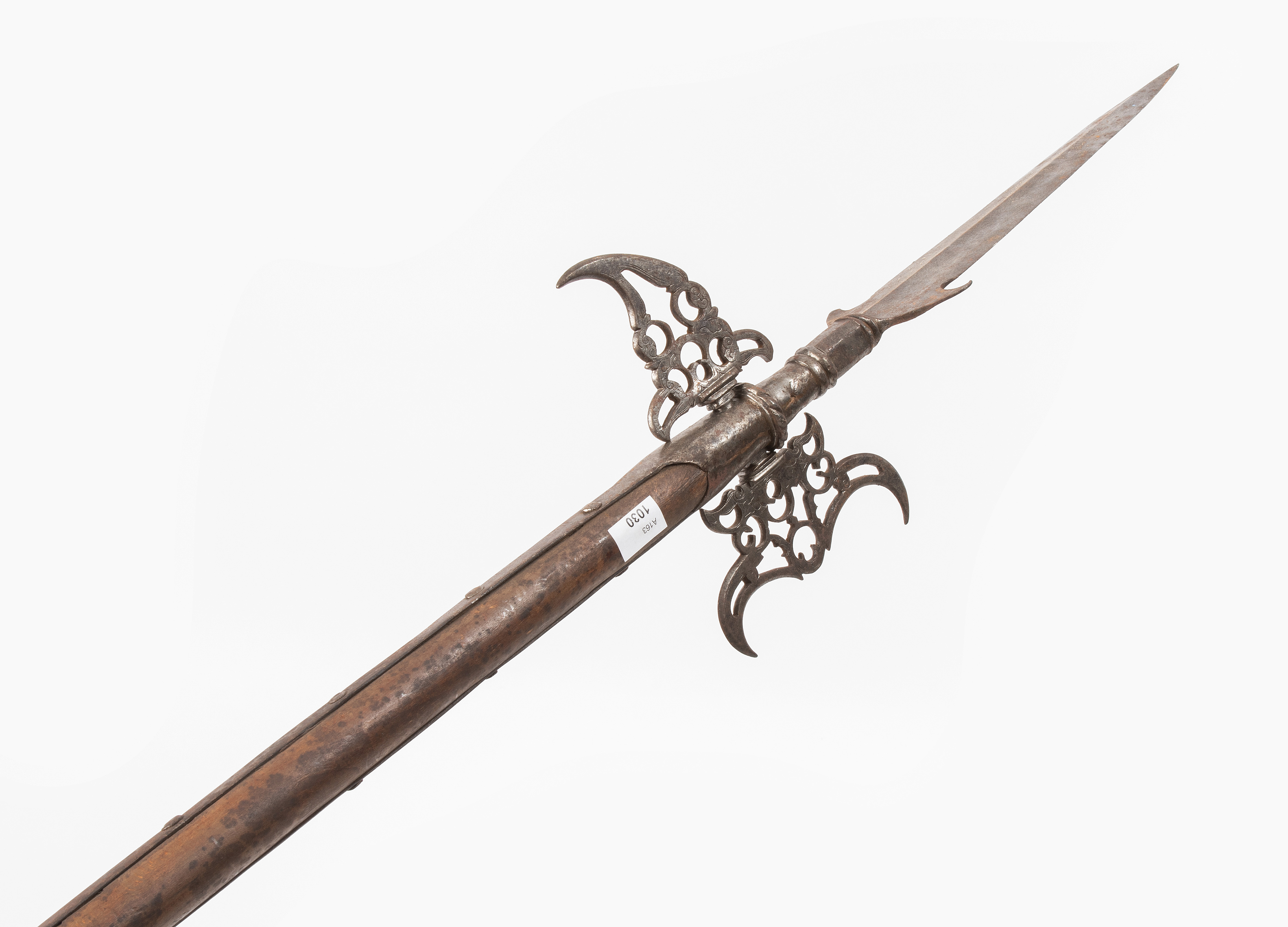Offizierswaffe, Italien / Frankreich um 1680-1700. Eisen (38 cm) mit Spontonblatt von konkav rhombischem Querschnitt; eine Flügelspitze alt abgebrochen. Dasselbe ist im rechten Winkel zum Axtblatt und dem Schnabelhaken angebracht, welche beide mit feinen Durchbrechungen und floralen Gravuren verziert sind. Von der Rundtülle gehen 39 cm lange Schaftfedern aus, die auf den eventuell originalen Schaft aufgenagelt sind. L ca. 216 cm.